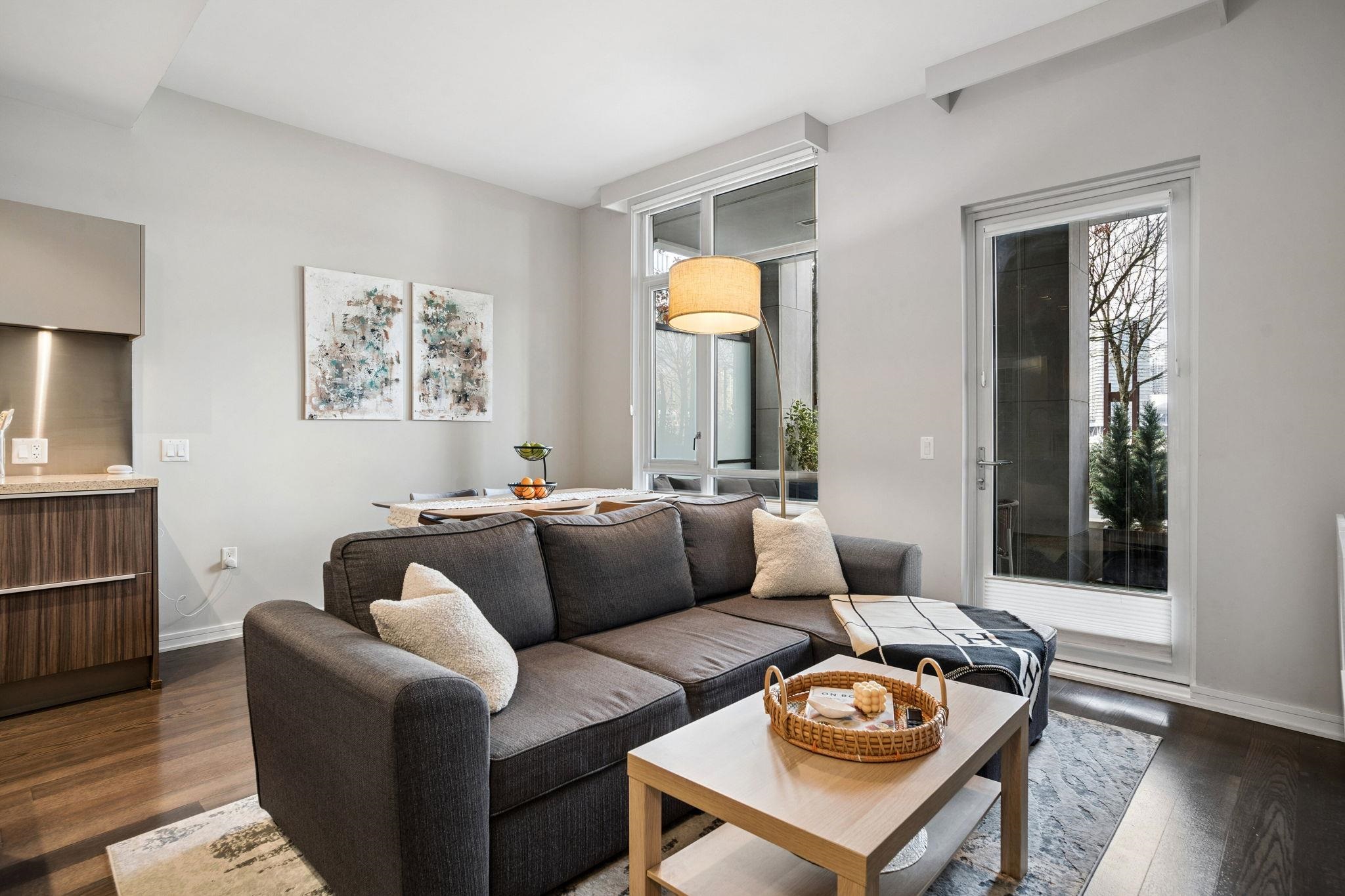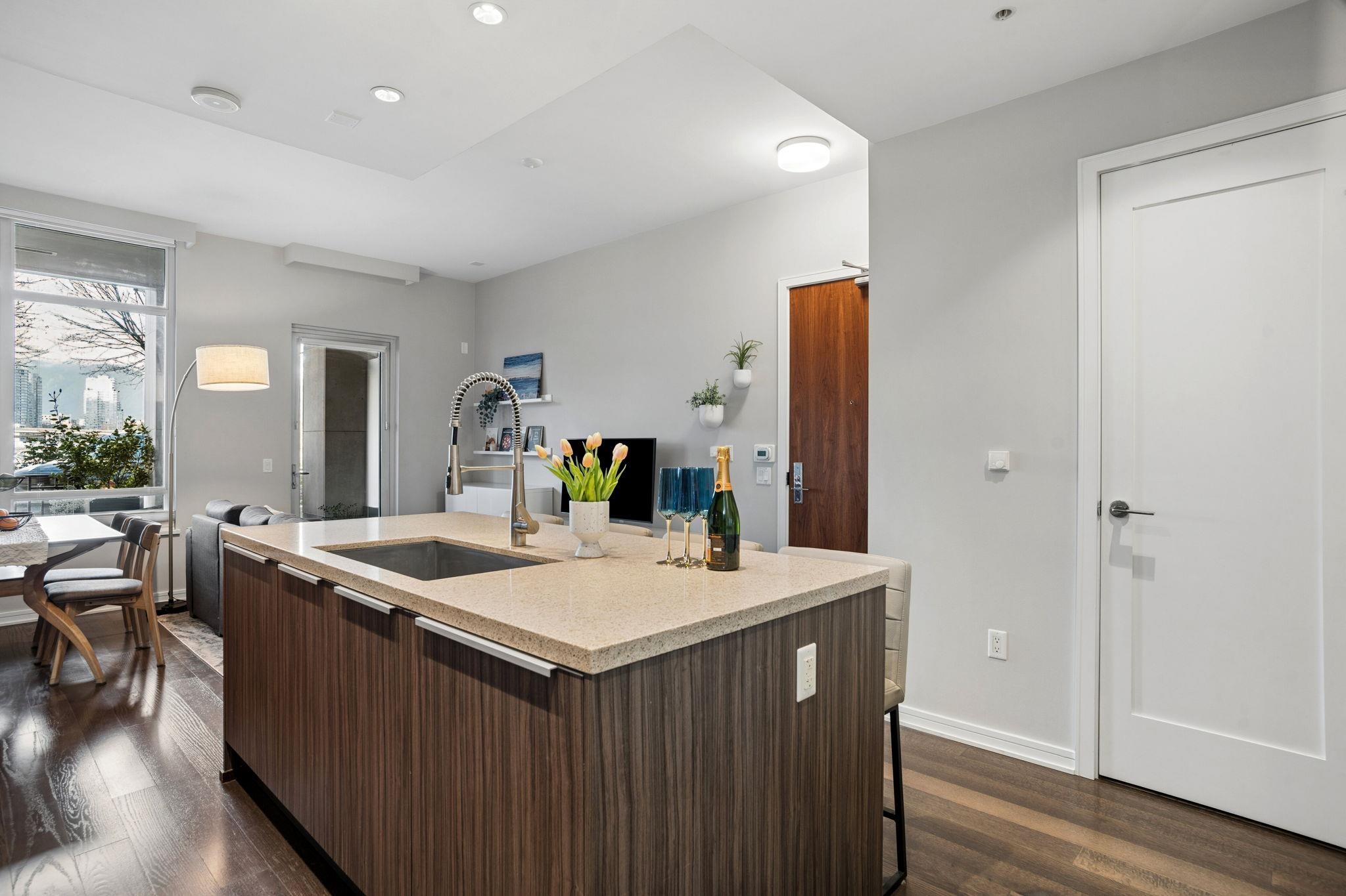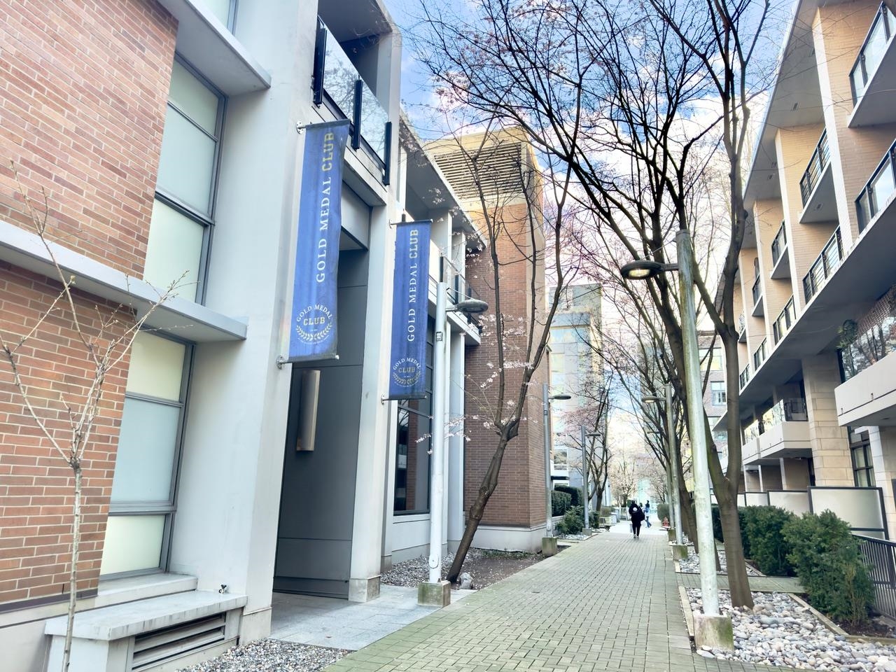 FRONT ROW-living in the heart of Olympic Village at SHORELINE. This contemporary 740sf townhome-style condo features soaring 9'6 ceilings & a 100sf patio with street-level access—ideal for pets/cyclists. Enjoy stunning North-facing views of False Creek, the North Shore Mountains, & the city skyline. The gourmet kitchen boasts Miele gas appliances, Sub-Zero fridge, & Eggersmann cabinetry. Spa-like 4pc bath, radiant heating/cooling, 1 parking, & 1 locker included. Access the elite Gold Medal Club’s pool/sauna...