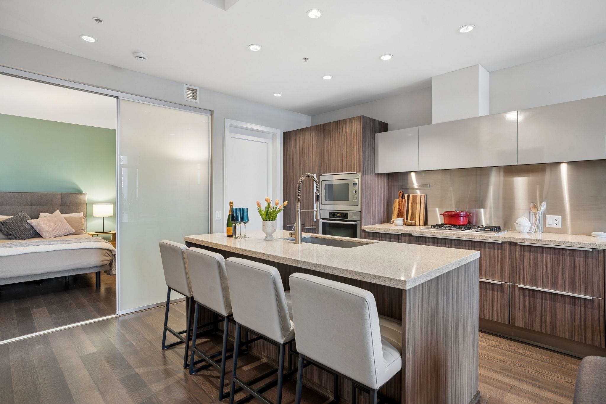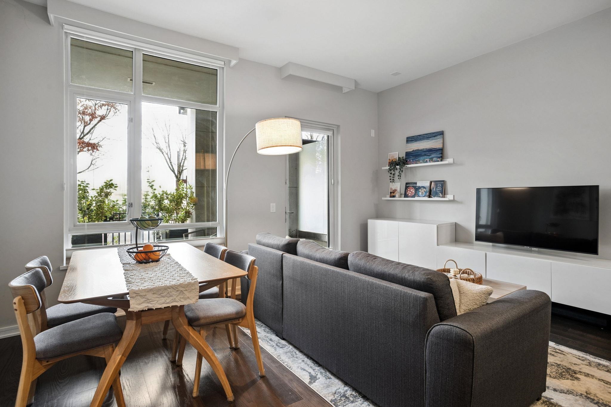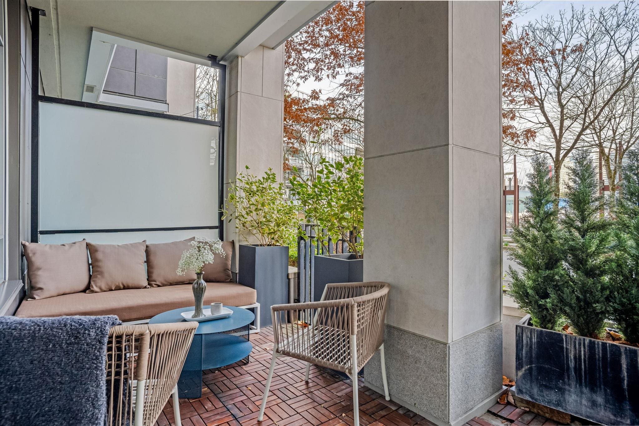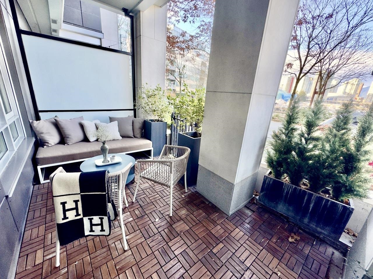 FRONT ROW-living in the heart of Olympic Village at SHORELINE. This contemporary 740sf townhome-style condo features soaring 9'6 ceilings & a 100sf patio with street-level access—ideal for pets/cyclists. Enjoy stunning North-facing views of False Creek, the North Shore Mountains, & the city skyline. The gourmet kitchen boasts Miele gas appliances, Sub-Zero fridge, & Eggersmann cabinetry. Spa-like 4pc bath, radiant heating/cooling, 1 parking, & 1 locker included. Access the elite Gold Medal Club’s pool/sauna...