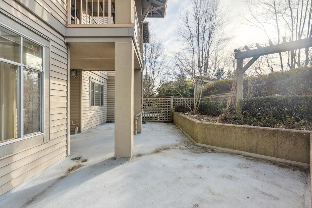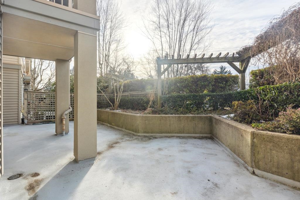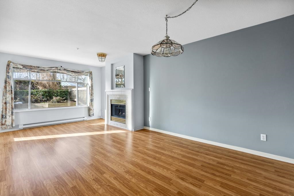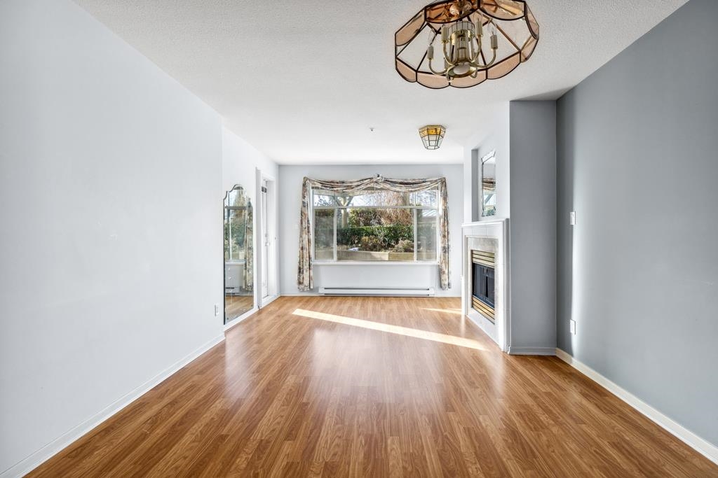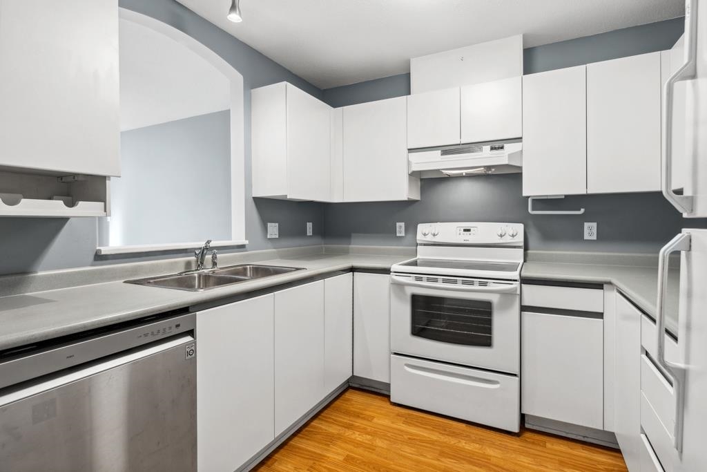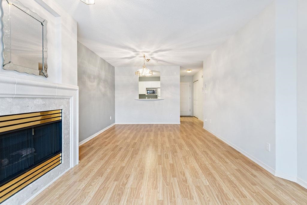 Laguna is a quiet, well-maintained gated community surrounded by mature trees and shrubs. This spacious 977sf garden-level unit offers 2 bedrooms and 2 bathrooms with laminate floors in most areas and a massive 465sf paved patio bordered by planters. The rectangular living room features a gas fireplace, ceiling light, and a large window facing the patio. The dining area has a classy chandelier, while the kitchen offers three rows of white cabinets and a pass-through window. The primary bedroom fits a king-s...