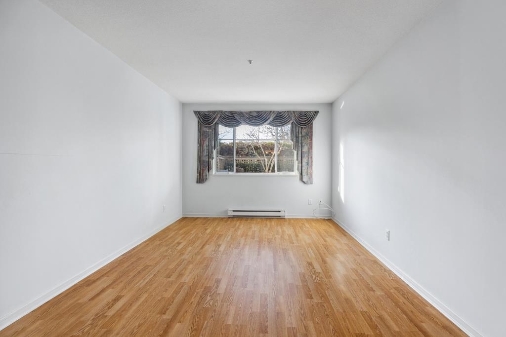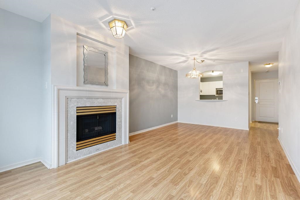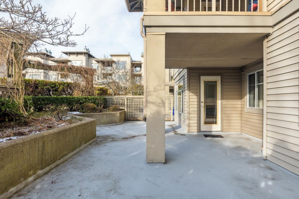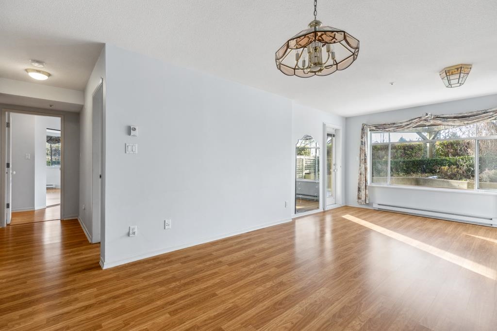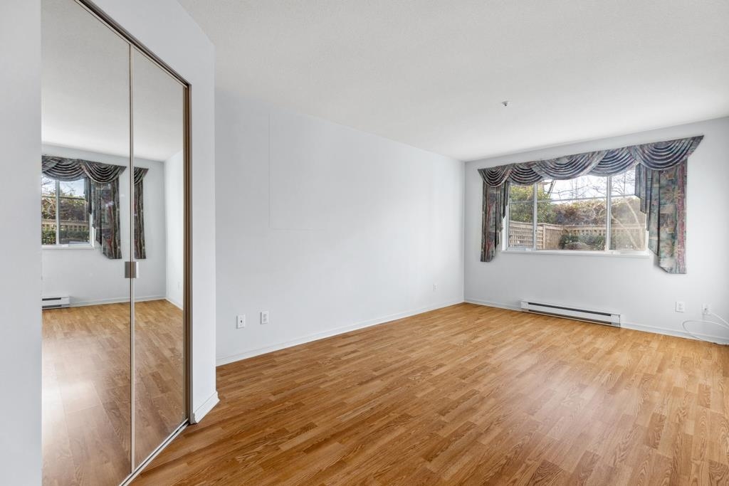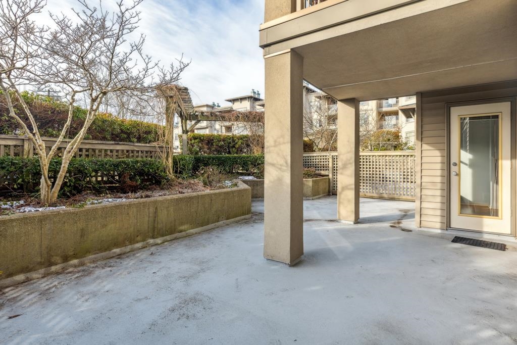 Laguna is a quiet, well-maintained gated community surrounded by mature trees and shrubs. This spacious 977sf garden-level unit offers 2 bedrooms and 2 bathrooms with laminate floors in most areas and a massive 465sf paved patio bordered by planters. The rectangular living room features a gas fireplace, ceiling light, and a large window facing the patio. The dining area has a classy chandelier, while the kitchen offers three rows of white cabinets and a pass-through window. The primary bedroom fits a king-s...