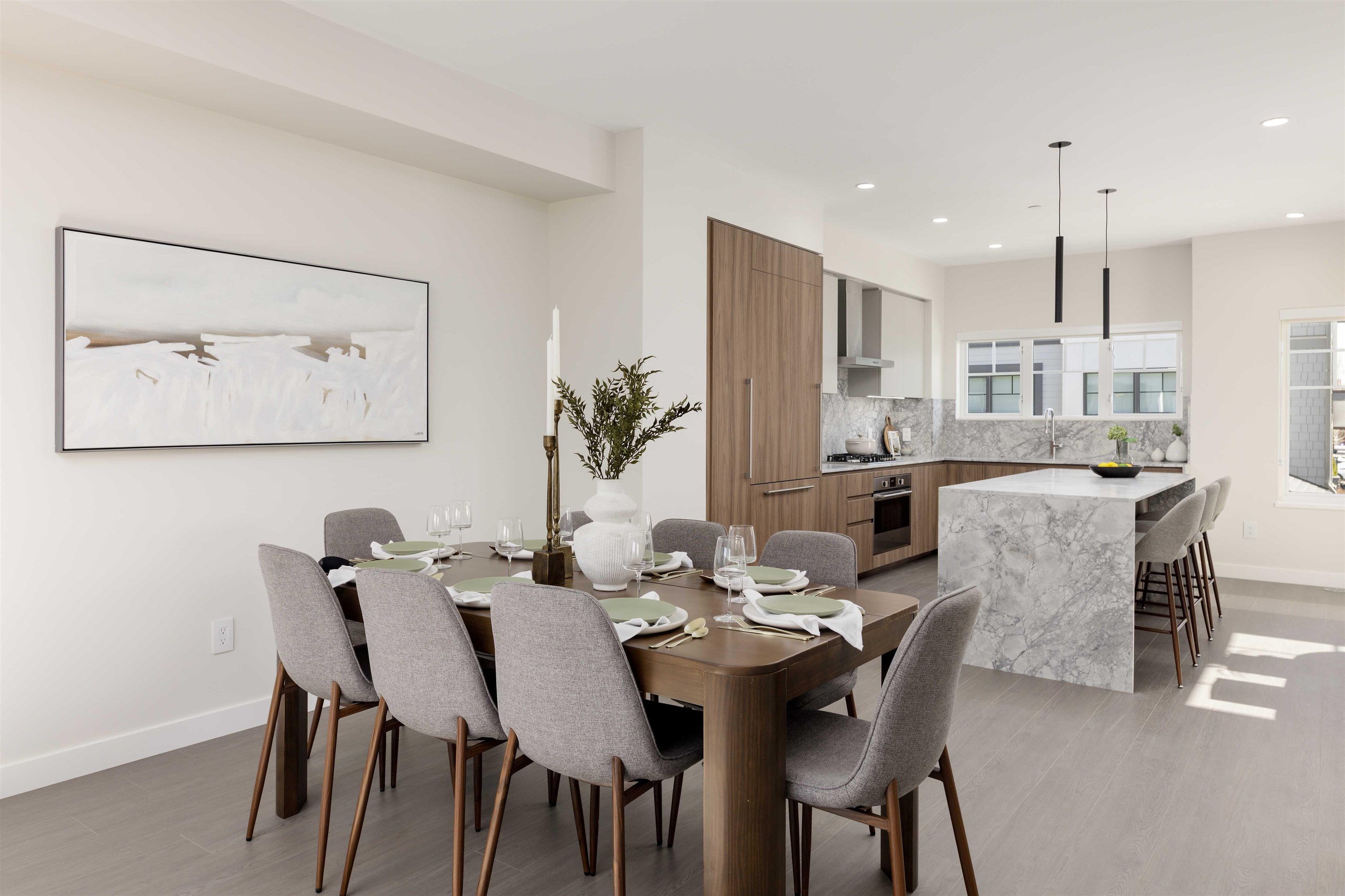 Craftsman inspired TH 107 1906 SF 4 bed 3.5 bath with a balcony and private yard in a well established community. Features include A/C, Laminate flooring throughout, on-demand hot water system, and overheight ceiling in living, kitchen and dining area with vaulted ceiling in the bedrooms make this home the perfect place to relax or entertain. Chef inspired kitchen features premium appliance package with 36" integrated Fulgor Milano fridge, 5-burner Fulgor Milano stove integrated with natural stone counter t...