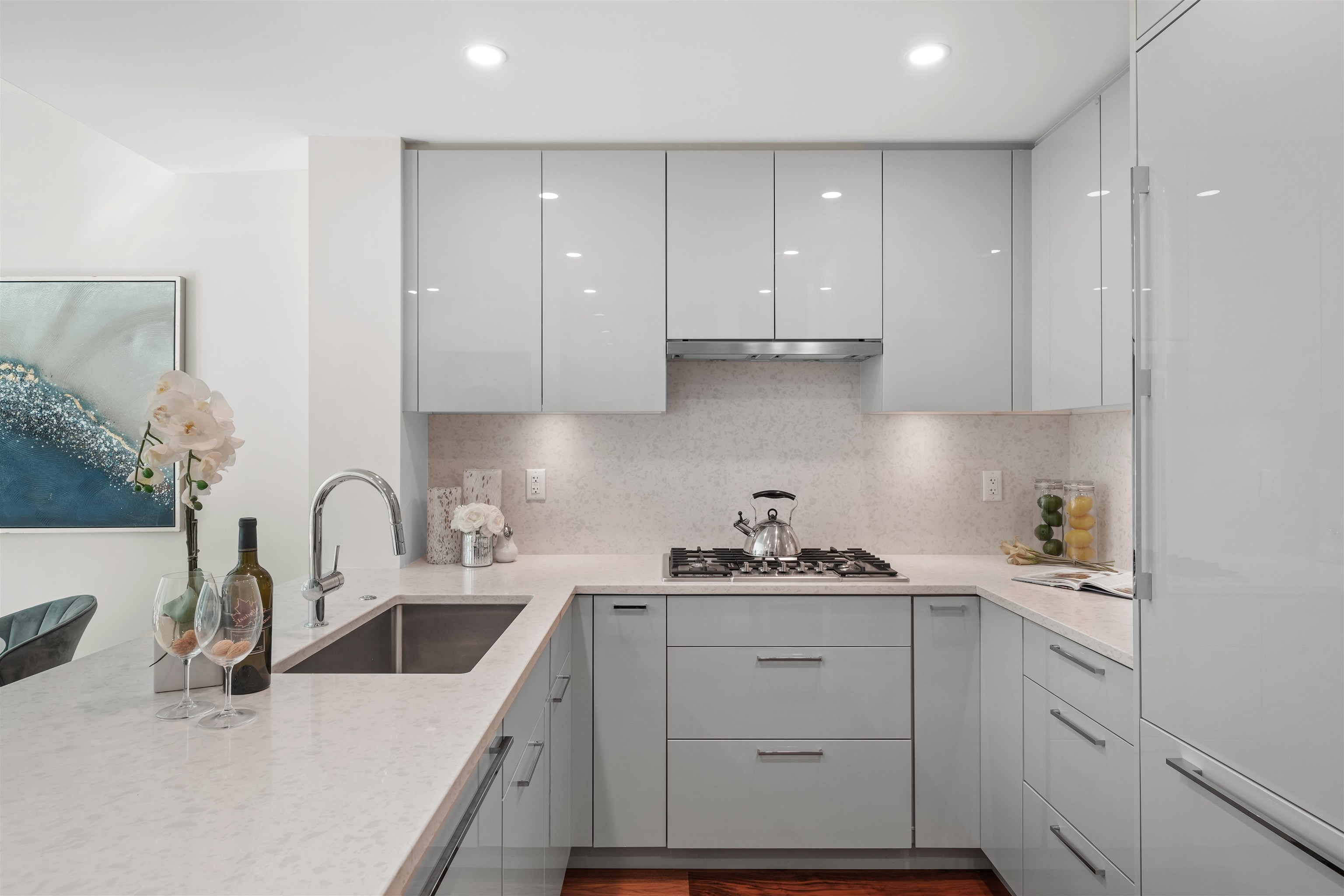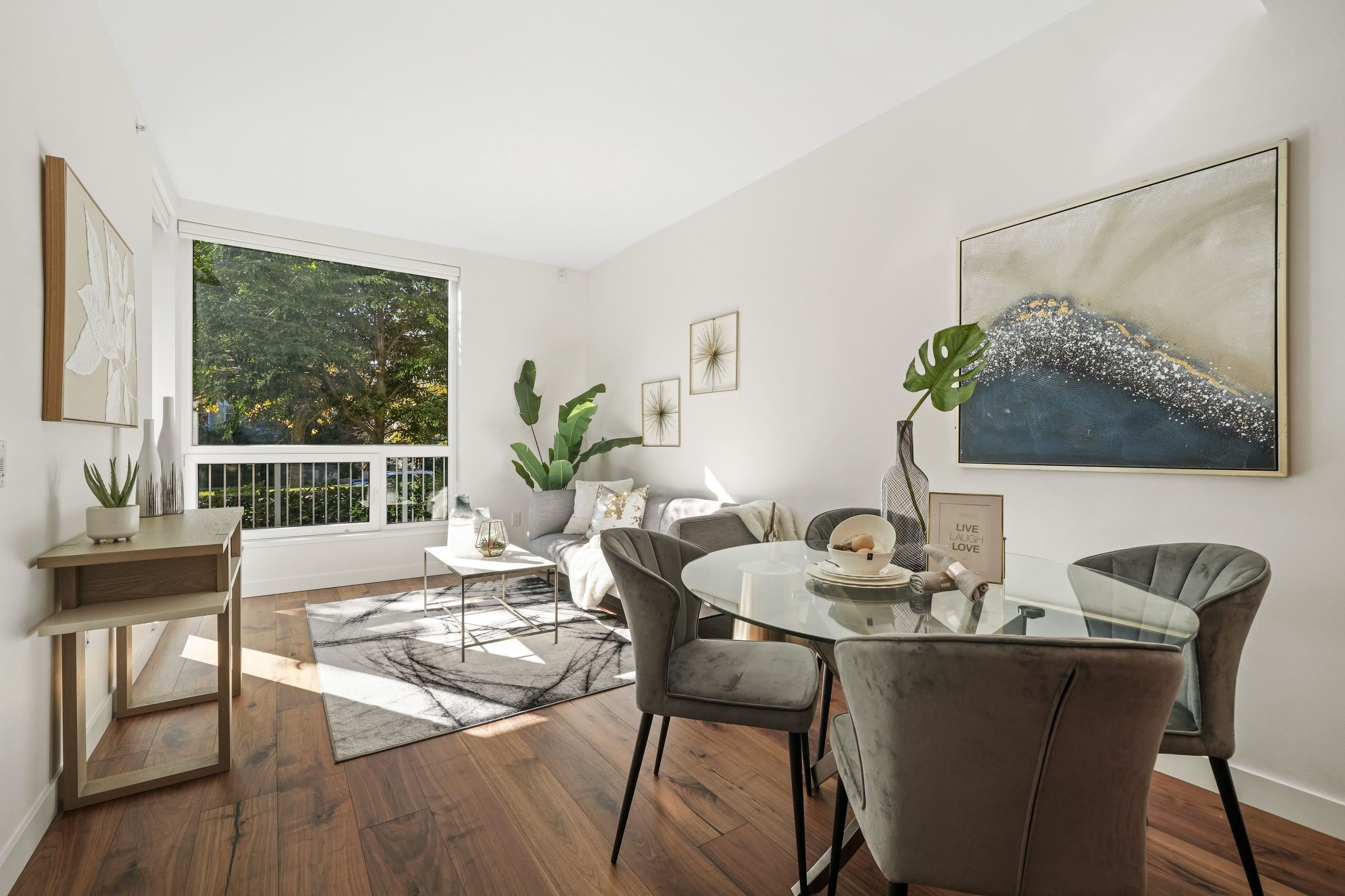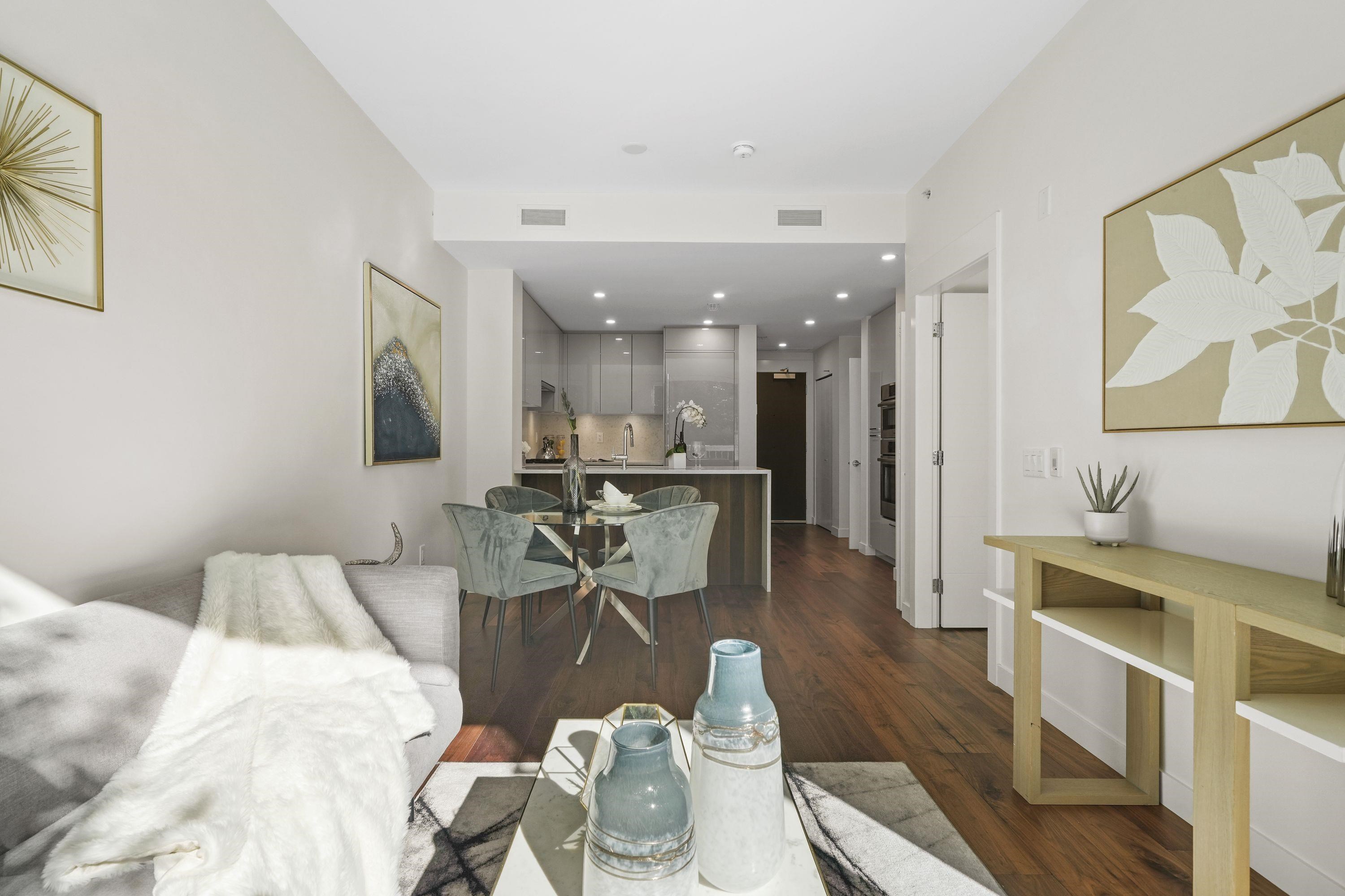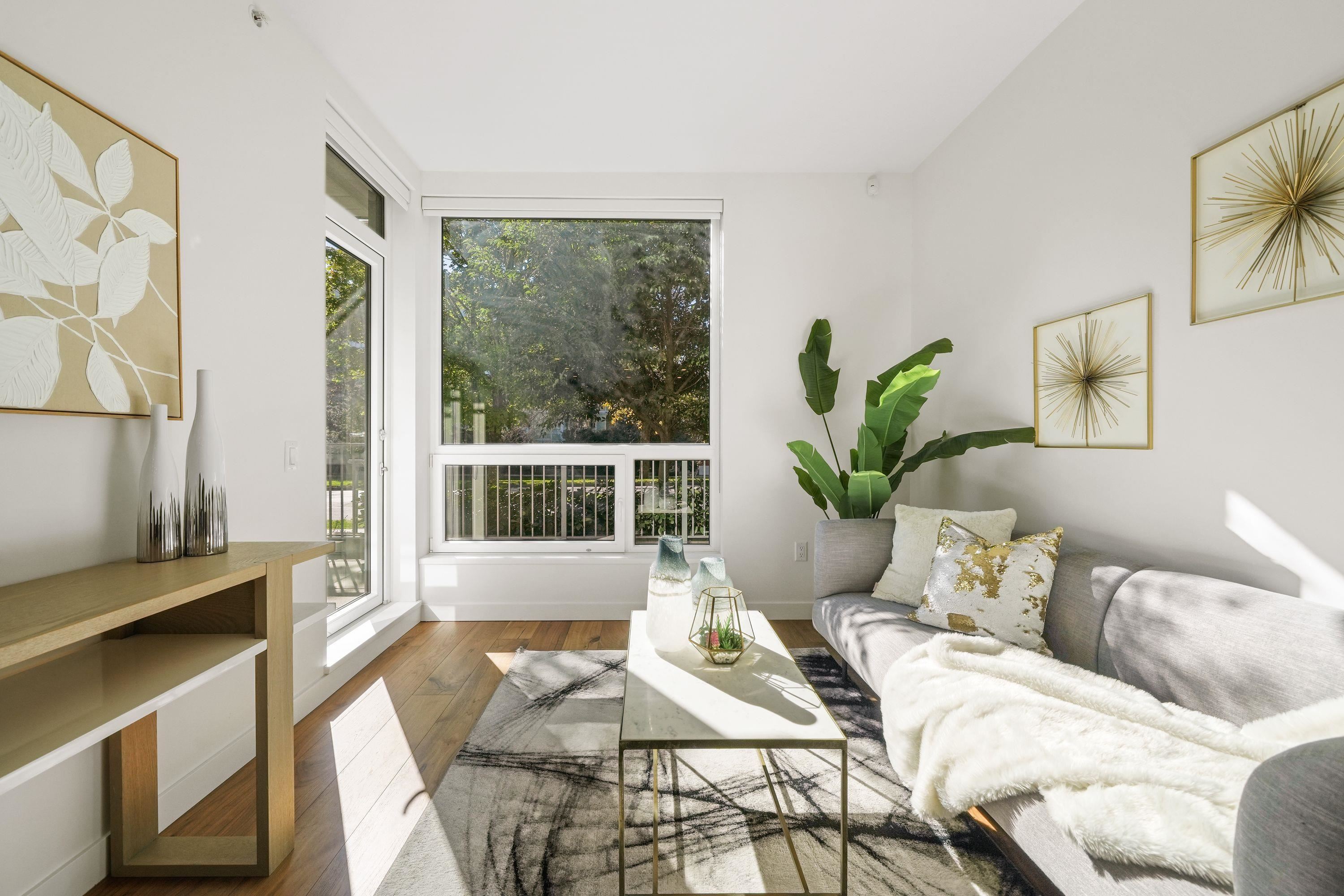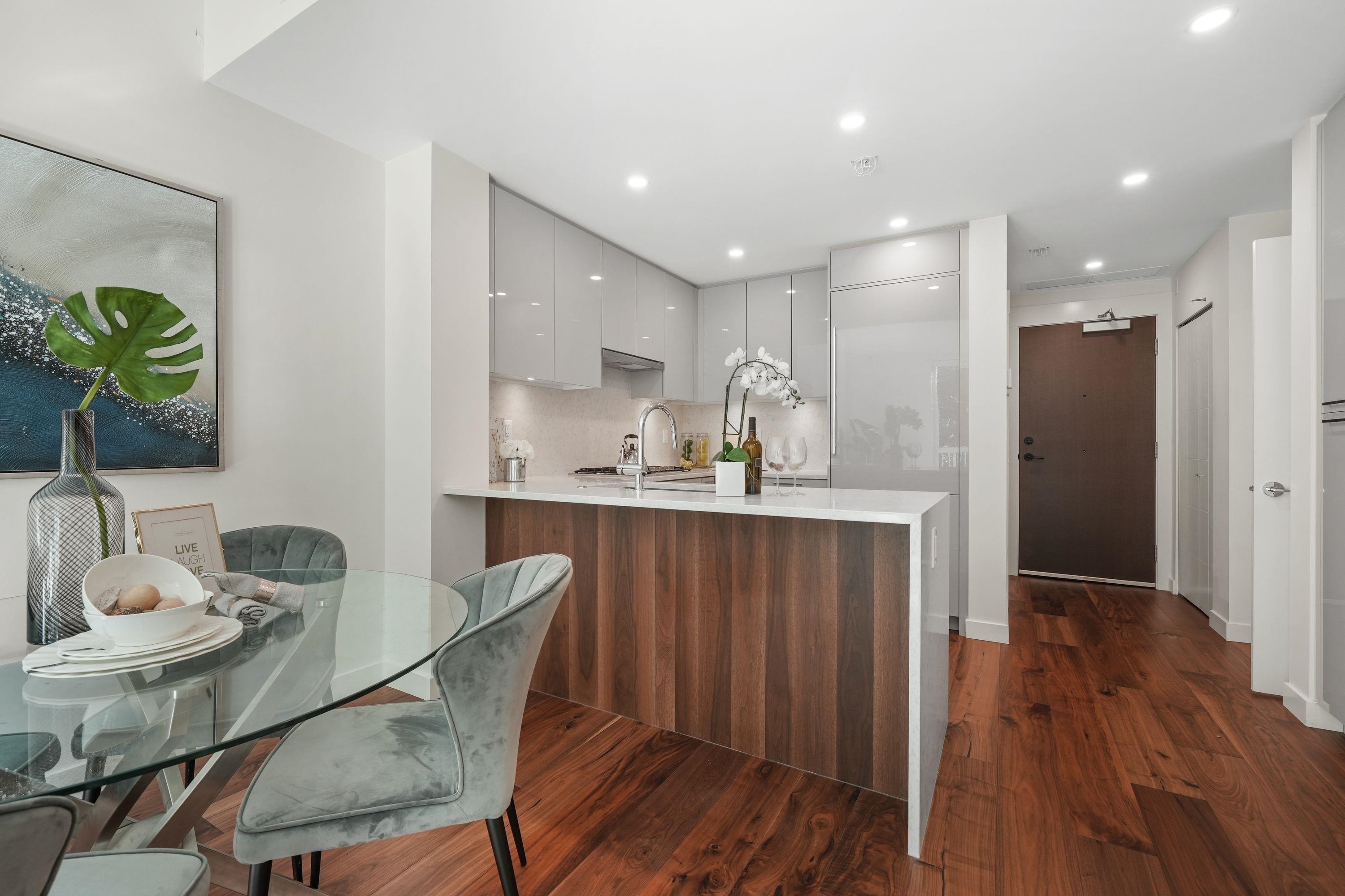 Welcome to this bright ground-level suite with private direct access that provides a townhouse feel. This 1 Bed + Den has a LARGE West-Facing PATIO. Open layout with 9' ceilings, sleek kitchen equipped with full-size integrated Bosch appliances, SS wall-oven, ample cabinet, counter space, premium walnut HW flooring throughout. The bathroom features Nuheat in-floor heating, with porcelain tiles seamlessly wrapping the floors and walls. Boutique CONCRETE building situated along the Cambie Corridor - prime Wes...