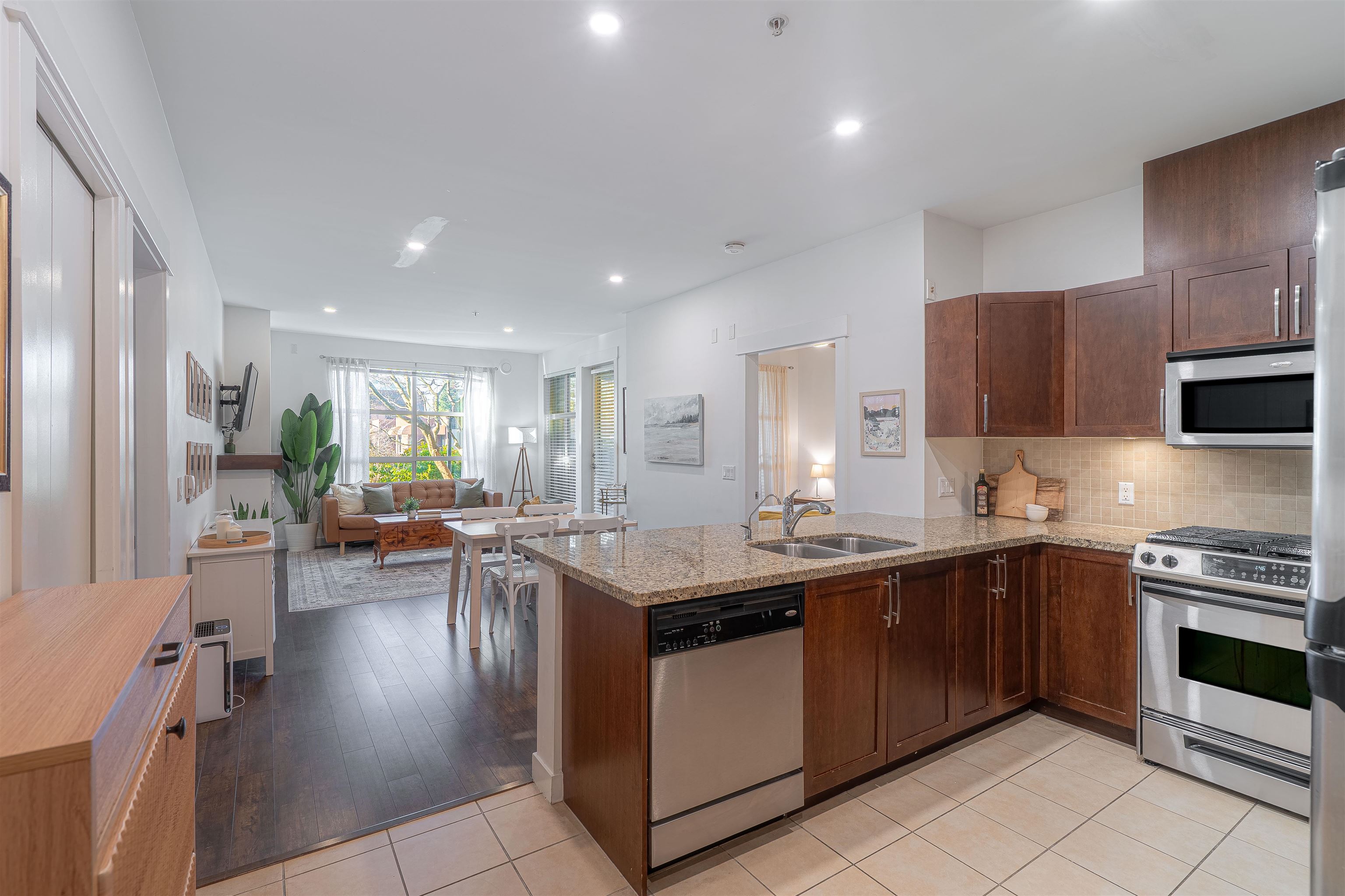 This spacious ground-floor corner residence offers over 1,023 Sq.Ft. of smartly designed living. Featuring 2 generous sized bedrooms positioned on opposite sides for privacy, a bright den, and 2 full bathrooms. This south-west facing home features an open kitchen with granite countertops, gas range, stainless steel appliances, and pantry storage, plus in-suite laundry and radiant in-floor heating throughout (included in strata fees). Enjoy a fully covered 110+ sq.ft. patio perfect for year-round use. Ideall...