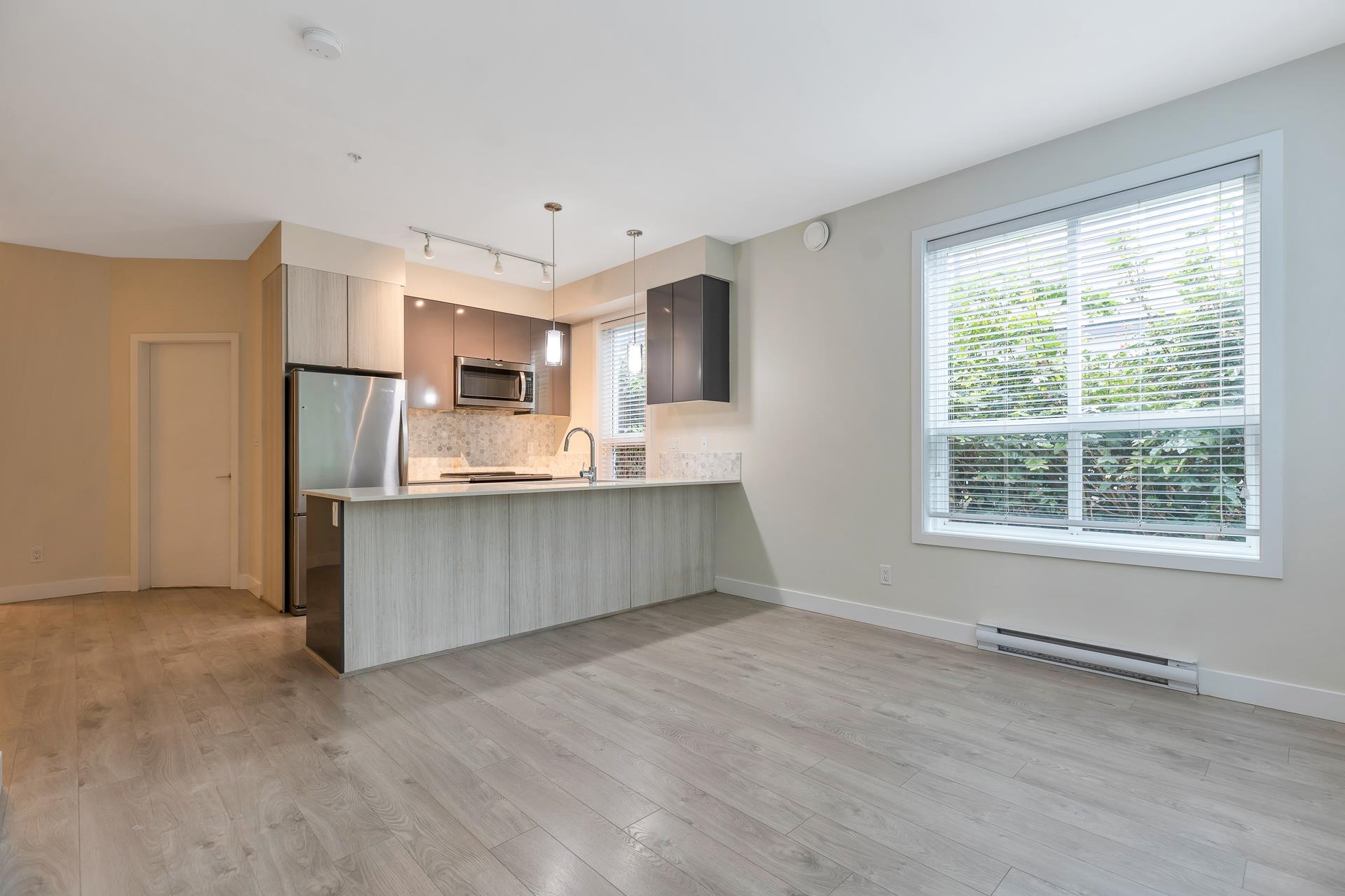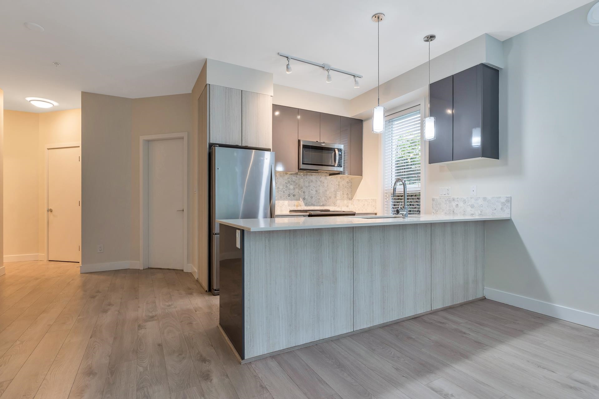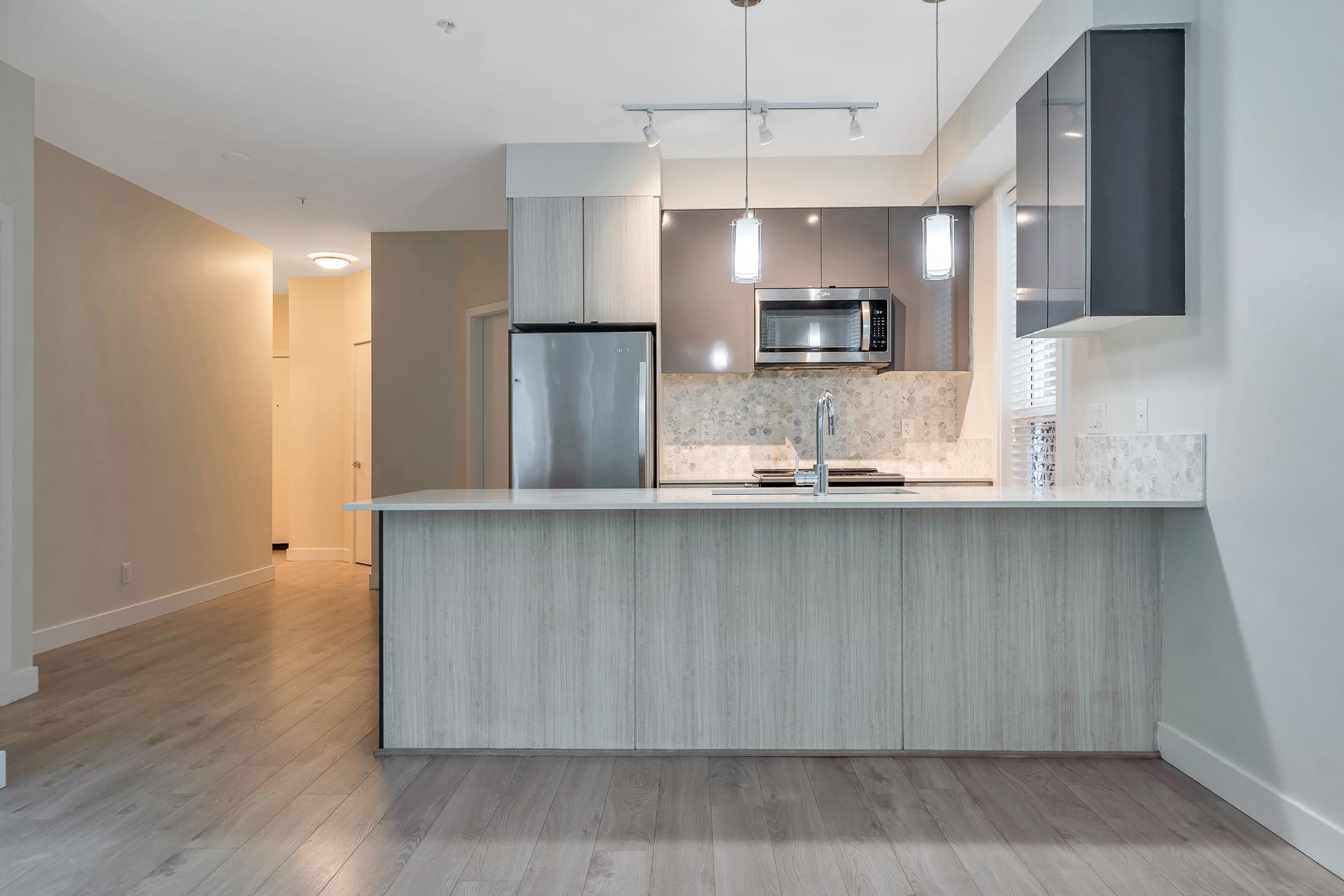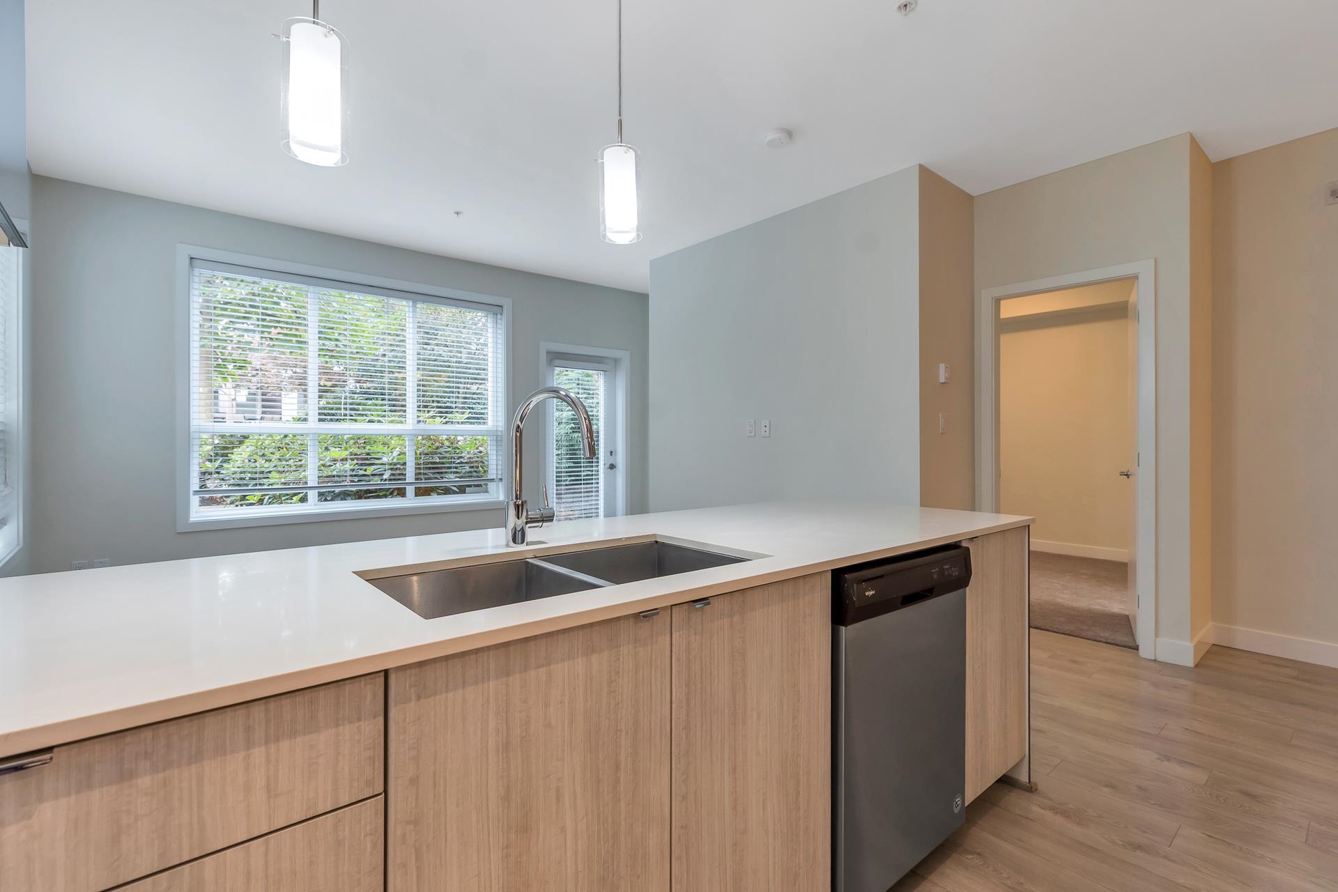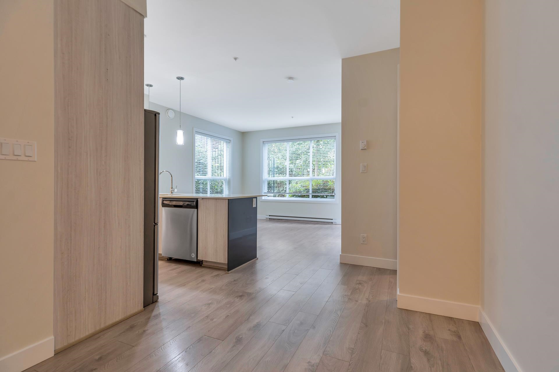 Main floor corner suite with its own private patio entry. This bright and spacious 2 bedroom, 2 bathroom home features a modern open floor plan with 9 ft ceilings, freshly painted walls, and stylish upgraded vinyl plank flooring. The kitchen offers a two-tone cabinet design with extra counter space and stainless steel appliances, perfect for both everyday living and entertaining. The primary bedroom includes new carpeting and a private ensuite. Additional highlights include two side-by-side parking stalls (...