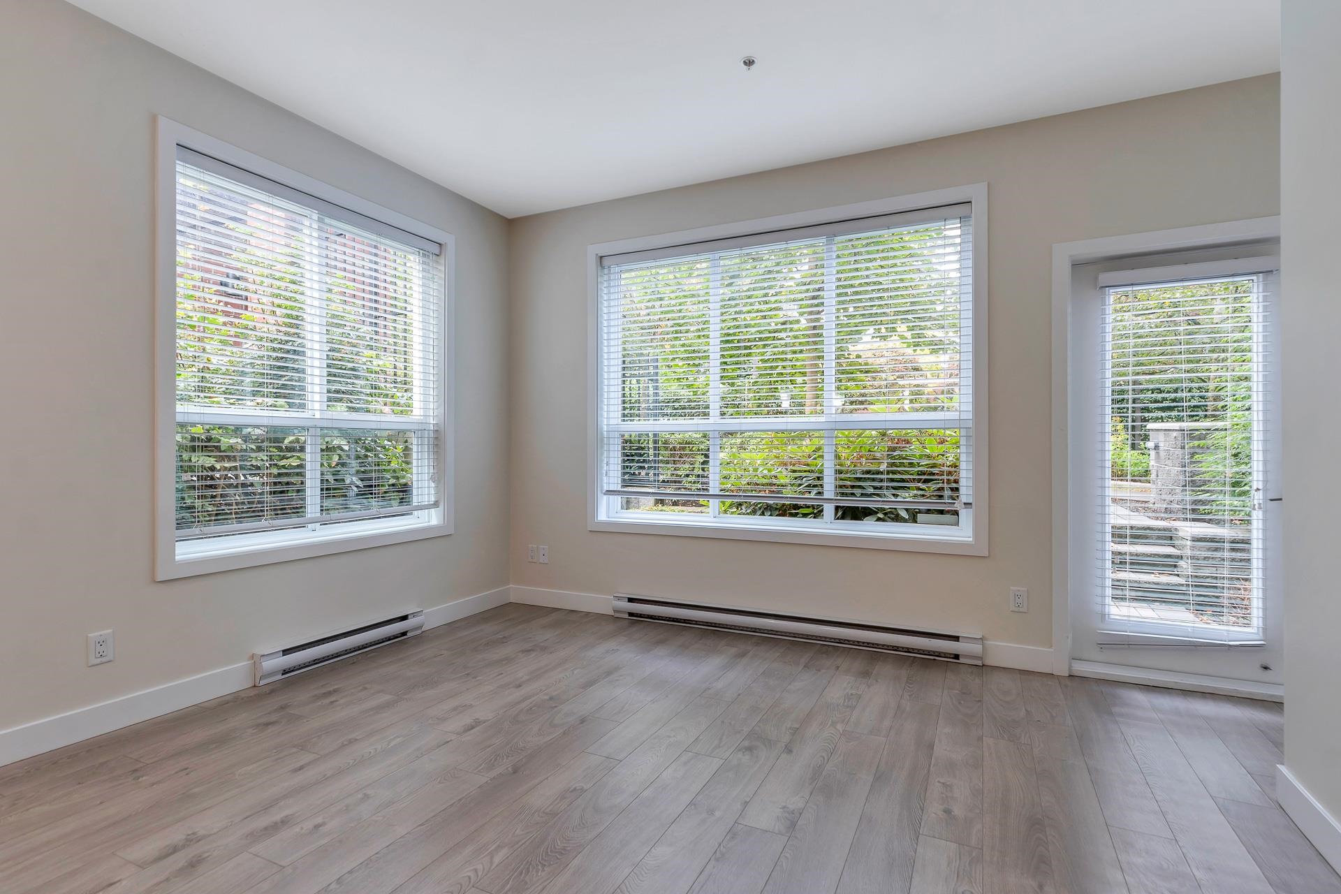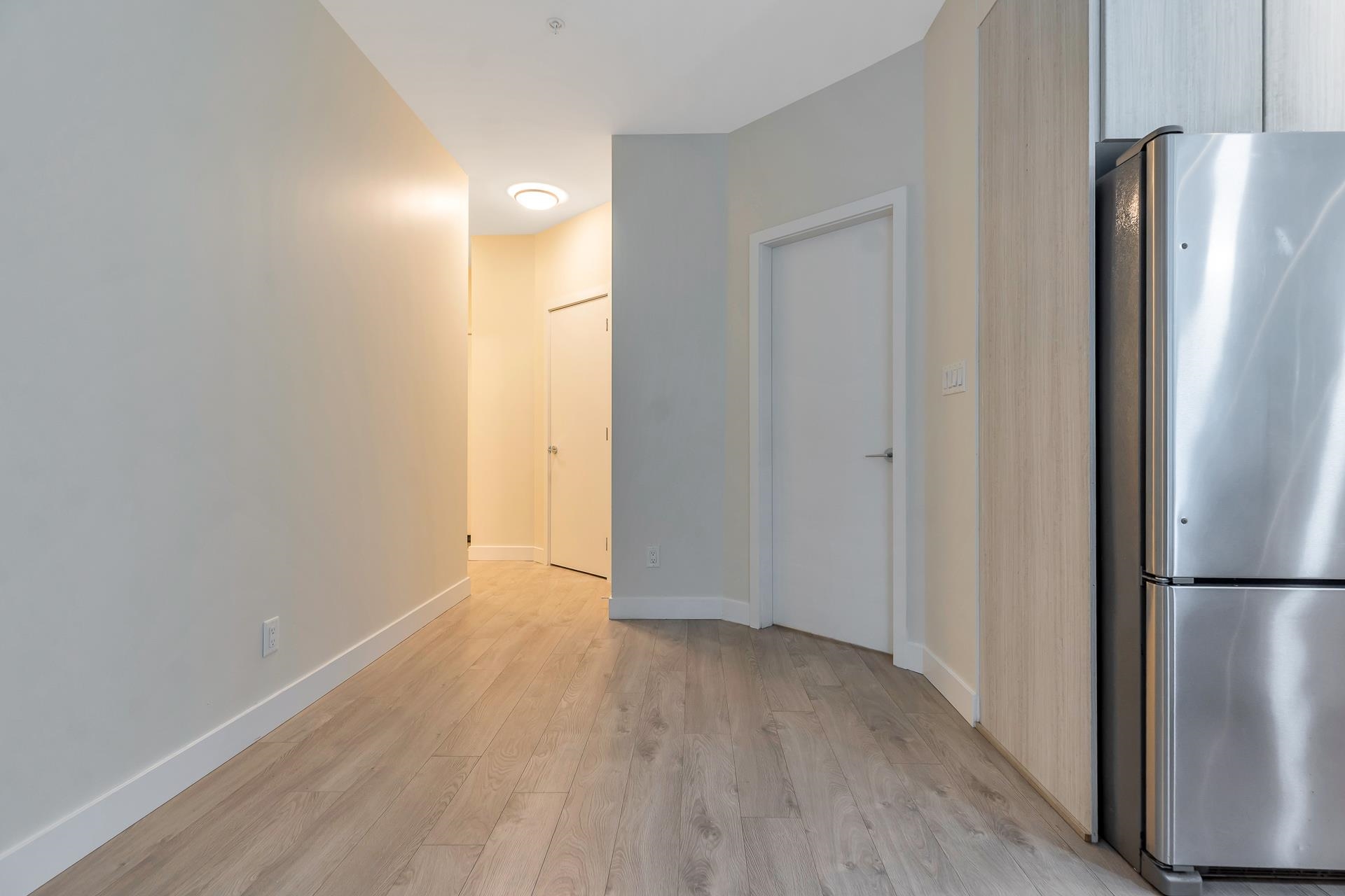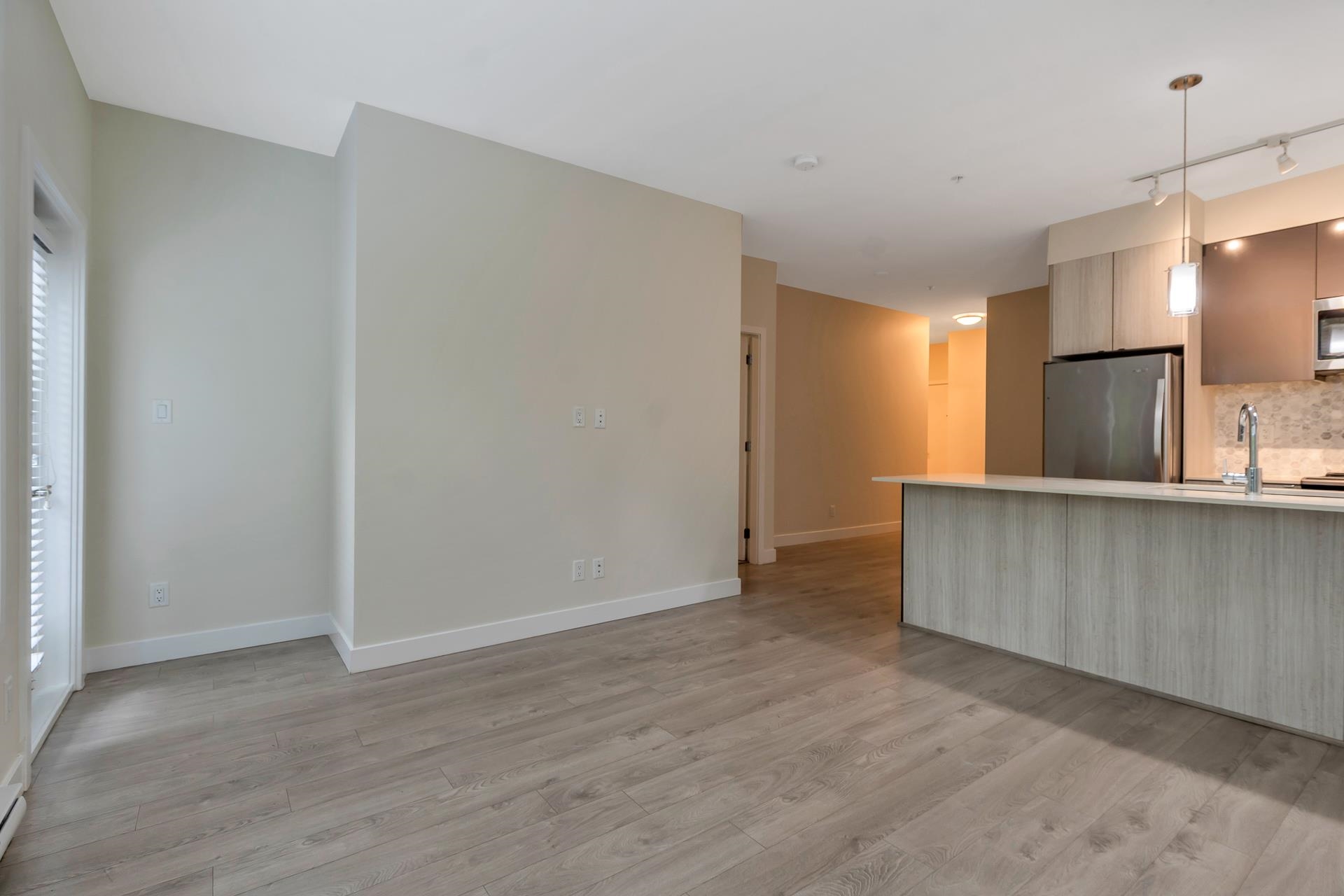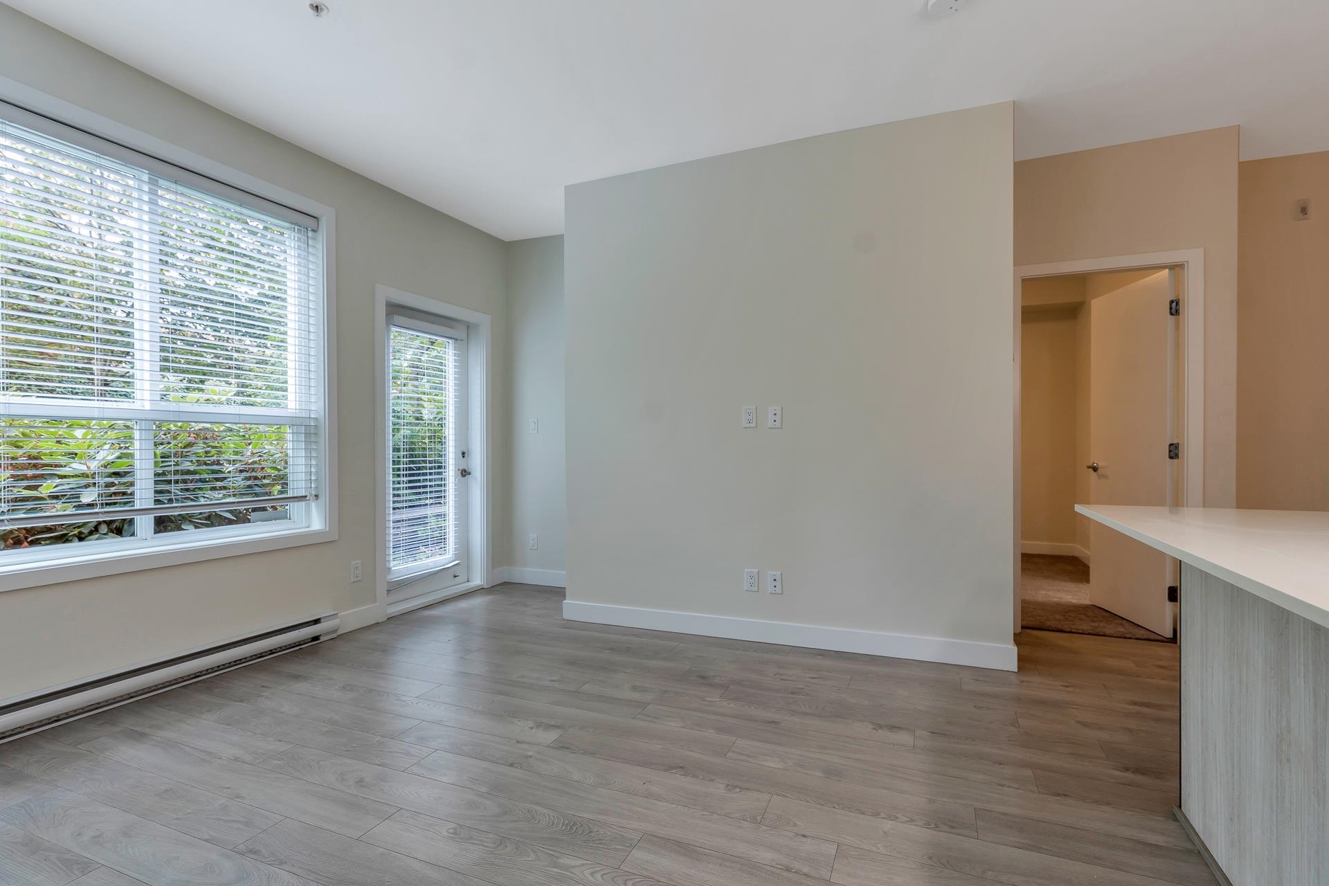 Main floor corner suite with its own private patio entry. This bright and spacious 2 bedroom, 2 bathroom home features a modern open floor plan with 9 ft ceilings, freshly painted walls, and stylish upgraded vinyl plank flooring. The kitchen offers a two-tone cabinet design with extra counter space and stainless steel appliances, perfect for both everyday living and entertaining. The primary bedroom includes new carpeting and a private ensuite. Additional highlights include two side-by-side parking stalls (...