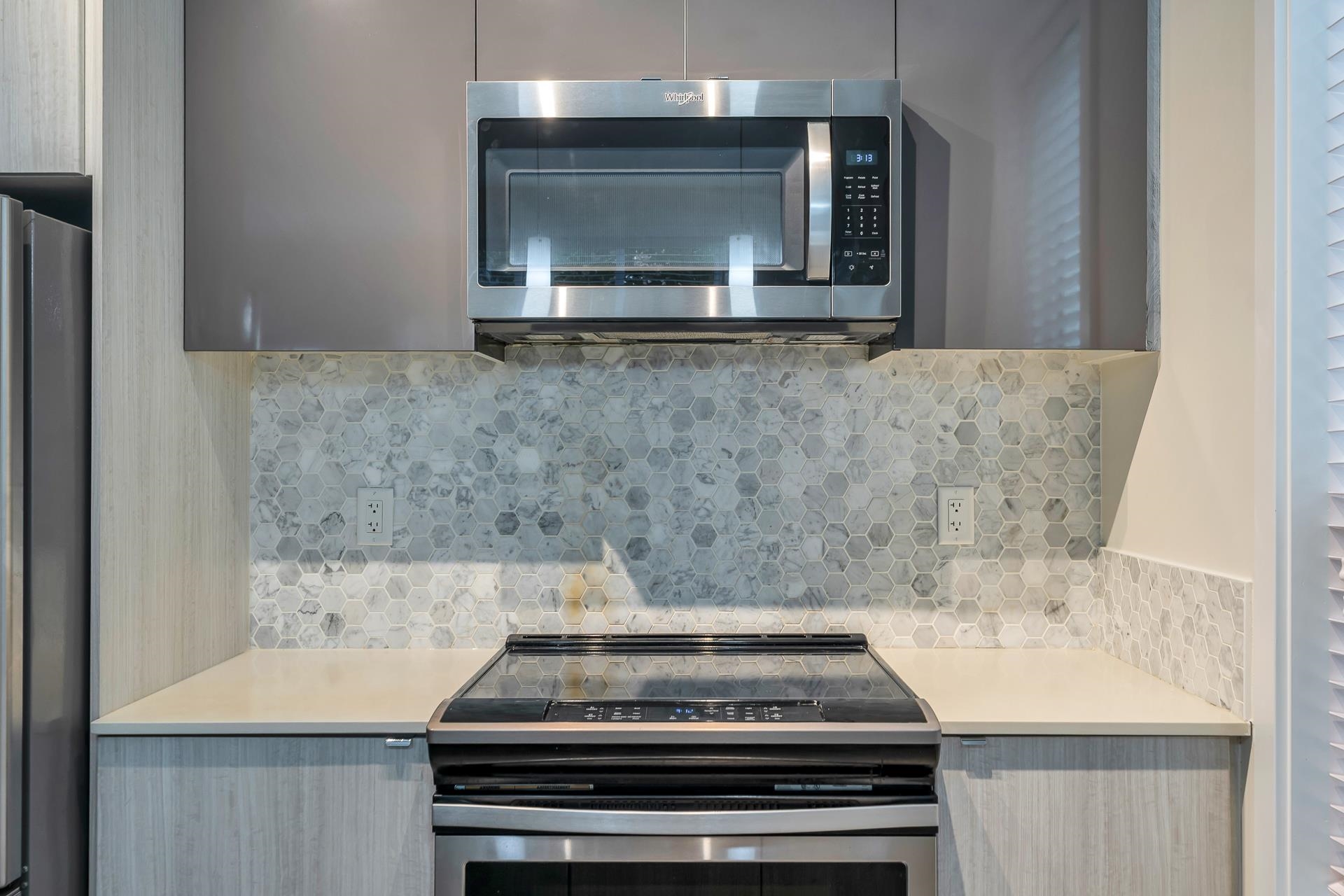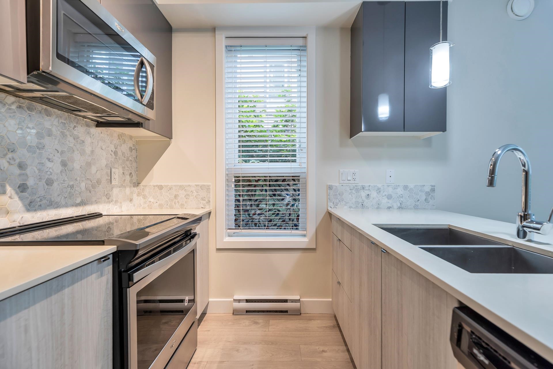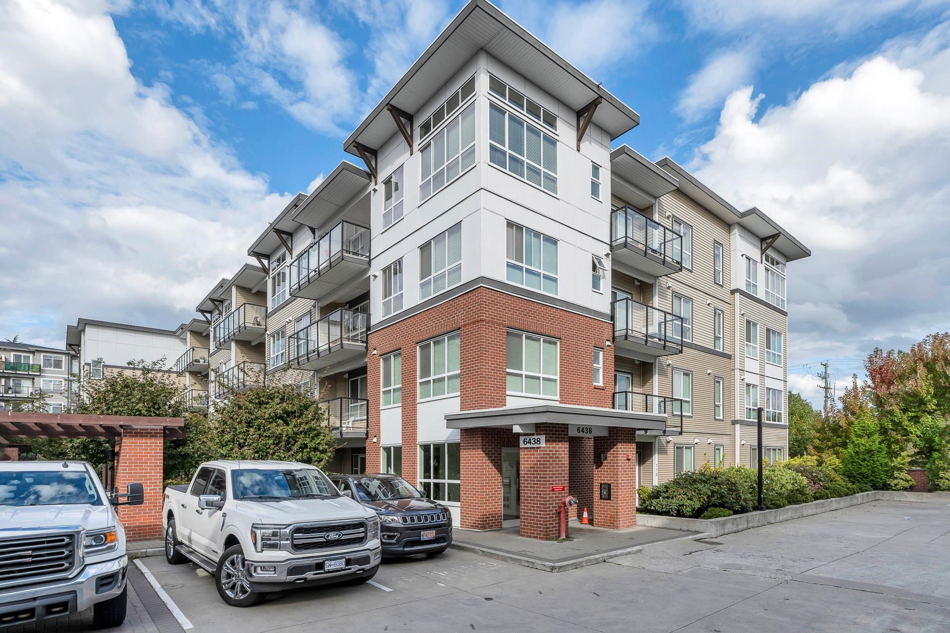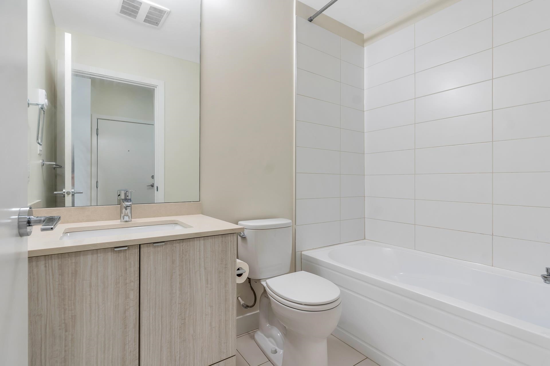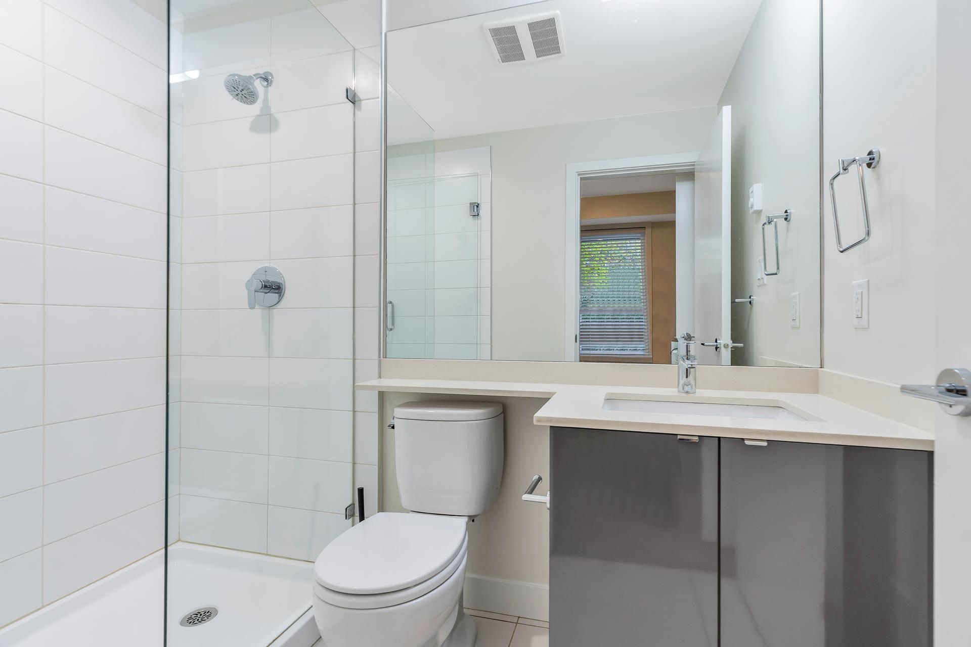 Main floor corner suite with its own private patio entry. This bright and spacious 2 bedroom, 2 bathroom home features a modern open floor plan with 9 ft ceilings, freshly painted walls, and stylish upgraded vinyl plank flooring. The kitchen offers a two-tone cabinet design with extra counter space and stainless steel appliances, perfect for both everyday living and entertaining. The primary bedroom includes new carpeting and a private ensuite. Additional highlights include two side-by-side parking stalls (...