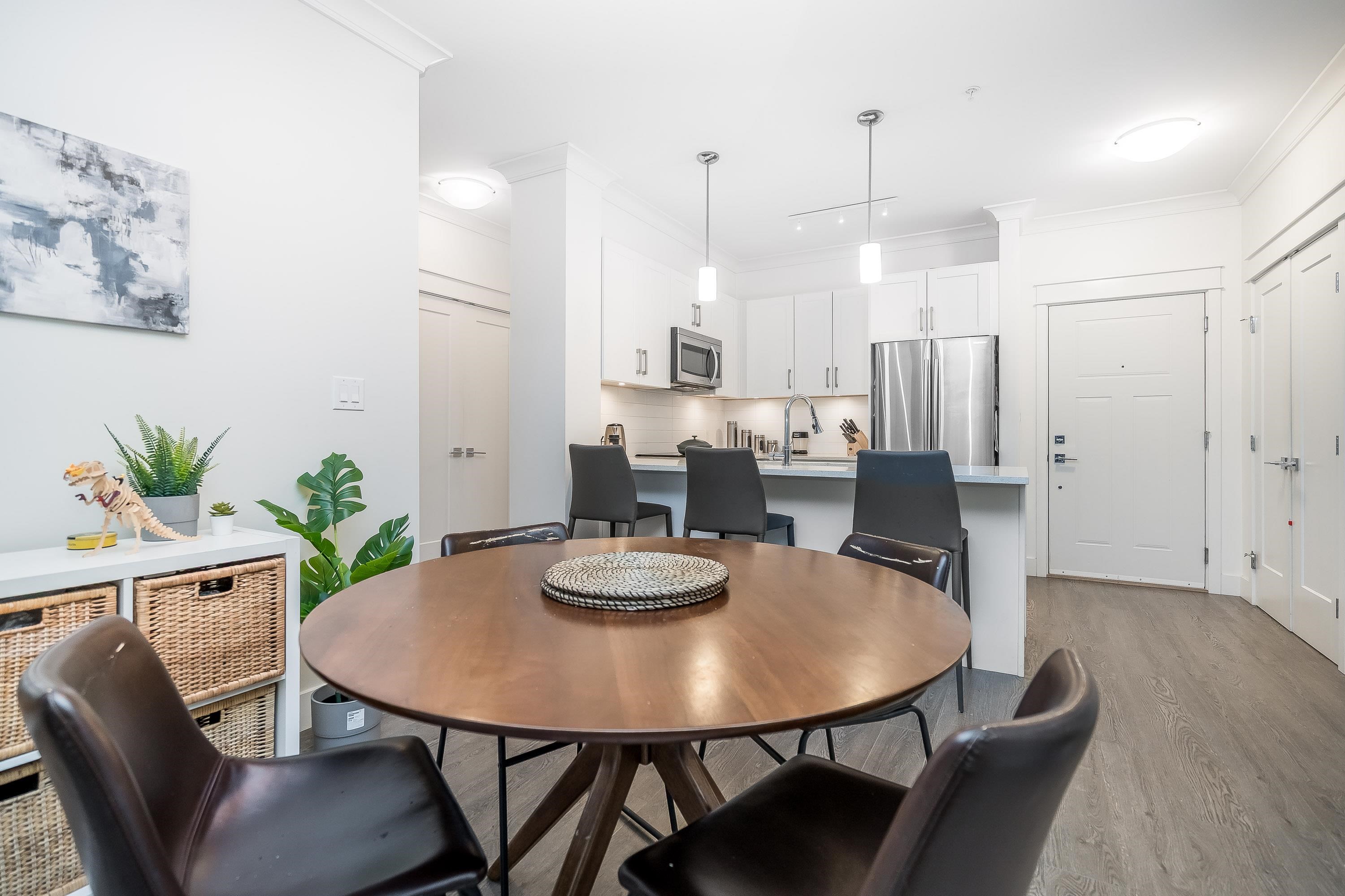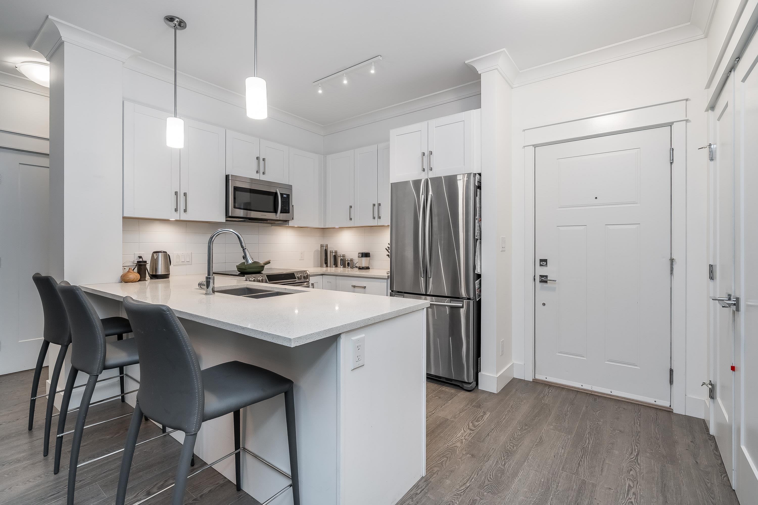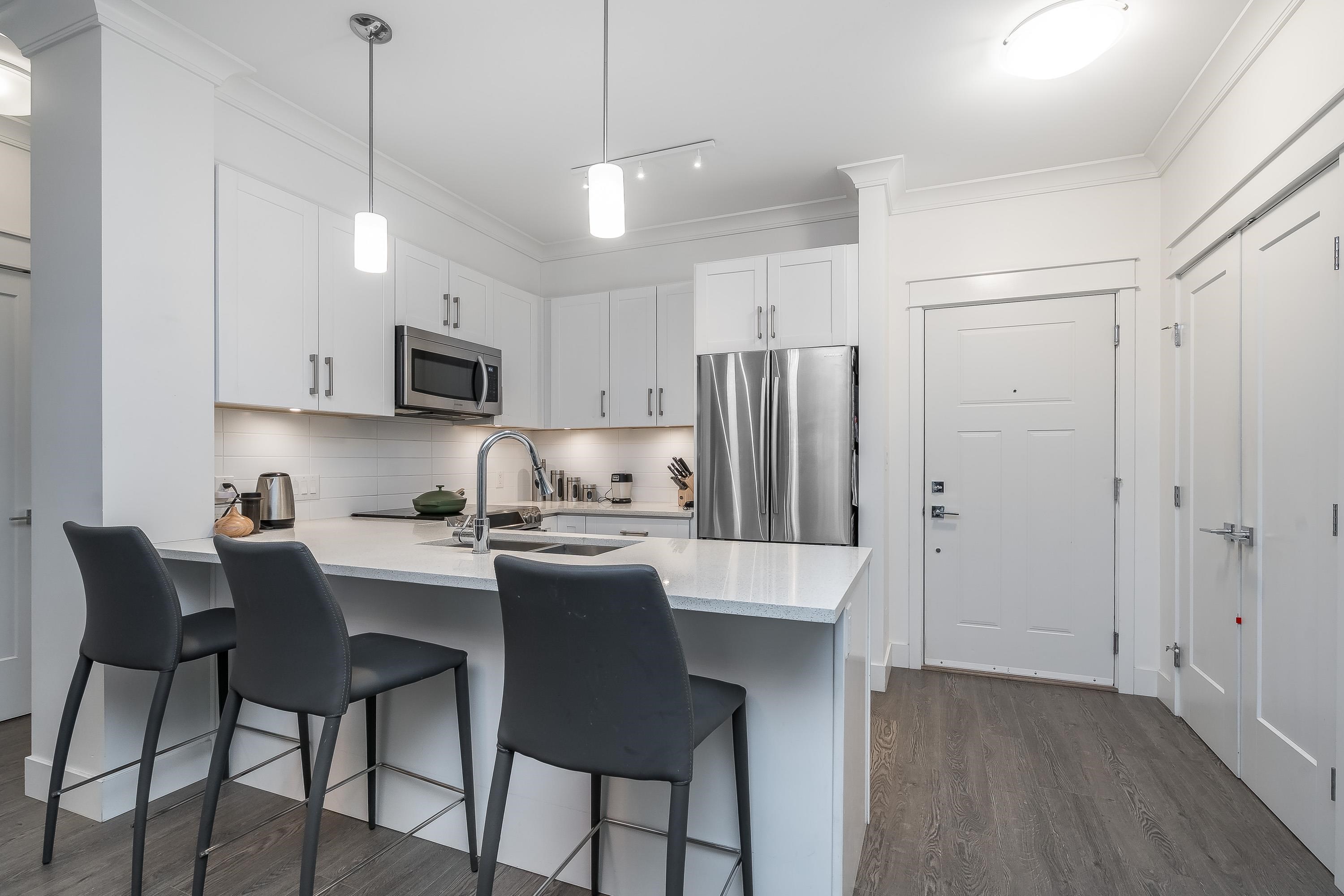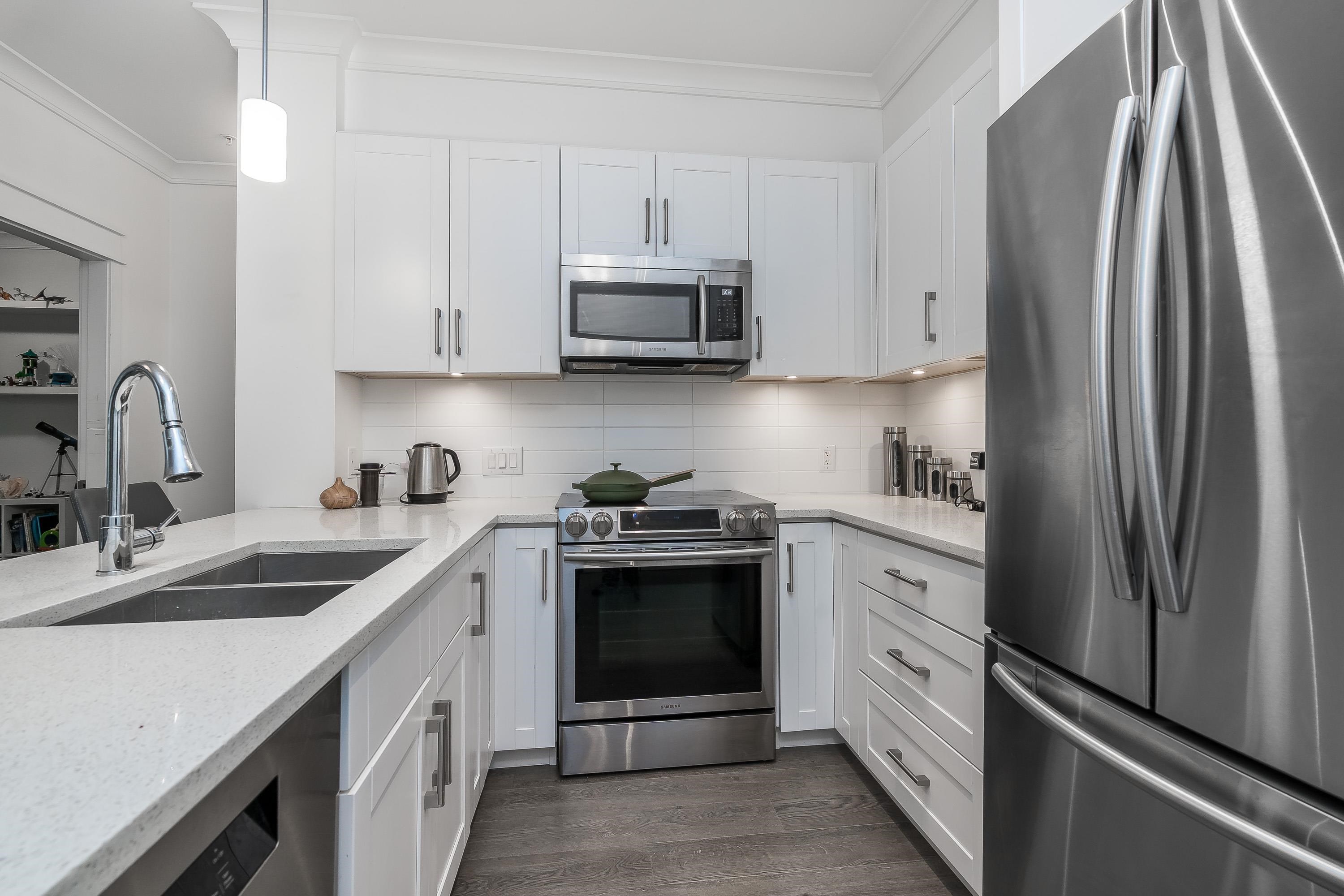 Welcome to this beautifully appointed ground-floor, courtyard-facing 2 bed, 2 bath home offering 881 sq. ft. of comfortable and well-designed living space. Featuring a superior level of finishings, including sleek stainless steel appliances, solid quartz countertops, shaker-style cabinetry, wood flooring, crown mouldings, and extensive wood trim. Enjoy seamless indoor-outdoor living with two private patios, perfect for relaxing or entertaining. Residents are surrounded by a central courtyard with a lavish w...
