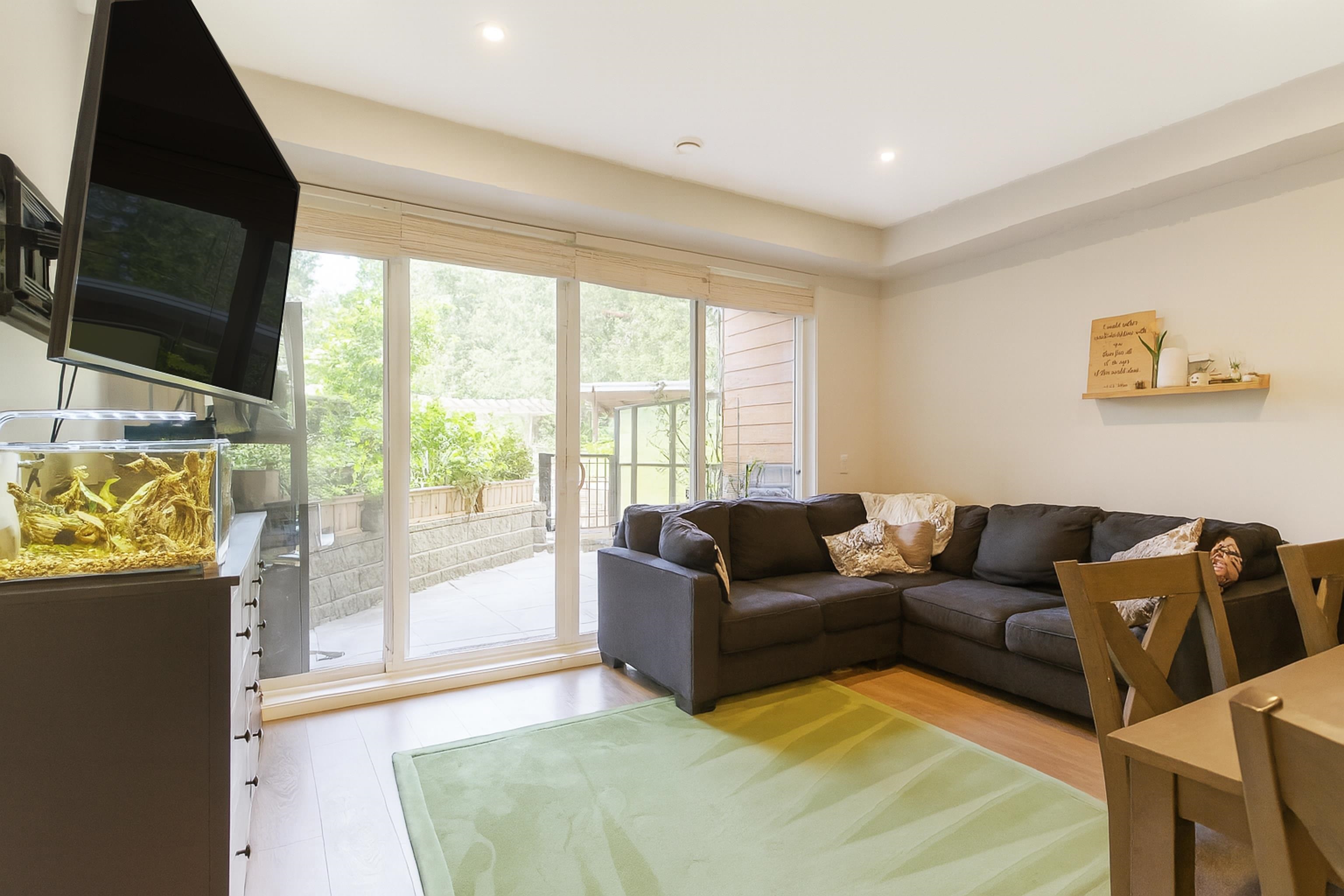 With over 1200sqft of living space this bright and spacious 3 bed ground floor unit feels like a home! Enjoy the abundance of natural light, gourmet kitchen with quartz counter tops & high end appliances, a big in suite storage room, plus a spacious primary bedroom with walk-in closet & a 5 piece ensuite. A large sliding door opens up to your own private patio leading out to the quiet & secure community courtyard (backing onto protected green space) with fire pit, comfy chairs & tables & a children's play ...