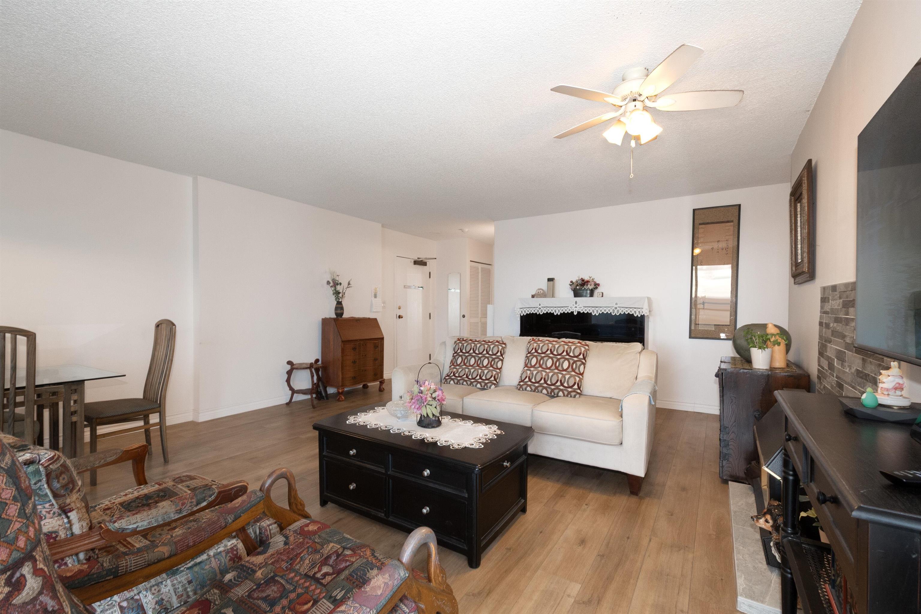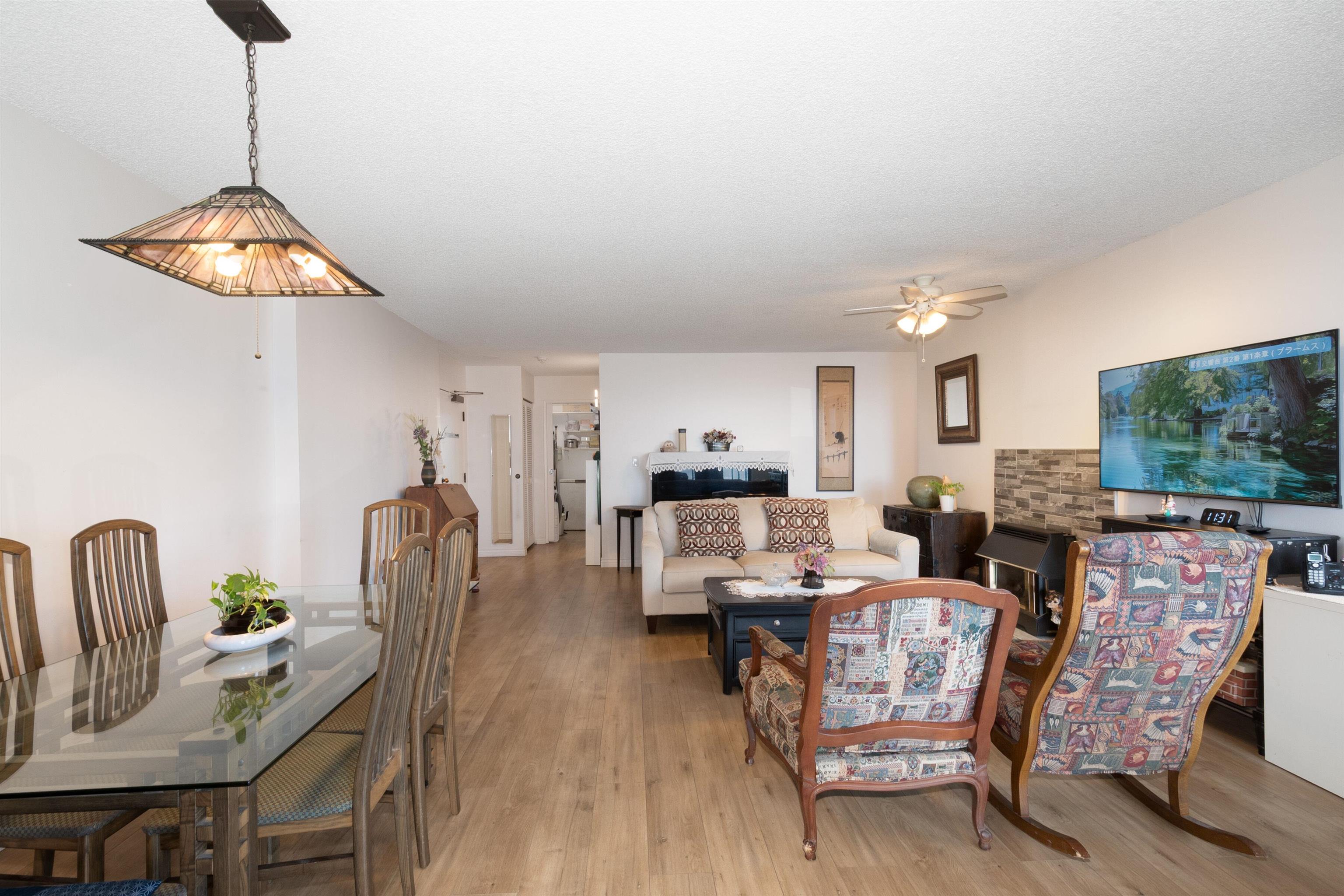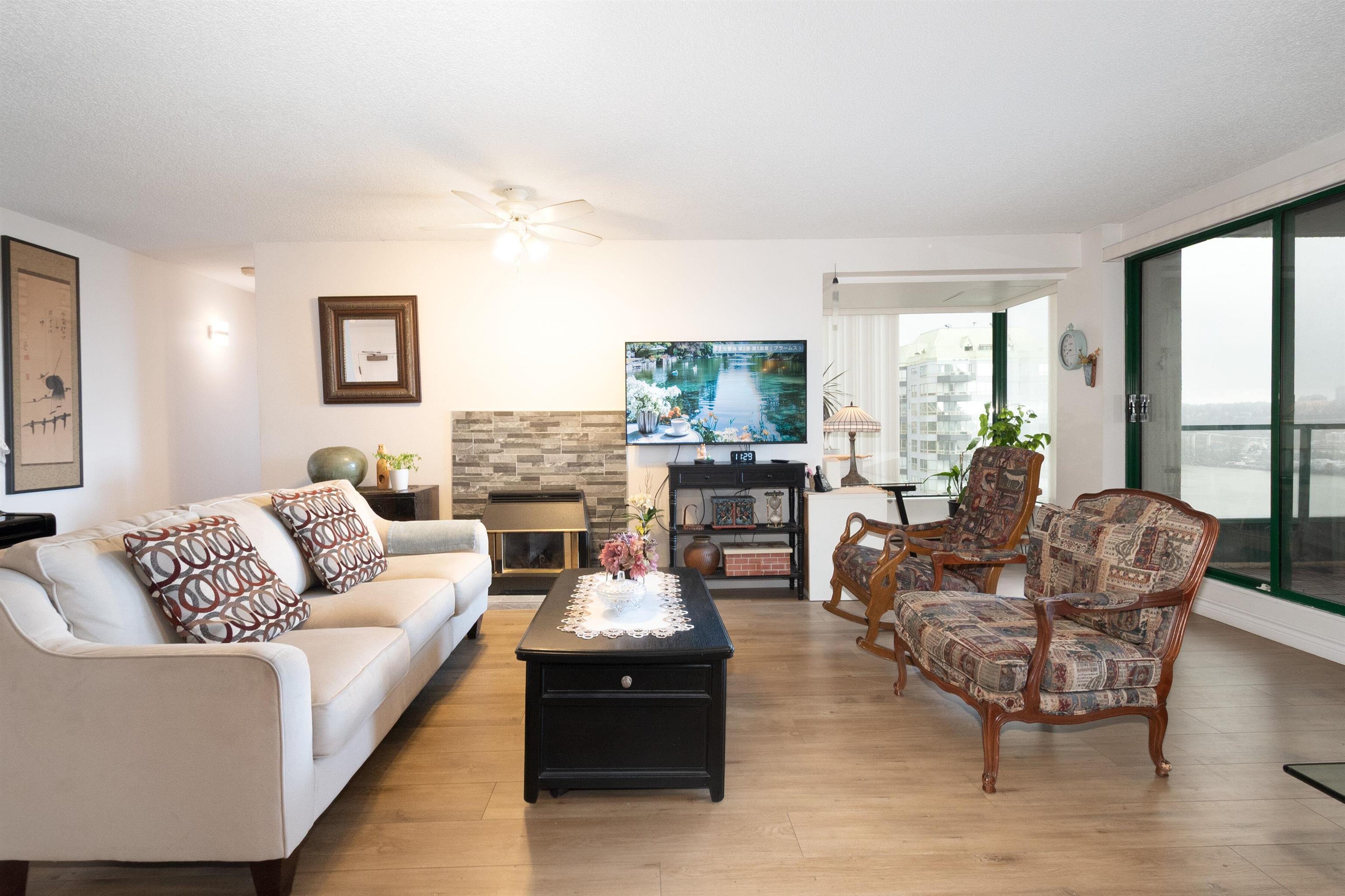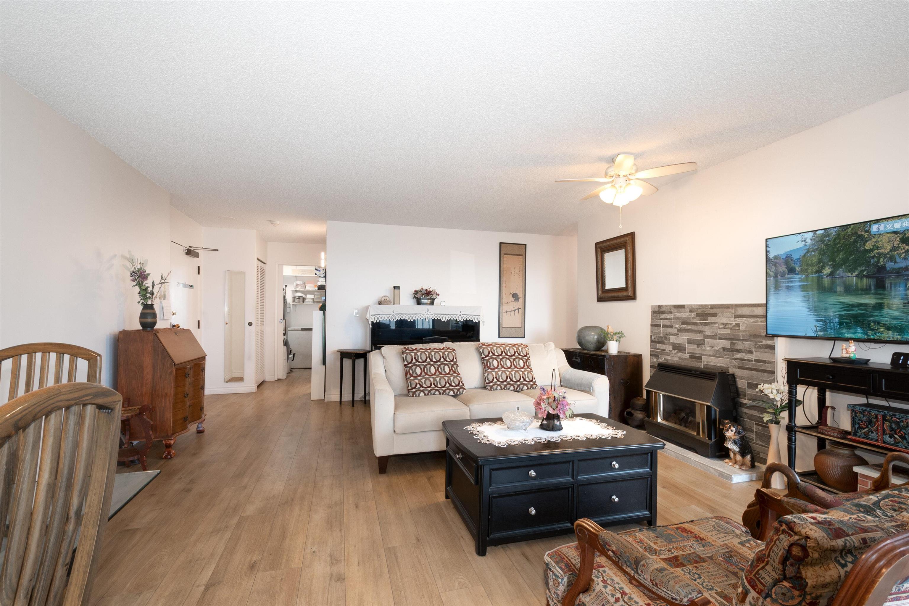 Beautifully maintained east-facing unit with Fraser River and mountain views. Fully renovated in 2023 featuring a modern kitchen with white cabinetry, quartz countertops, and engineered flooring throughout. Spacious layout with gas fireplace and dedicated nook ideal for home office. Open balcony to enjoy morning sun and views. Well-managed building with recent upgrades including new elevator and brand-new roof. Amenities include indoor pool, hot-\tub, and exercise room. Direct access to SkyTrain for ultimat...