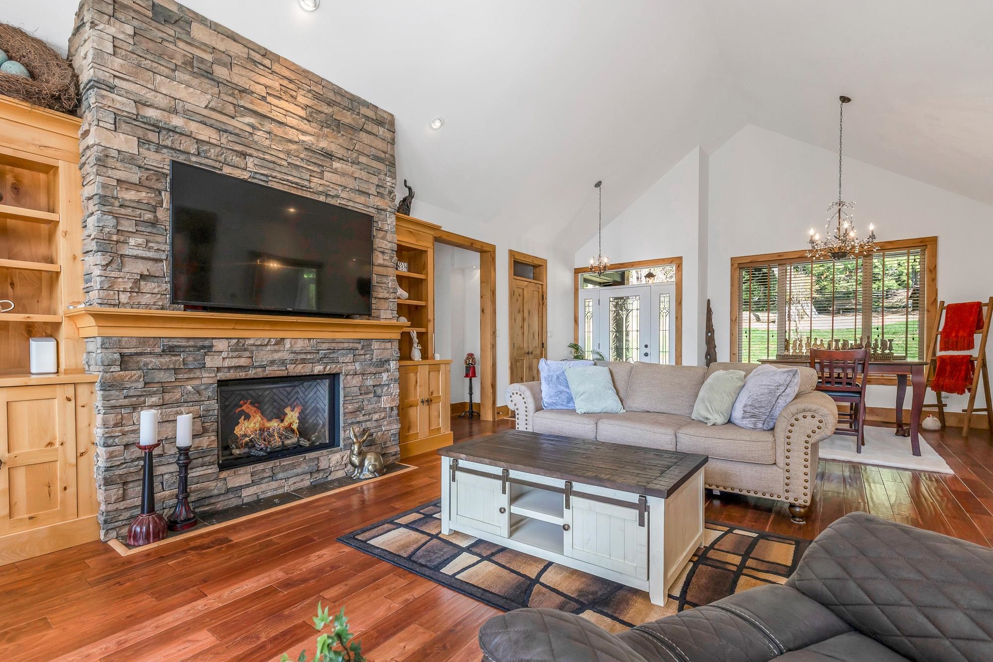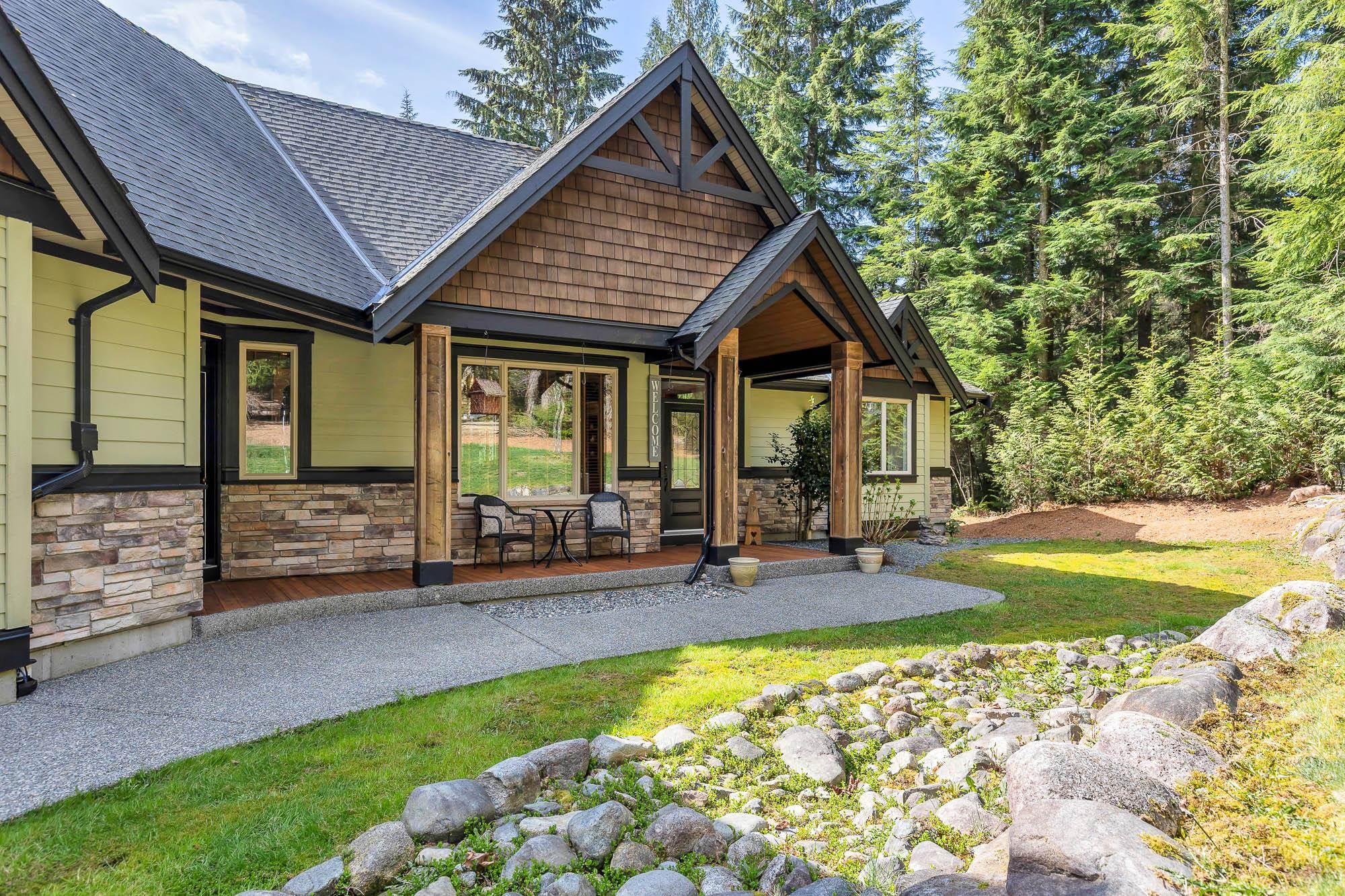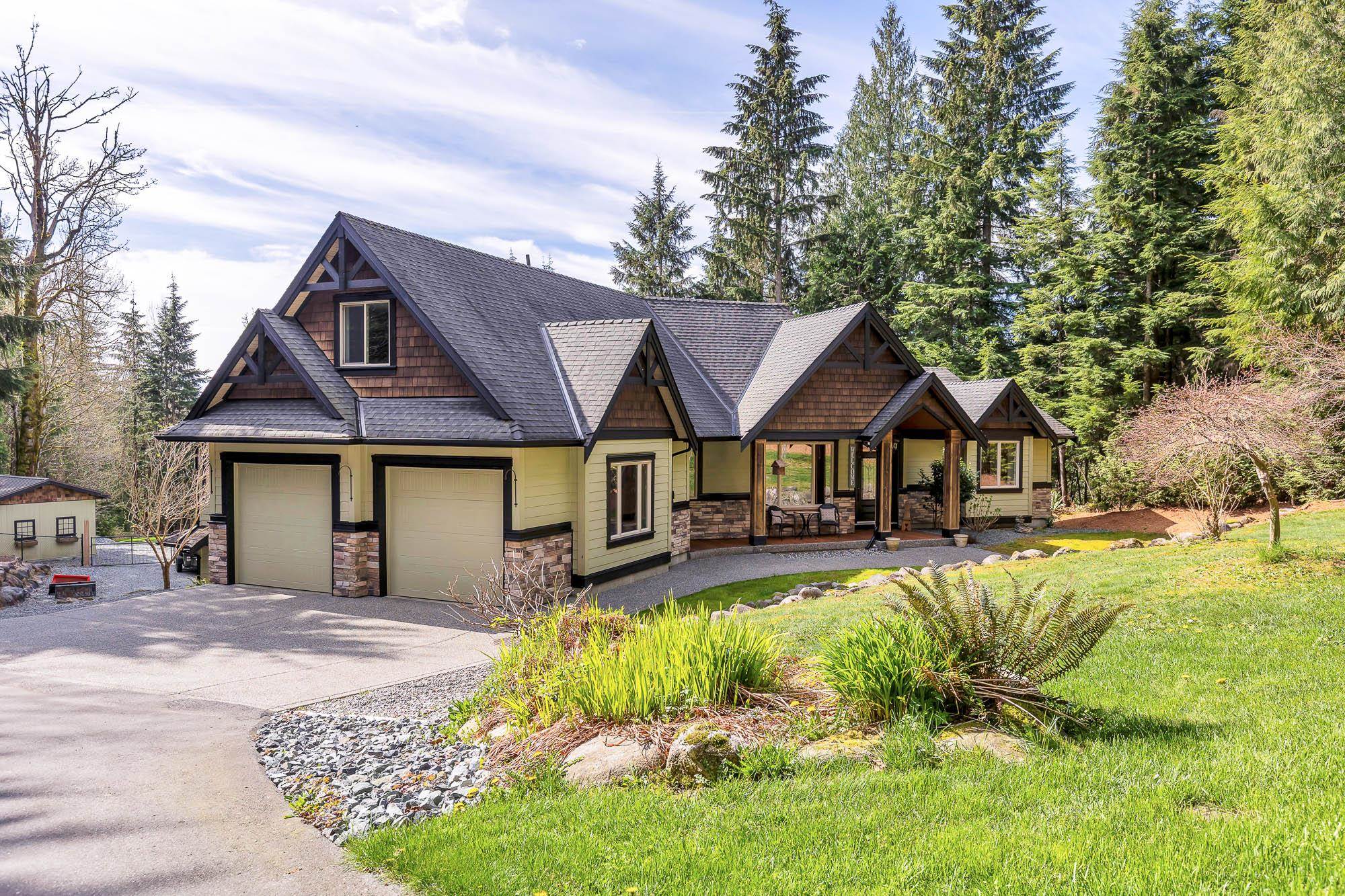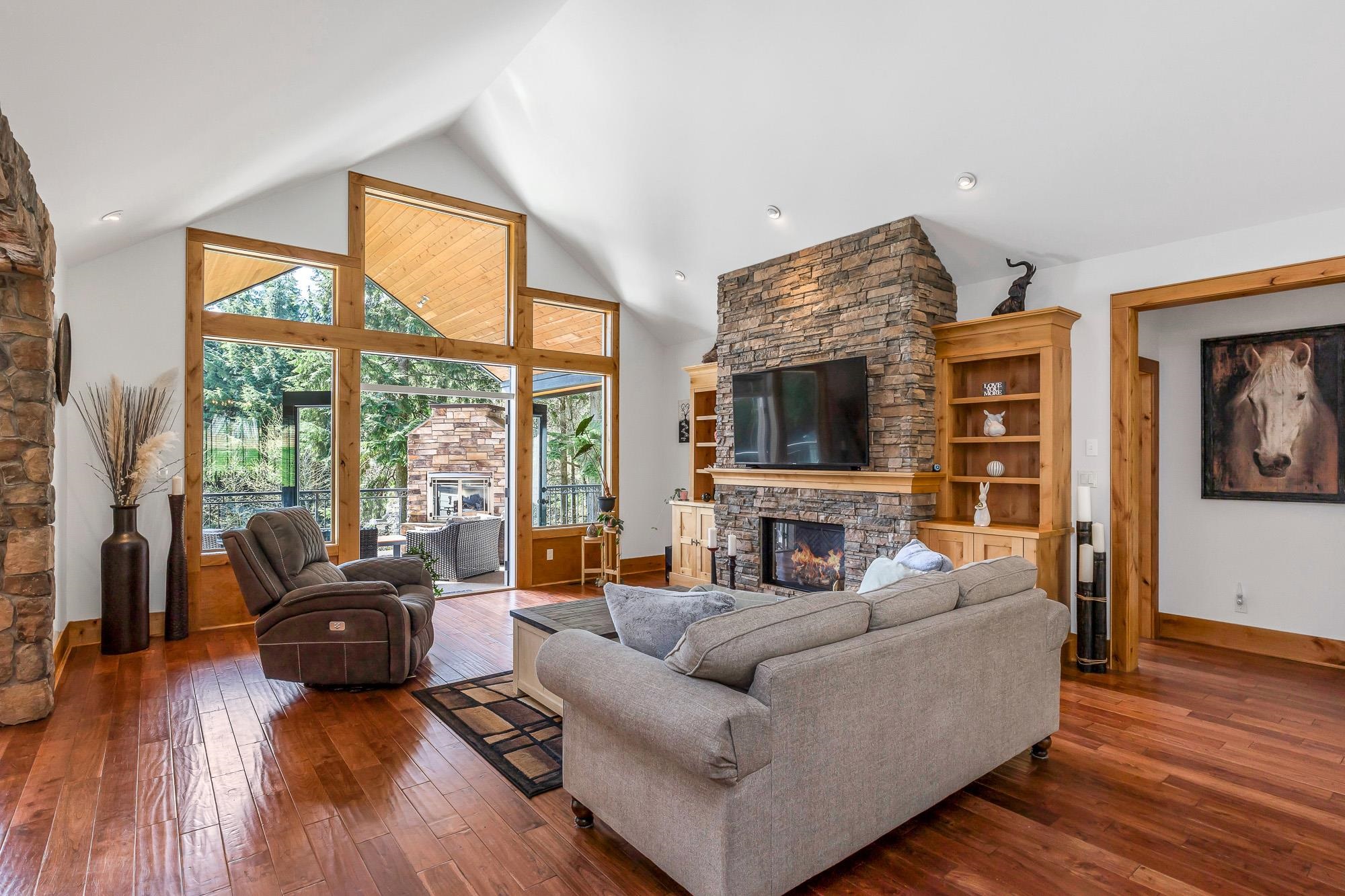 Tucked away on a quiet no through road, this stunning 4,270 sq ft home sits on a private 2.14 acre property offering true acreage living just minutes between Maple Ridge and Mission. Designed with a warm rustic cabin inspired feel, the home features soaring vaulted ceilings, a dramatic floor to ceiling rock fireplace, and rich wood detailing throughout. The main floor offers a spacious primary retreat with a full 5 piece ensuite, while the living space opens onto a covered vaulted deck with its own gas fire...