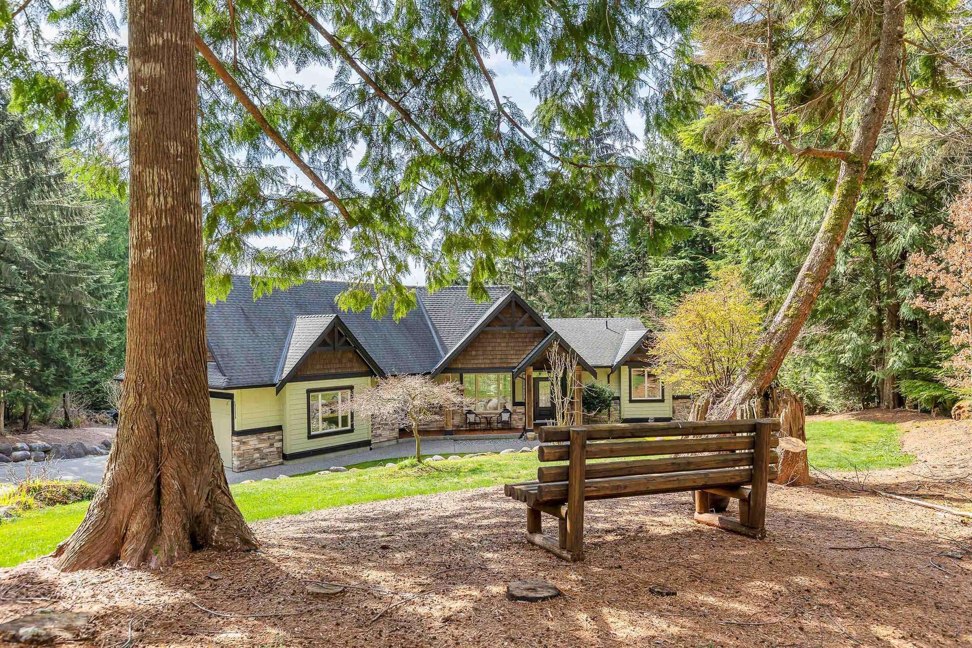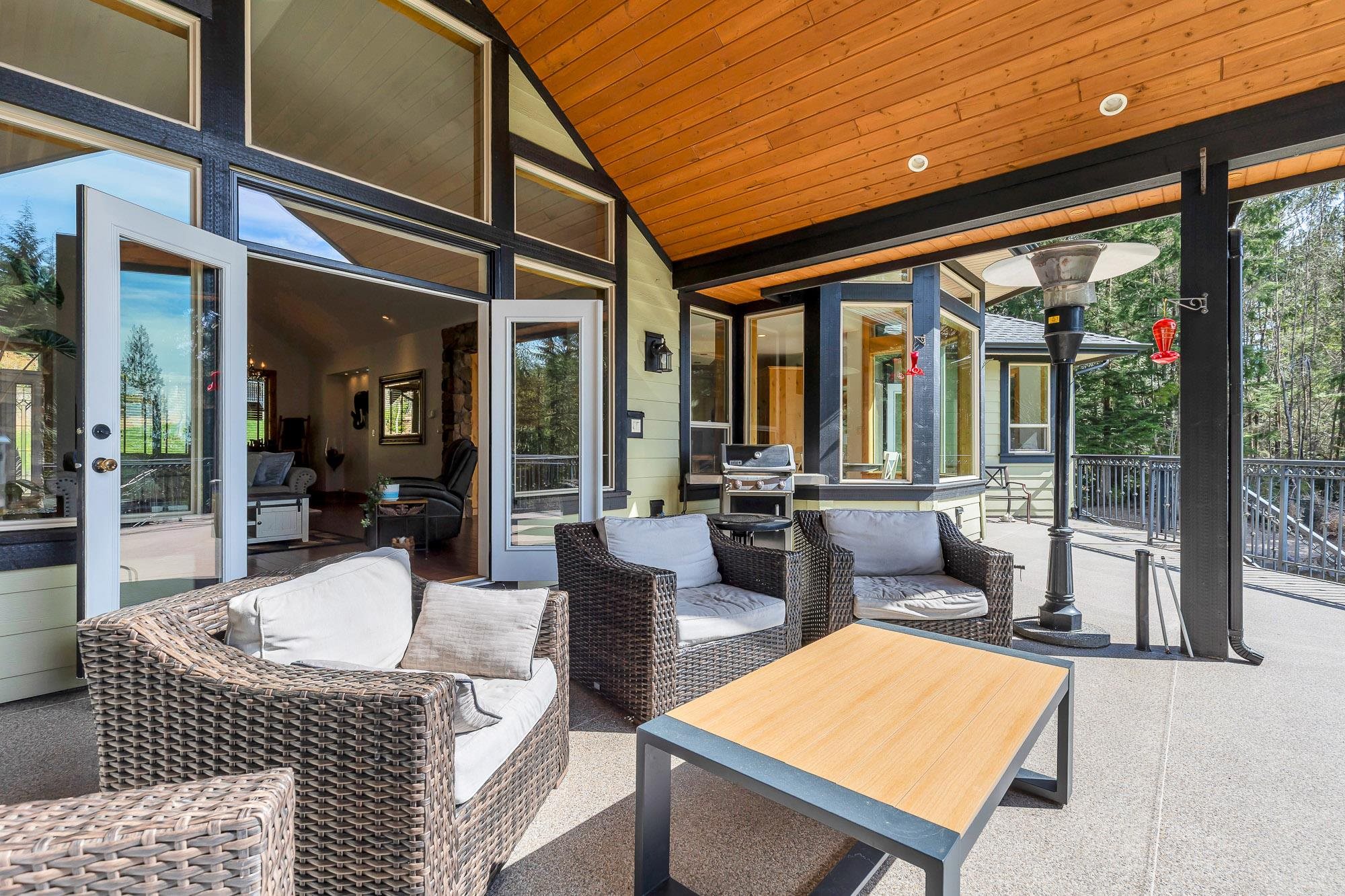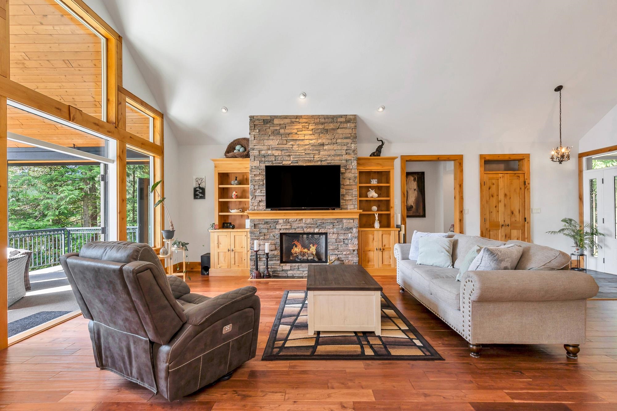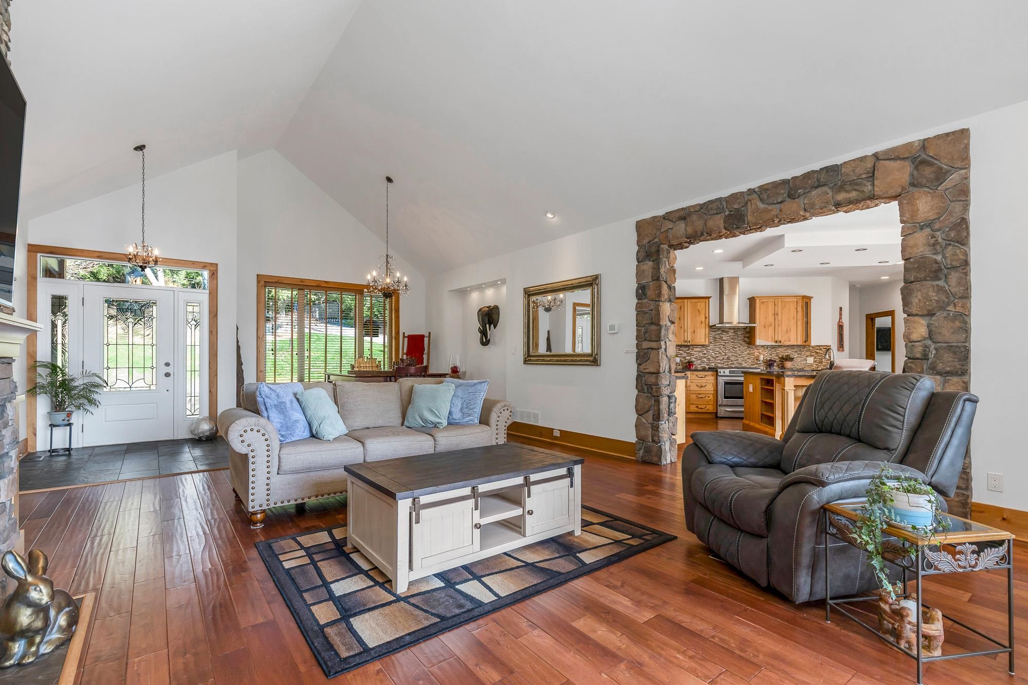 Tucked away on a quiet no through road, this stunning 4,270 sq ft home sits on a private 2.14 acre property offering true acreage living just minutes between Maple Ridge and Mission. Designed with a warm rustic cabin inspired feel, the home features soaring vaulted ceilings, a dramatic floor to ceiling rock fireplace, and rich wood detailing throughout. The main floor offers a spacious primary retreat with a full 5 piece ensuite, while the living space opens onto a covered vaulted deck with its own gas fire...