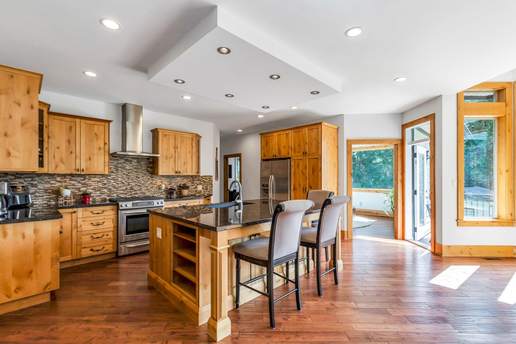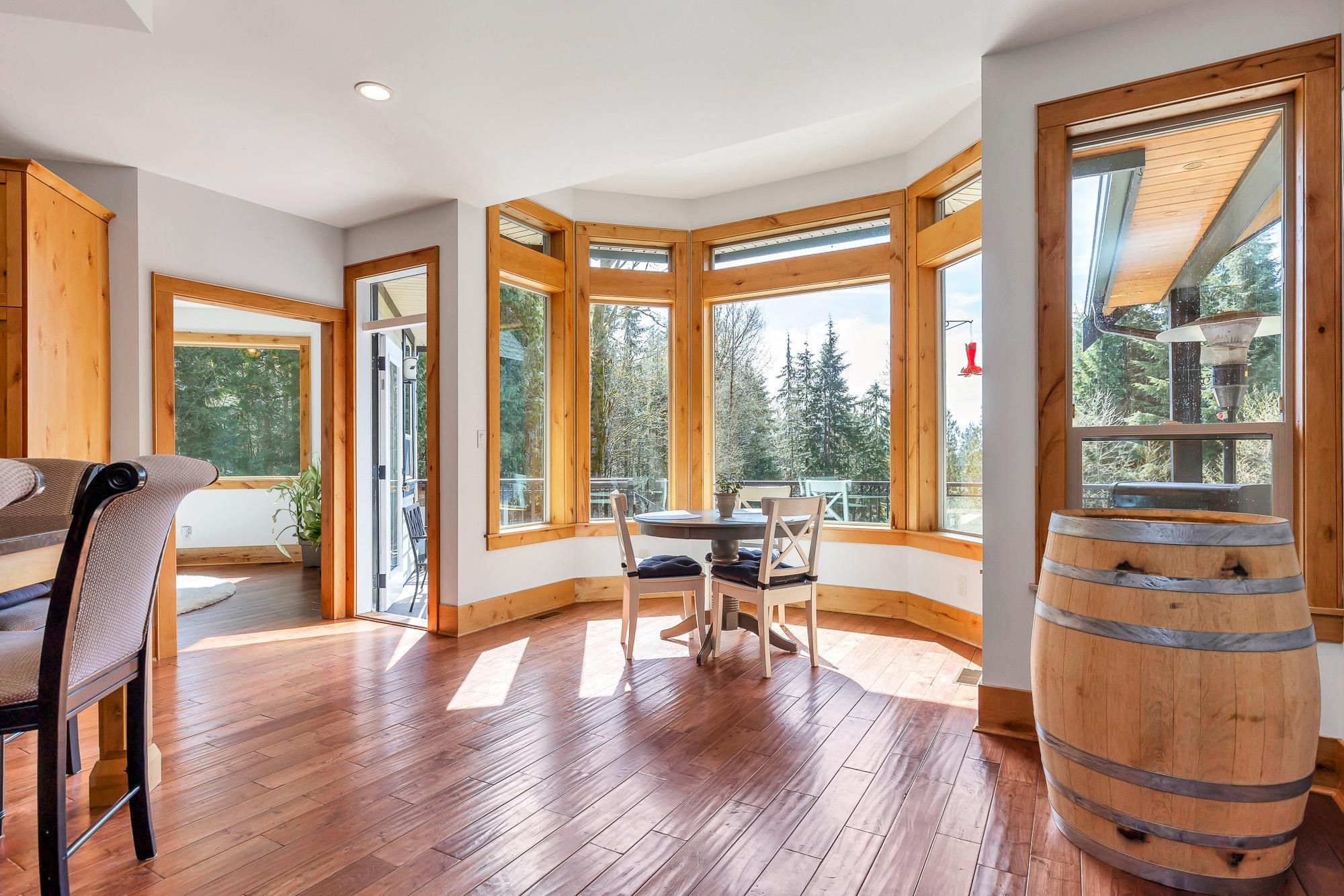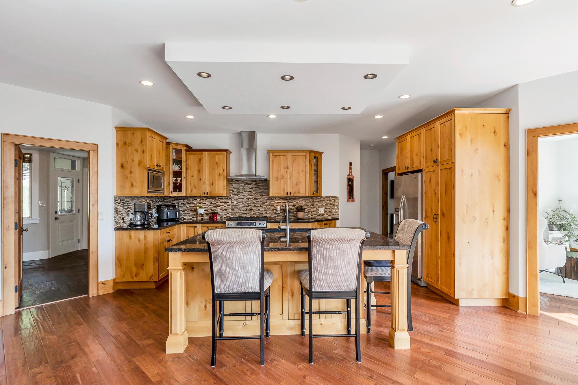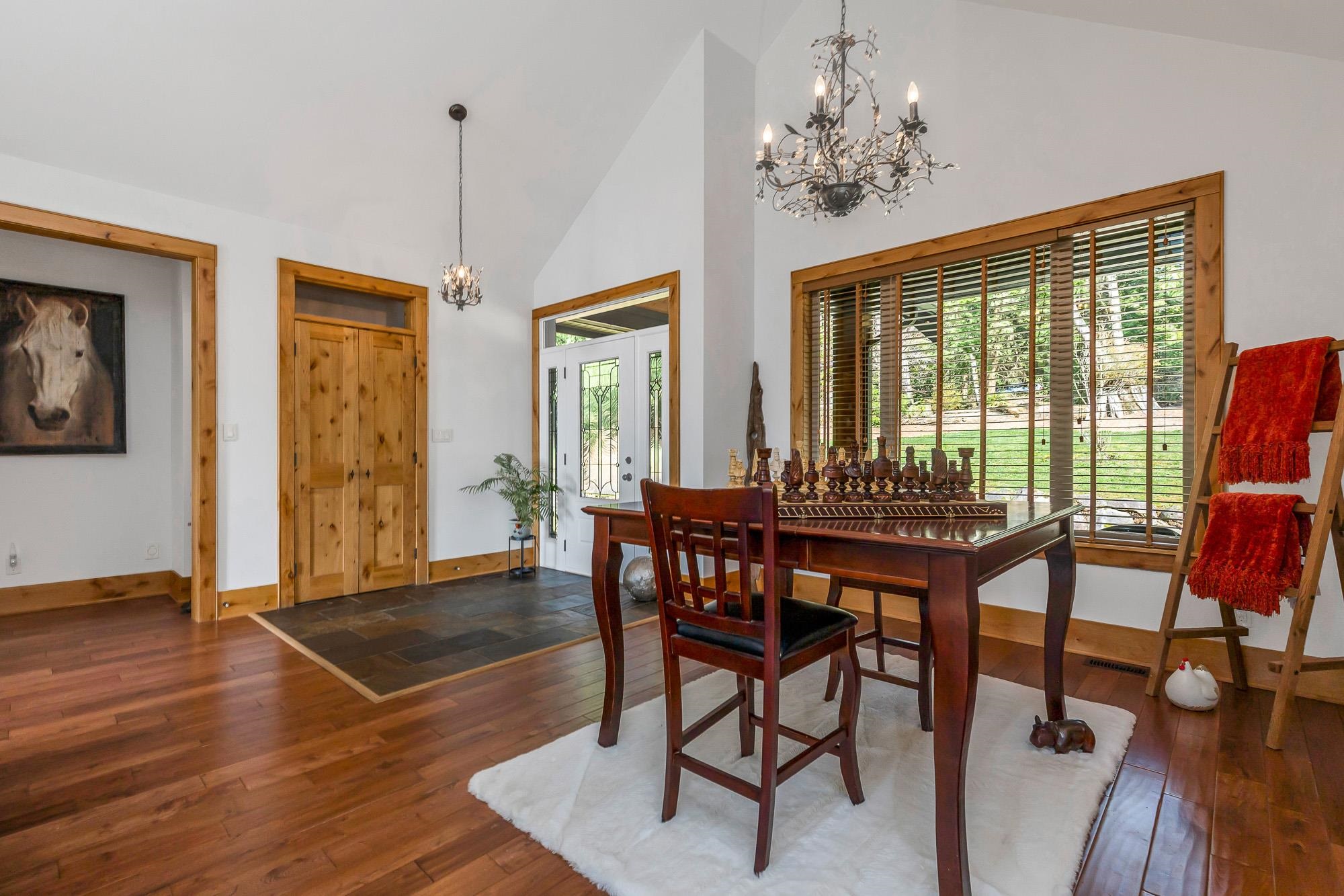 Tucked away on a quiet no through road, this stunning 4,270 sq ft home sits on a private 2.14 acre property offering true acreage living just minutes between Maple Ridge and Mission. Designed with a warm rustic cabin inspired feel, the home features soaring vaulted ceilings, a dramatic floor to ceiling rock fireplace, and rich wood detailing throughout. The main floor offers a spacious primary retreat with a full 5 piece ensuite, while the living space opens onto a covered vaulted deck with its own gas fire...