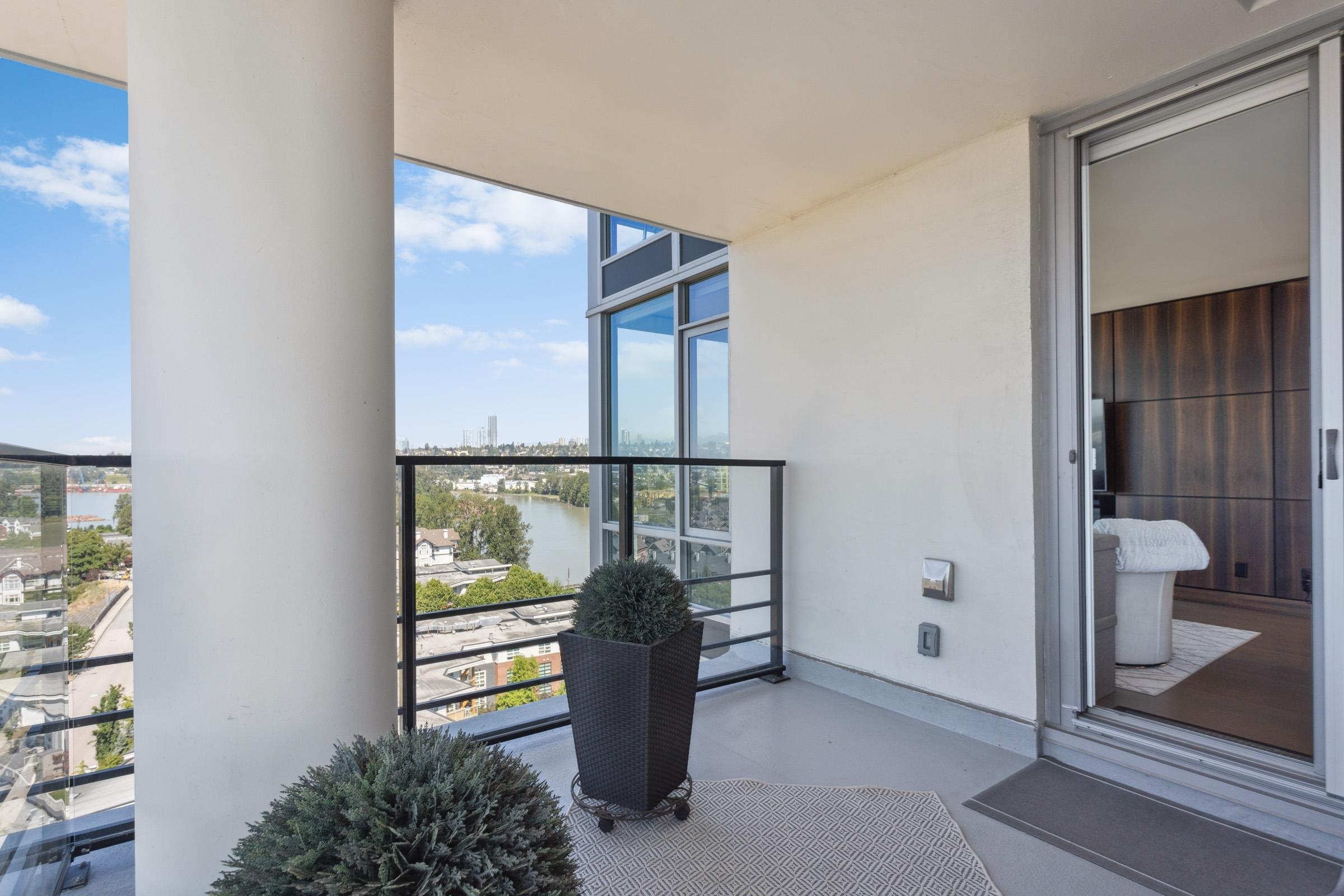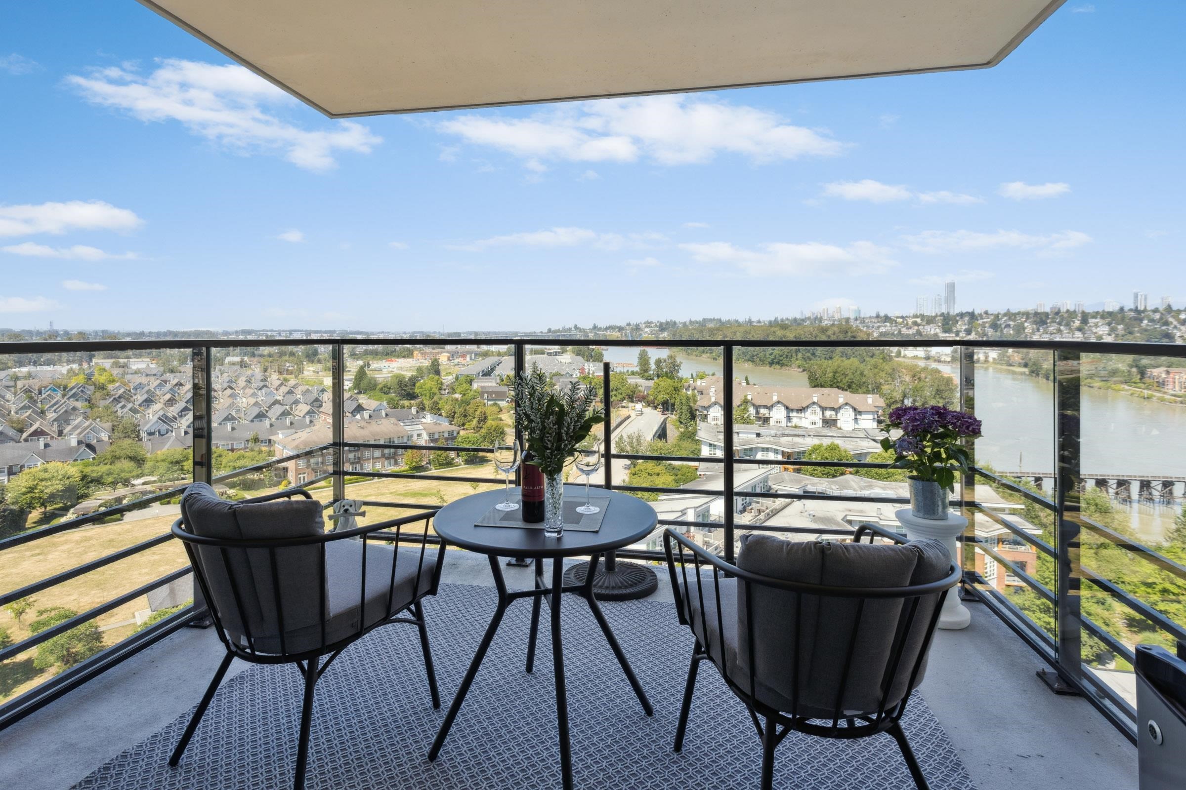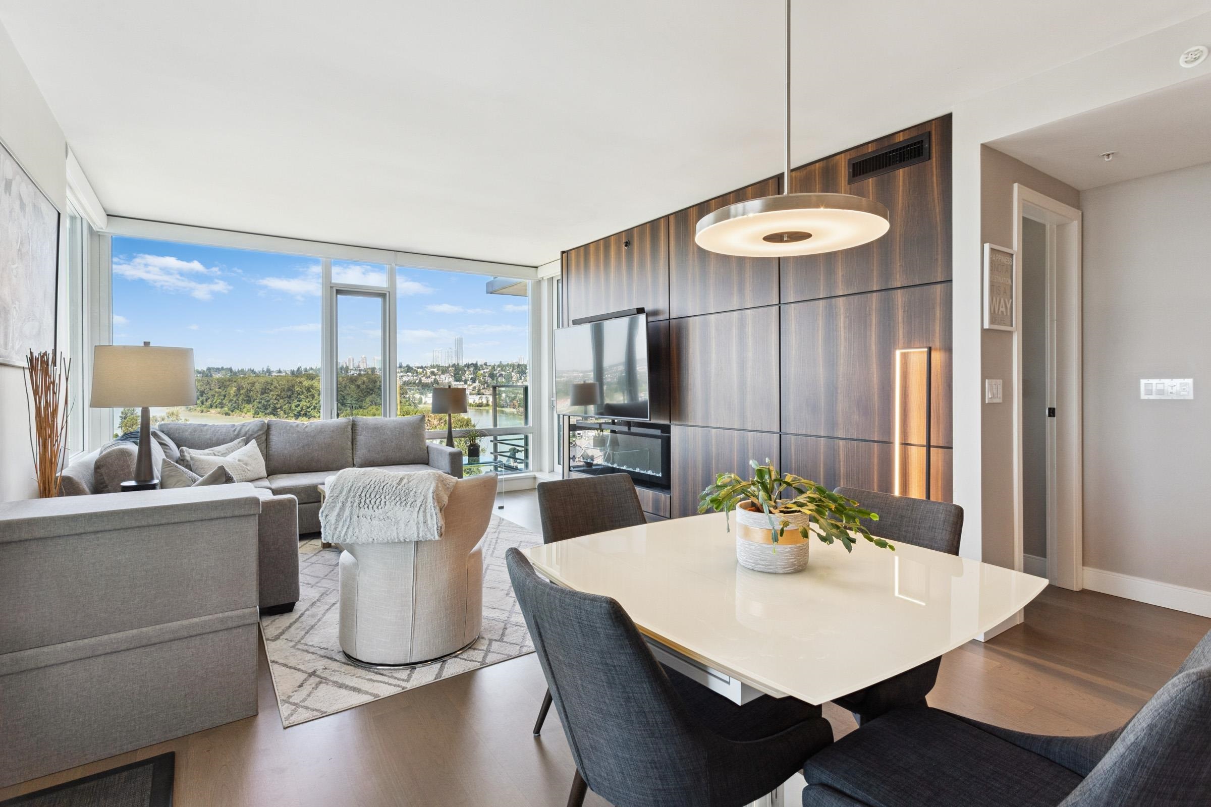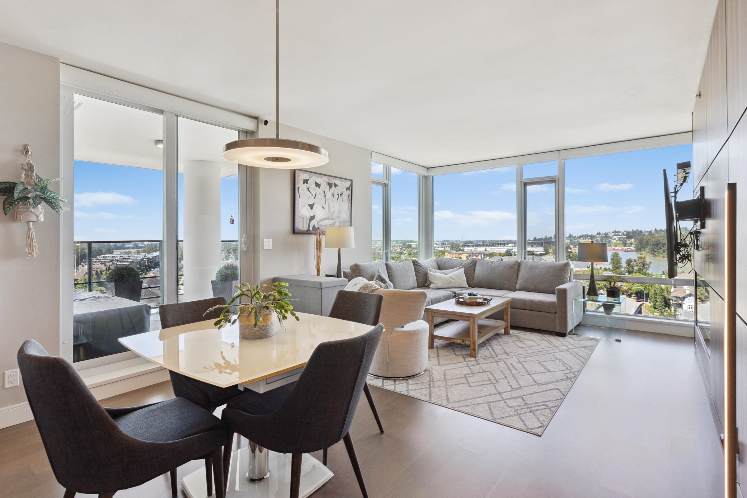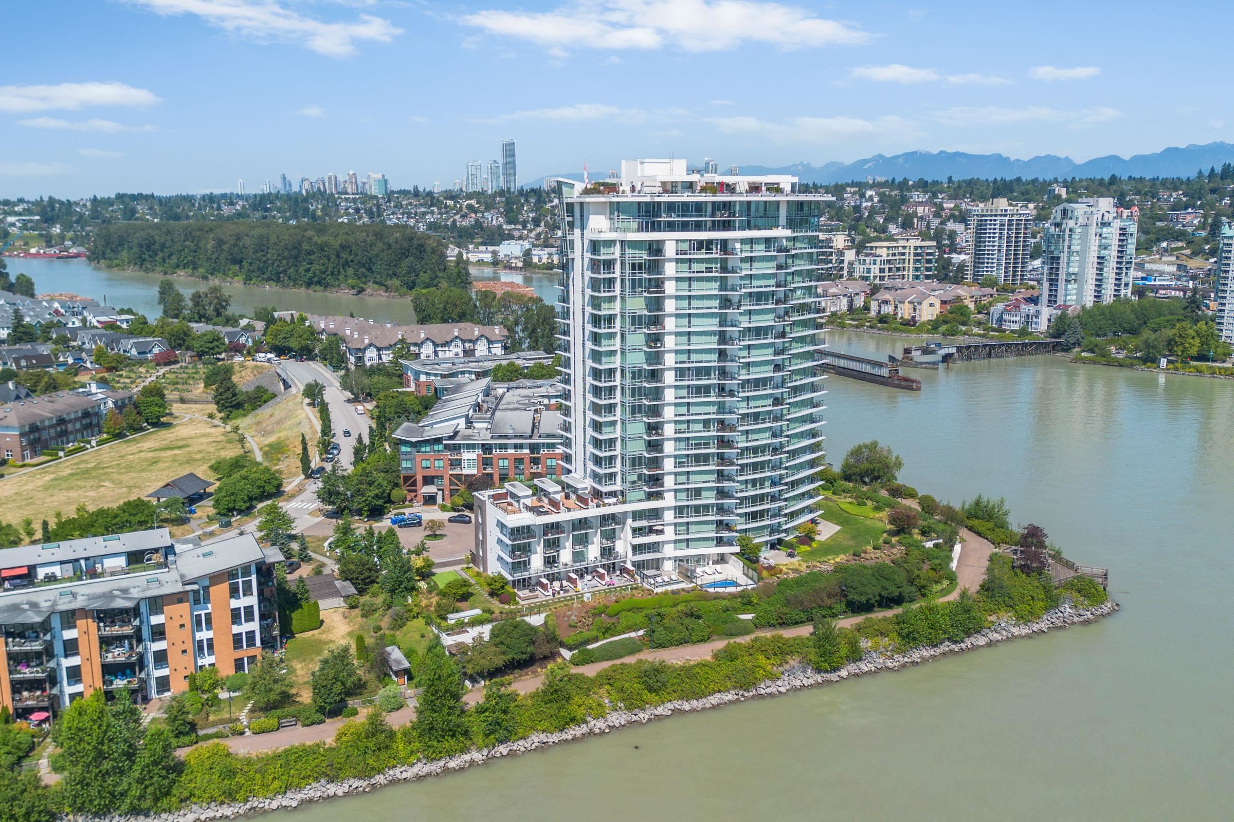 Welcome to THE PENINSULA, New West's crown jewel of Port Royal, the pinnacle of timeless modernity. Redefining luxury with high-end finishes, appliances and resort amenities (jacuzzi, guest suite, steam/amenity/billiard/cinema rooms + more), this METICULOUSLY maintained corner/end-unit features over 1200 sq ft of panoramic views of the river, mountains + city, TWO large bedrooms each w/ ensuite, + extra powder room and TWO private balconies. Open floor plan to entertain from your chef's kitchen with gas sto...