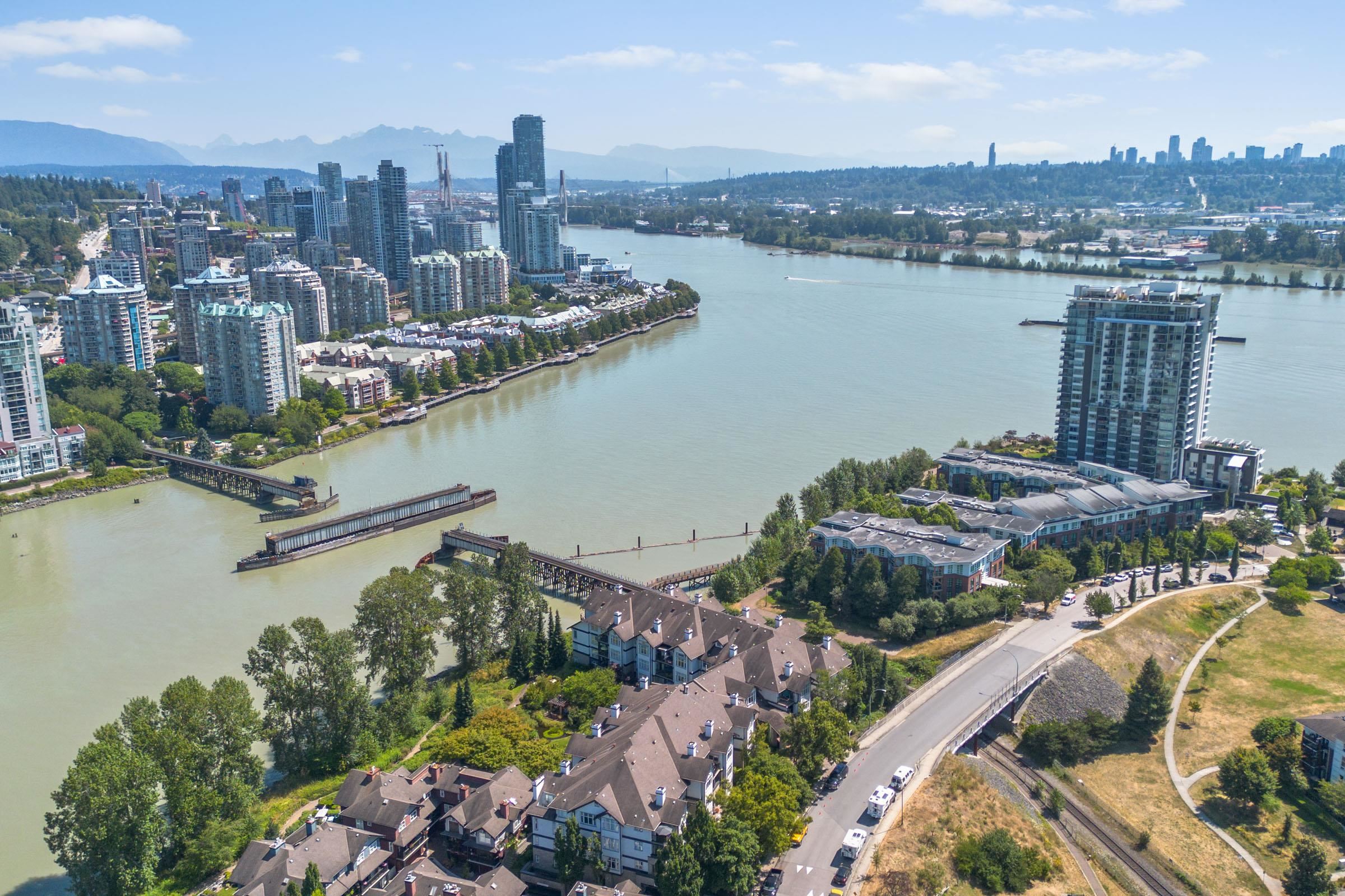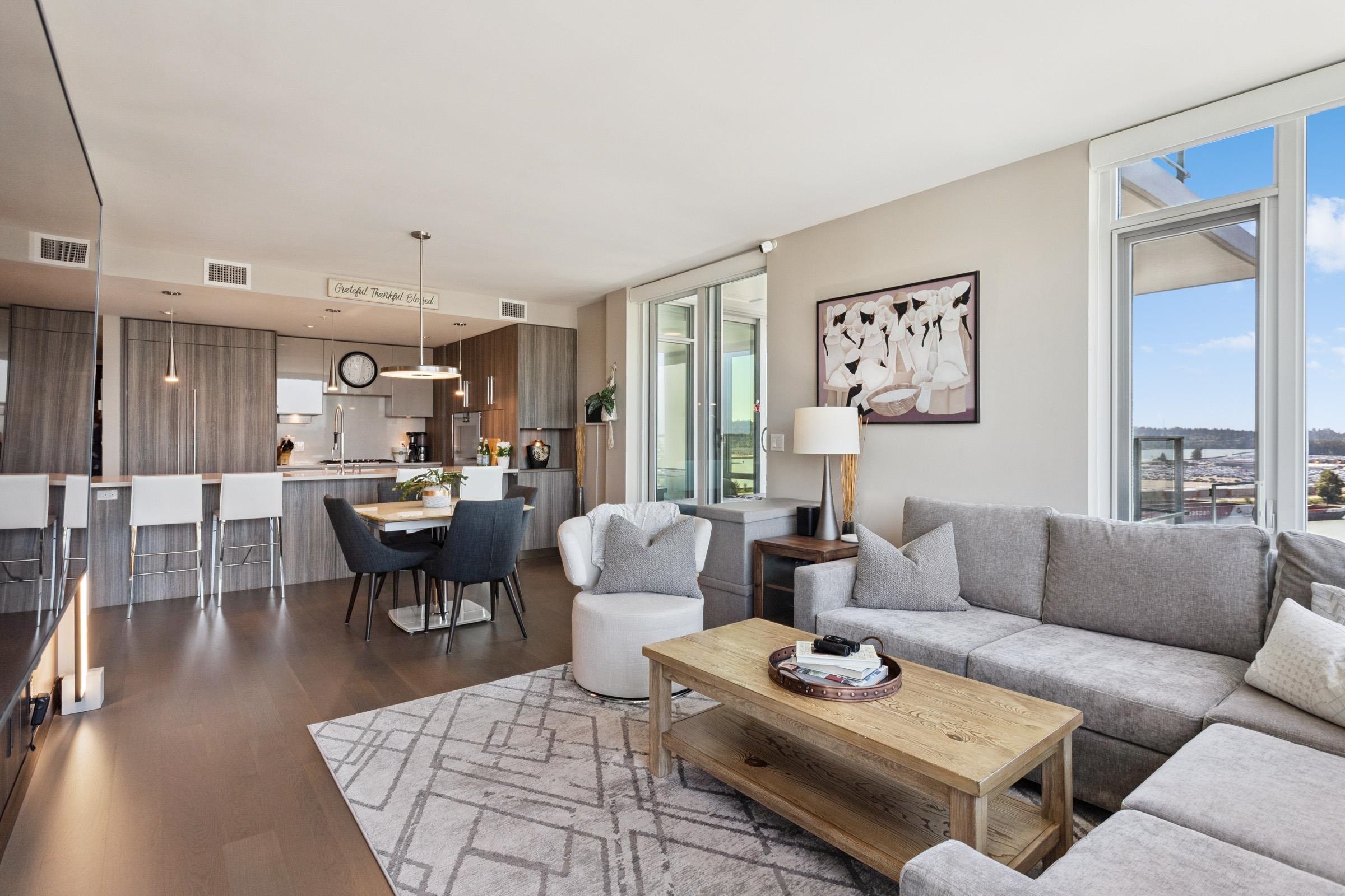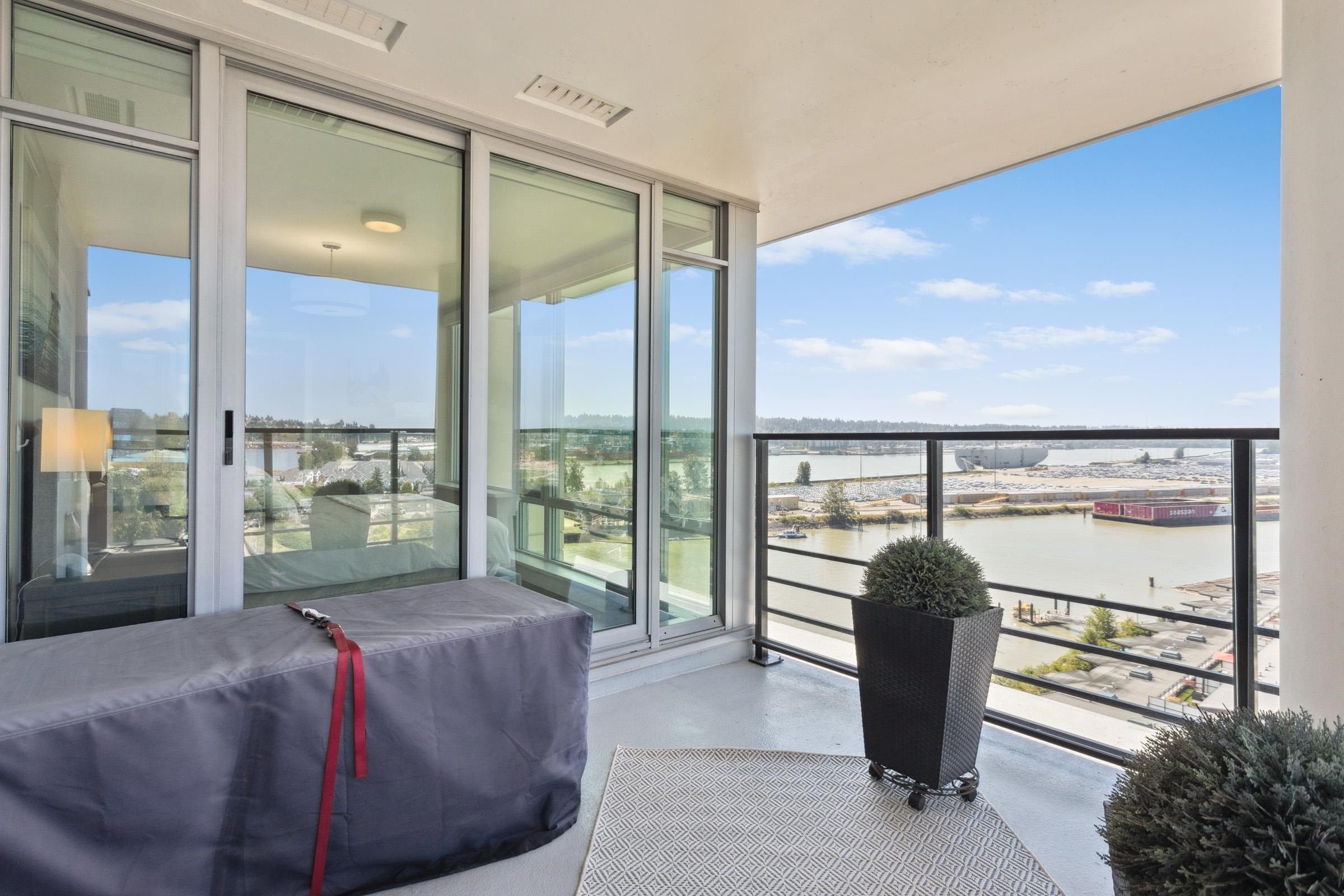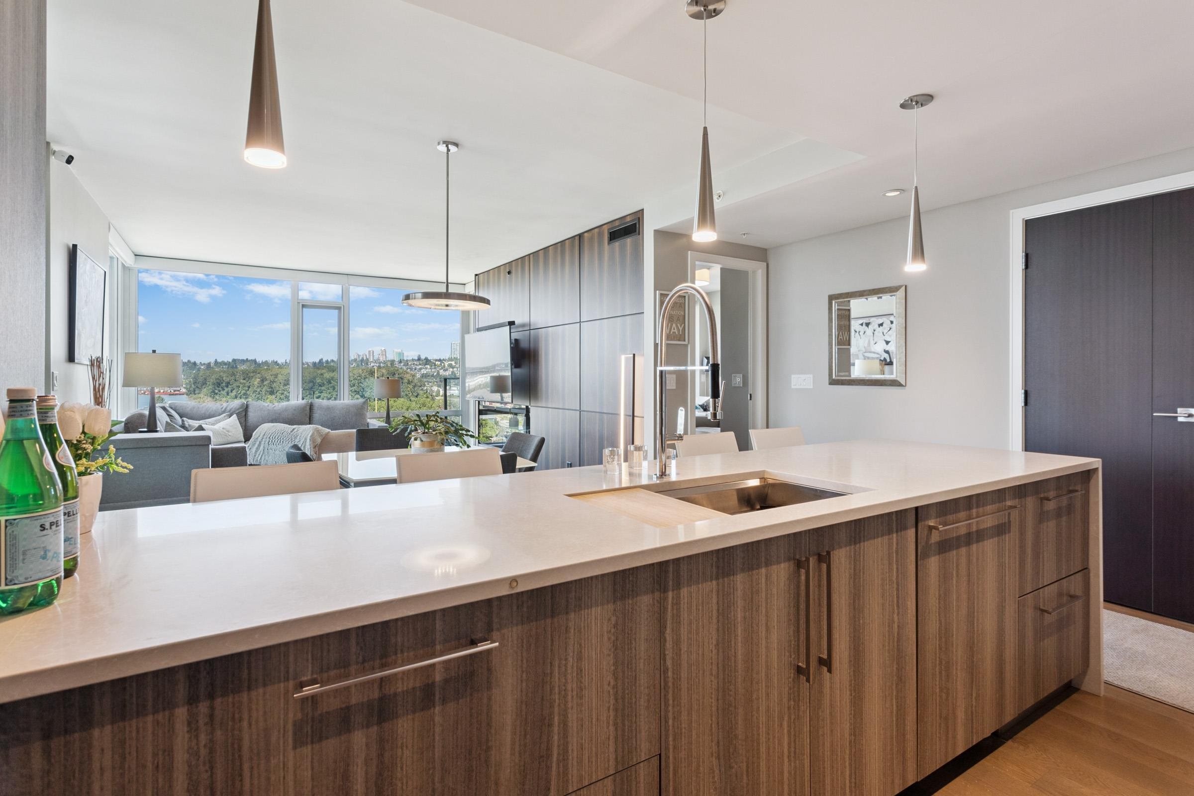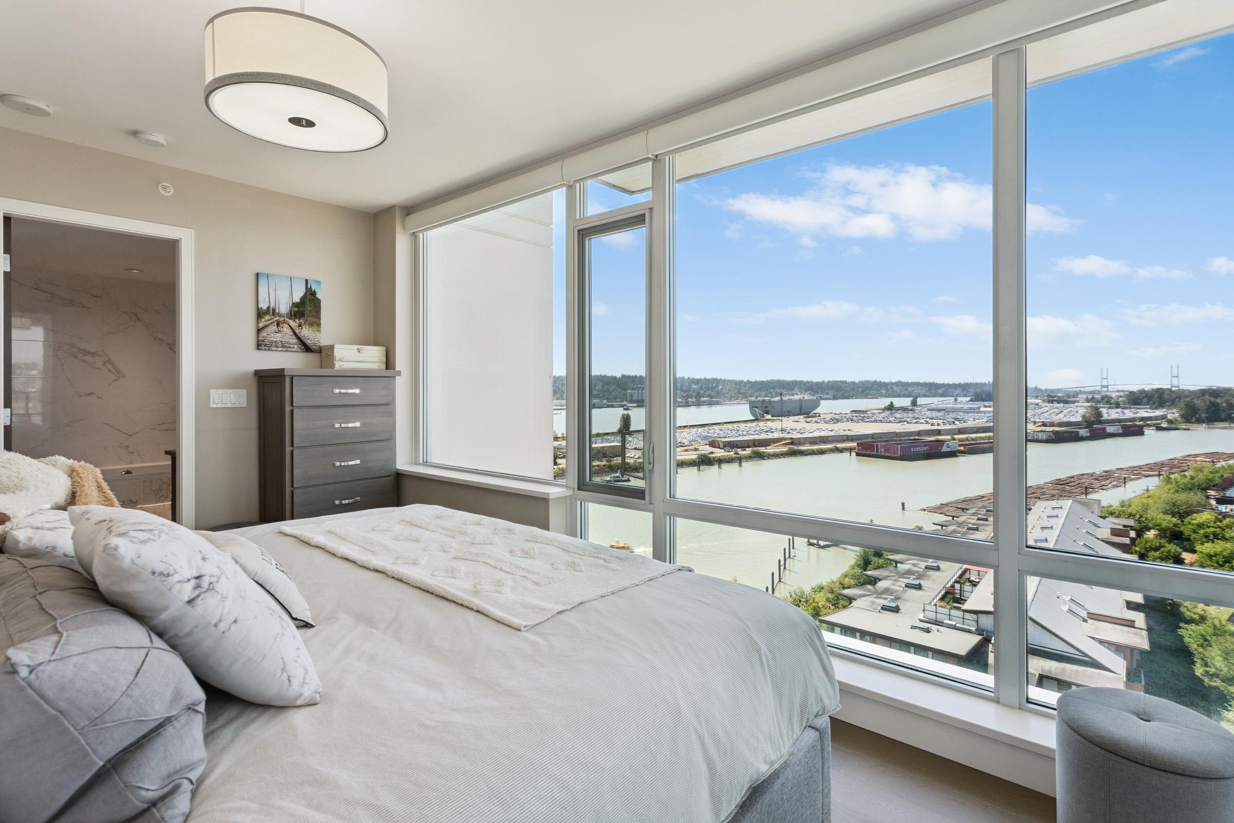 Welcome to THE PENINSULA, New West's crown jewel of Port Royal, the pinnacle of timeless modernity. Redefining luxury with high-end finishes, appliances and resort amenities (jacuzzi, guest suite, steam/amenity/billiard/cinema rooms + more), this METICULOUSLY maintained corner/end-unit features over 1200 sq ft of panoramic views of the river, mountains + city, TWO large bedrooms each w/ ensuite, + extra powder room and TWO private balconies. Open floor plan to entertain from your chef's kitchen with gas sto...