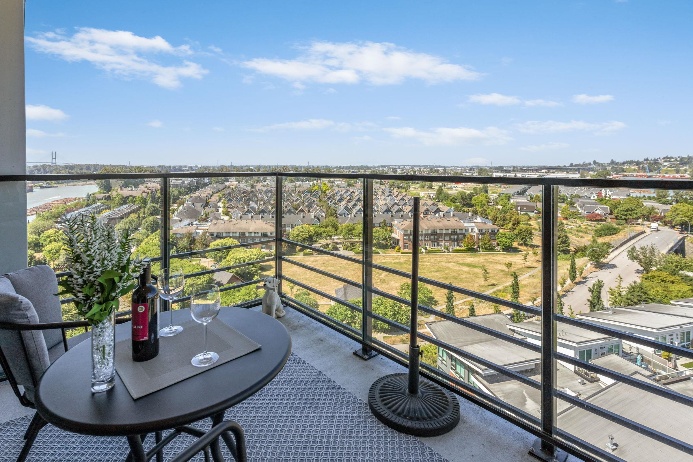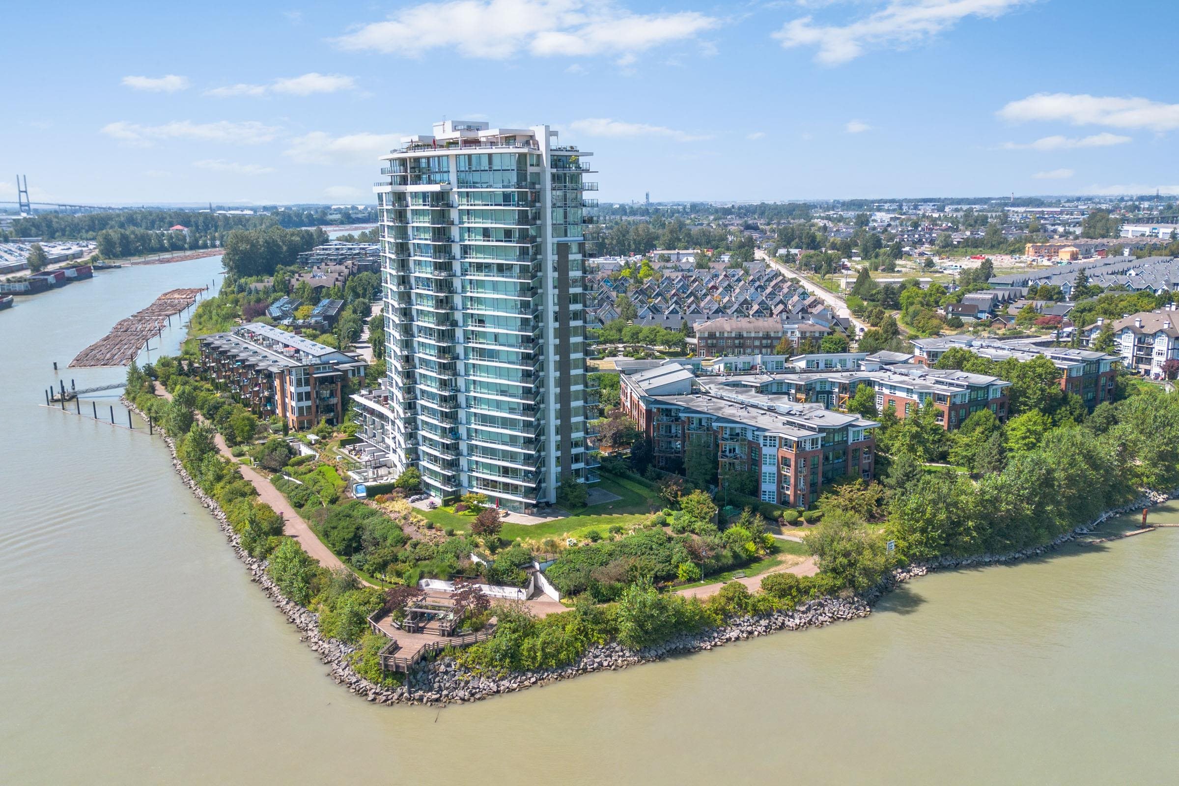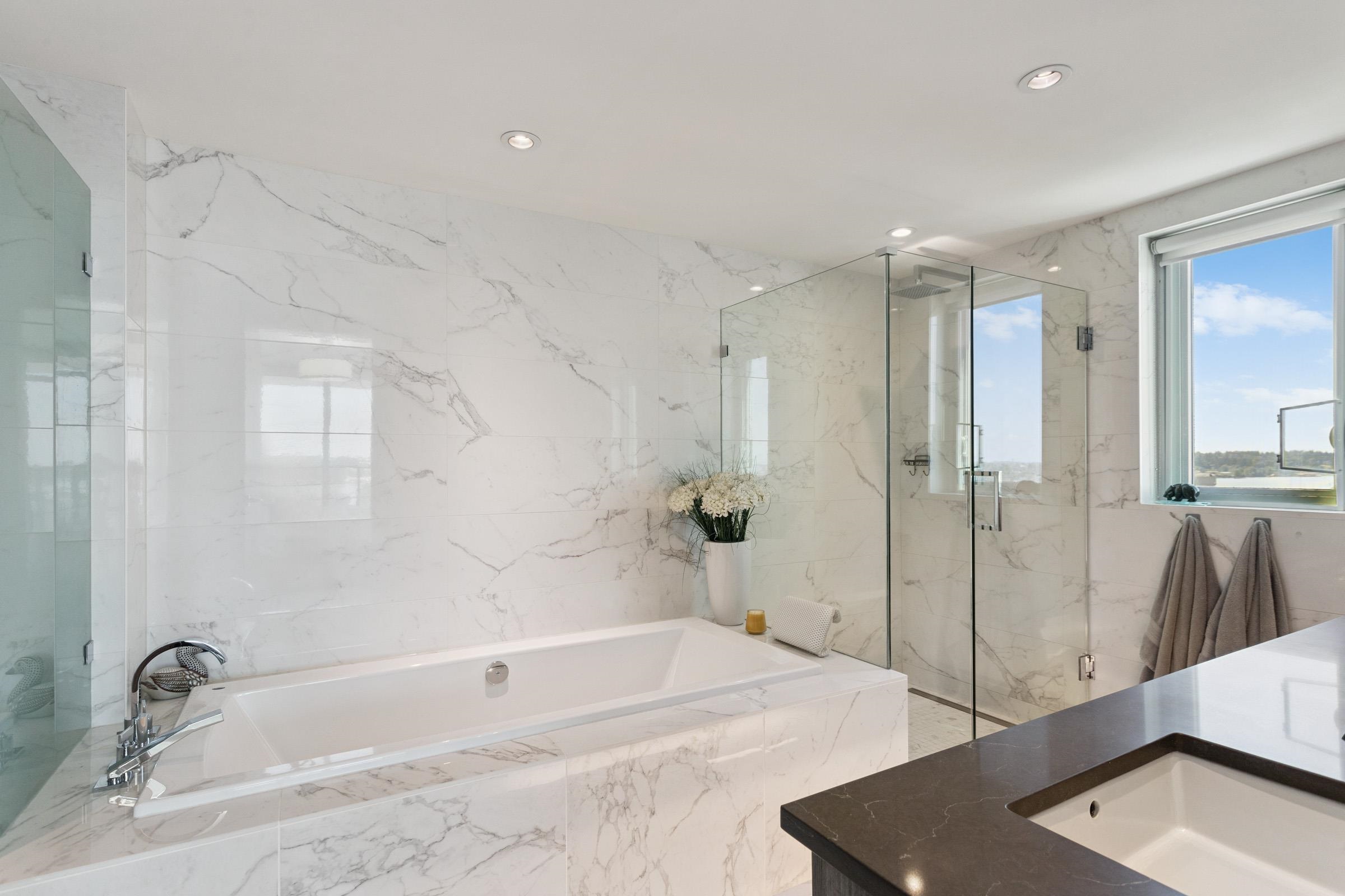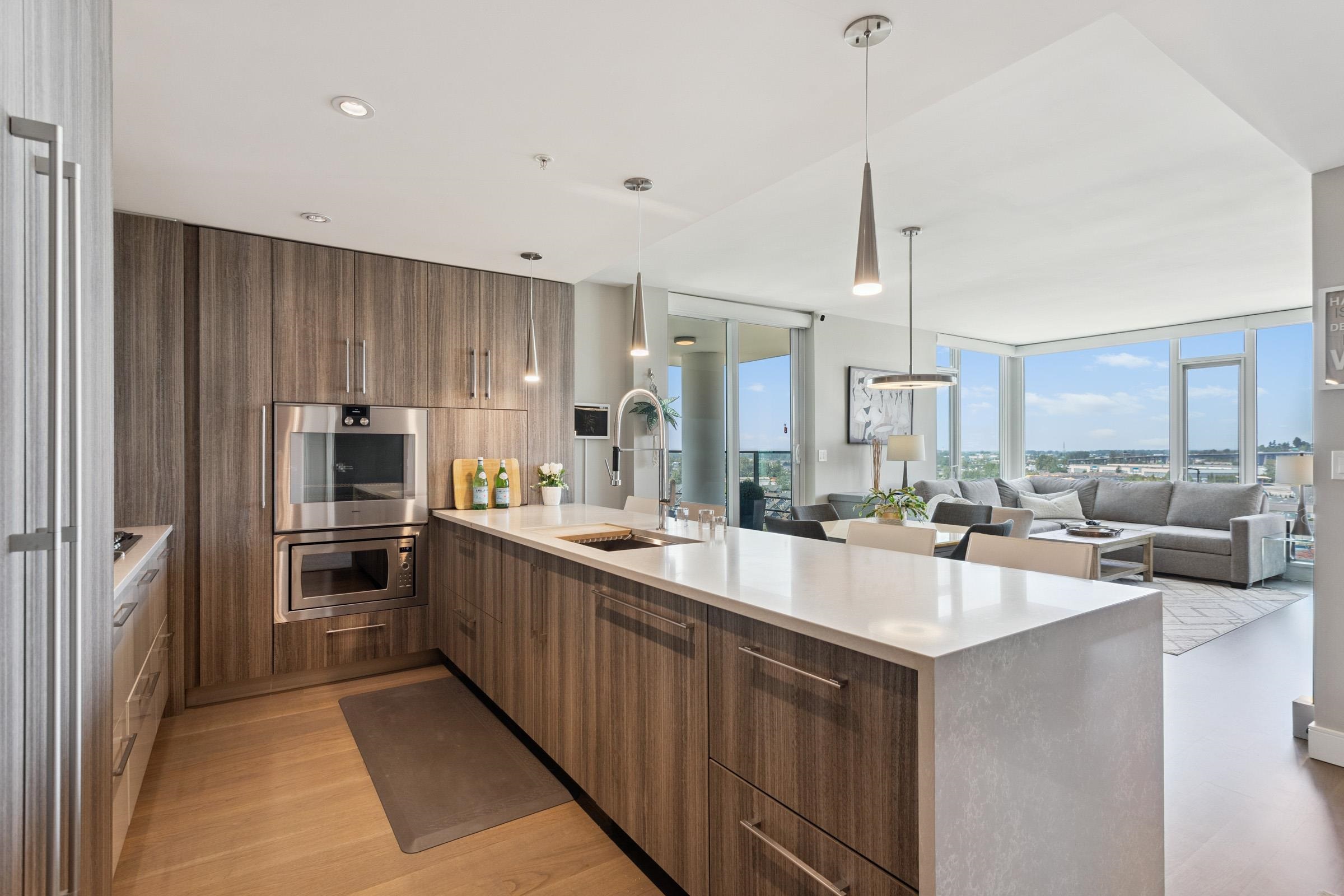 Welcome to THE PENINSULA, New West's crown jewel of Port Royal, the pinnacle of timeless modernity. Redefining luxury with high-end finishes, appliances and resort amenities (jacuzzi, guest suite, steam/amenity/billiard/cinema rooms + more), this METICULOUSLY maintained corner/end-unit features over 1200 sq ft of panoramic views of the river, mountains + city, TWO large bedrooms each w/ ensuite, + extra powder room and TWO private balconies. Open floor plan to entertain from your chef's kitchen with gas sto...