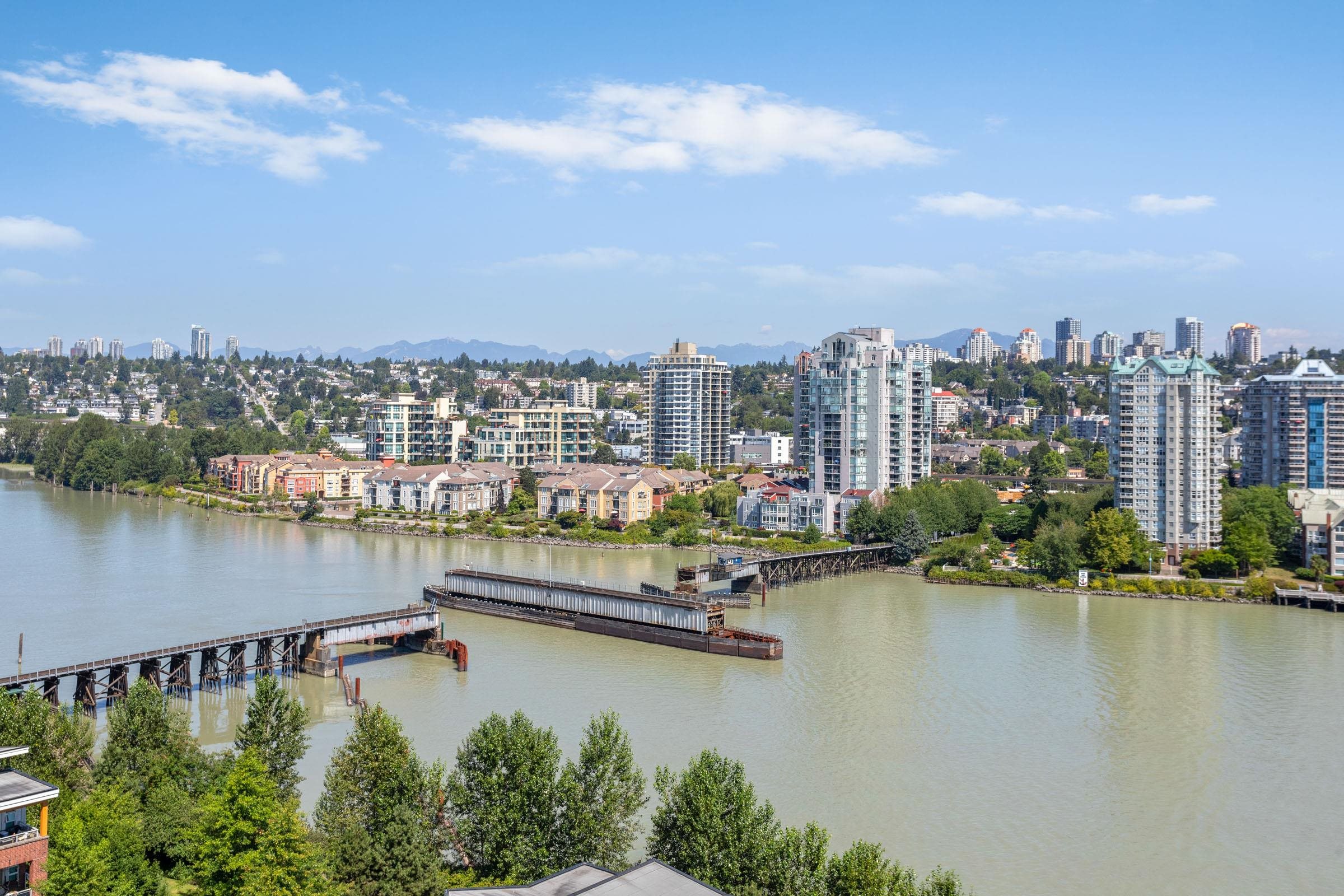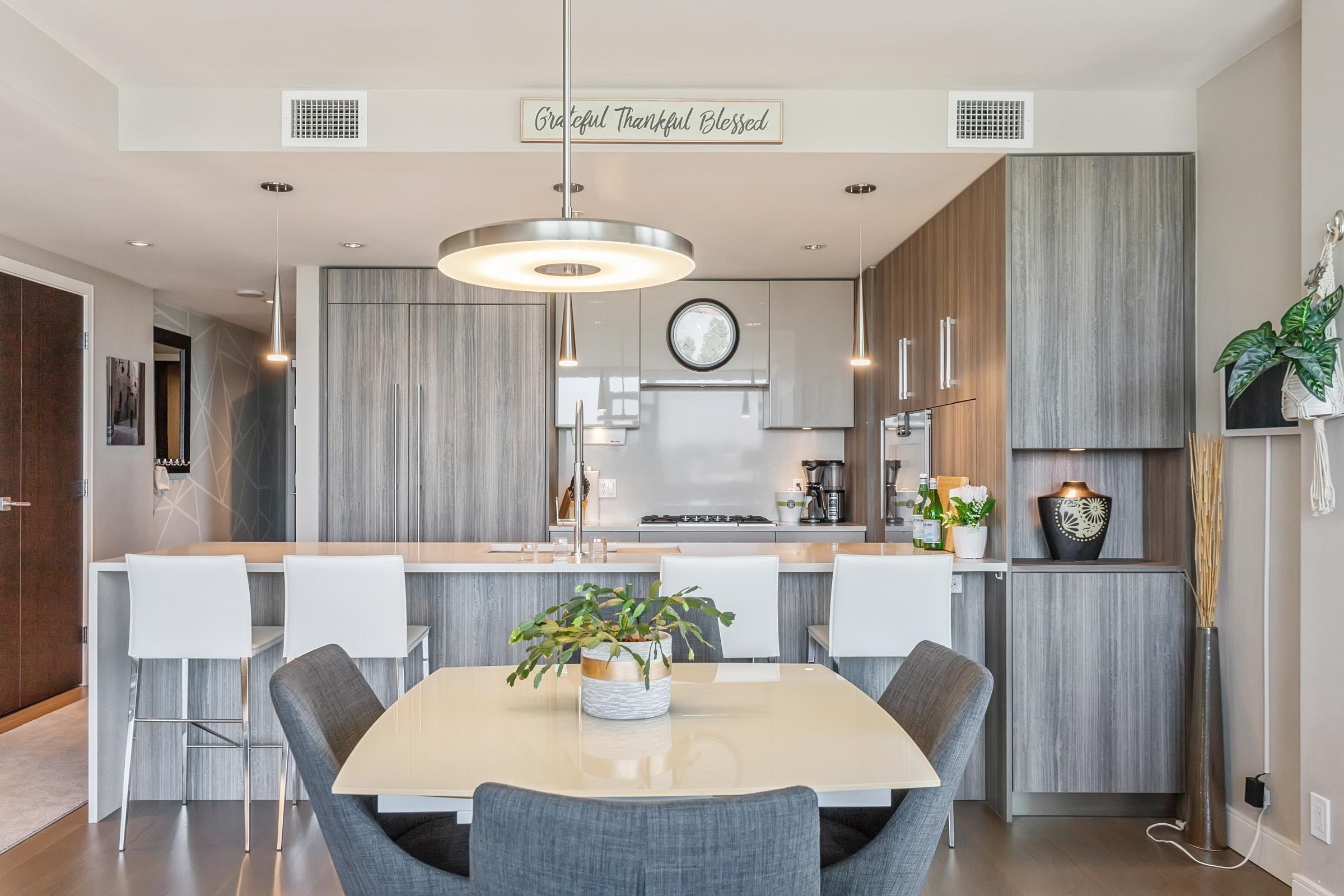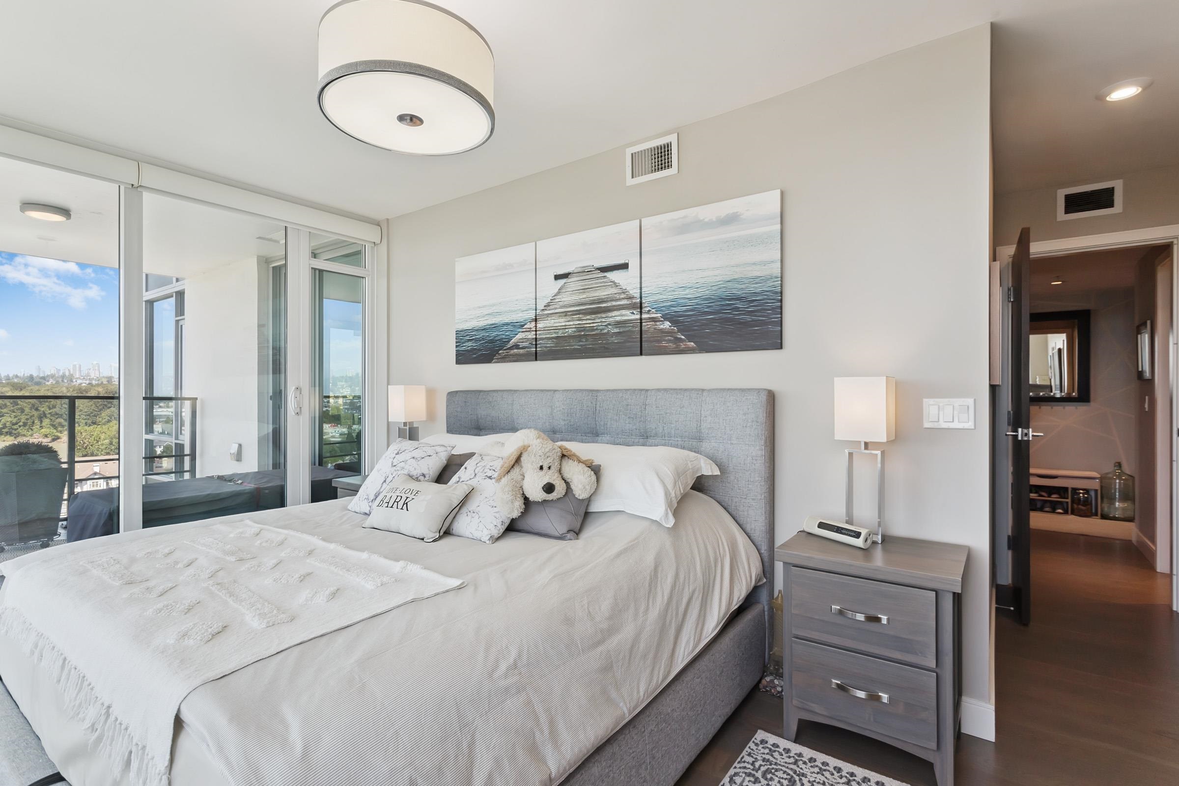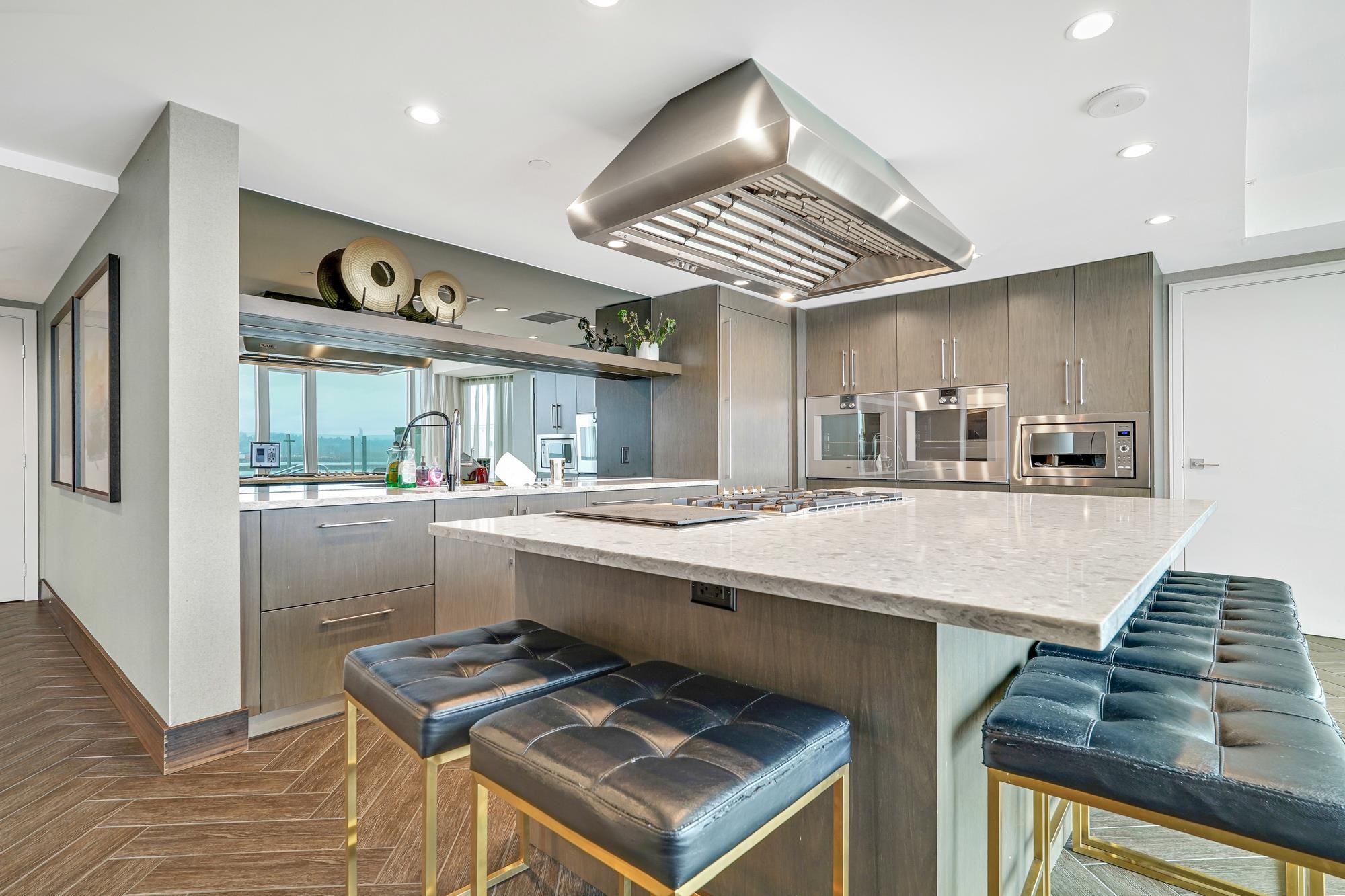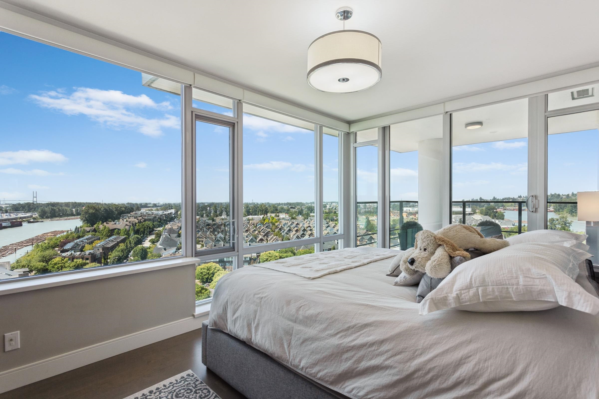Welcome to THE PENINSULA, New West's crown jewel of Port Royal, the pinnacle of timeless modernity. Redefining luxury with high-end finishes, appliances and resort amenities (jacuzzi, guest suite, steam/amenity/billiard/cinema rooms + more), this METICULOUSLY maintained corner/end-unit features over 1200 sq ft of panoramic views of the river, mountains + city, TWO large bedrooms each w/ ensuite, + extra powder room and TWO private balconies. Open floor plan to entertain from your chef's kitchen with gas sto...