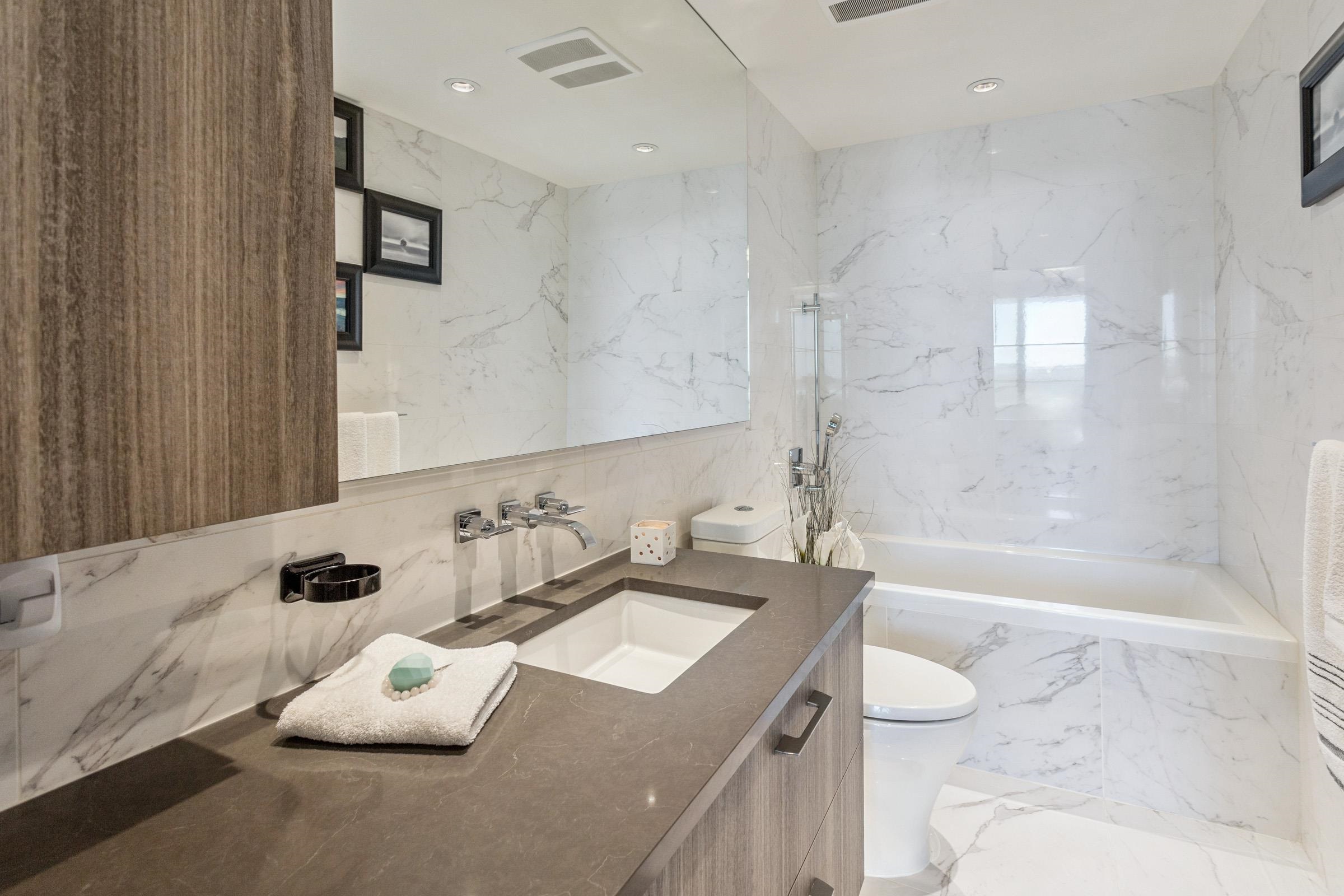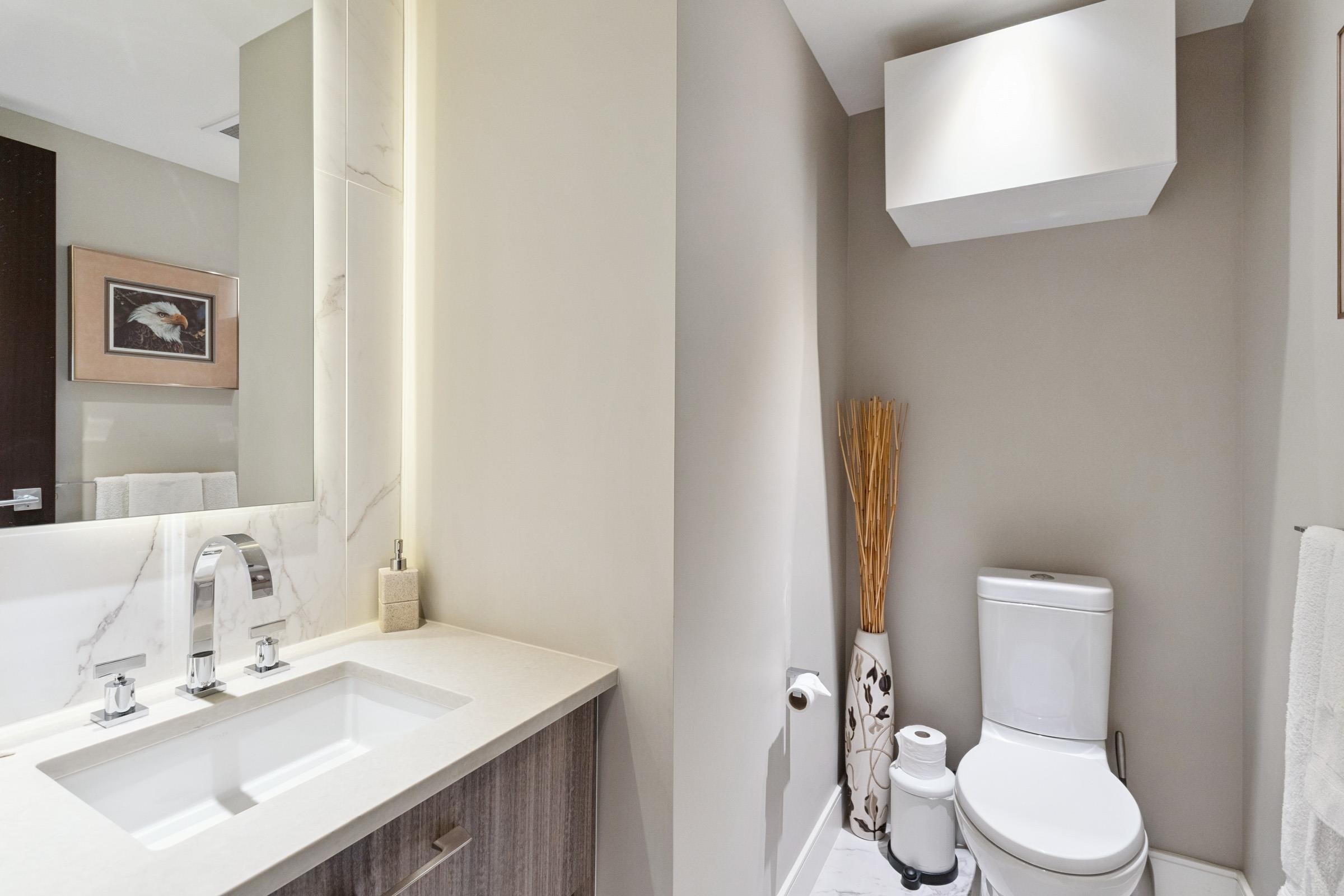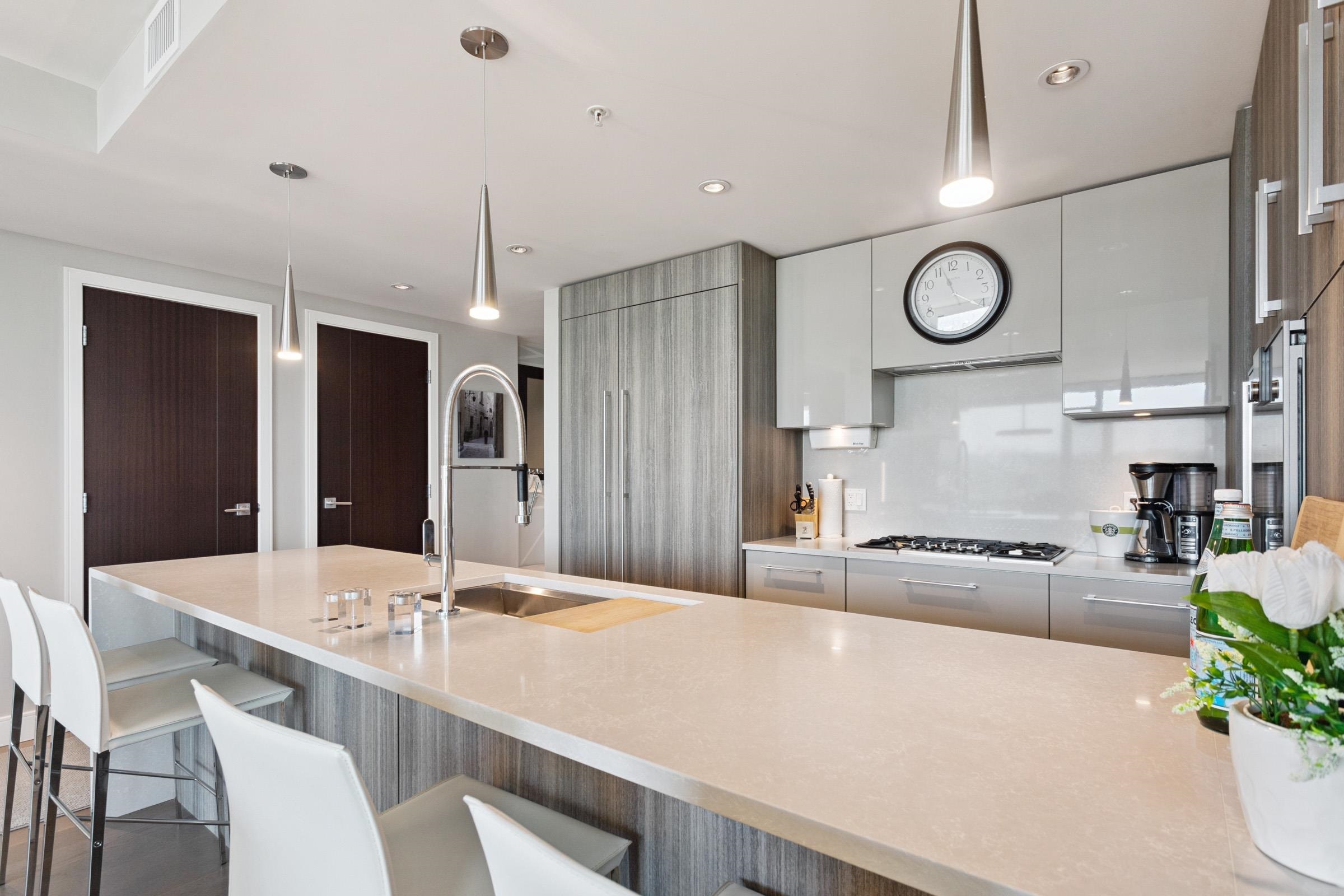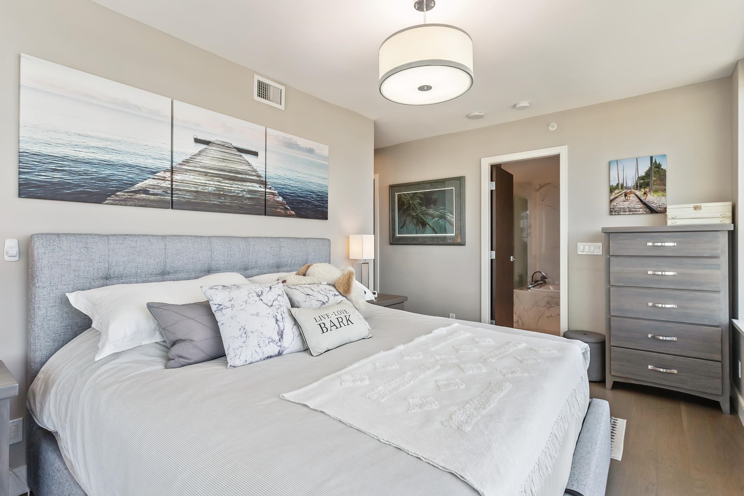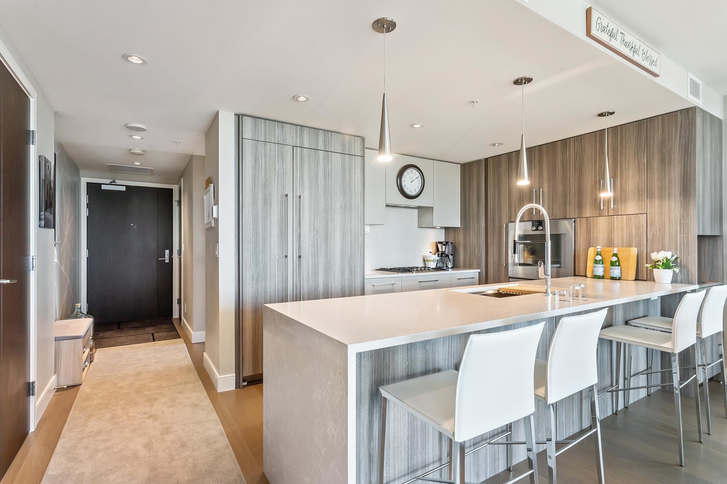 Welcome to THE PENINSULA, New West's crown jewel of Port Royal, the pinnacle of timeless modernity. Redefining luxury with high-end finishes, appliances and resort amenities (jacuzzi, guest suite, steam/amenity/billiard/cinema rooms + more), this METICULOUSLY maintained corner/end-unit features over 1200 sq ft of panoramic views of the river, mountains + city, TWO large bedrooms each w/ ensuite, + extra powder room and TWO private balconies. Open floor plan to entertain from your chef's kitchen with gas sto...