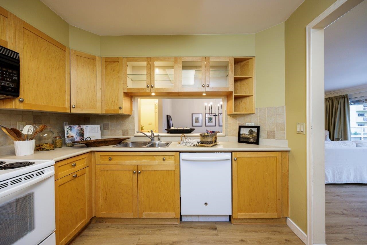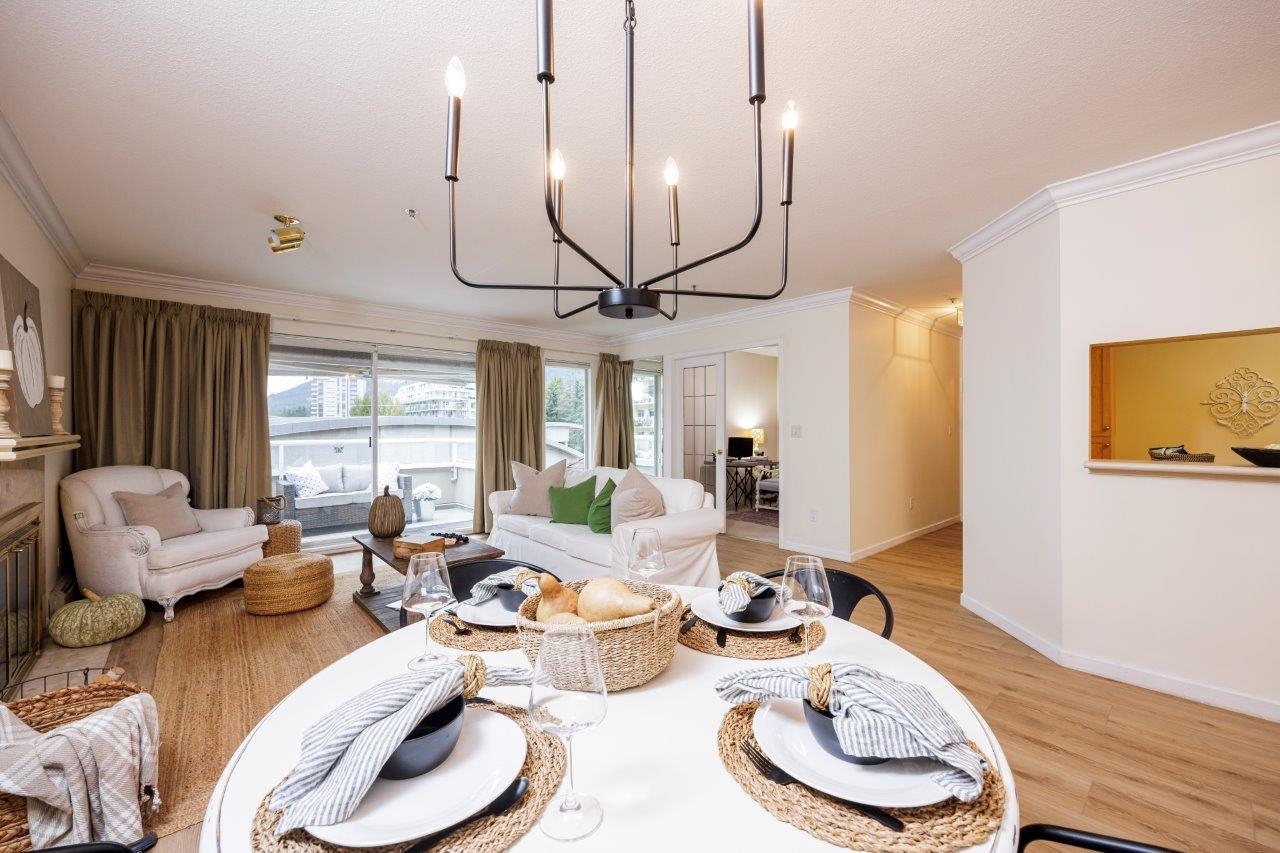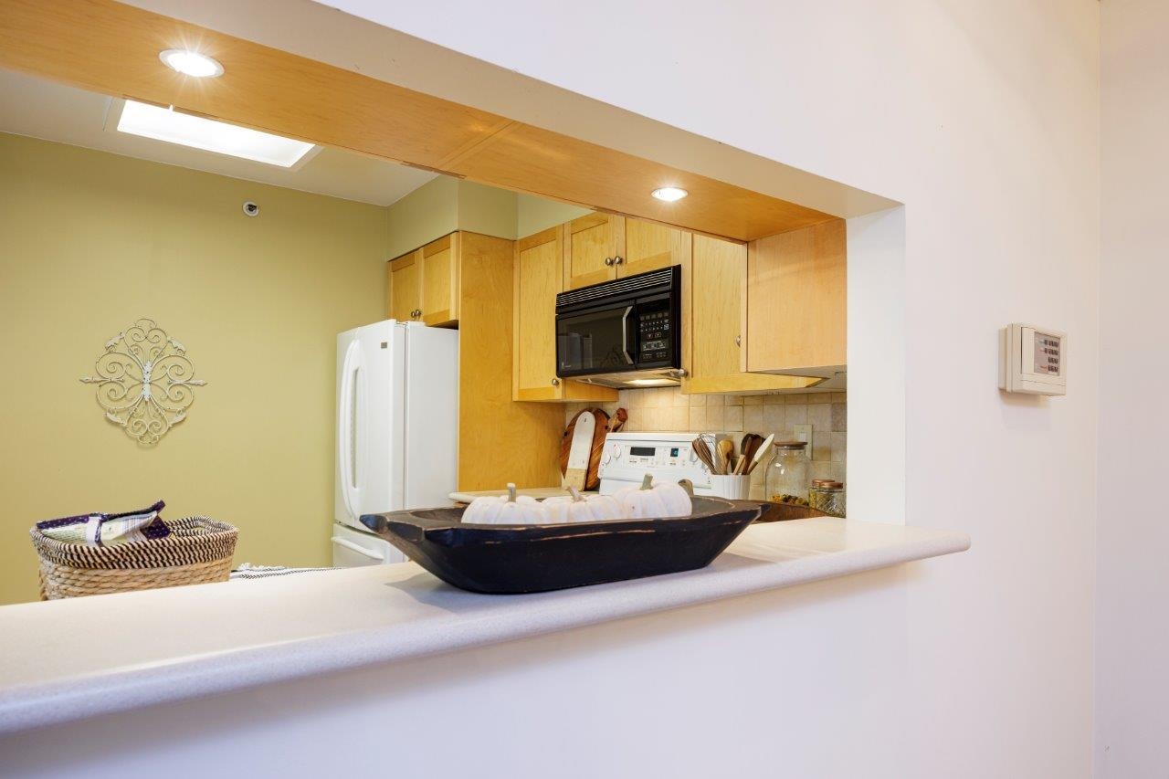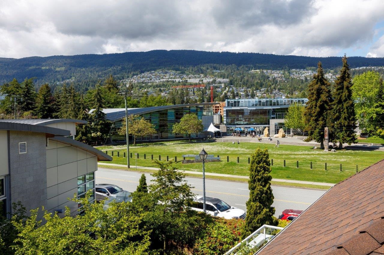 THIS 55+ COMPLEX IS FOR YOU Top floor penthouse unit west facing to peek a boo ocean views and stunning mountain vistas. Freshly painted and new vinyl flooring enhance its spacious sunny rooms, One bedroom and 2nd space could be either a bedroom (complete with murphy bed, window and closet)or den. Comes with 2 parking stalls and huge storage room. Fantastic location across from WV Seniors centre near library & shopping