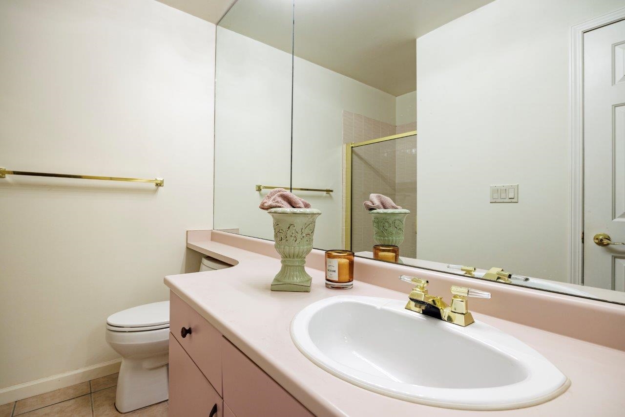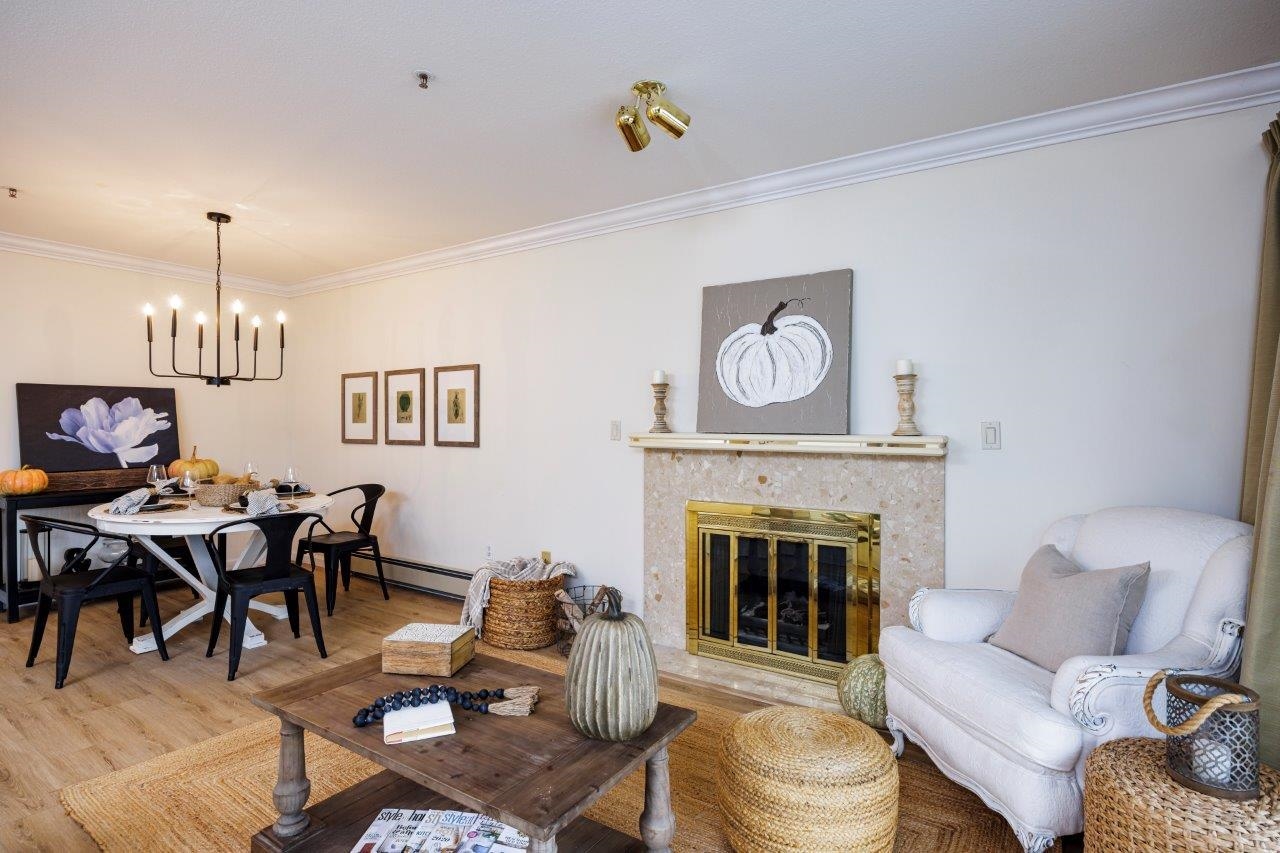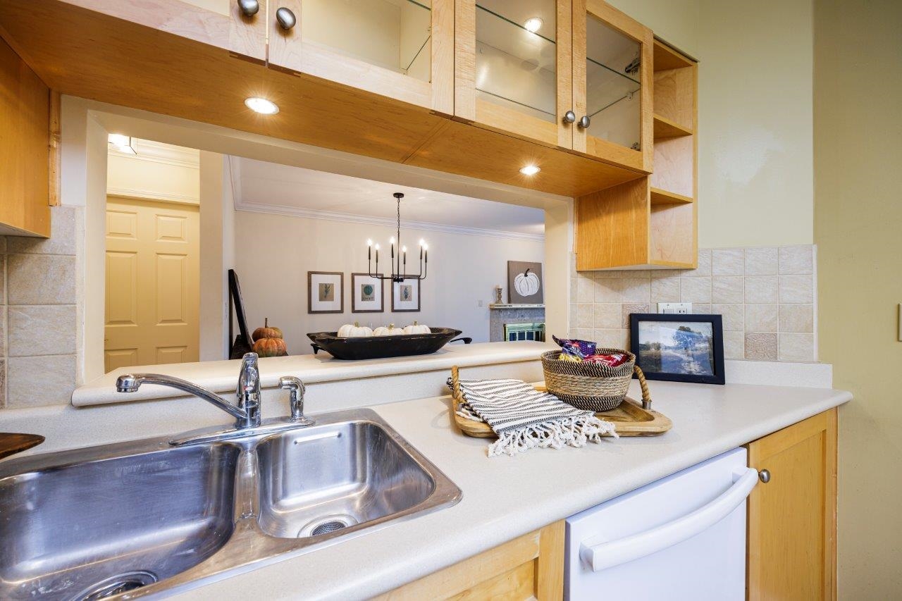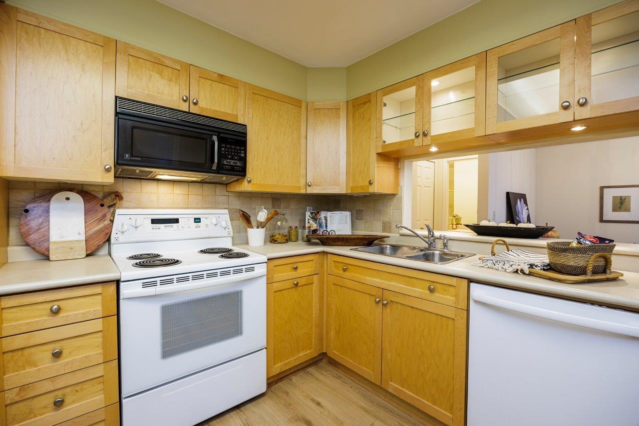 THIS 55+ COMPLEX IS FOR YOU Top floor penthouse unit west facing to peek a boo ocean views and stunning mountain vistas. Freshly painted and new vinyl flooring enhance its spacious sunny rooms, One bedroom and 2nd space could be either a bedroom (complete with murphy bed, window and closet)or den. Comes with 2 parking stalls and huge storage room. Fantastic location across from WV Seniors centre near library & shopping