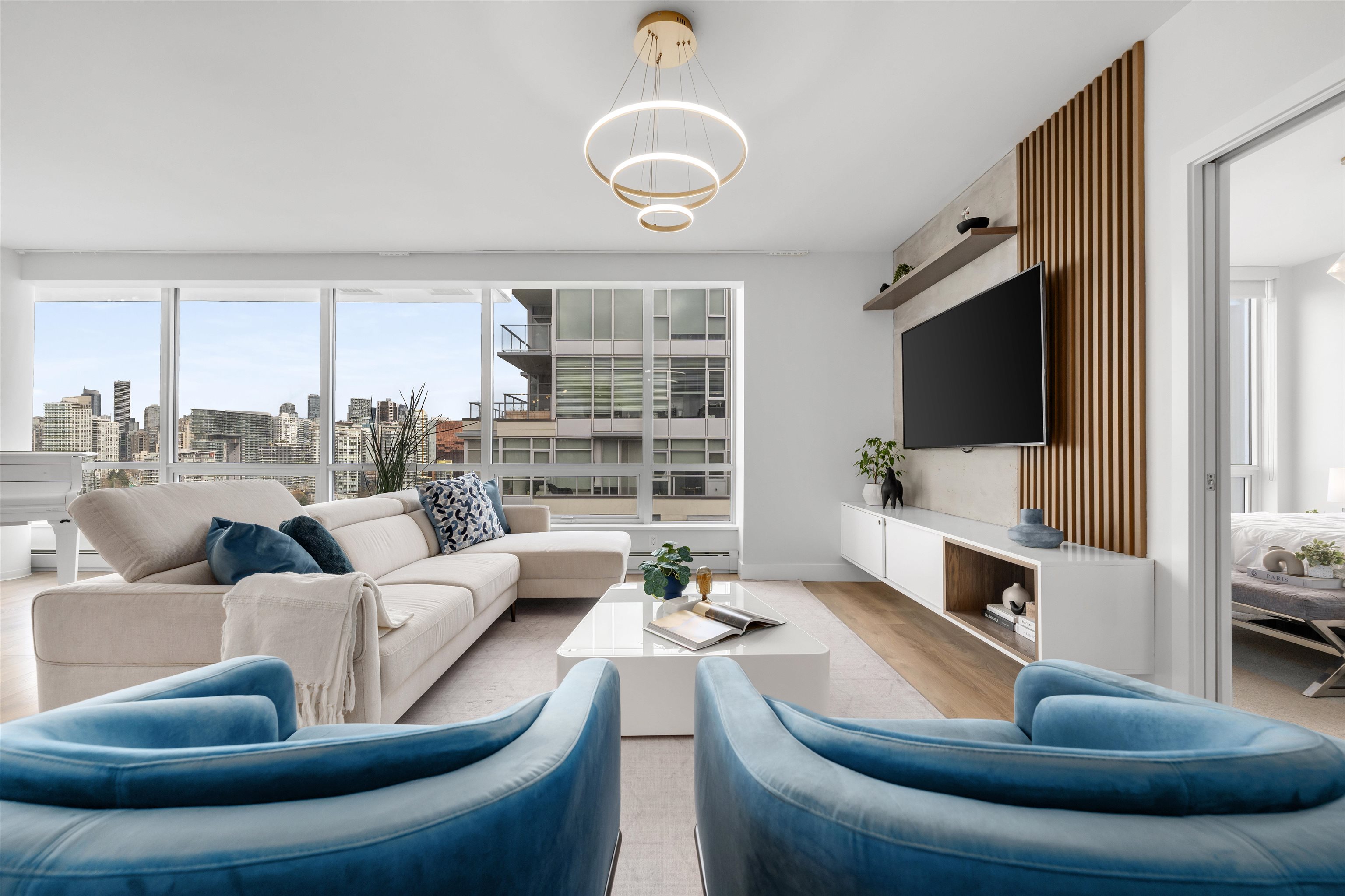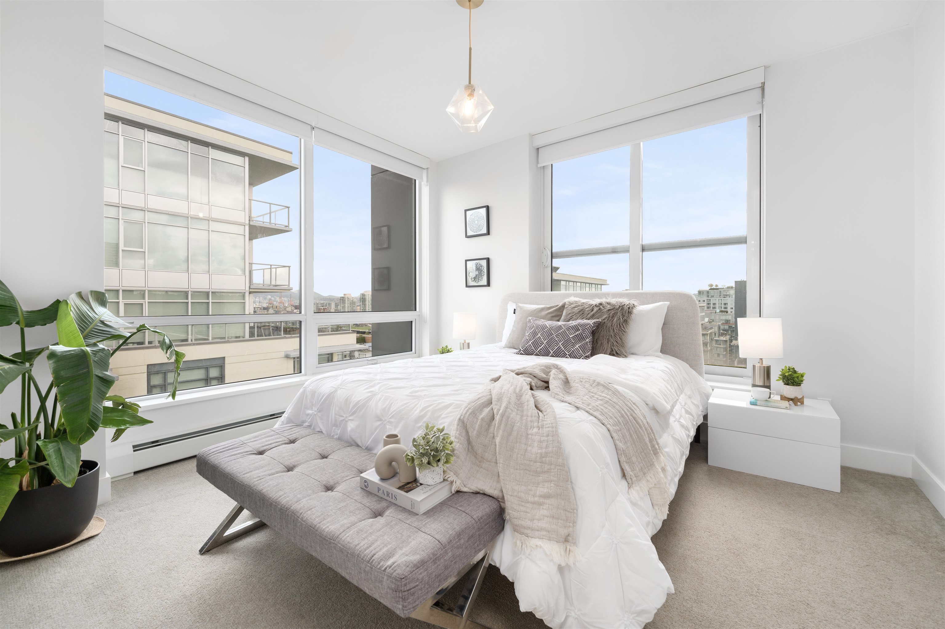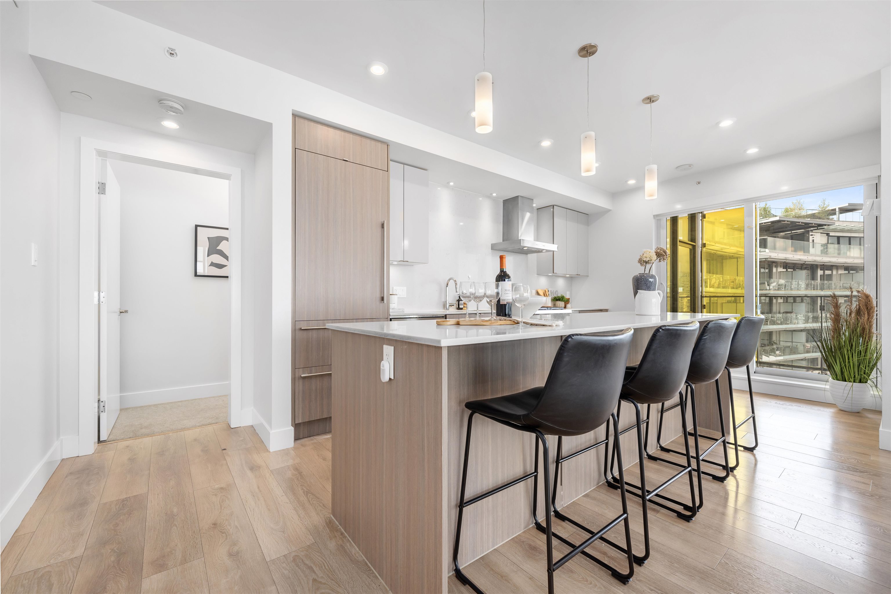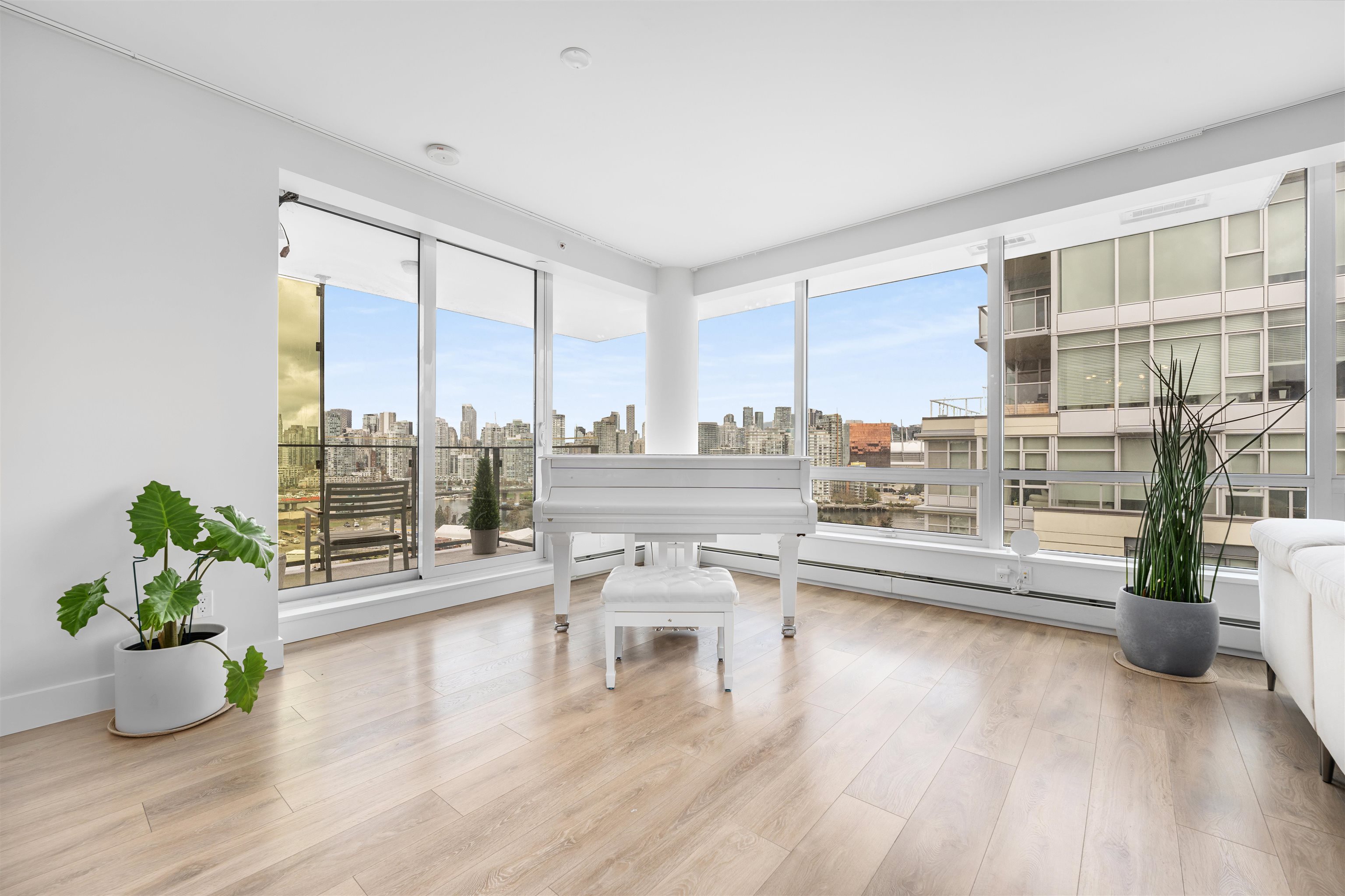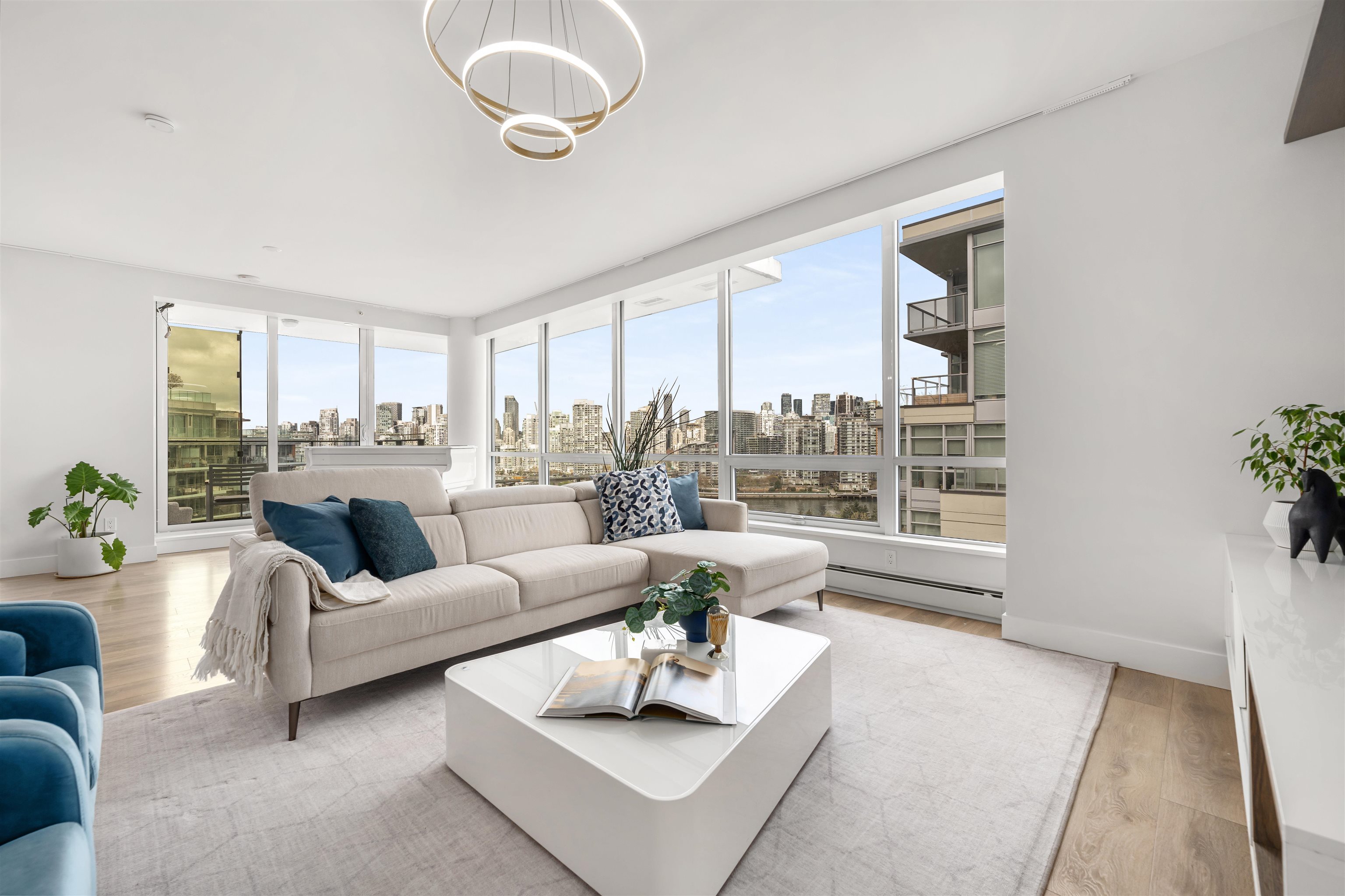 Enjoy waterfront living in this 3 Bedroom + Den, 3 Bathroom penthouse at Epic at West in Olympic Village. Bright & spacious with large windows providing views of the downtown city skyline, tranquil False Creek waterfront & the North Shore mountains. Featuring 8’8” ceilings, A/C, 9' kitchen island, Quartz composite counters & backsplash, wide plank laminate floors, porcelain tiles & remote blinds in the living room. Contemporary luxury including an integrated sub-zero fridge, Wolf gas range, Blomberg dishwas...