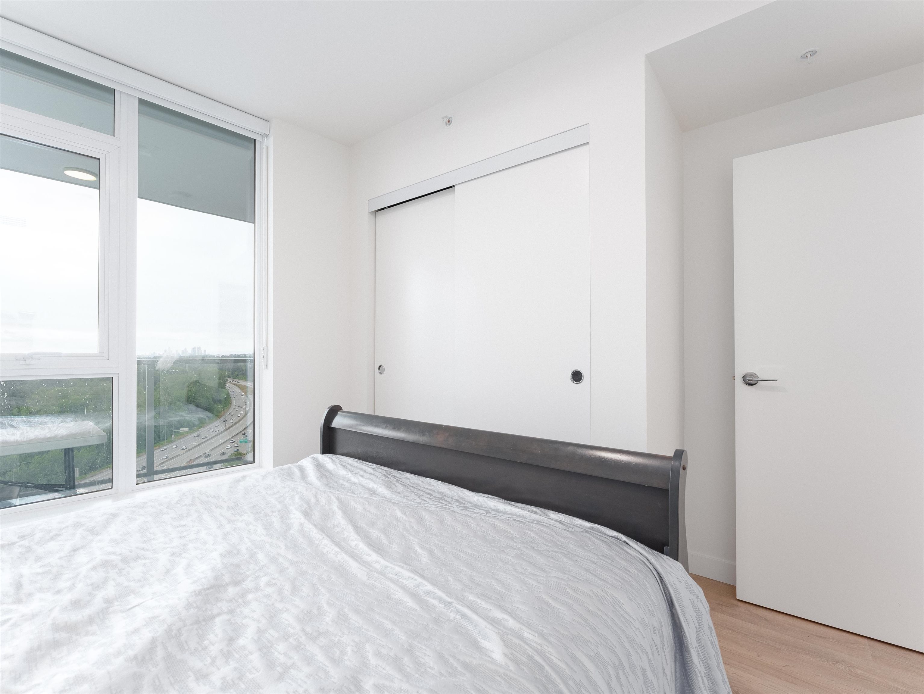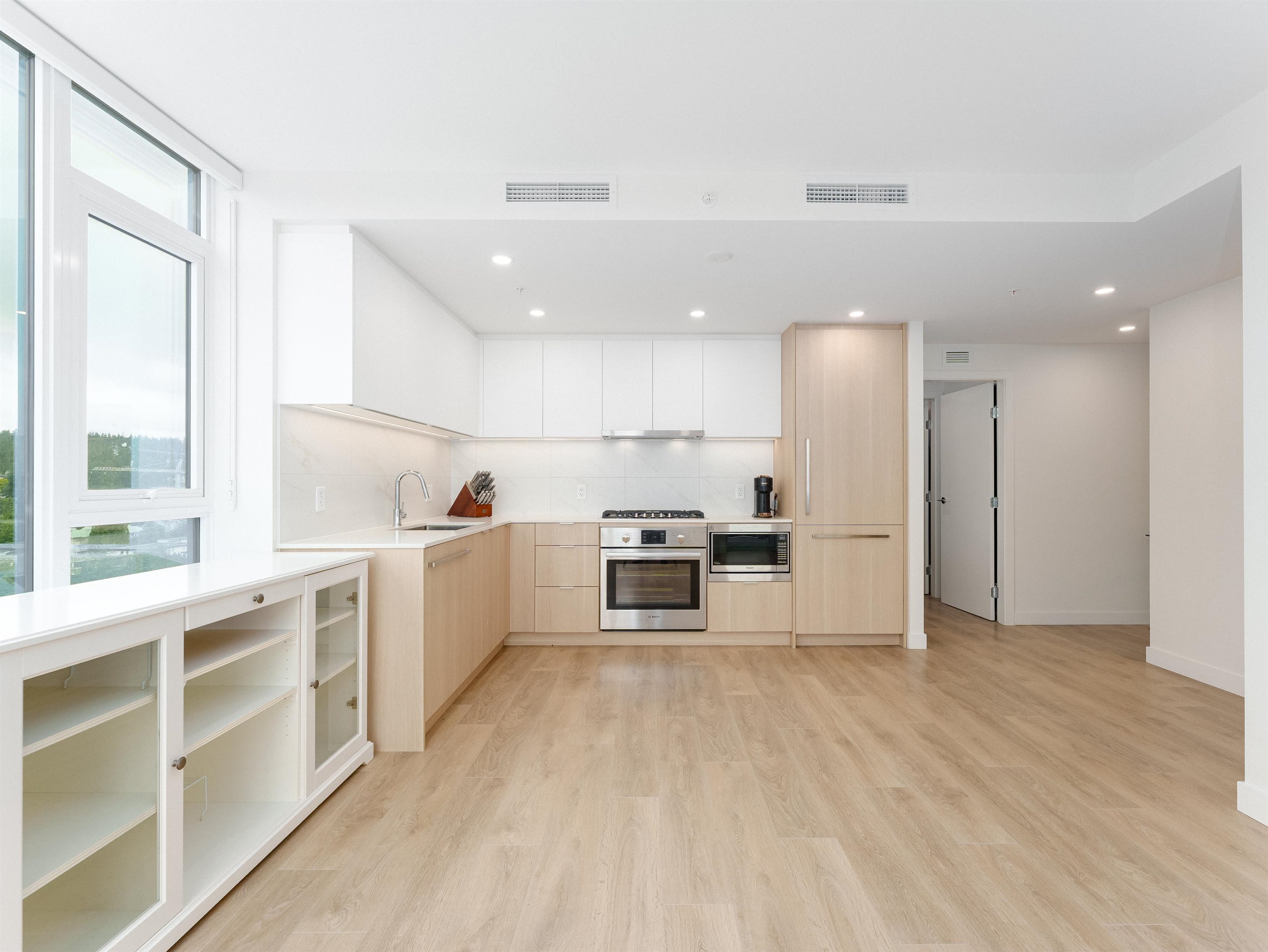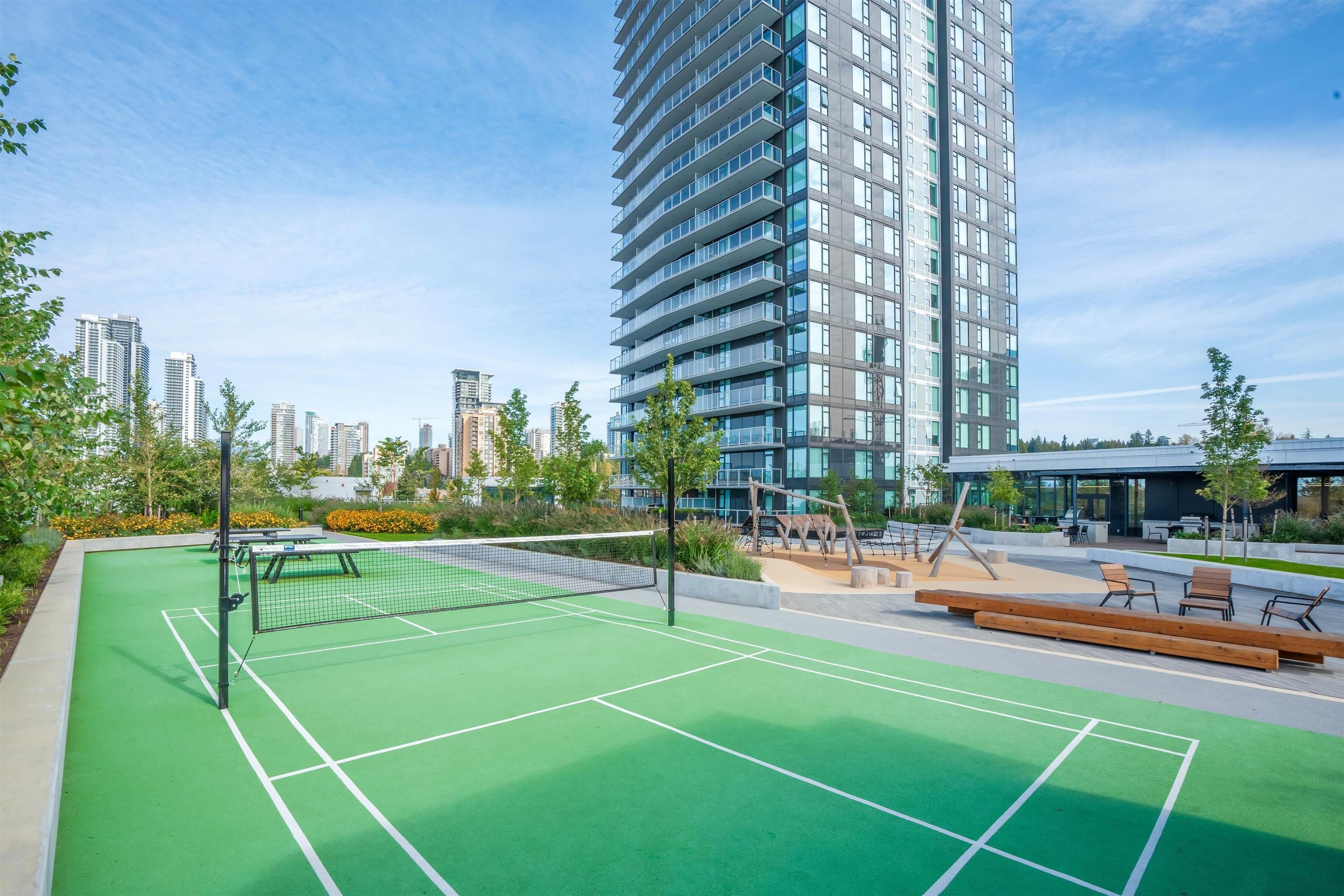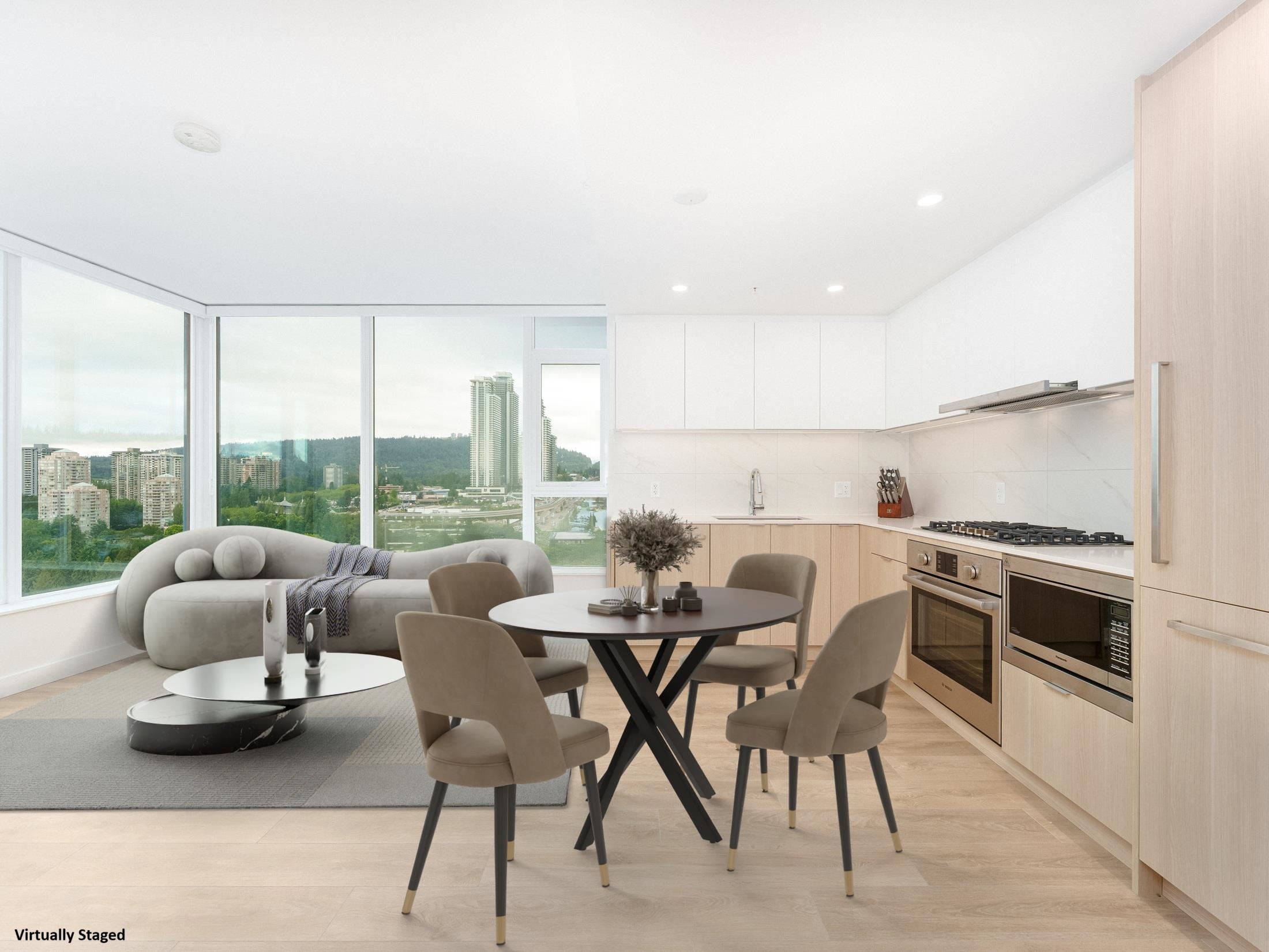 SOCO North Tower. Sweeping PANORAMIC VIEW. 841sf 2 bed 2 full bath. Bright Corner unit with open lay out. Heat pump/ AC, spacious rooms, hardwood laminate flooring, built in Bosch appliances, gas stove. One parking and one locker. Complex has 43,000sf of indoor and outdoor amenities including: entertainment sized lounge, basketball court, outdoor playground, table tennis area, study area, bbq area, guest suite, and fitness room. Minutes of walking distance from vast array of shops, restaurants and services...