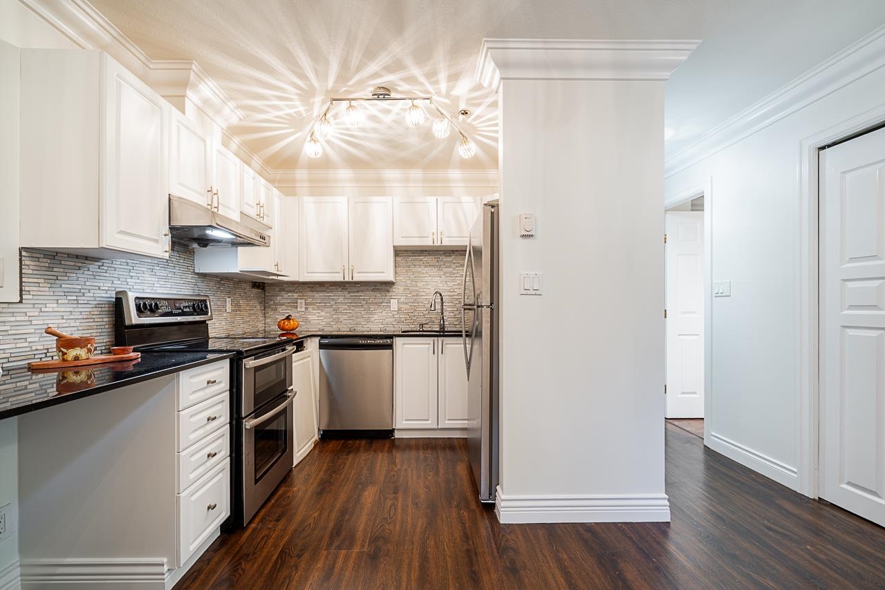 Experience refined townhome living in this impeccably cared-for 3-bed, 2-bath residence overlooking a serene greenbelt. Enjoy two outdoor balconies, a charming gas fireplace, fresh interior paint, and a beautifully finished kitchen with black granite countertops. Ideally located just a short walk to the shopping centre and the West Coast Express, this home pairs elegant living with exceptional convenience. Two parking stalls included (one covered). Open House, Saturday December 13th, 2-4.