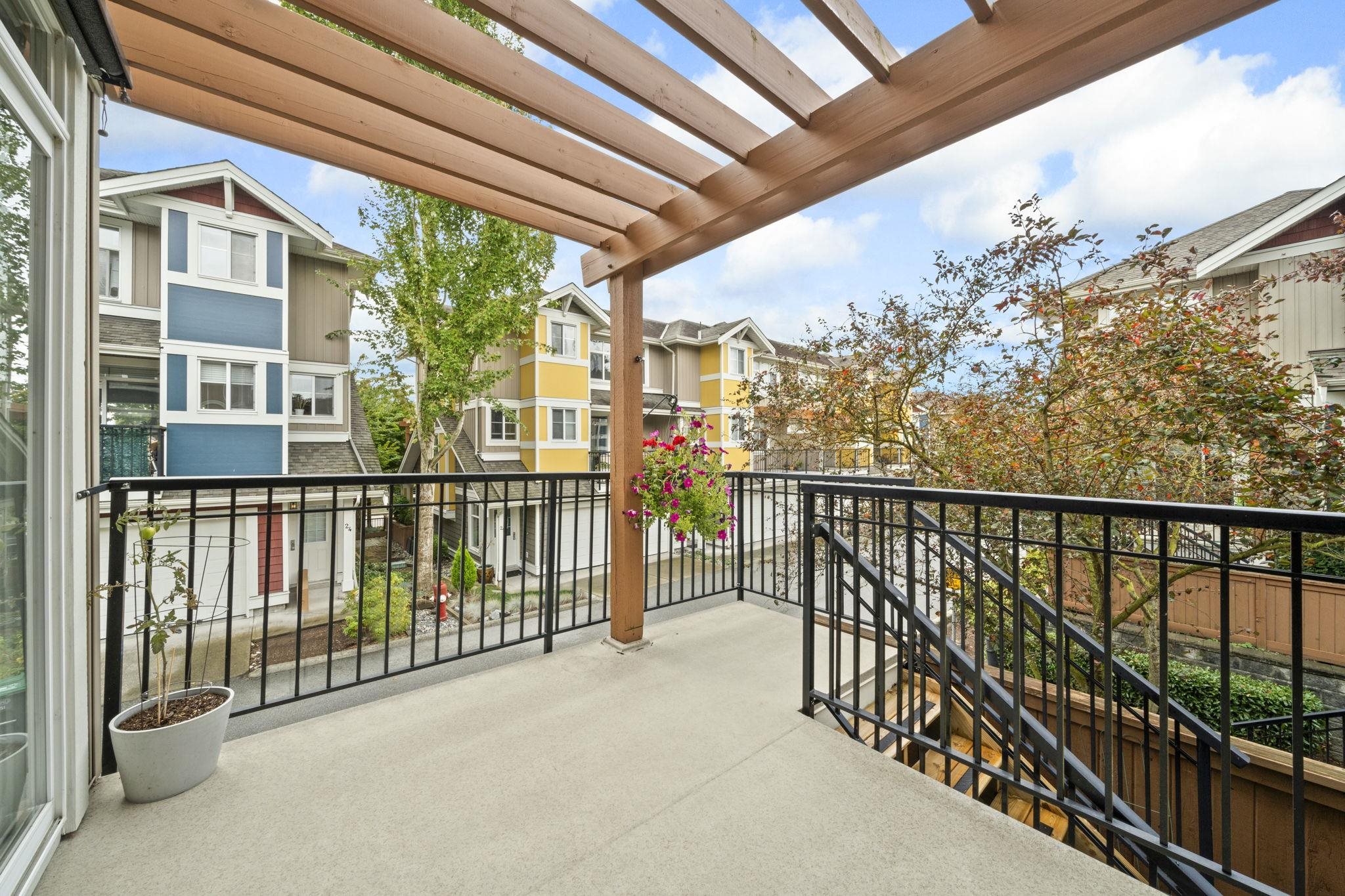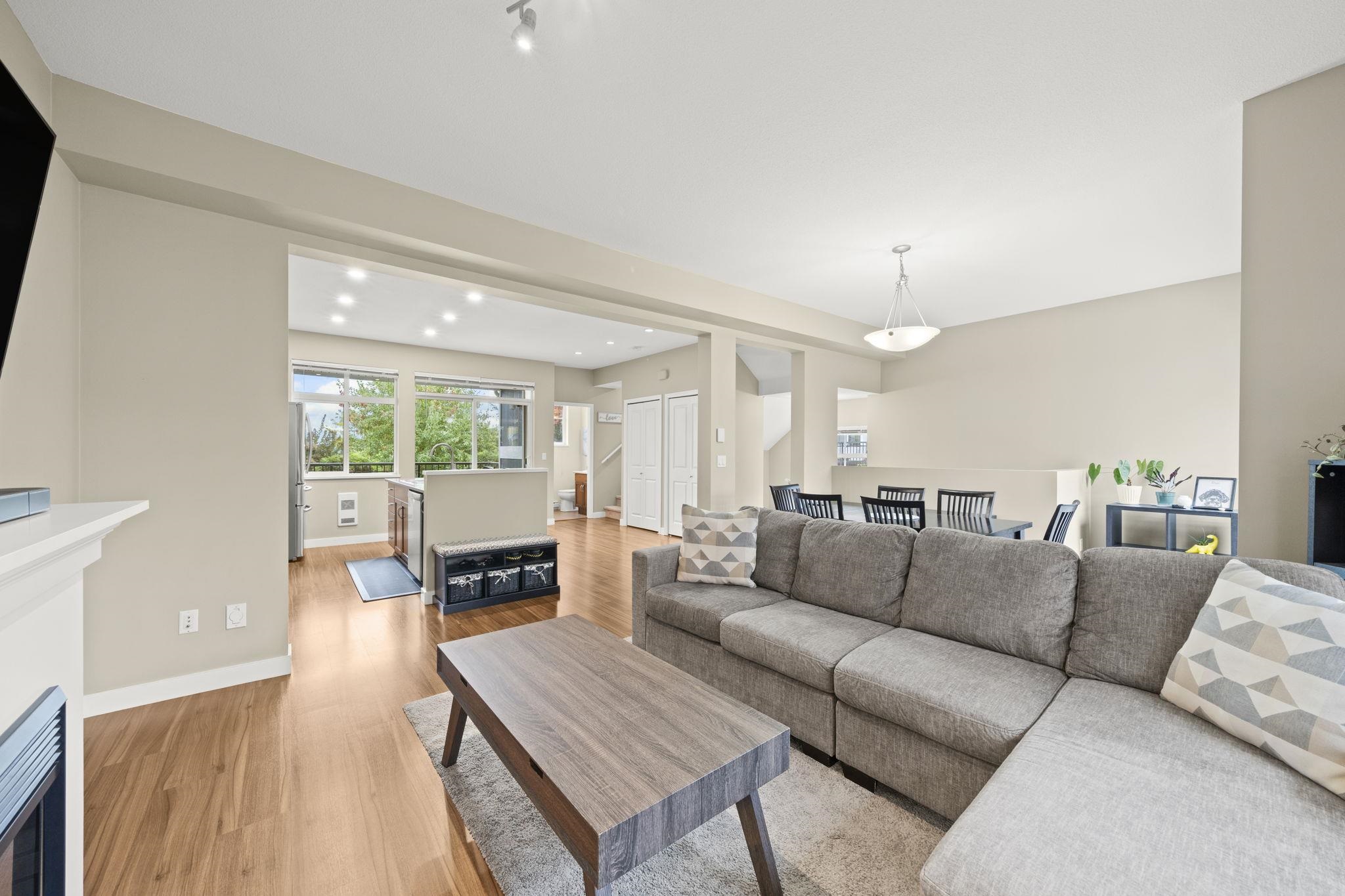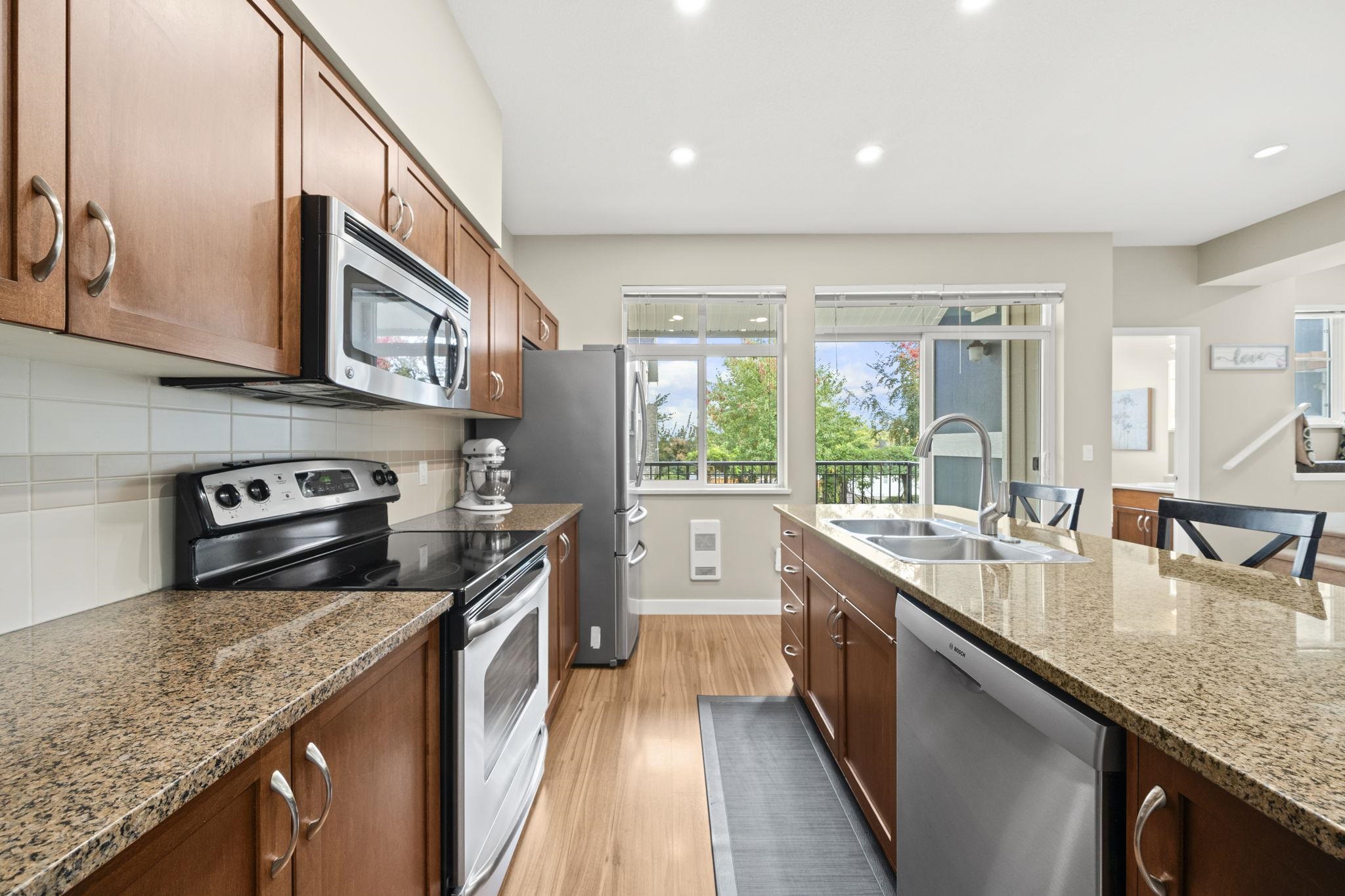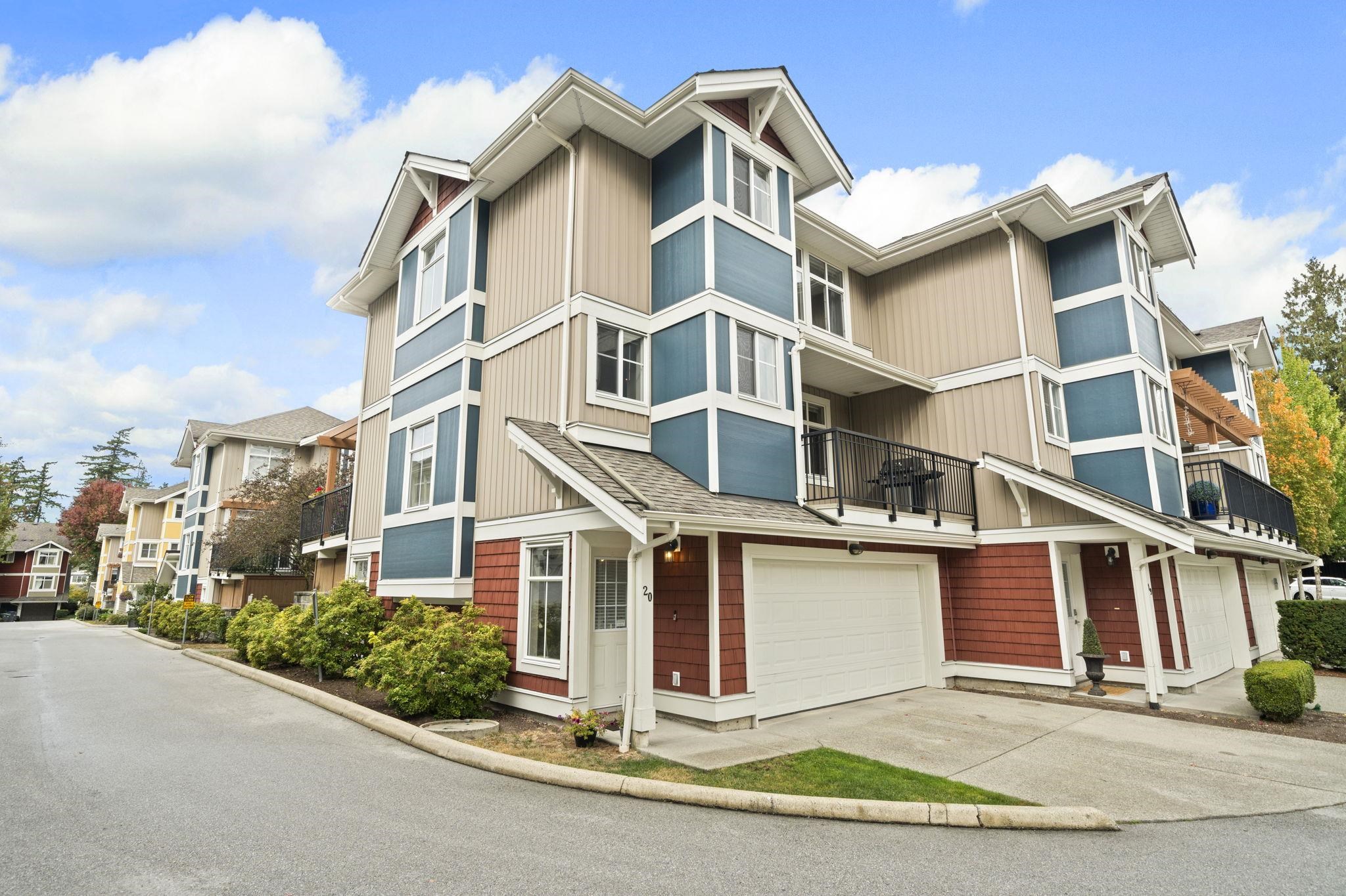 "Arbour Village". Must see this Beautiful 3 bed + Rec room End Unit Townhome boasting approx 1800 sq ft of open concept living space that has been meticulously maintained to the highest standard. This is the layout and location you've been waiting for; not only because it's an end unit/corner unit with additional windows, front and back balconies, a maintenance free backyard and parking for 4 cars (which includes side x side garage) but also a rec room on the lower level and an entertainment size main floor...