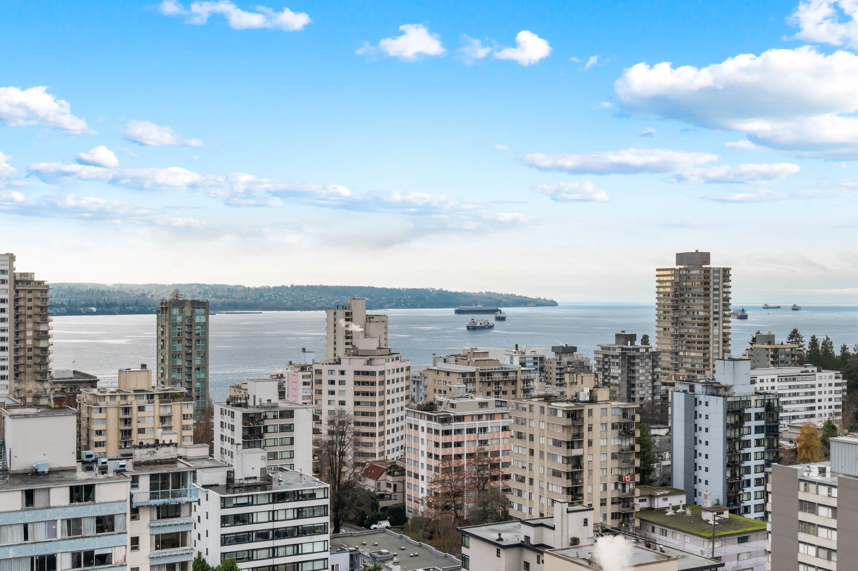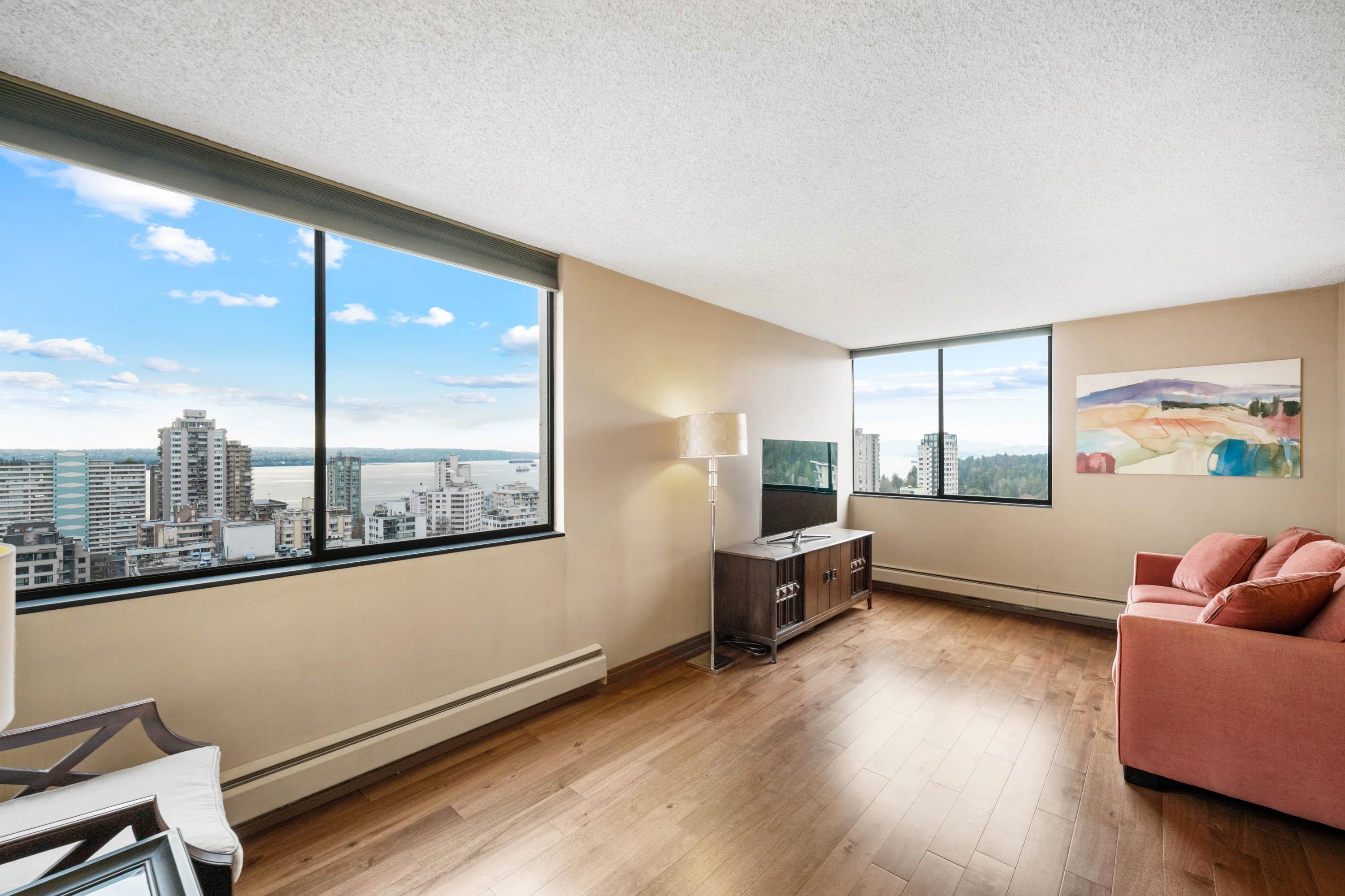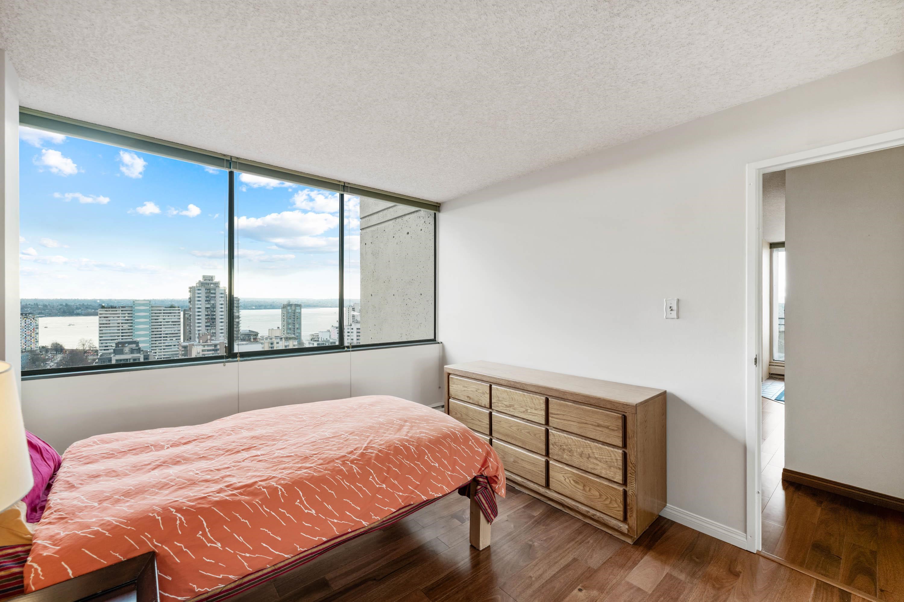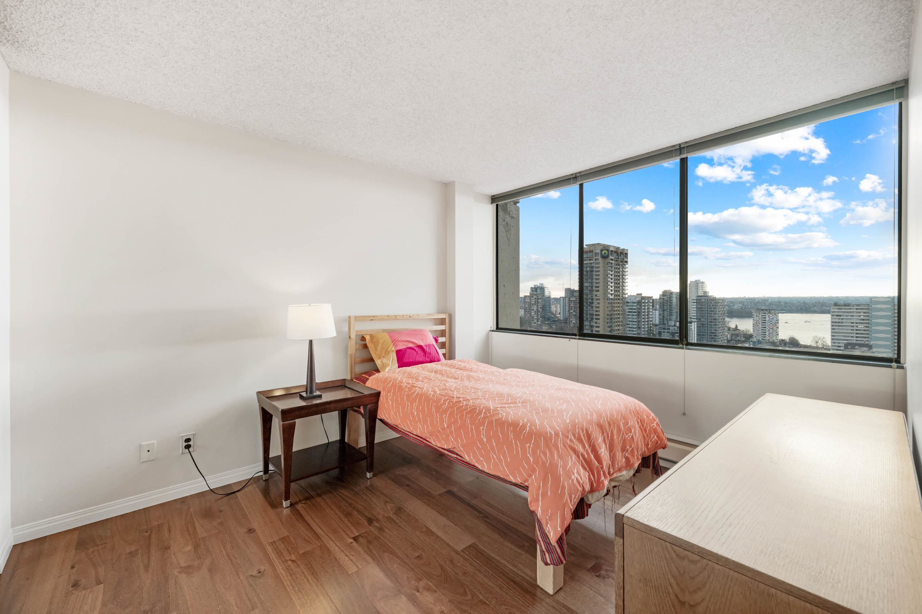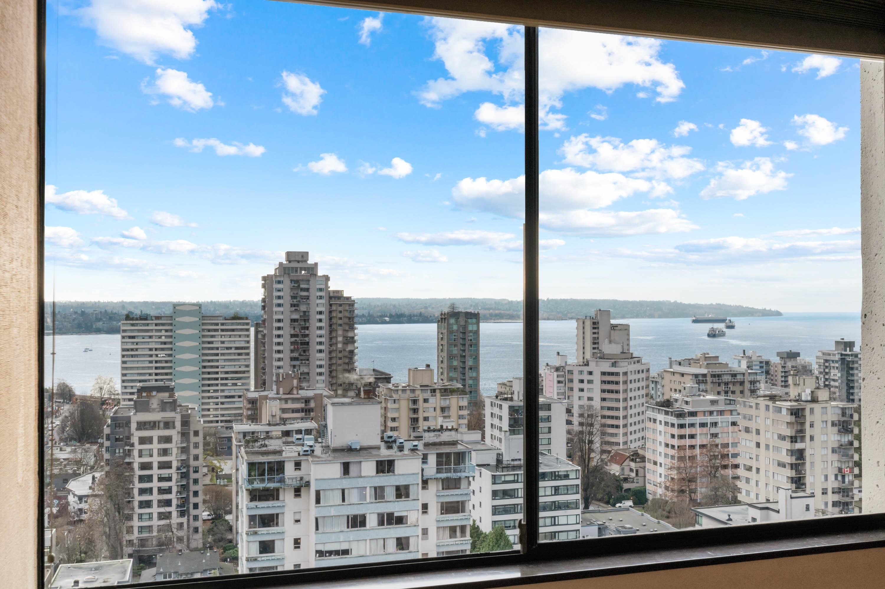 STUNNING ENGLISH BAY, STANLEY PARK & MOUTAIN VIEWS from every window! Coveted rarely available 20th floor, southwest facing corner unit boasts million dollar views and sunsets. Wake up to the sounds of waves washing up on the beach and birds flying through Stanley Park. This 731 sq.ft 1 bedroom and den has been carefully maintained by the owner. Real hardwood floors installed in 2017. The private patio on the quiet side of building opens up from the dining room & kitchen. Huge outdoor swimming pool with a p...