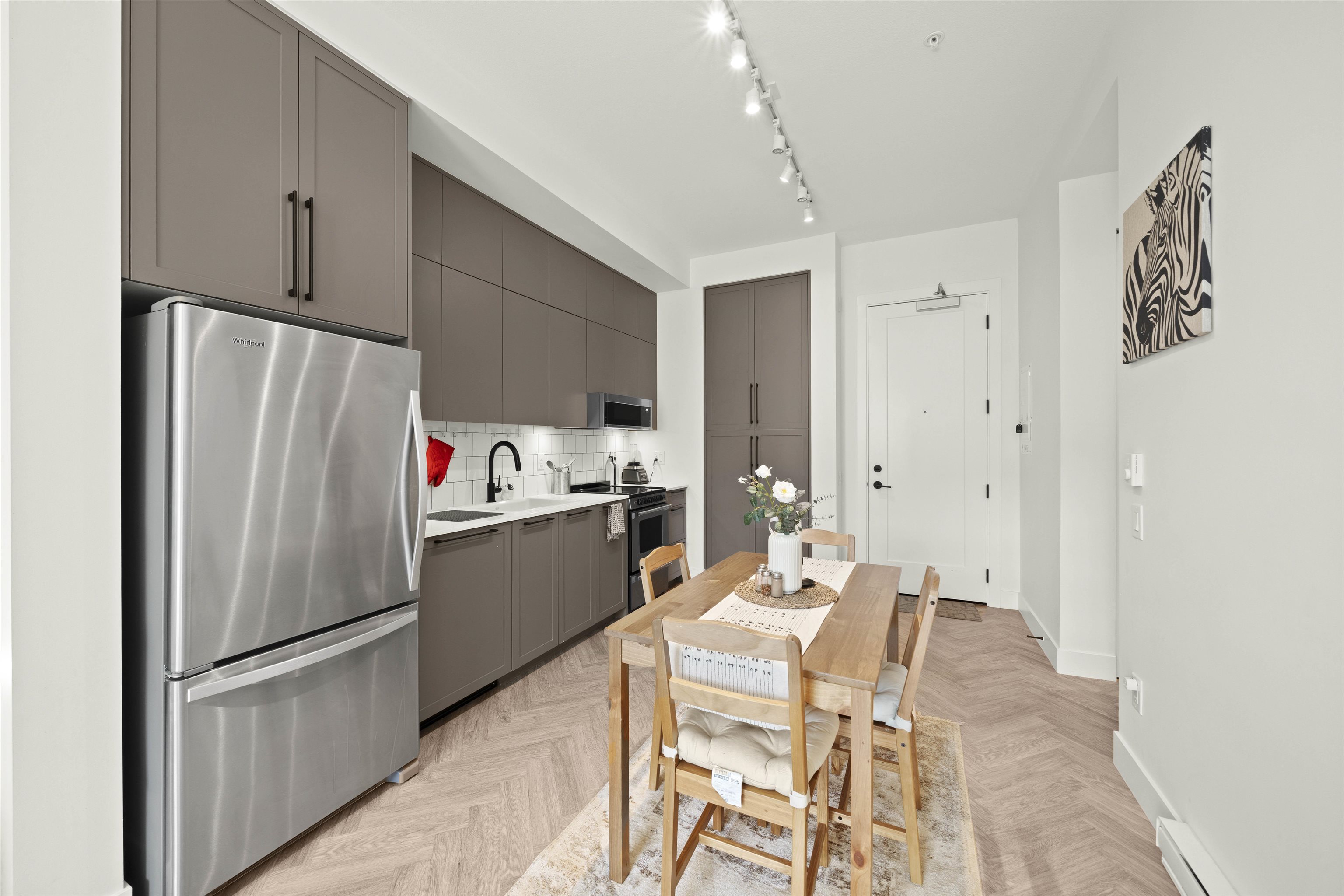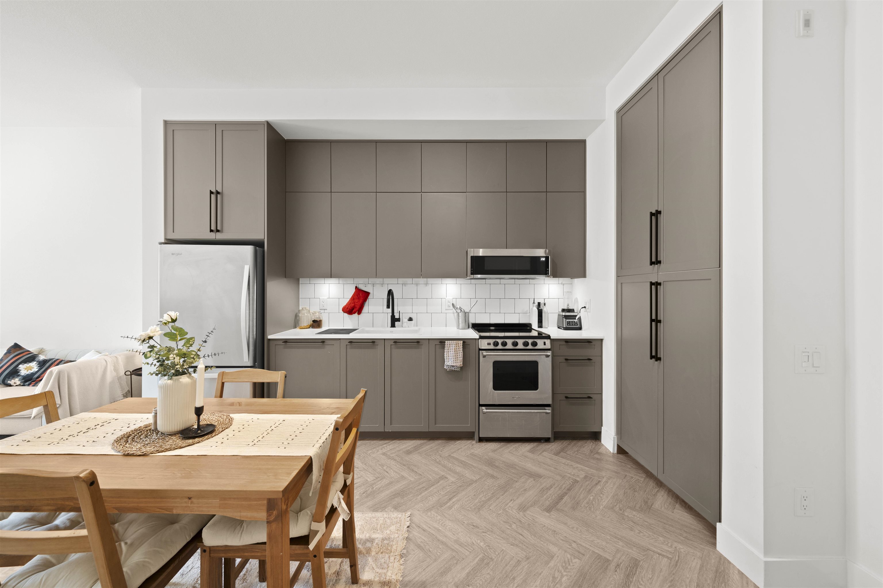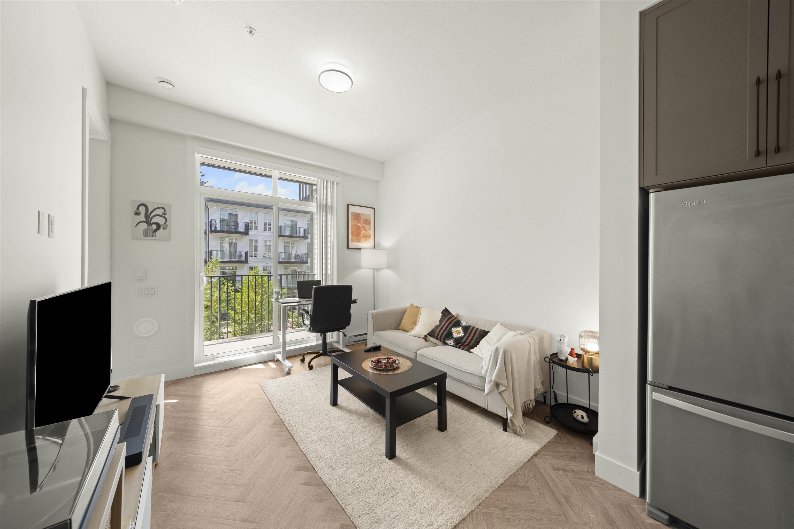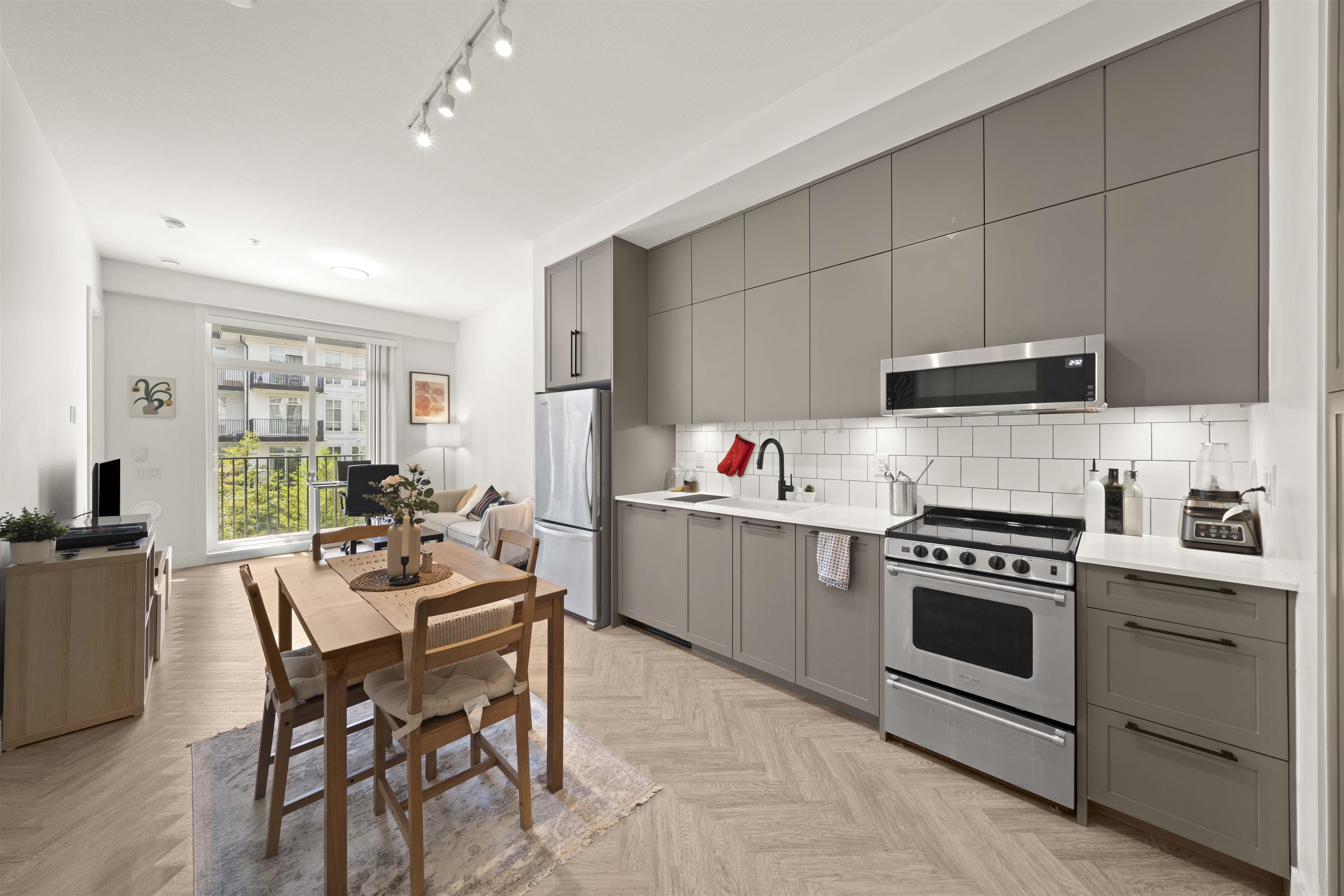 PARKER BY MOSAIC! This large 1 bed 1 bath west facing home come with 1 parking is perfect to live in or invest! Immediately notice the 10 FT ceilings in this bright home and appreciate the timeless elegance of herringbone flooring met with contemporary, clean Scandinavian kitchen and bathrooms. Very efficient layout with oversized windows and patio looking out into the quiet courtyard. Whirlpool appliances, full-size laundry, recessed LED portlights, ambient lighting behind floating bathroom mirrors, quartz...