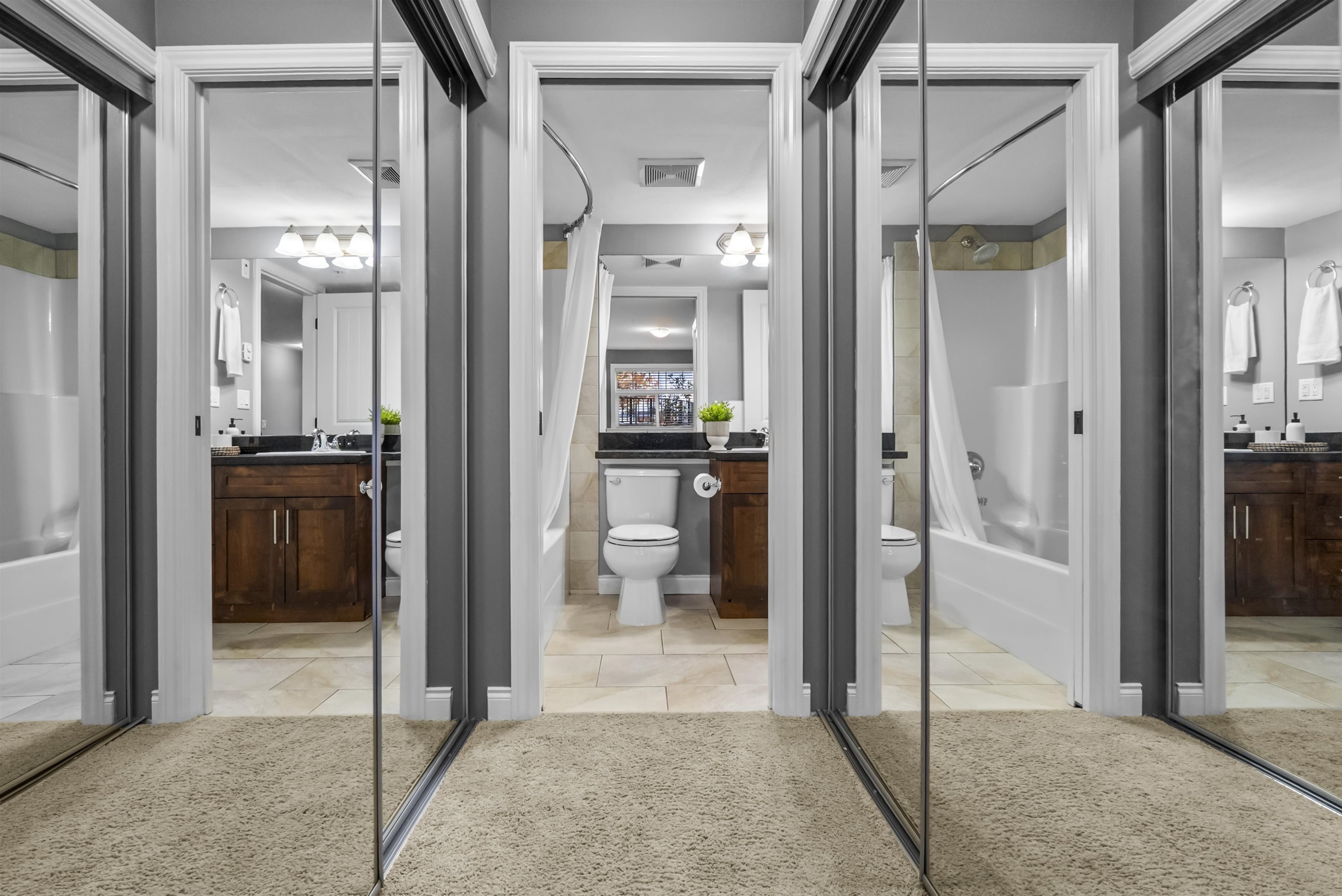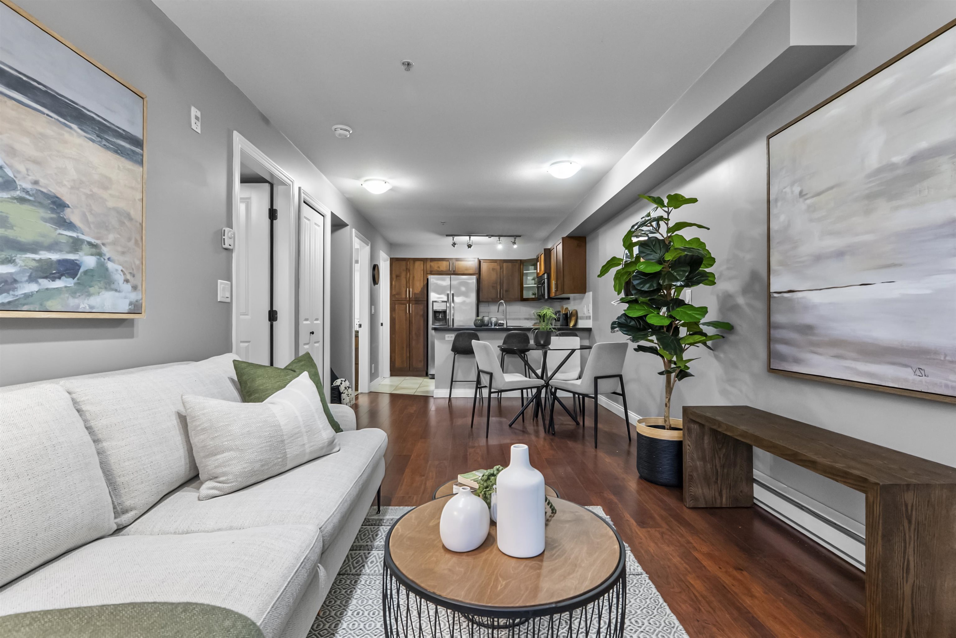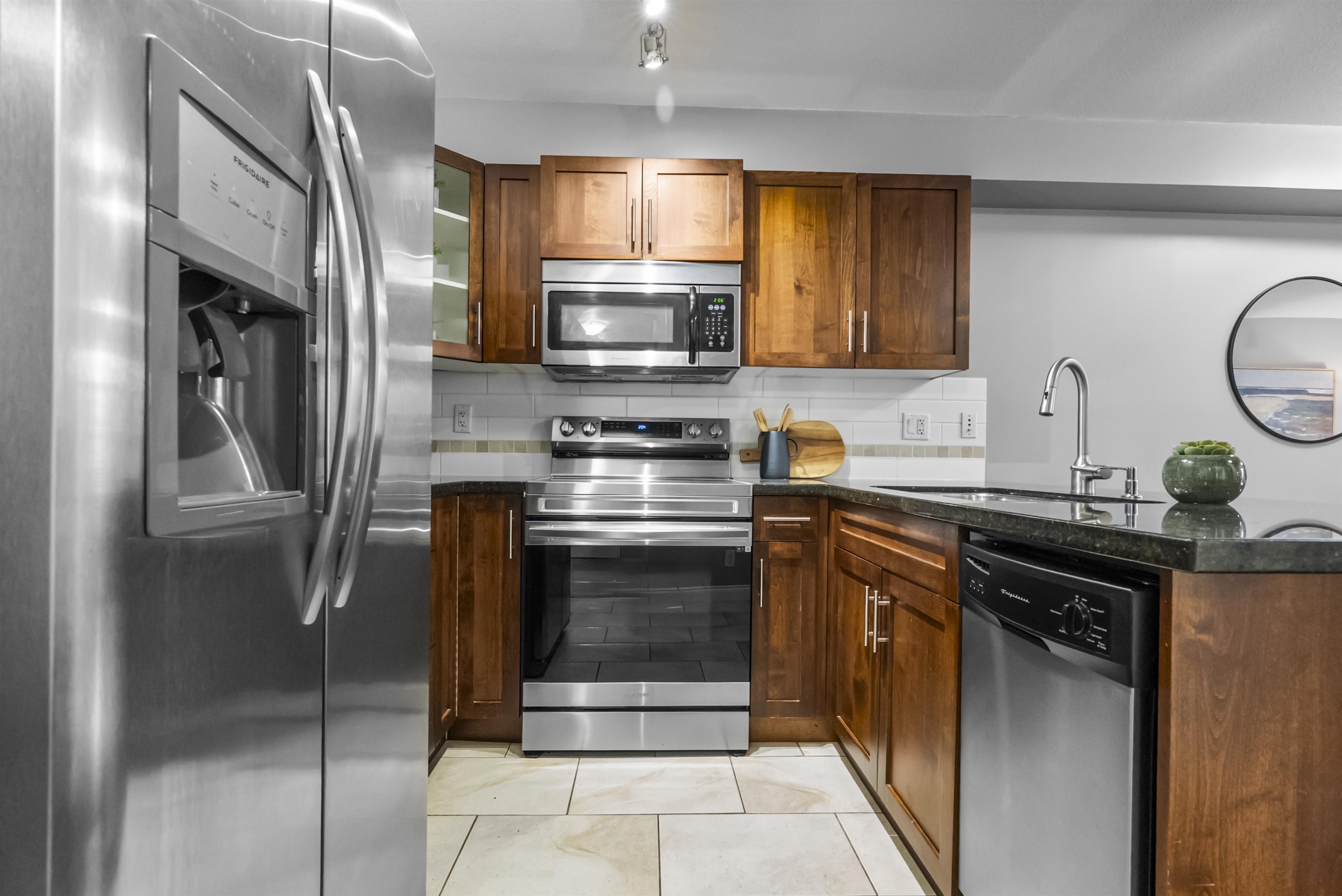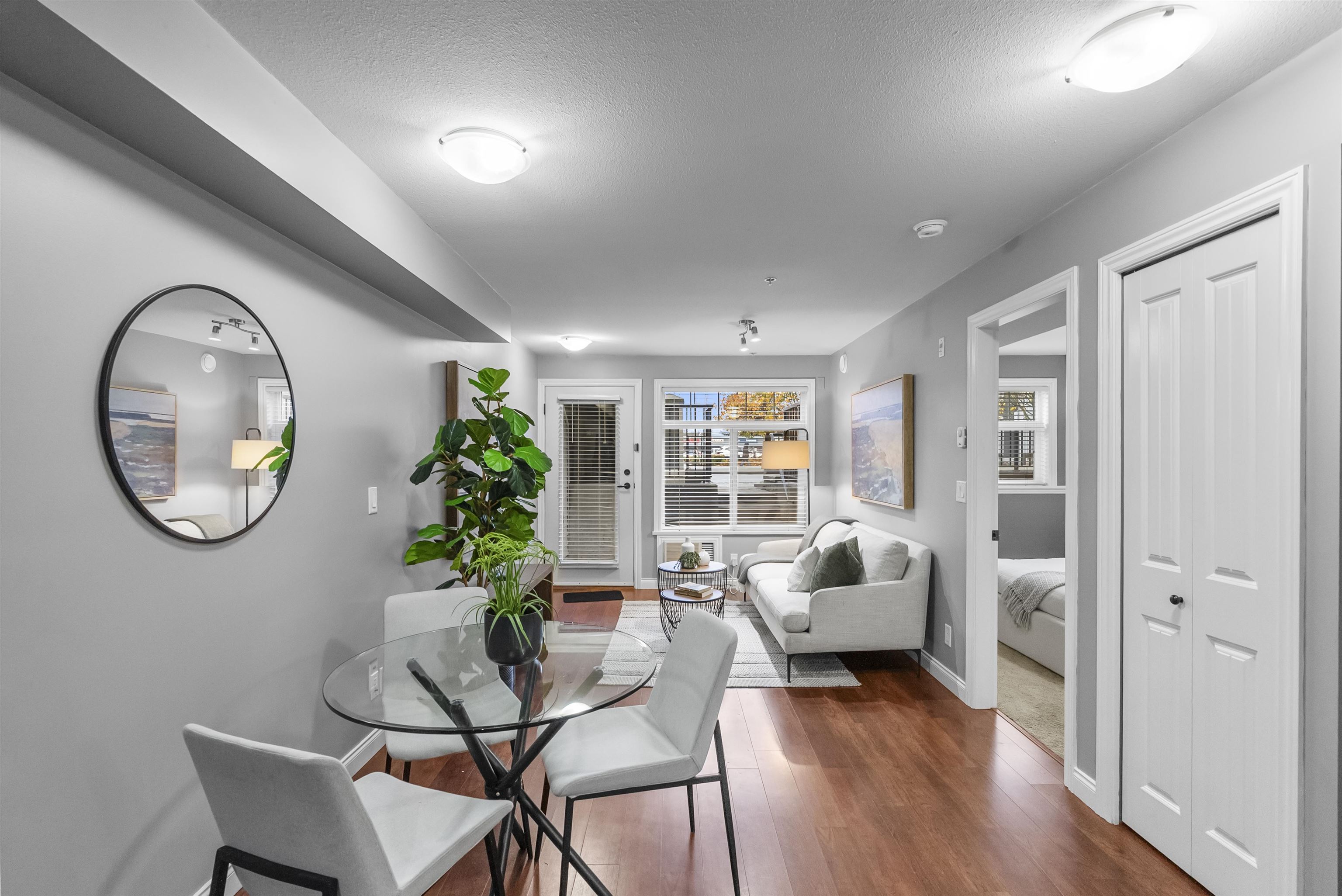 Immaculate one-bedroom ground floor condo is a must see. Bright, open layout features granite countertops, stainless steel appliances, and a semi-ensuite bathroom. New carpet in bedroom and den/storage space, fresh paint throughout, and updated light fixtures create a modern, welcoming space. Perfectly positioned ground-floor unit in a well-maintained building with stunning courtyard. Prime location just 100m from transit, steps to shopping, dining, recreation, casino, and town center. Flexible for investor...