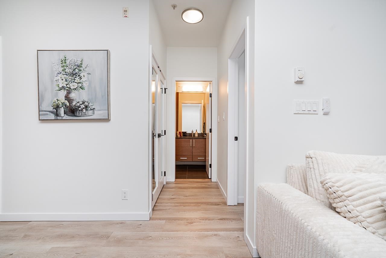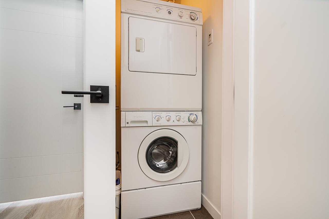 VIA - 1 BRRM & DEN home by Boffo! Beautiful kitchen with granite; soft-close cabinetry; stainless Frigidaire appliances-gas cooktop; electric convection oven; fridge w/ice & water; d/w; microwave; w/d; Kohler sinks; floating vanities; soaker tubs; gas f/p; high-end laminate & tile flooring; wooden blind; huge Deck: Keyless electronic security system. Central location walking distance to shopping centre, Walmart, restaurants, Starlight Casino. 5 mins to E/W connector & easy access to Burnaby, Richmond & Van...