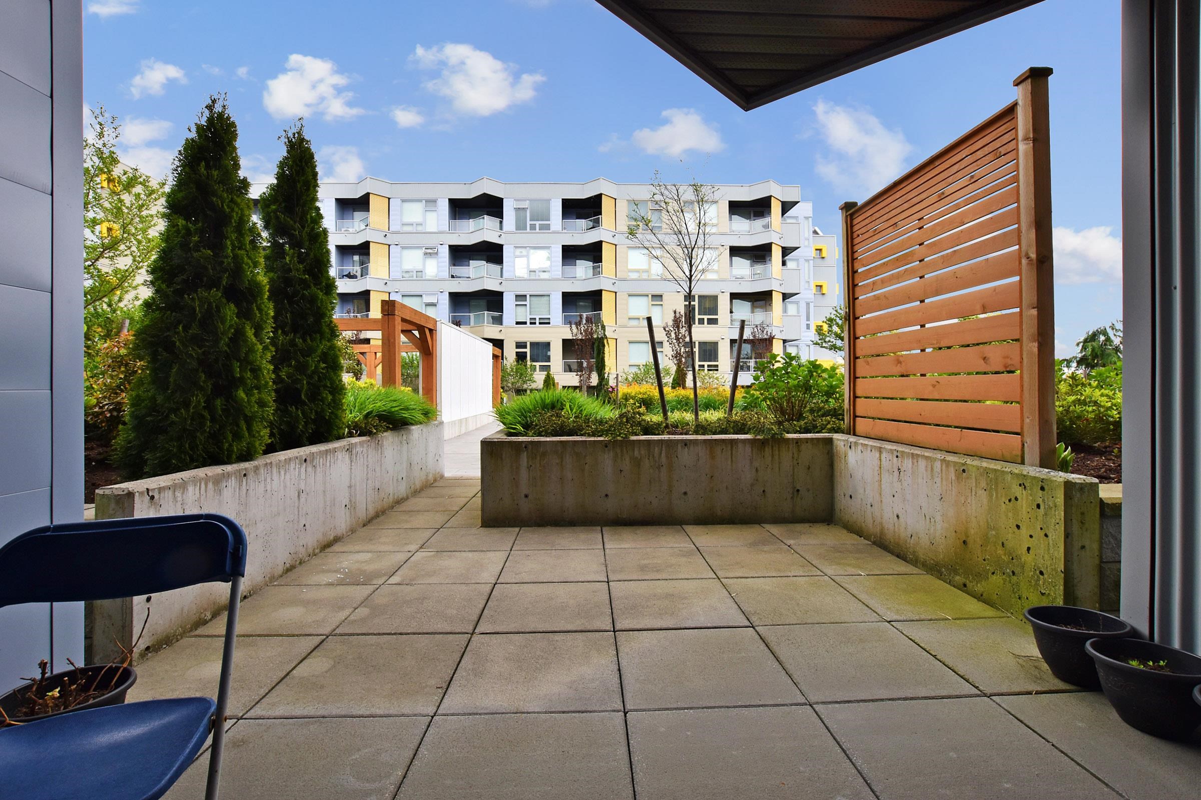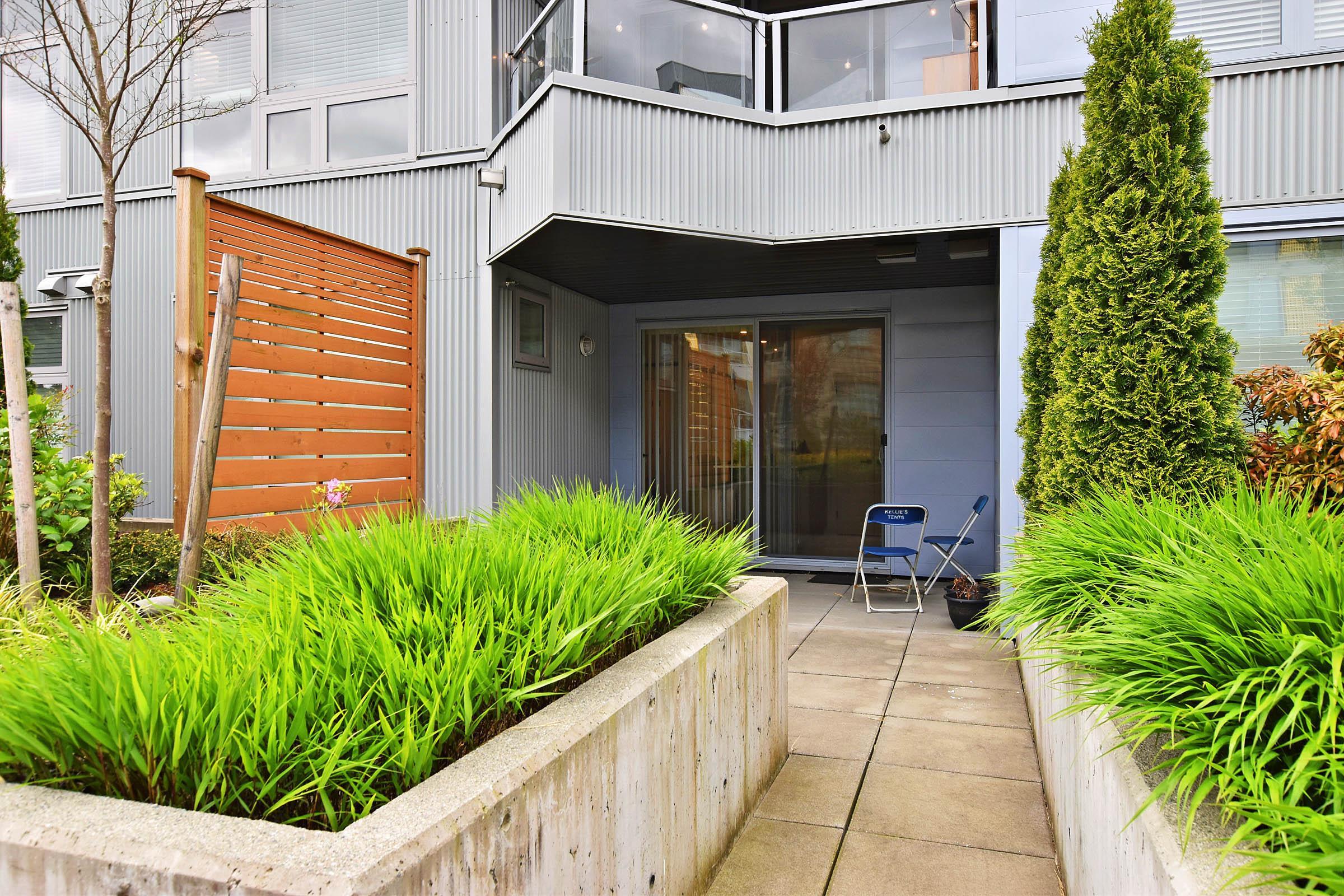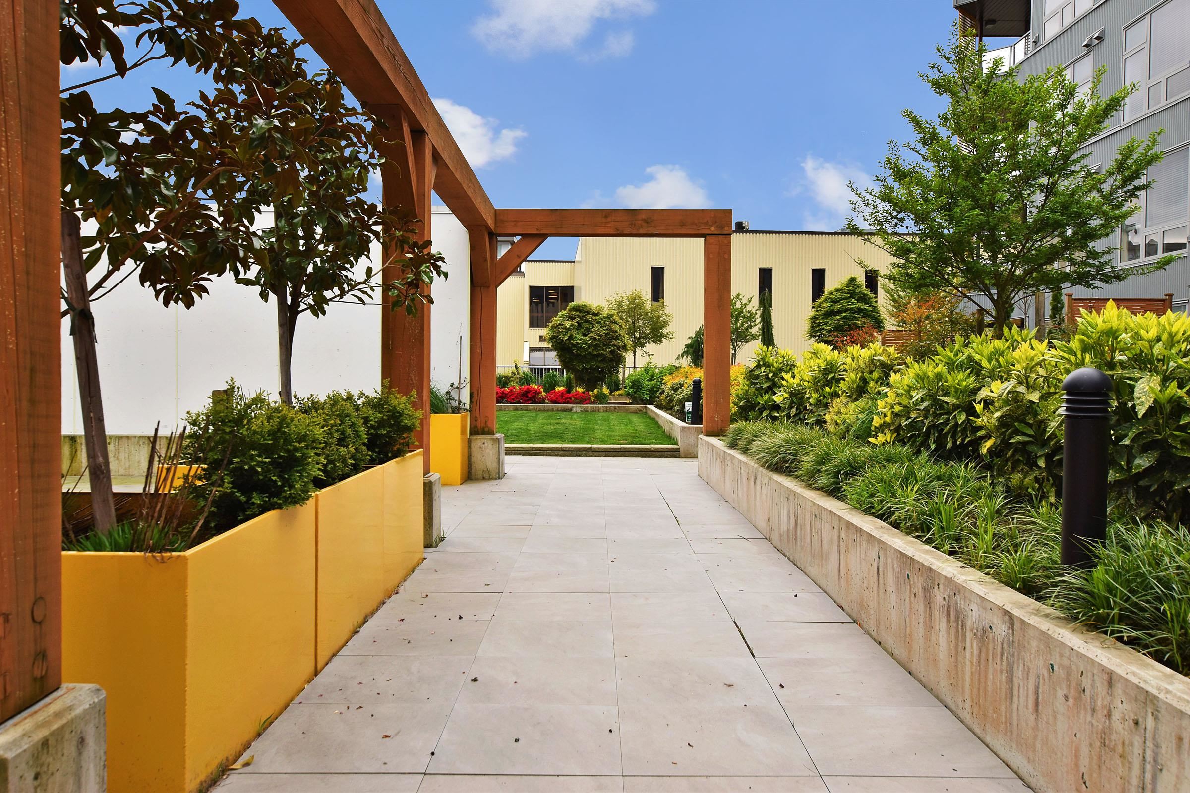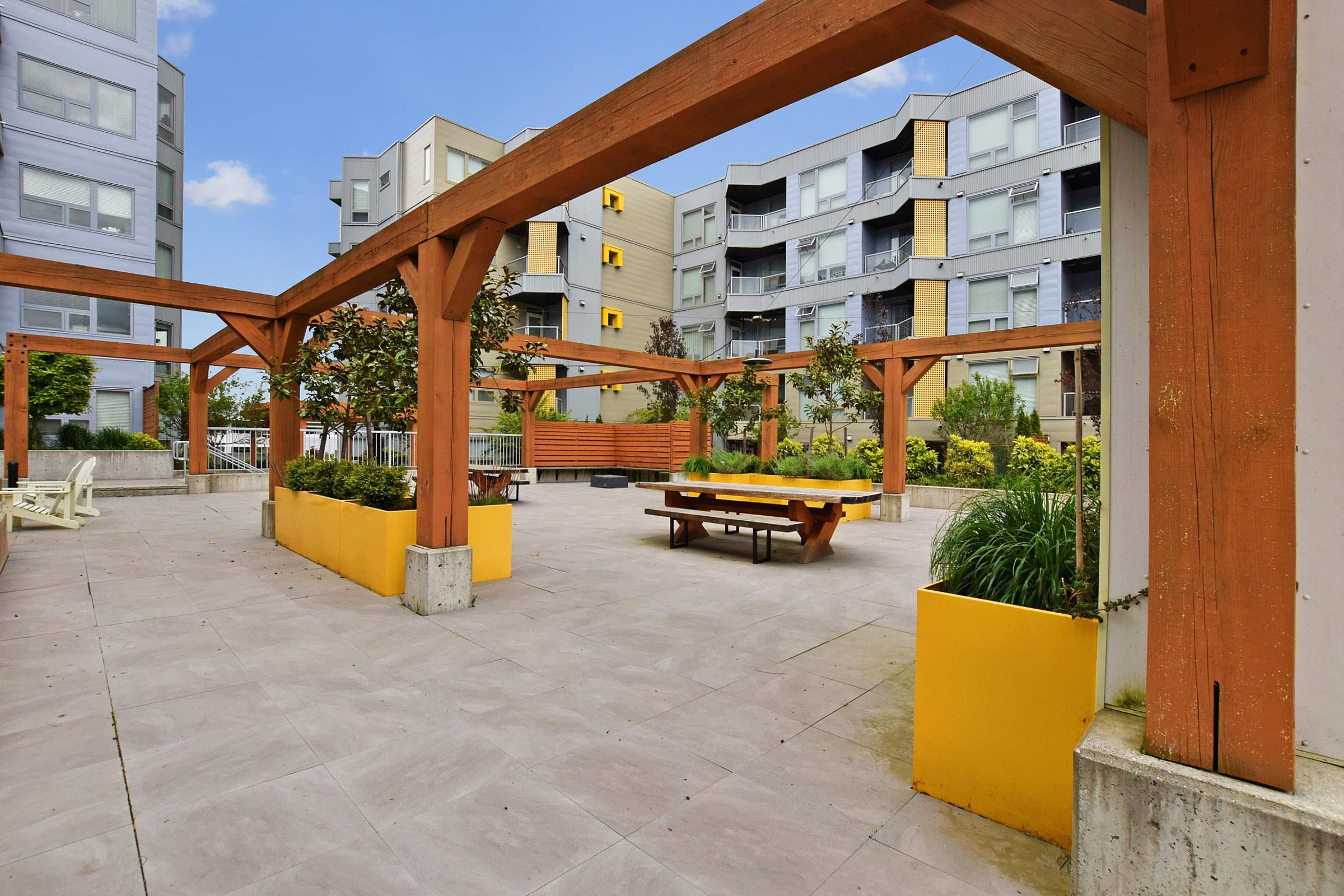 Your own Backdoor, like main floor access. Bright modern 1 bedroom on the quiet side facing east to the beautifully landscaped courtyard. Huge partly-covered 204 sq ft terrace Features full-size secure parking stalls, common EV charging, large locker & bike room. Enjoy a Scandinavian-inspired interior, high ceilings, open plan, wide-plank flooring, spacious kitchen w/eating bar, stainless appliances, quartz counters, Fisher & Paykel fridge, in-suite laundry & storage room. Have fun in the courtyard w/picn...