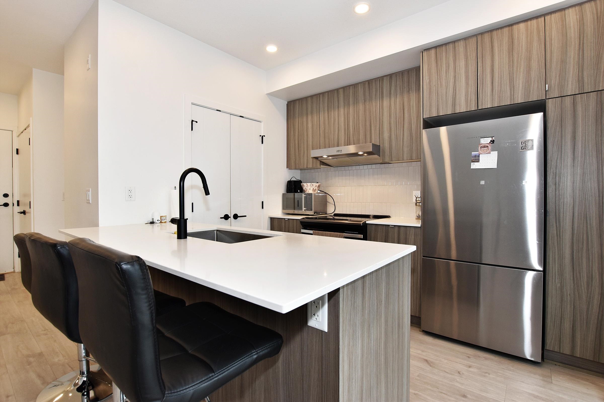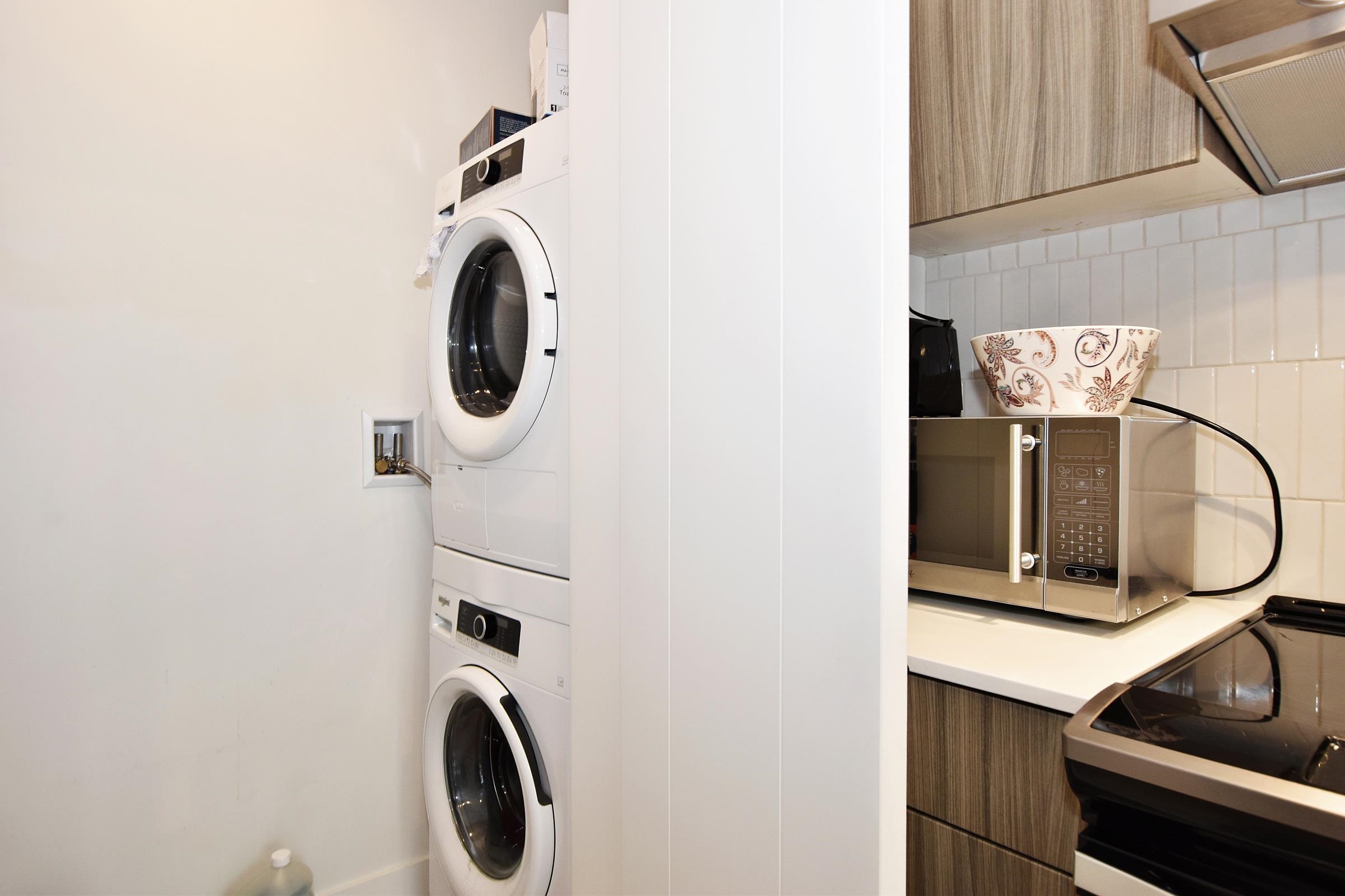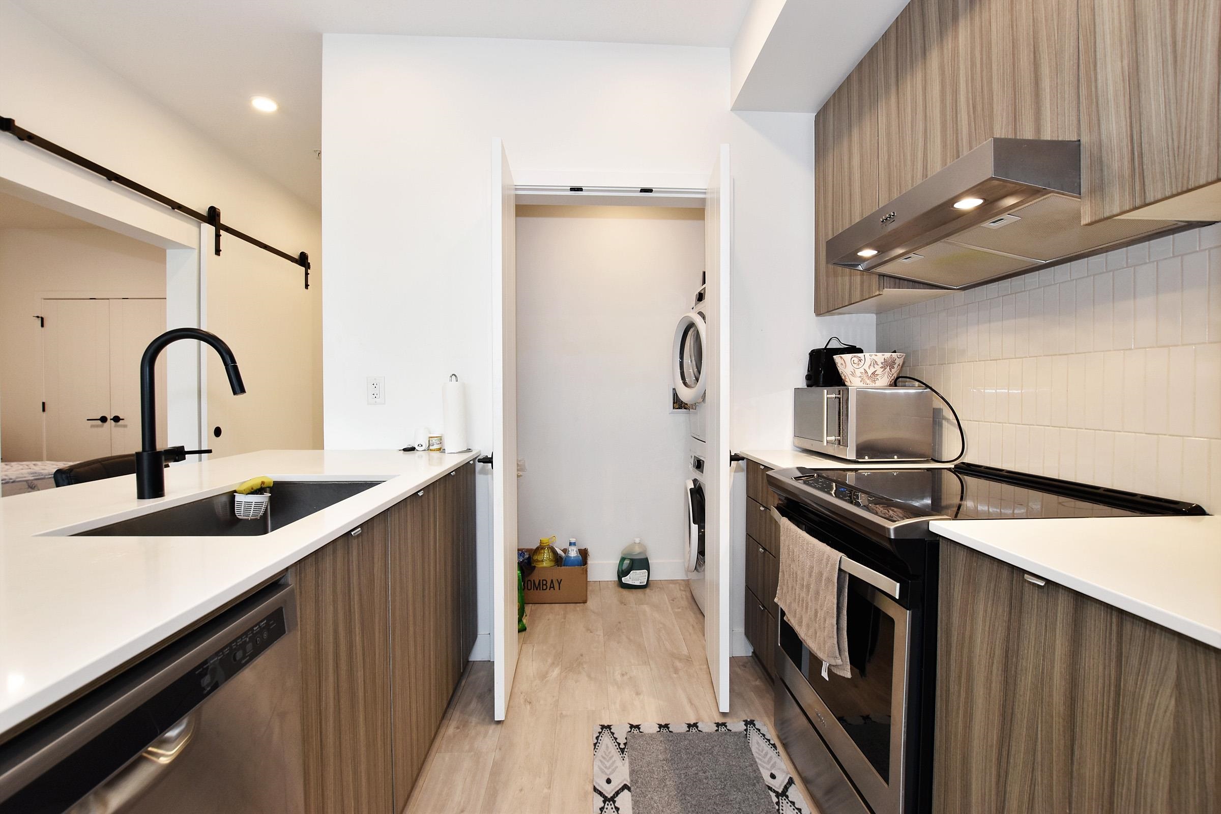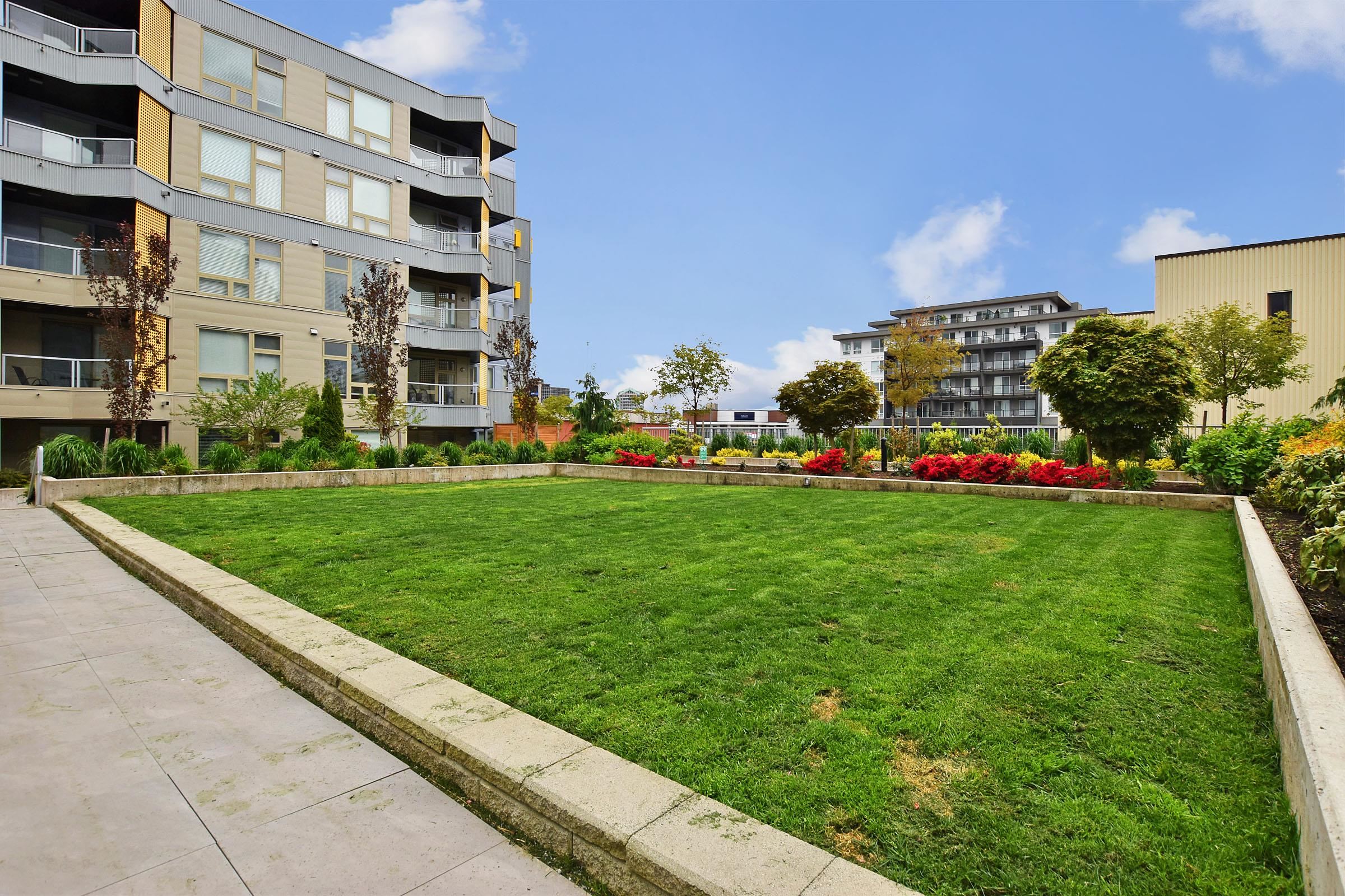 Your own Backdoor, like main floor access. Bright modern 1 bedroom on the quiet side facing east to the beautifully landscaped courtyard. Huge partly-covered 204 sq ft terrace Features full-size secure parking stalls, common EV charging, large locker & bike room. Enjoy a Scandinavian-inspired interior, high ceilings, open plan, wide-plank flooring, spacious kitchen w/eating bar, stainless appliances, quartz counters, Fisher & Paykel fridge, in-suite laundry & storage room. Have fun in the courtyard w/picn...