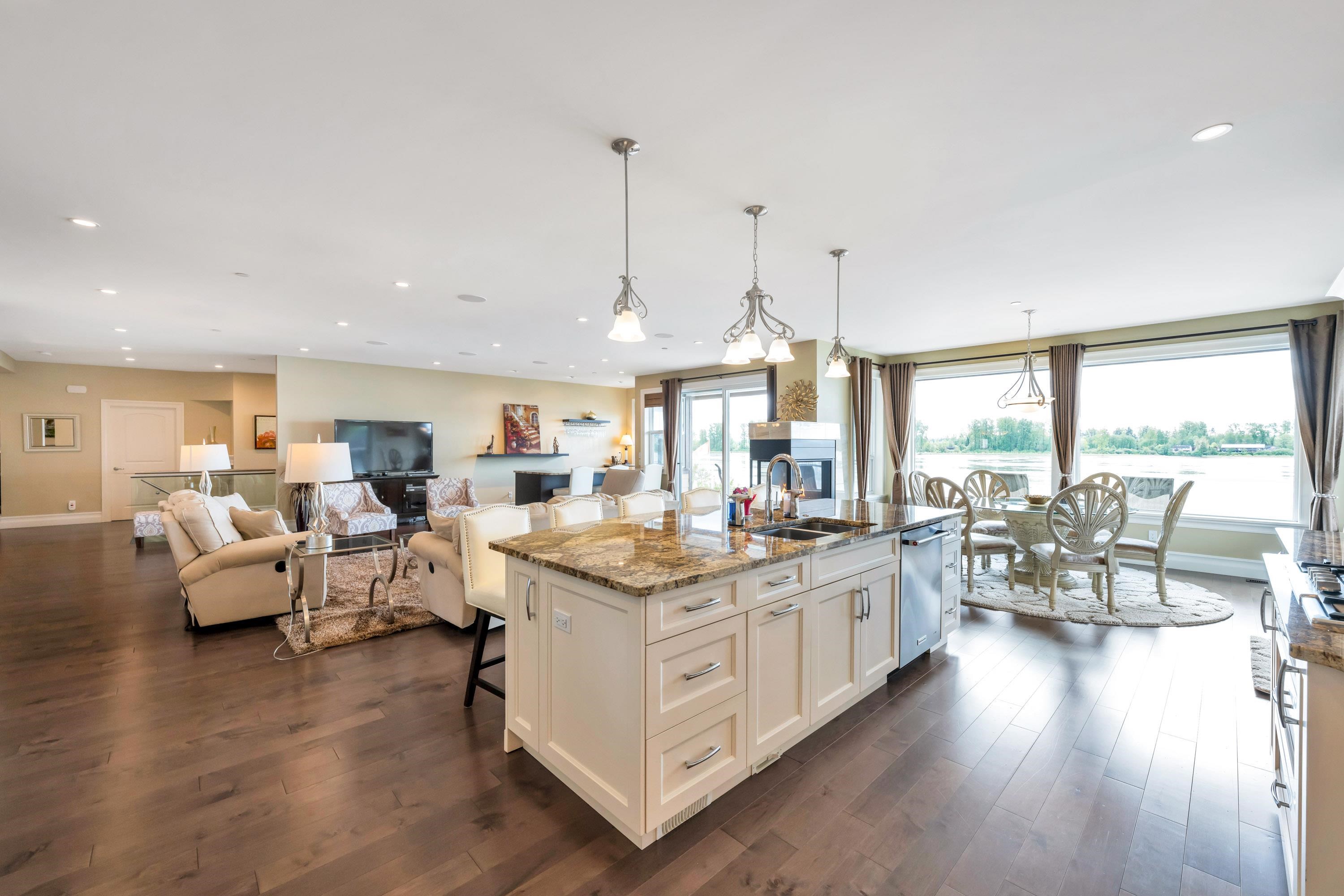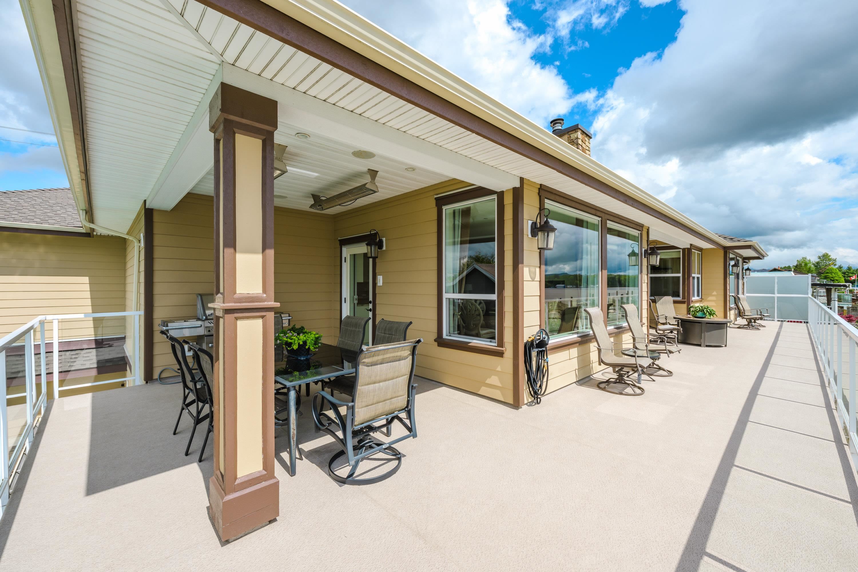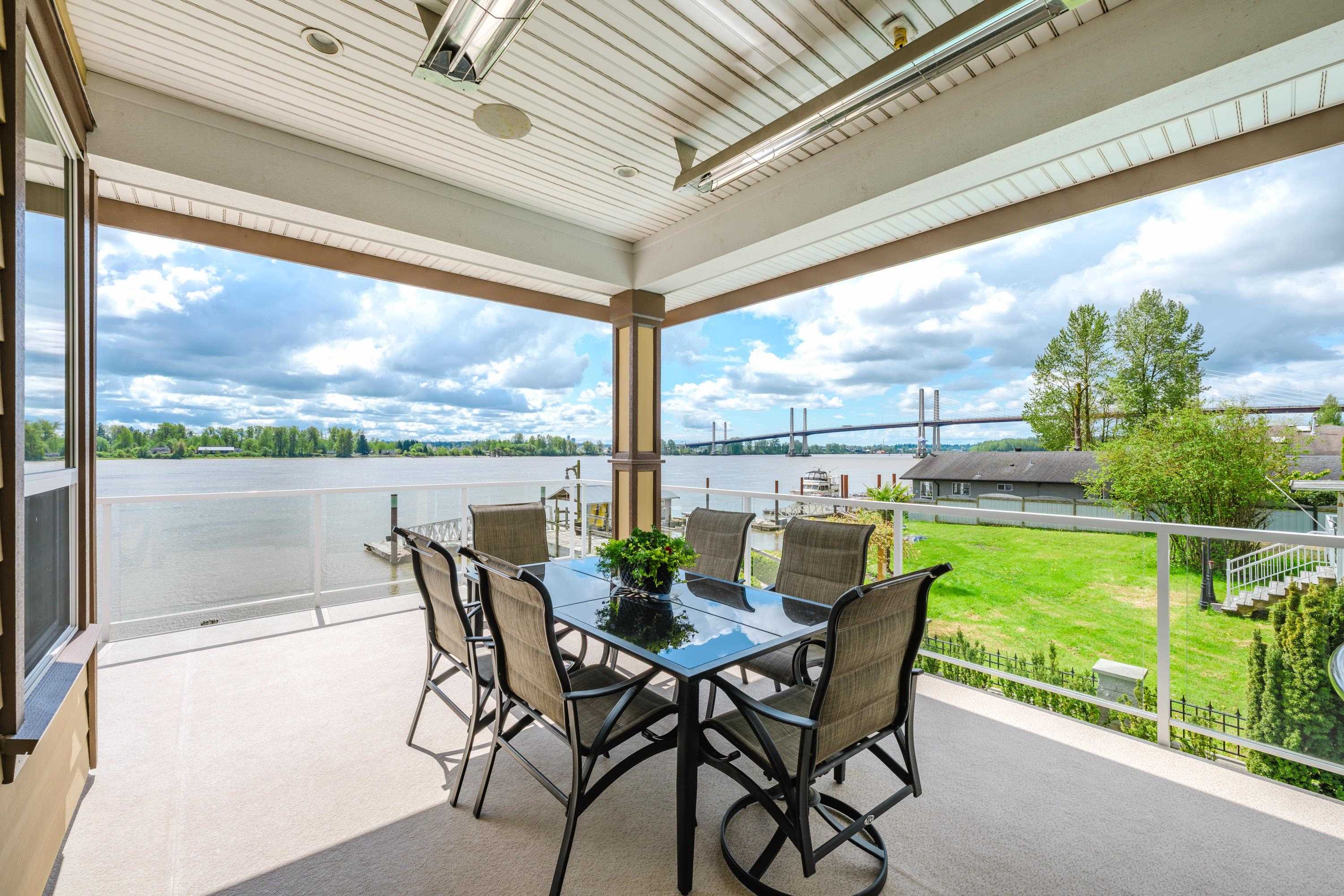 RARE FIND! INCREDIBLE WATERFRONT ESTATE on GORGEOUS 11,282 SF property with 100 feet of Fraser River waterfront & BREATHTAKING PANORAMIC MOUNTAIN & RIVER VIEWS from all main rooms in the open-concept living space that flows out to a private south exposed Resort Style Oasis with Pool, Hot Tub & Huge Heated Patios! Newer steel pilings ready for your boat dock. STUNNING CUSTOM 5633 sf open plan rancher with walkout bsmt is a perfect blend of comfort & elegance. Main floor - 2 spacious bedrms - spectacular prim...