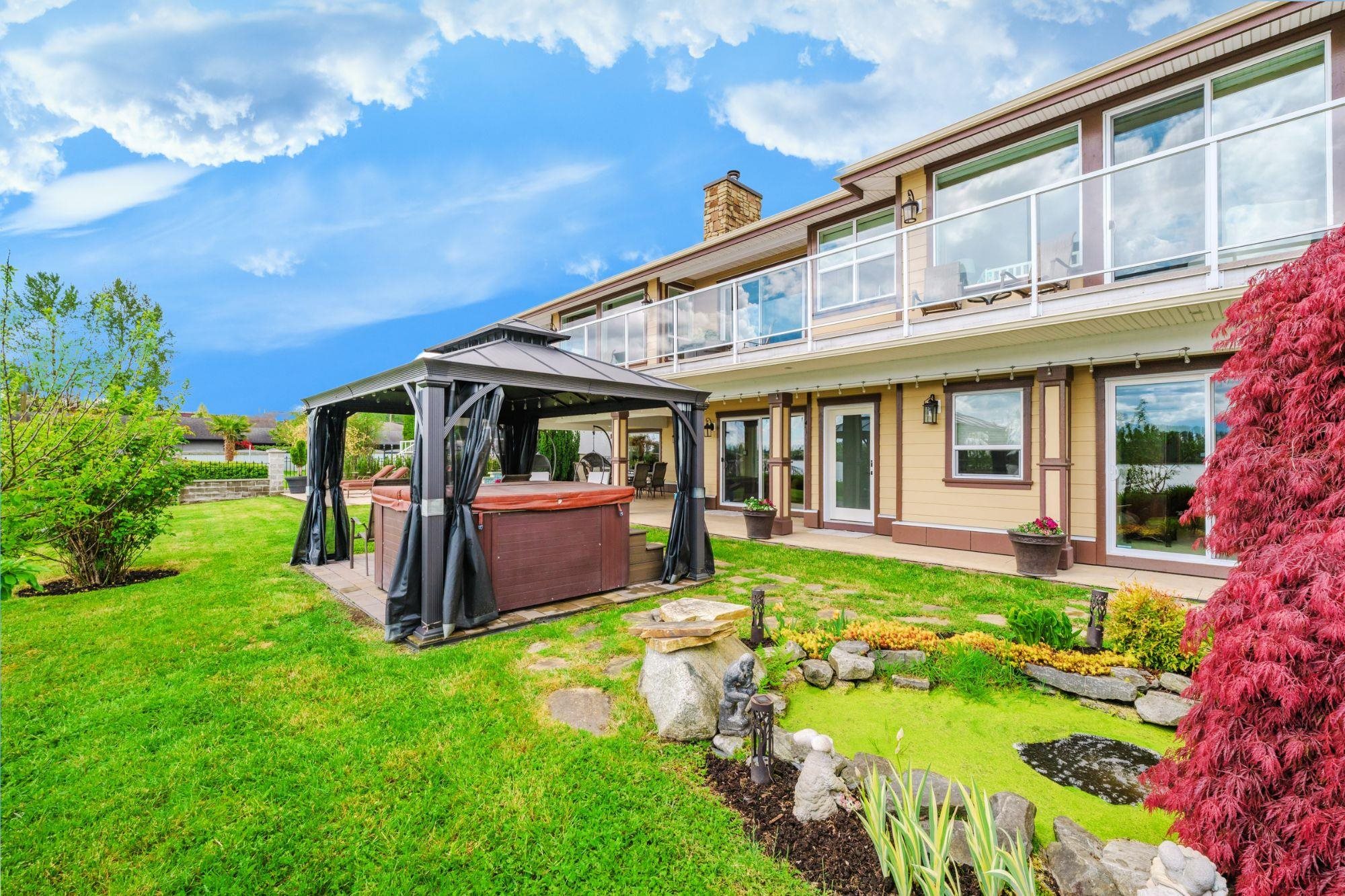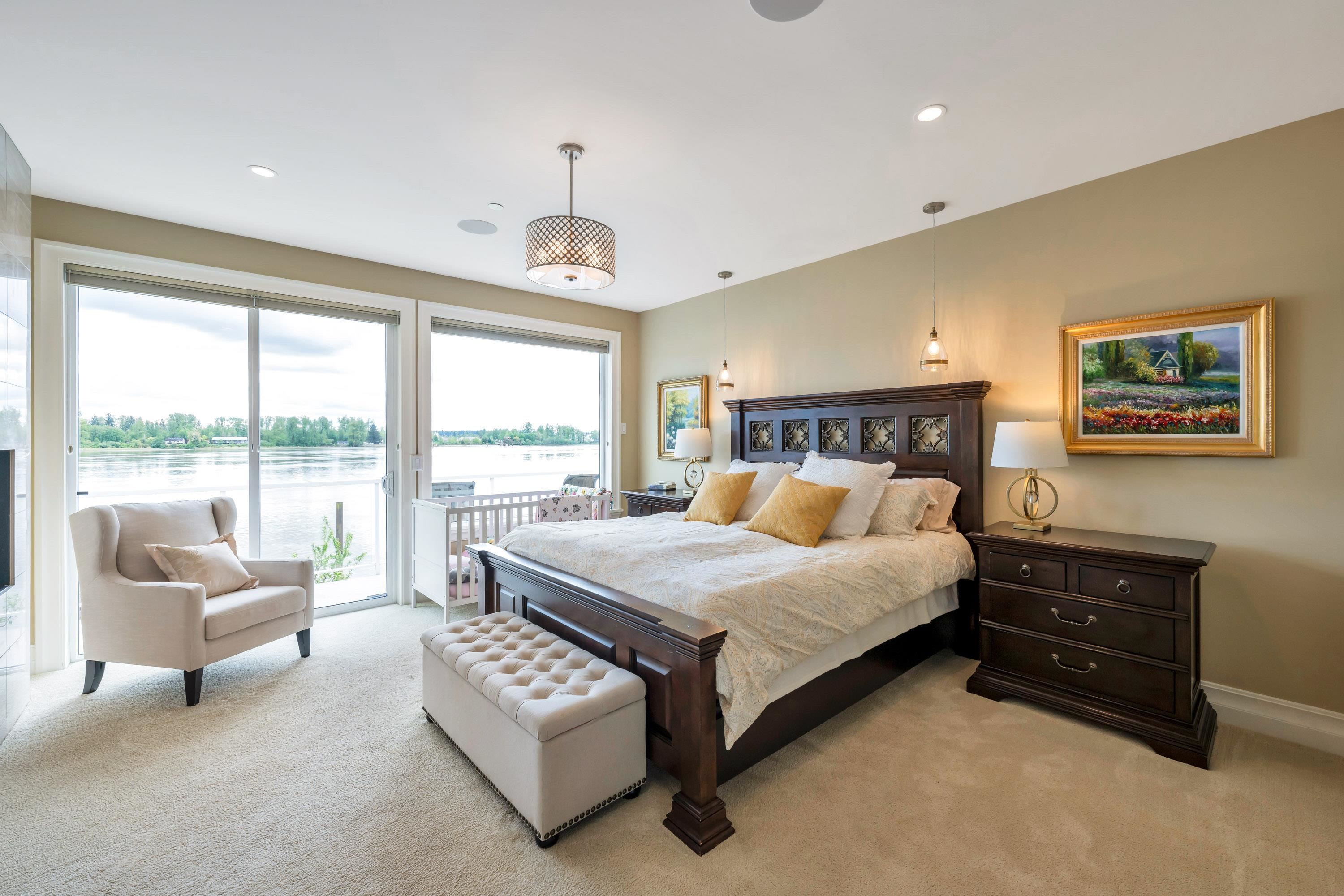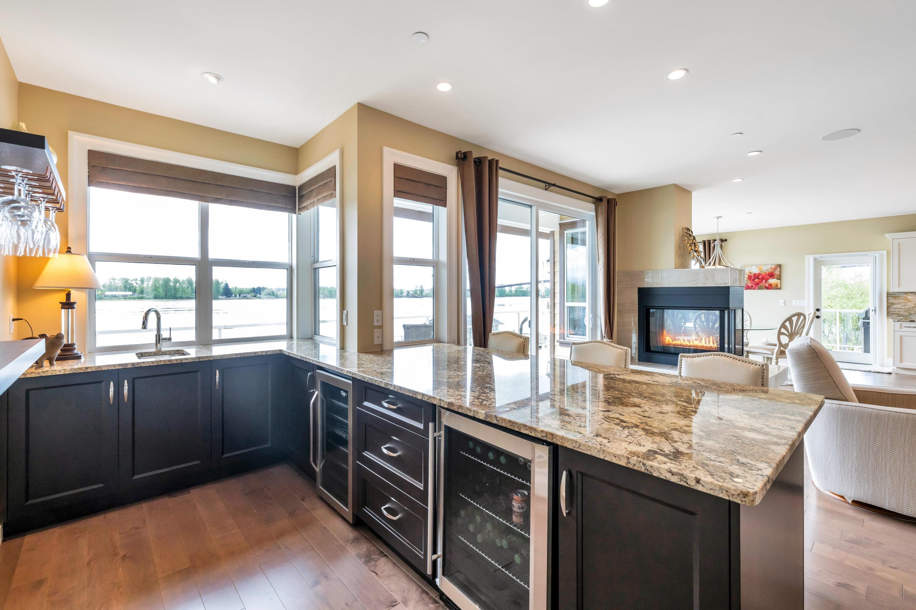 RARE FIND! INCREDIBLE WATERFRONT ESTATE on GORGEOUS 11,282 SF property with 100 feet of Fraser River waterfront & BREATHTAKING PANORAMIC MOUNTAIN & RIVER VIEWS from all main rooms in the open-concept living space that flows out to a private south exposed Resort Style Oasis with Pool, Hot Tub & Huge Heated Patios! Newer steel pilings ready for your boat dock. STUNNING CUSTOM 5633 sf open plan rancher with walkout bsmt is a perfect blend of comfort & elegance. Main floor - 2 spacious bedrms - spectacular prim...