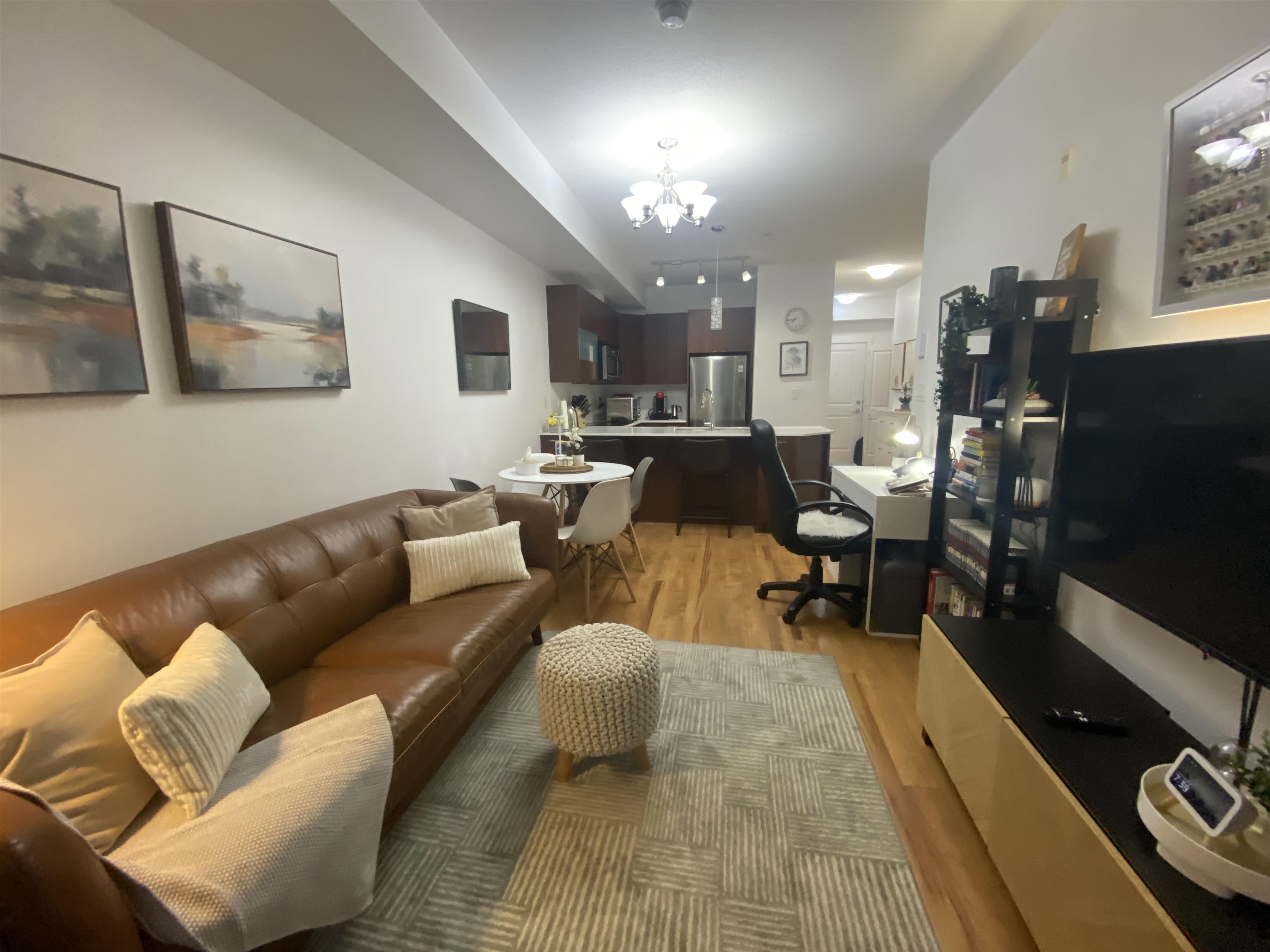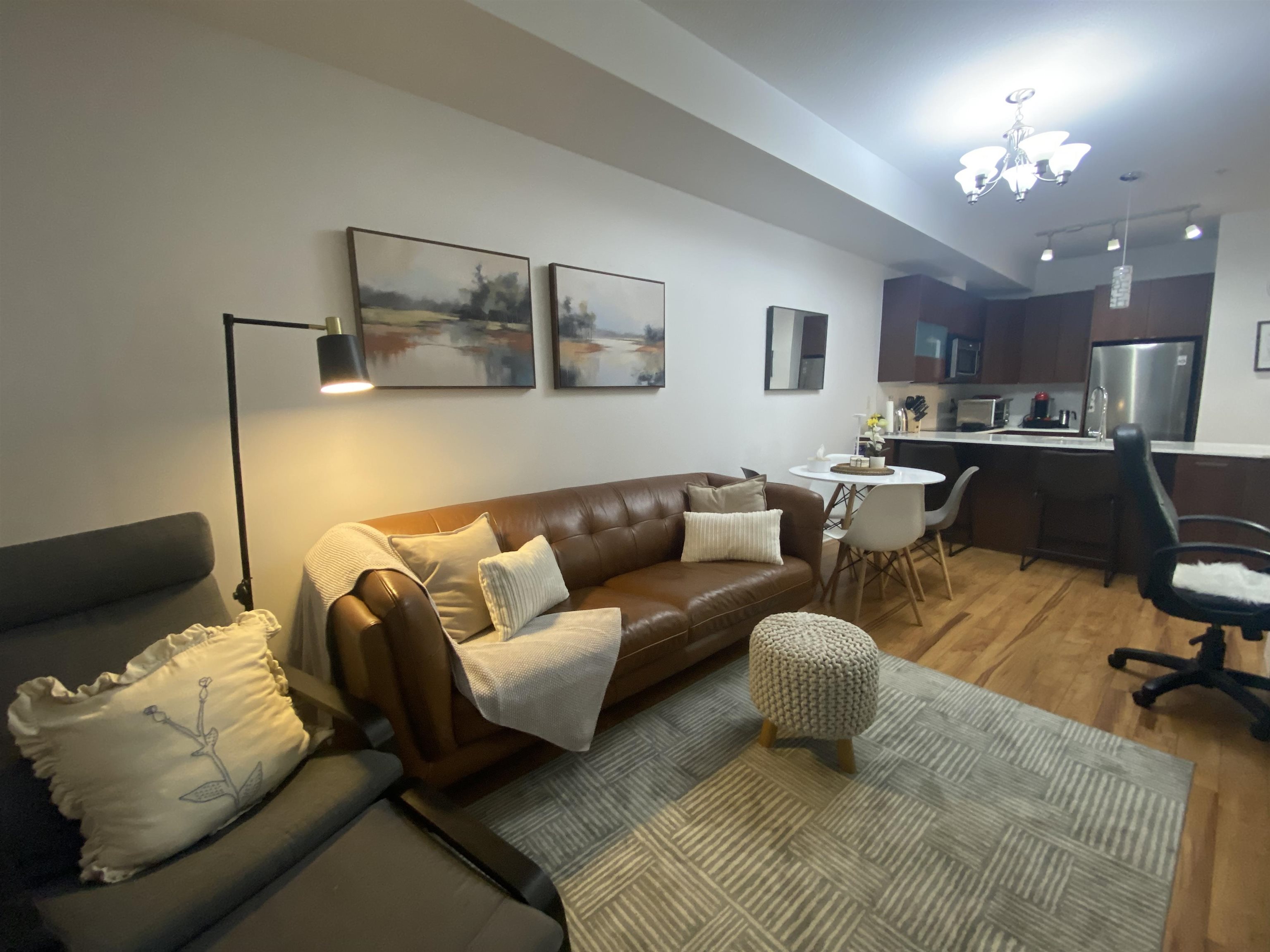 Amazing Location! This bright and modern 1-bedroom + den home offers a smart layout with a spacious den large enough to accommodate a double bed, perfect for guests or a home office. Move-in ready, featuring a stylish kitchen with quartz countertops, stainless steel appliances, a ceramic cooktop stove, and soft-close cabinetry. Enjoy laminate flooring throughout, soaring 9' ceilings and a private south-facing balcony for plenty of natural light. In-suite laundry included. Located within walking distance to ...