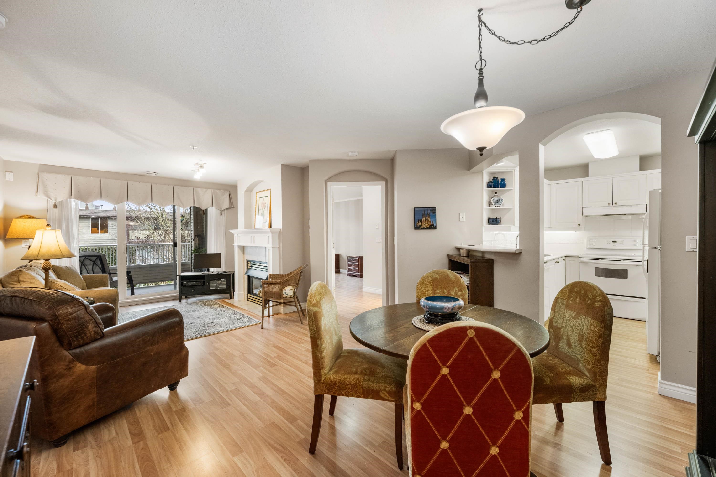 Beautiful 2 bedroom, 2 bathroom condo in the heart of Ladner. This bright, open-plan home features laminate flooring throughout and a well-designed kitchen with plenty of natural light. The spacious primary bedroom includes a walk-in closet and a full ensuite.The cozy living room is highlighted by a gas fireplace and large patio doors that open to a covered balcony overlooking the peaceful gardens on the quiet side of the building. Large windows throughout the home provide abundant natural light. In-suite l...
