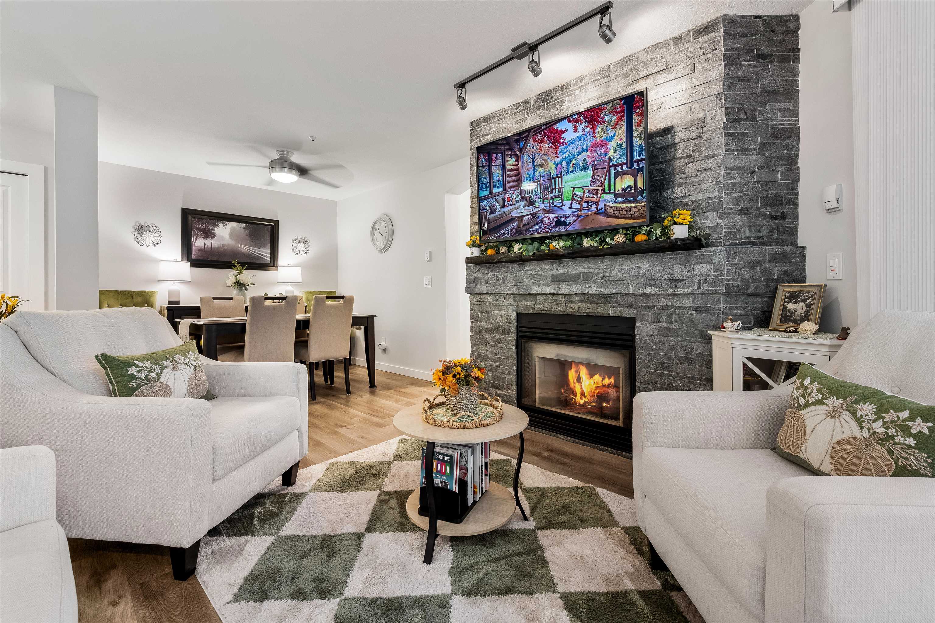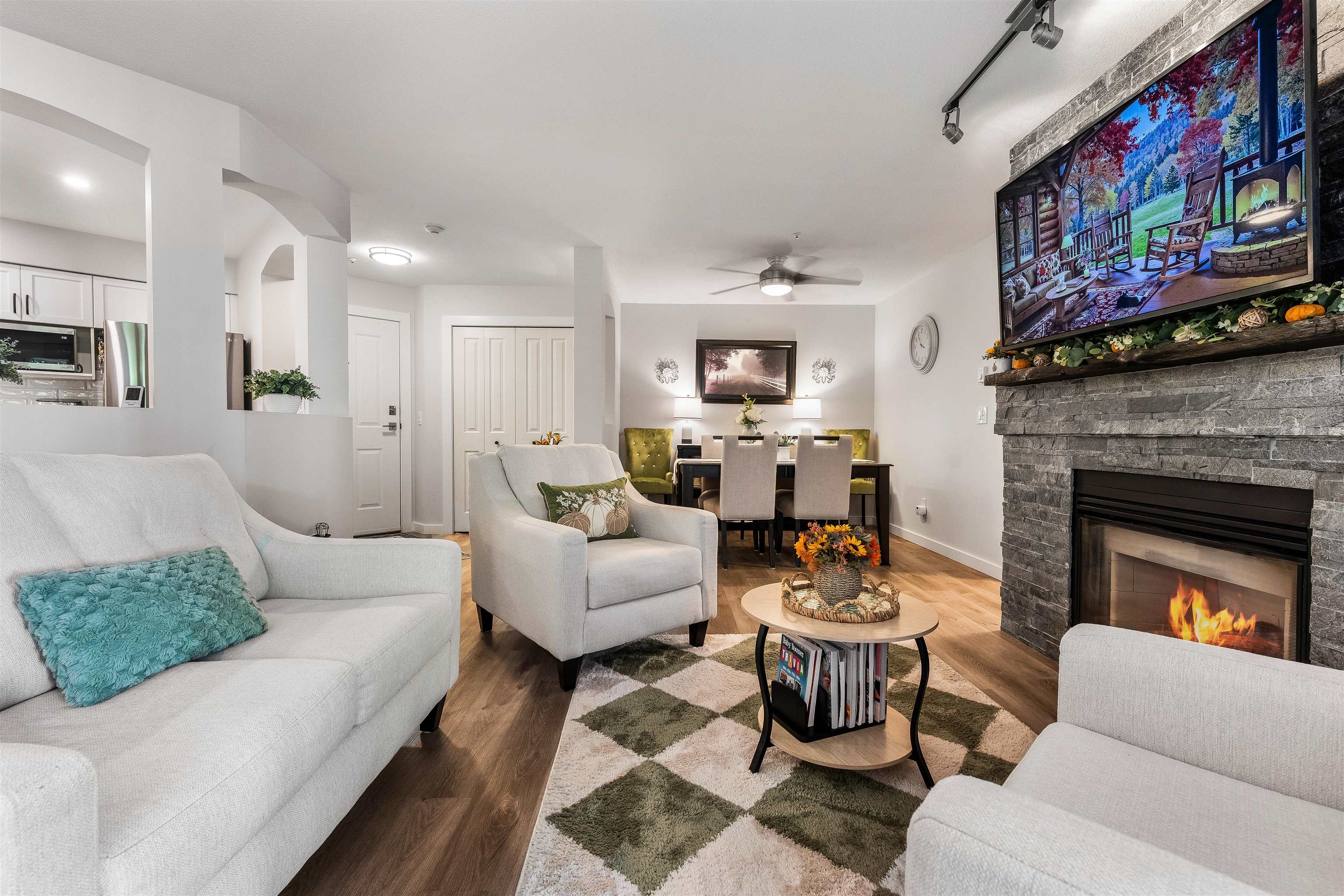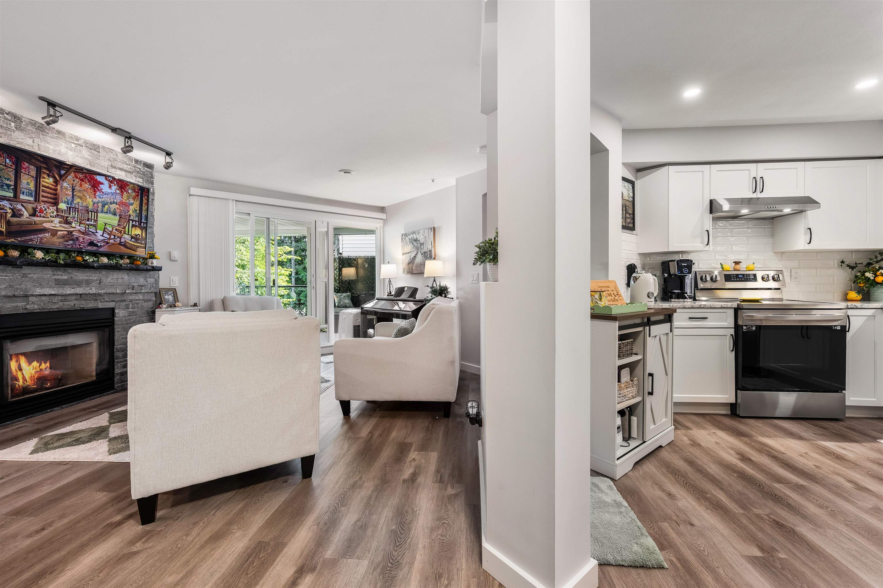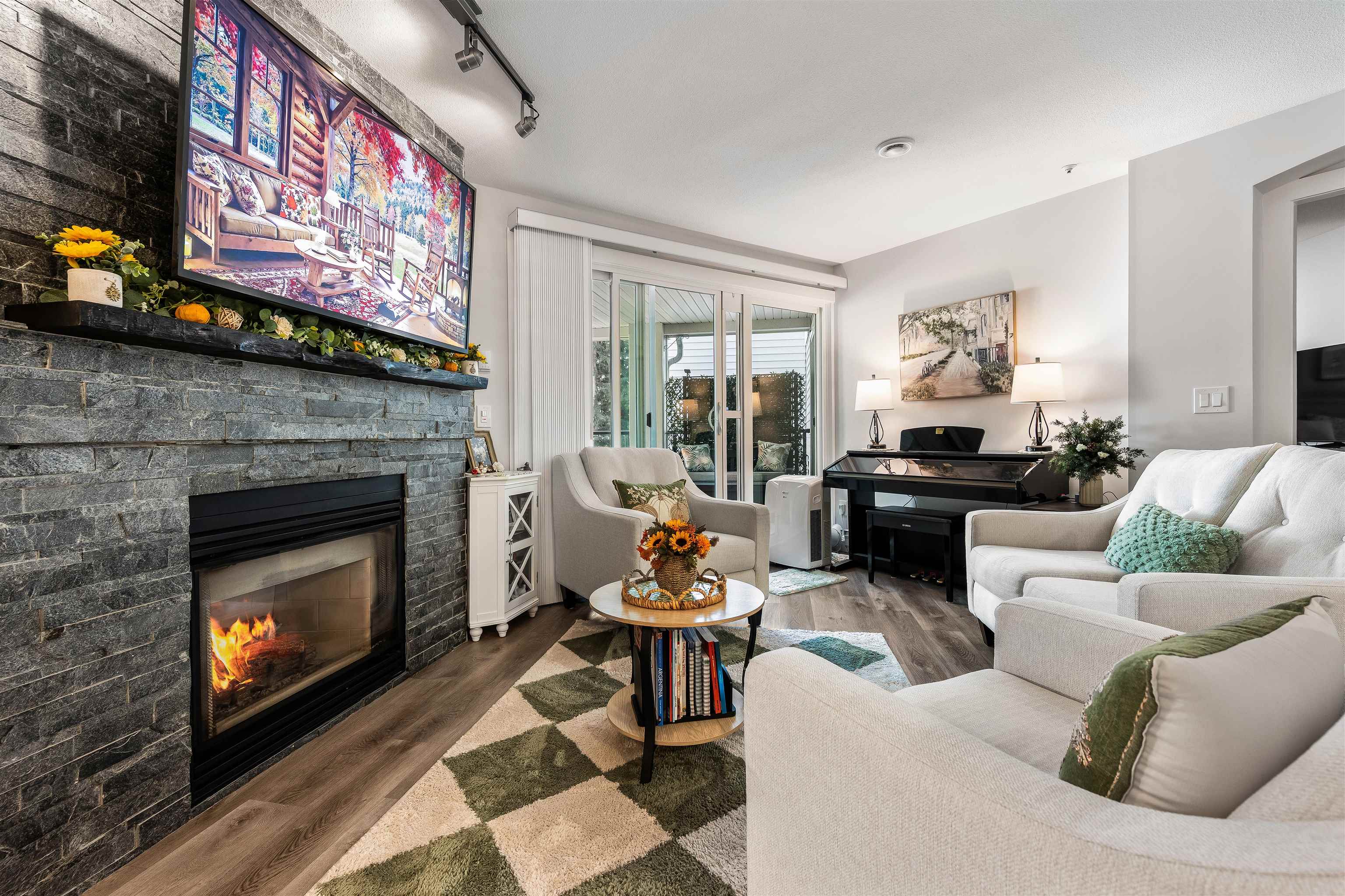 Stunning unit! Meticulously maintained & beautiful! Completely remodeled in 2023. Kitchen cabinets refaced with white shaker, 3 new SS appliances. All new fixtures, sink, taps & backsplash. New stone fireplace wall. New paint thru-out, new laminate floors, lighting & blinds. You'll be drawn to the large triple glass doors that lead to an amazing, huge, covered out-door living area that overlooks the nicely landscaped grounds on the QUIET South side of building & has NG hookup for BBQ! MBdrm has direct acces...