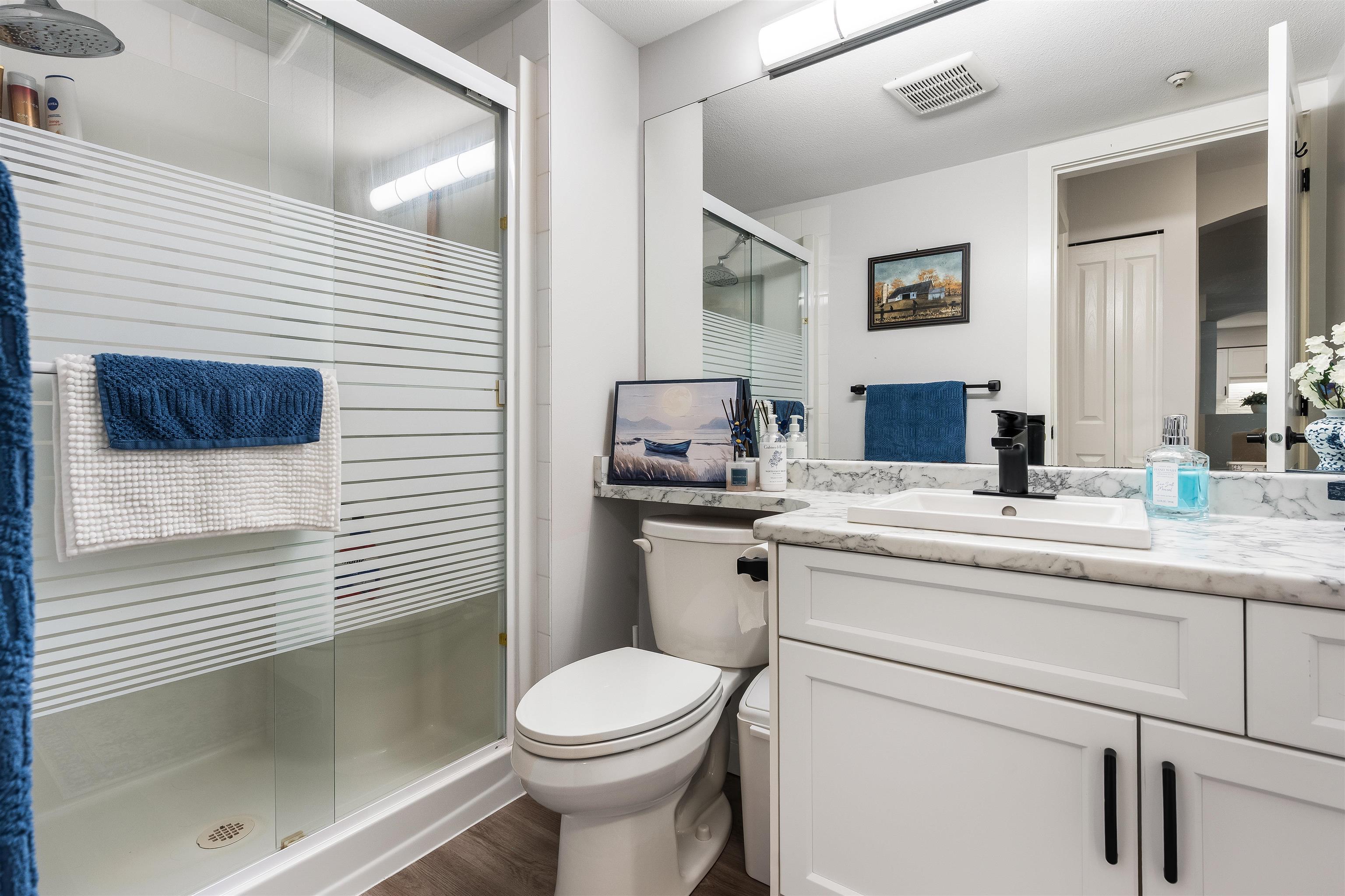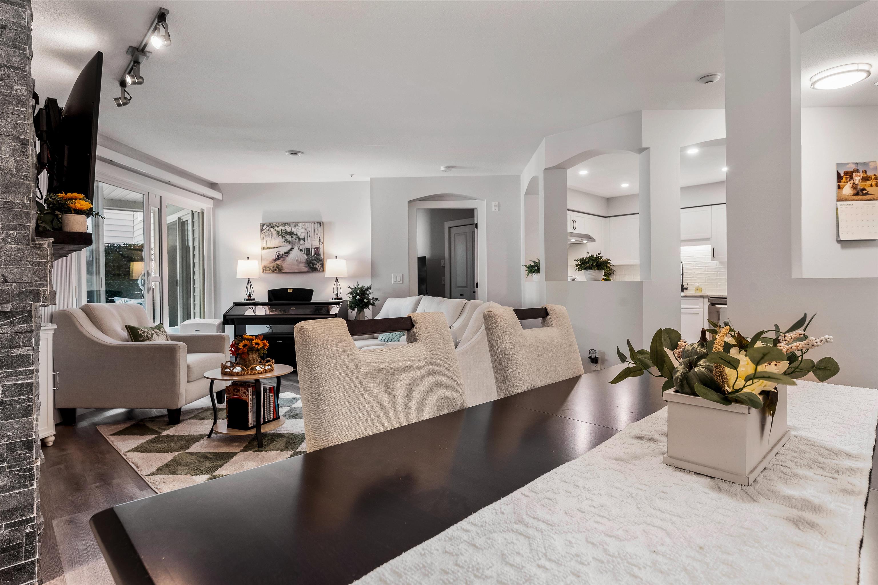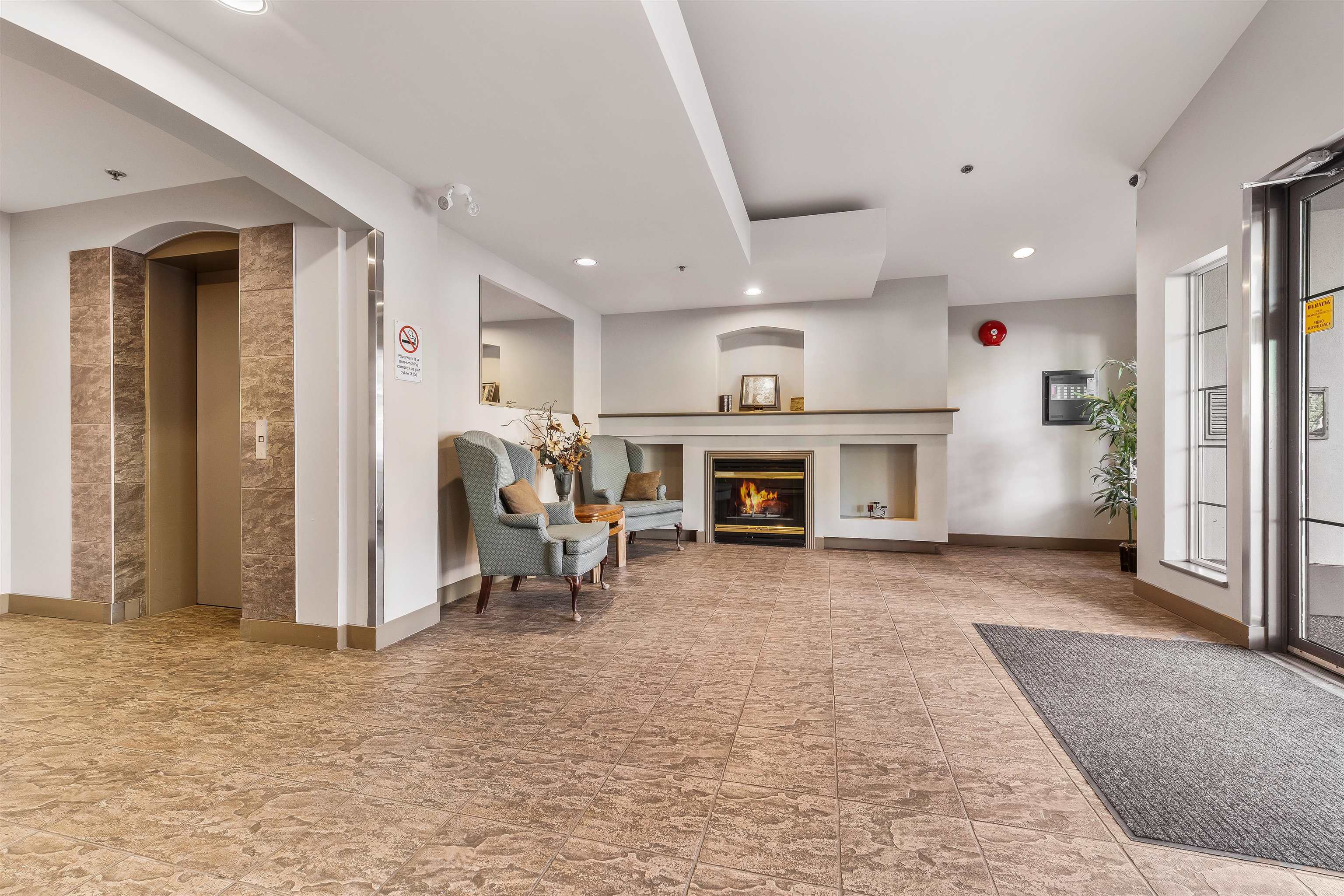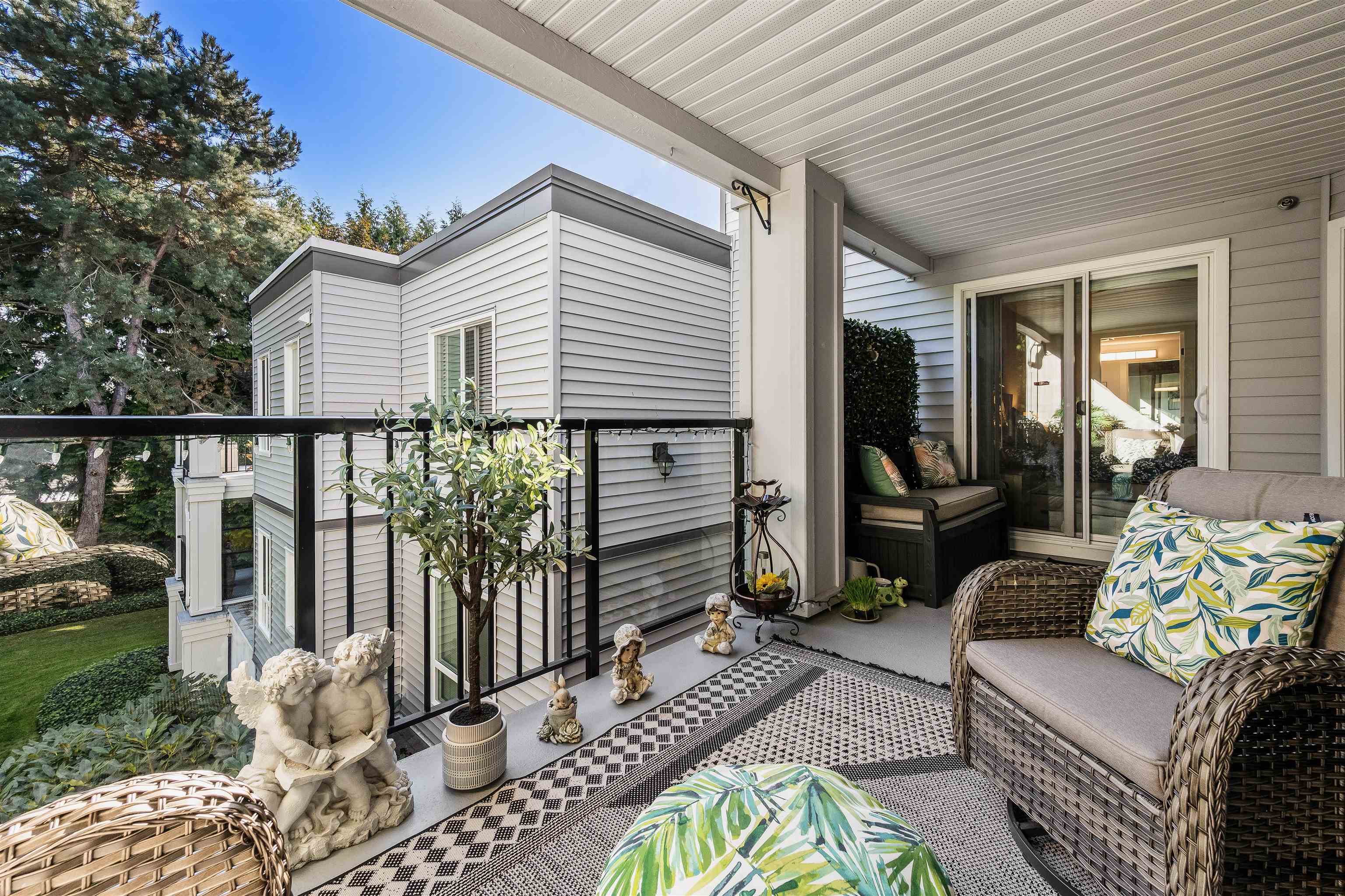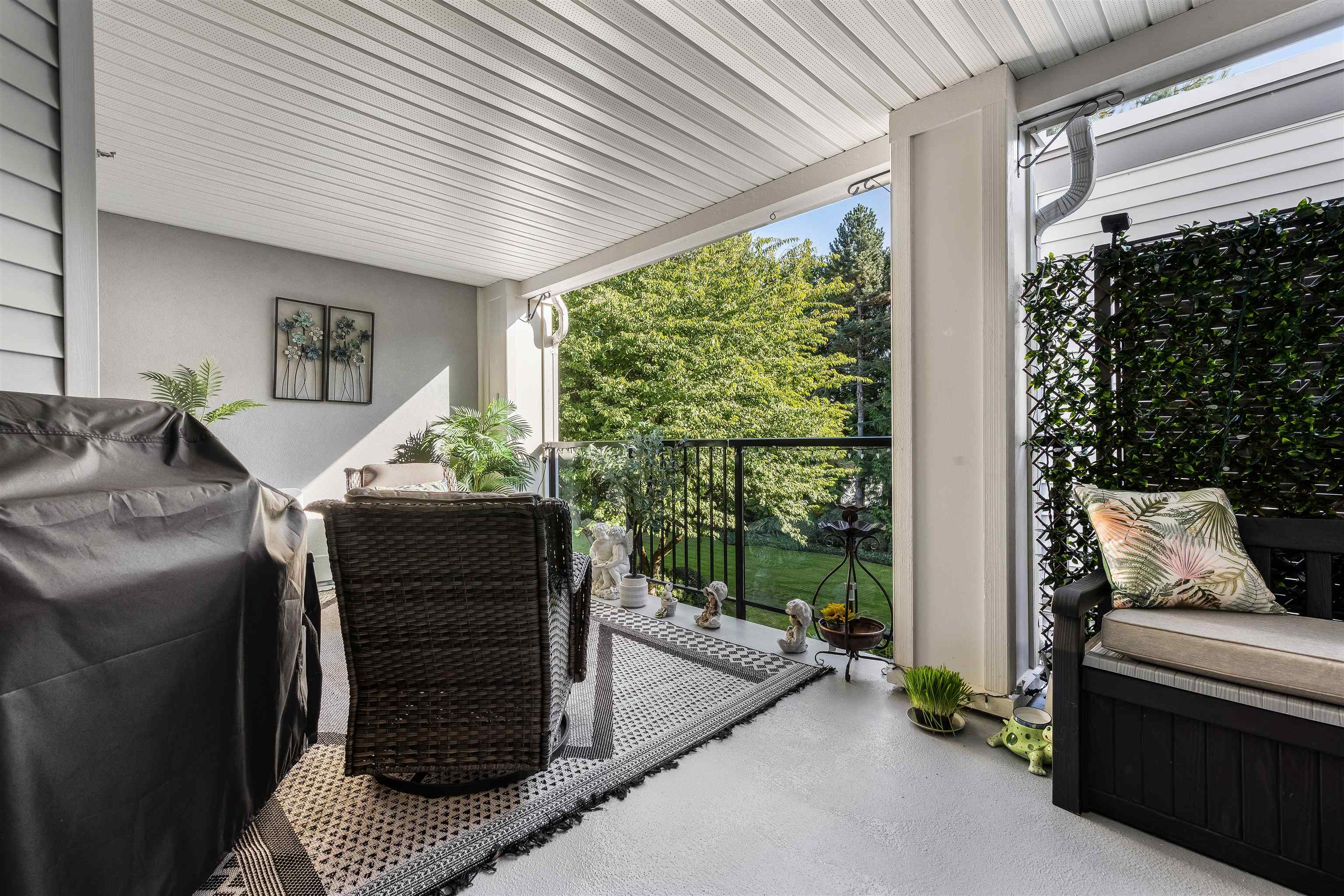 Stunning unit! Meticulously maintained & beautiful! Completely remodeled in 2023. Kitchen cabinets refaced with white shaker, 3 new SS appliances. All new fixtures, sink, taps & backsplash. New stone fireplace wall. New paint thru-out, new laminate floors, lighting & blinds. You'll be drawn to the large triple glass doors that lead to an amazing, huge, covered out-door living area that overlooks the nicely landscaped grounds on the QUIET South side of building & has NG hookup for BBQ! MBdrm has direct acces...