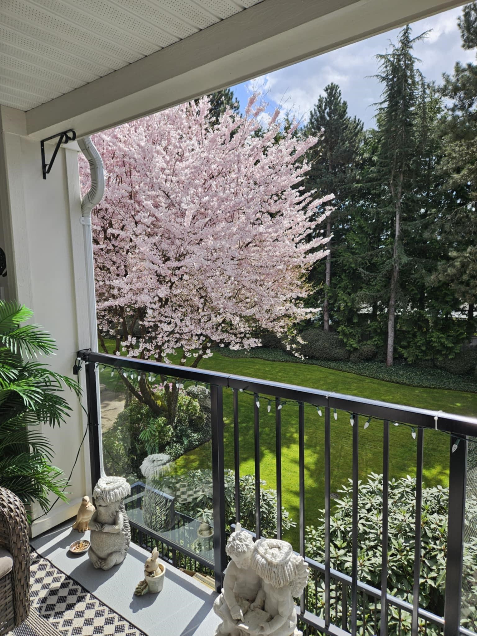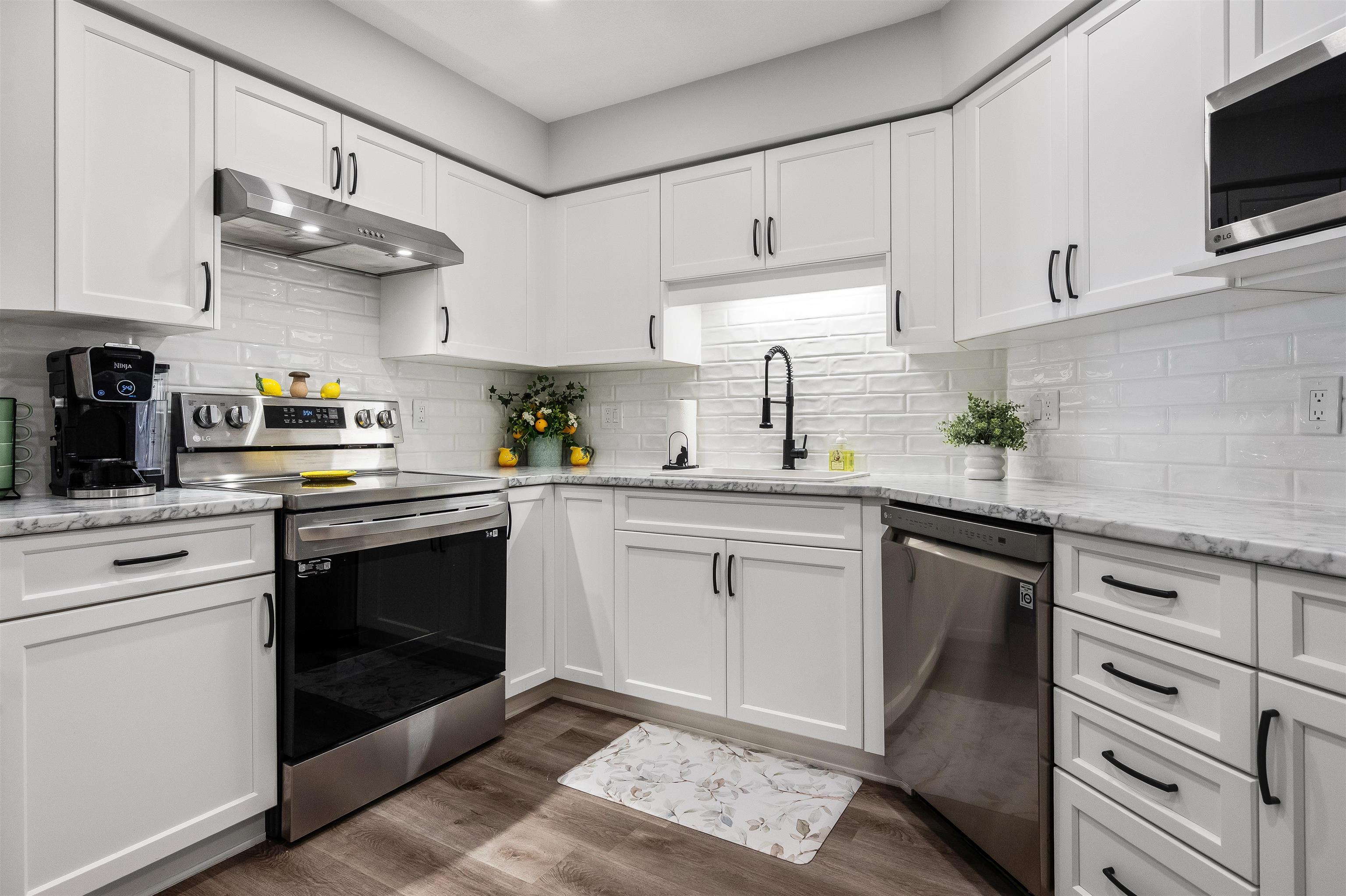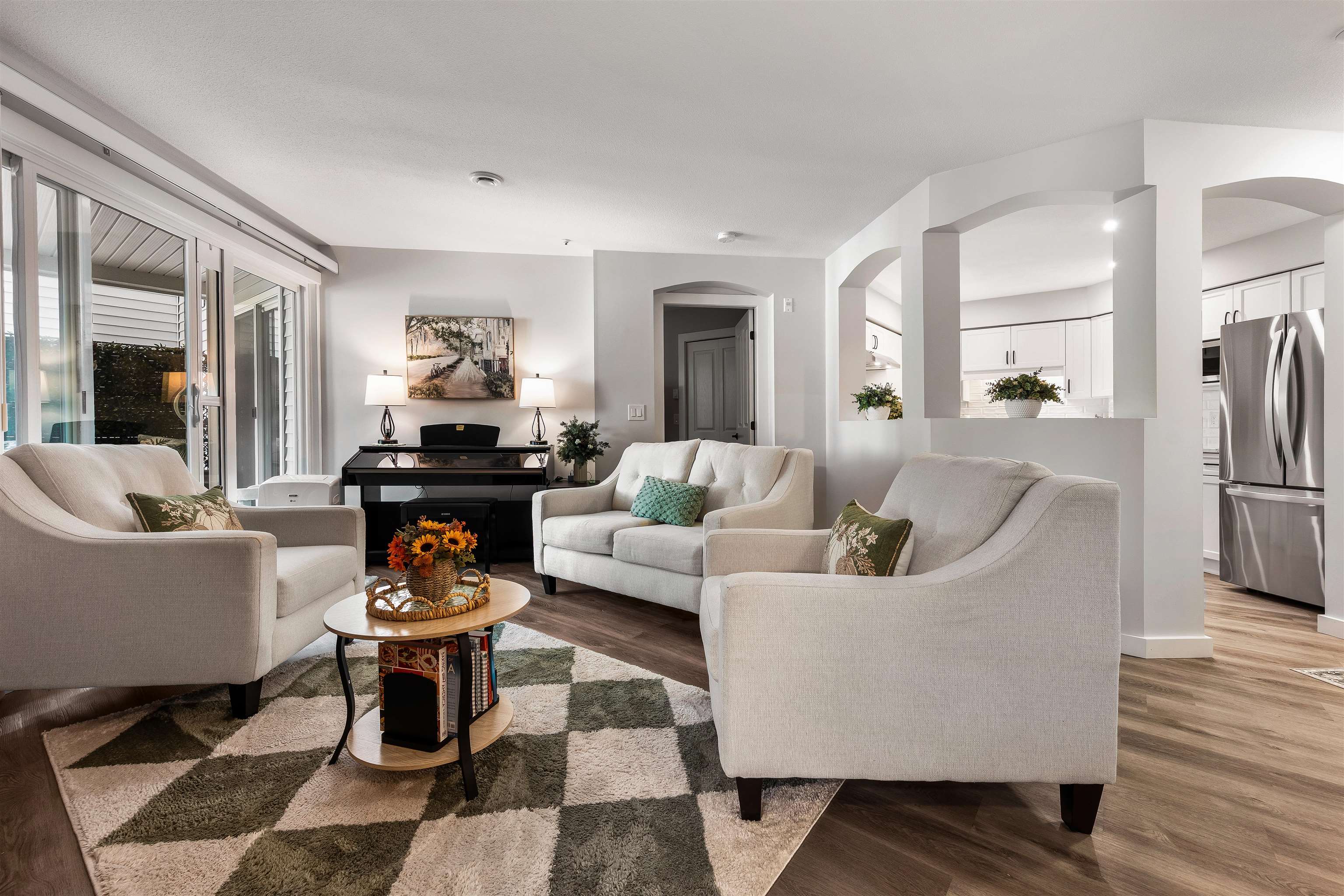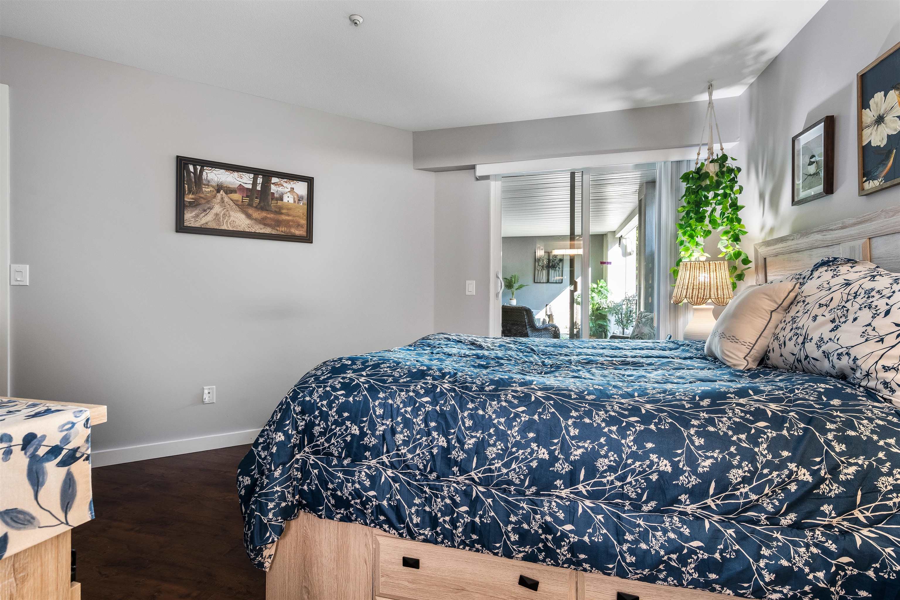 Stunning unit! Meticulously maintained & beautiful! Completely remodeled in 2023. Kitchen cabinets refaced with white shaker, 3 new SS appliances. All new fixtures, sink, taps & backsplash. New stone fireplace wall. New paint thru-out, new laminate floors, lighting & blinds. You'll be drawn to the large triple glass doors that lead to an amazing, huge, covered out-door living area that overlooks the nicely landscaped grounds on the QUIET South side of building & has NG hookup for BBQ! MBdrm has direct acces...