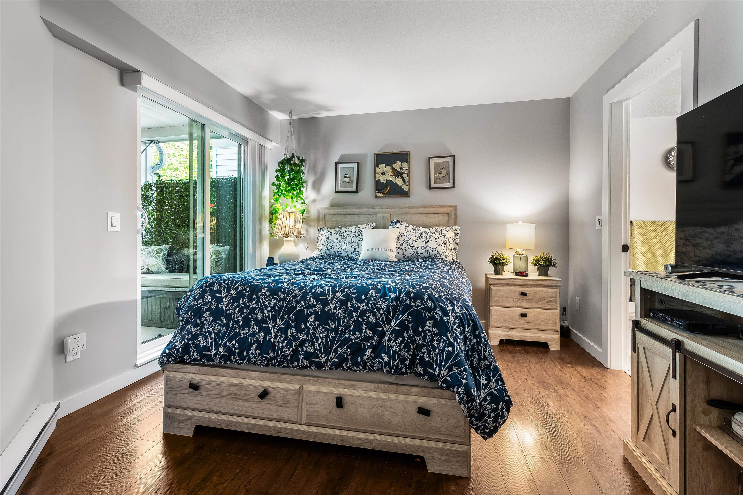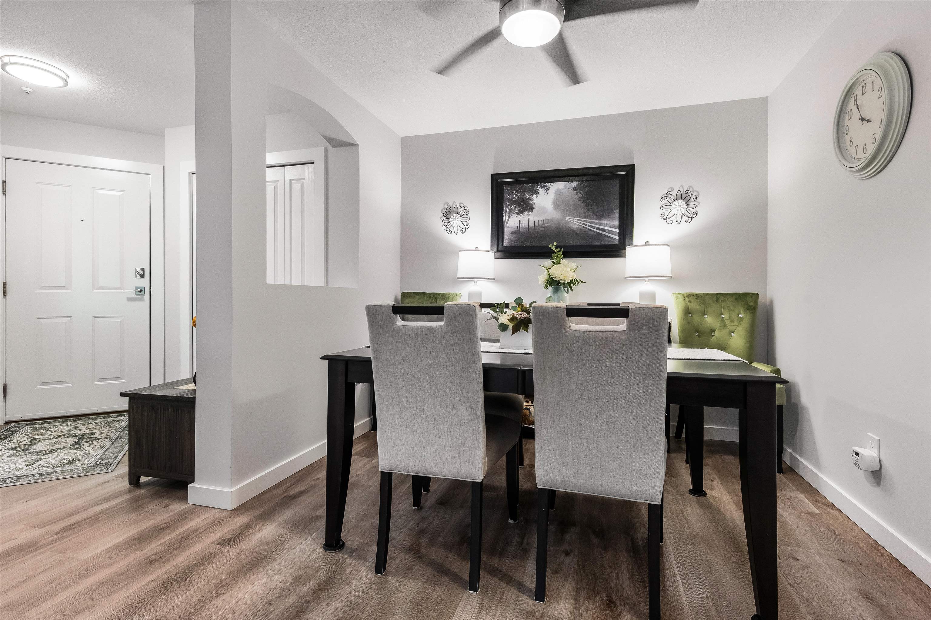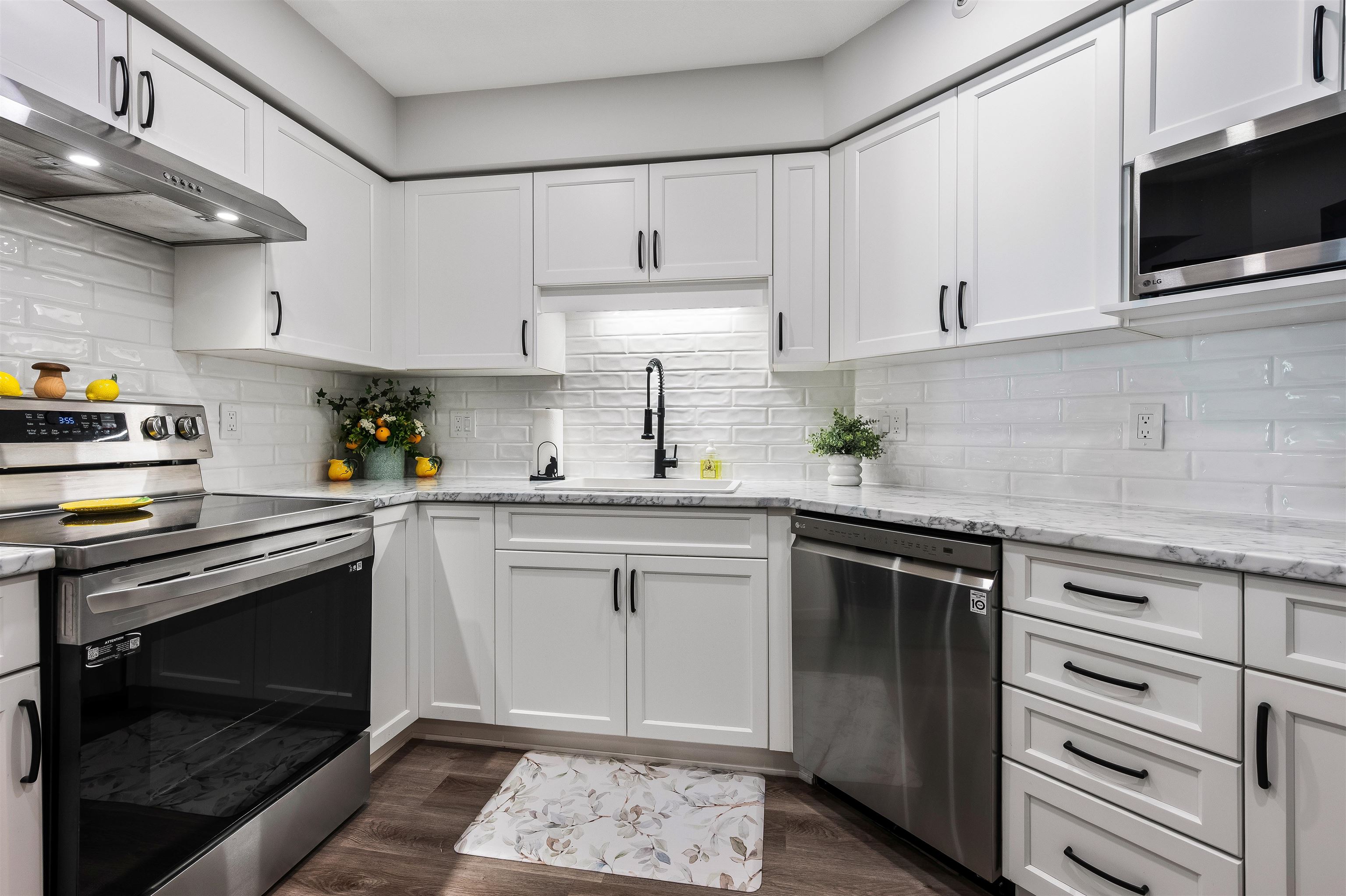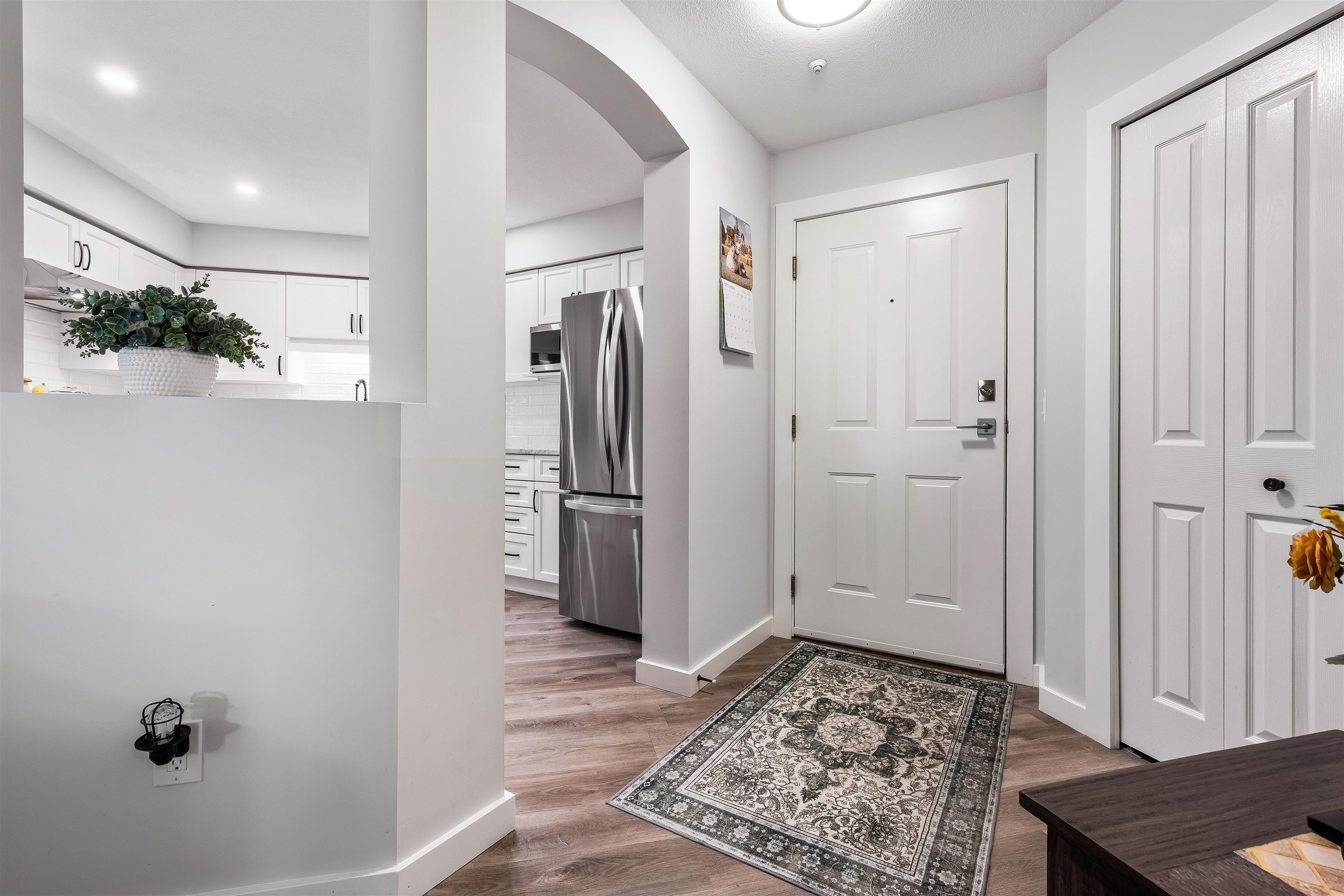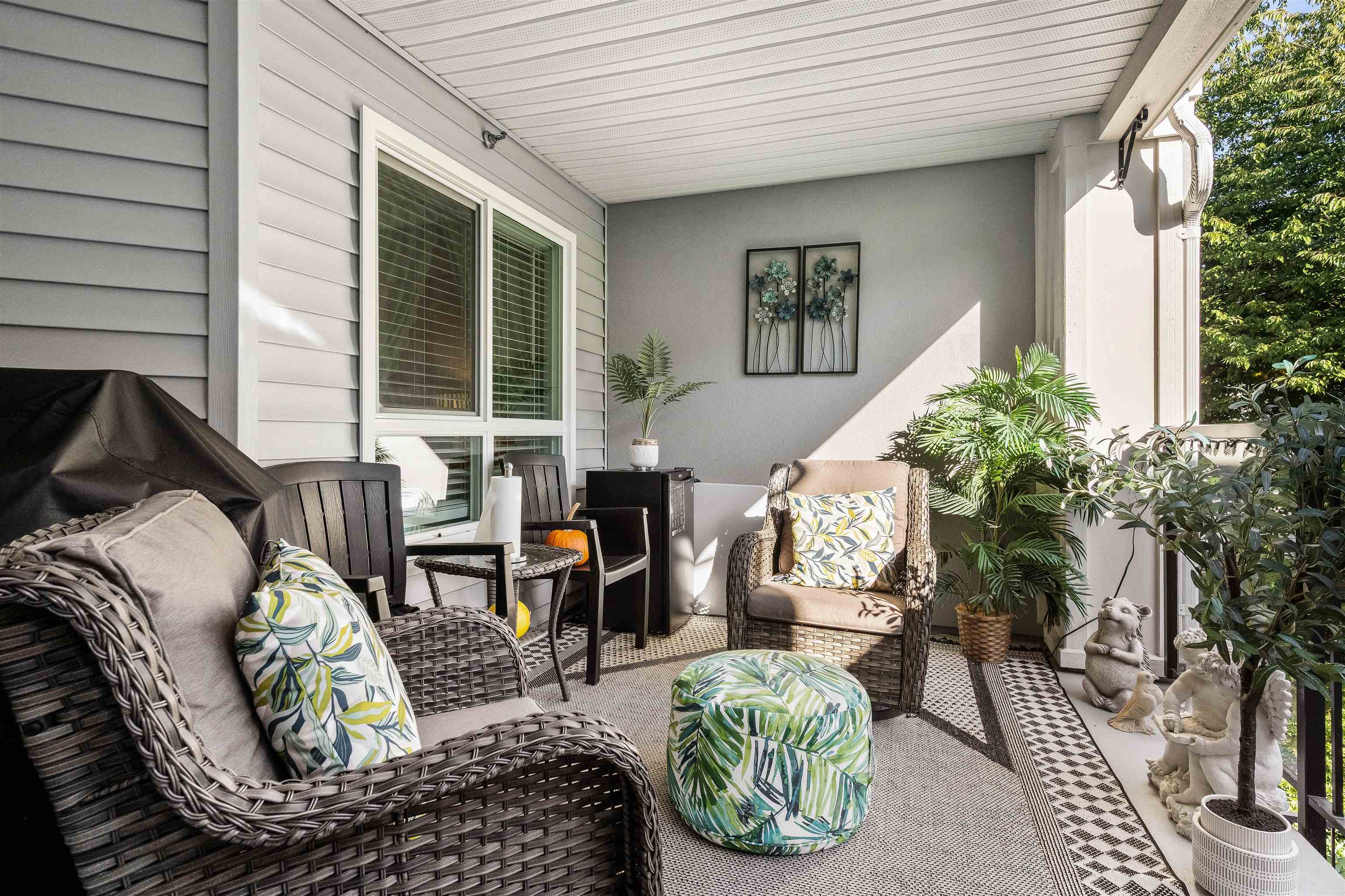 Stunning unit! Meticulously maintained & beautiful! Completely remodeled in 2023. Kitchen cabinets refaced with white shaker, 3 new SS appliances. All new fixtures, sink, taps & backsplash. New stone fireplace wall. New paint thru-out, new laminate floors, lighting & blinds. You'll be drawn to the large triple glass doors that lead to an amazing, huge, covered out-door living area that overlooks the nicely landscaped grounds on the QUIET South side of building & has NG hookup for BBQ! MBdrm has direct acces...