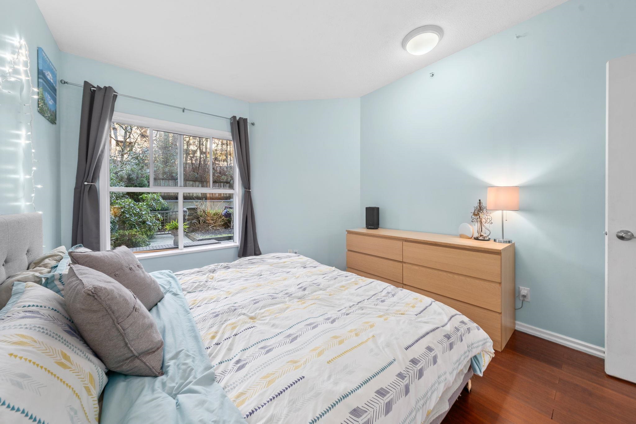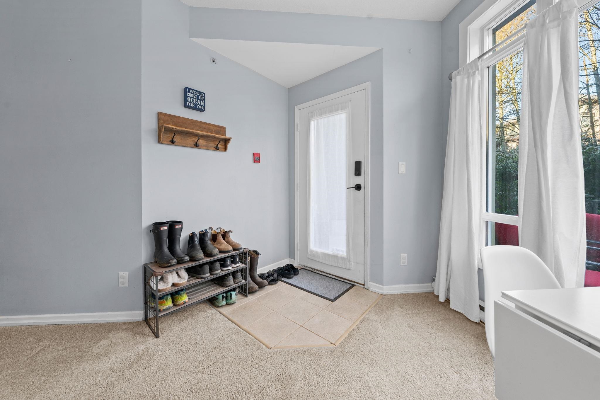 This 826sf townhome-style 1 bed + den feels like a 2 bed, with abundant storage and easy access to the 345sf patio & garden! Inside, enjoy an open living area with gas F/P, a spacious kitchen with pass-through window, in-suite laundry, and that BIG DEN. CONCRETE construction, Hardie plank siding, and rainscreening in the mid-2000s give peace of mind. TWO PARKING with direct stairs to your door, perfect for active lifestyles and easy gear loading. There's a locker + bike room, and a bike rack in your parking...