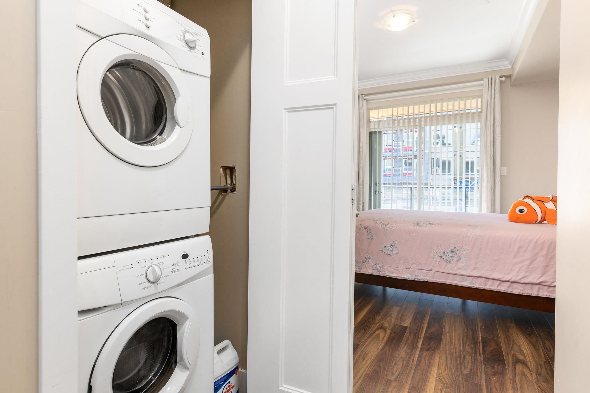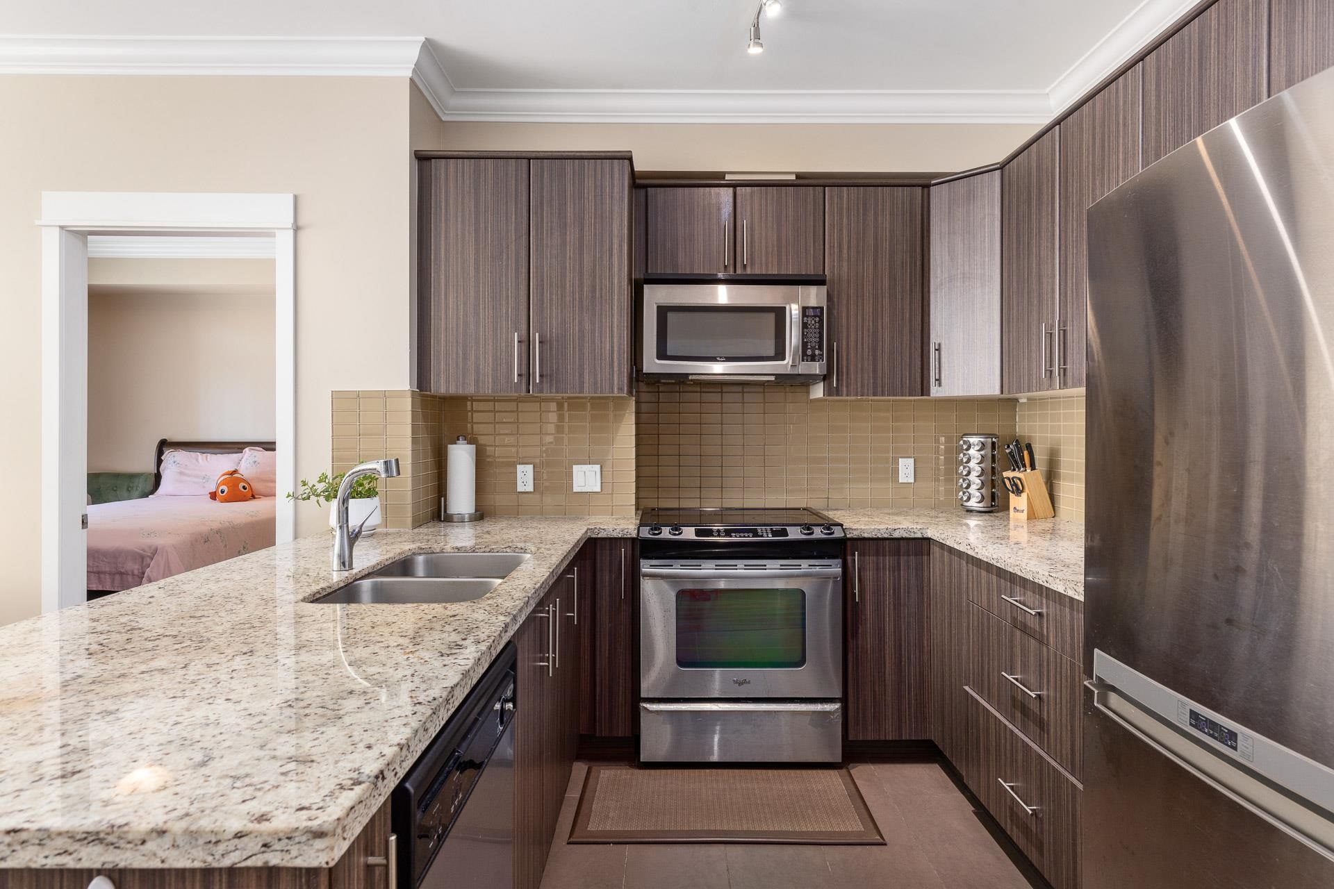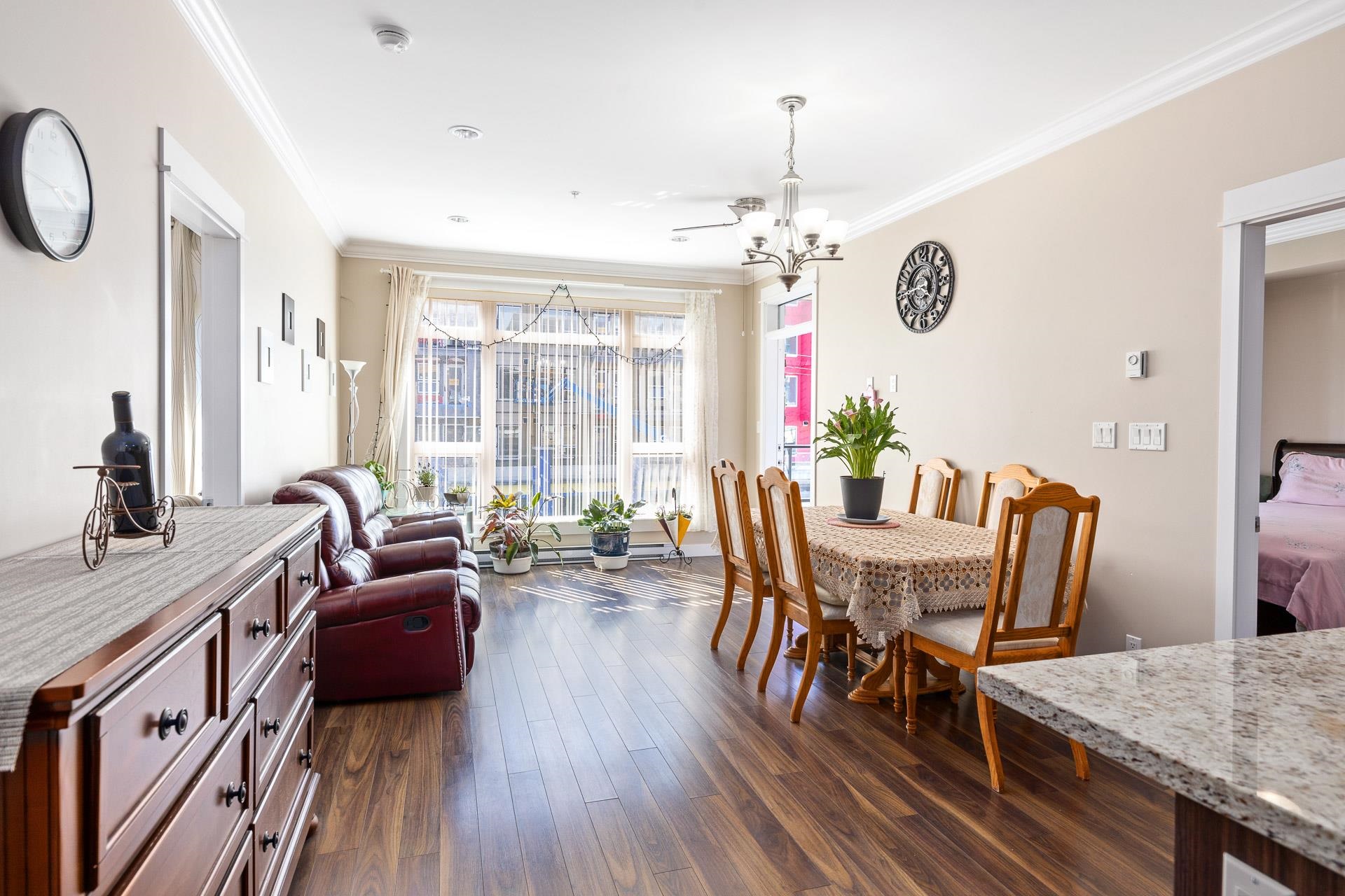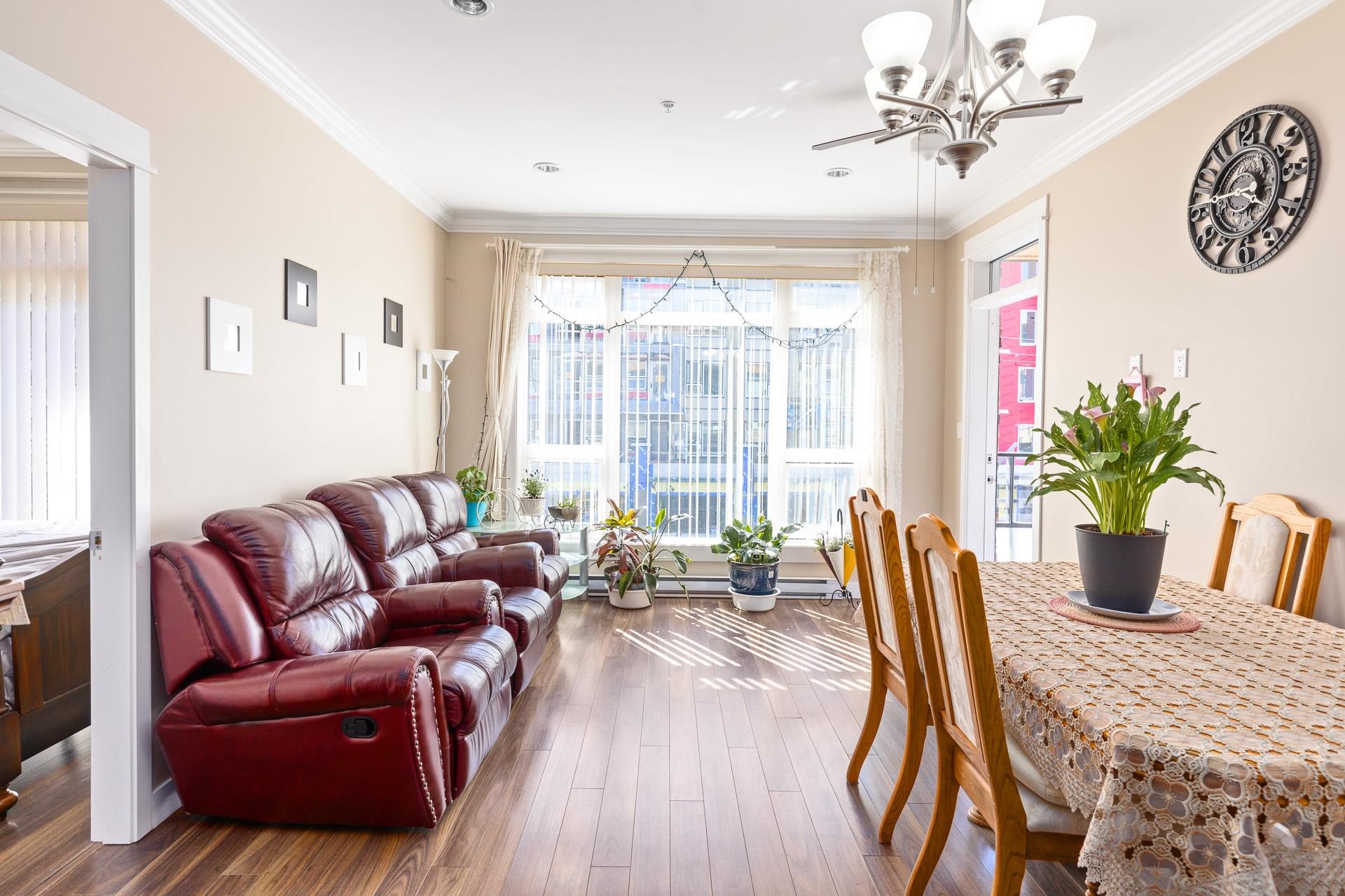 Welcome to the sought after BABANA! This seldom available 893 sq ft unit have 2 bed/2 bath/2 balconies, plus a SPACIOUS Den which could be used as a 3rd bedroom. Bright South-West facing living room leads to 2 good size bedrooms on the opposite side of the living room. High ceiling with Beautiful crown moldings throughout, quartz counters, plenty of cabinets, S/S appliances, and laminate floors. Walking distance to all amenities. Great neighborhood restaurants and shops. Close to Royal Oak Skytrain, Metroto...