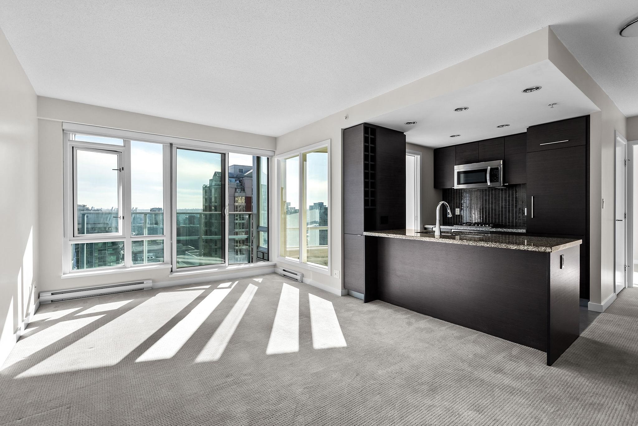 'Atelier' on Robson - one of DT Van's most convenient & desirably located buildings. This 1bed+solarium+den home offers an open concept layout w/ floor-to-ceiling windows, making for a commodious space w/ gorgeous views of DT, BC Place, Metrotown & through to Mount Baker. Offering a beautiful kitchen with granite countertops, s/s appliances with gas cooktop, dark cabinetry, a spacious breakfast bar and built-in wine rack. This well-run building offers great amenities such as a bike room, meeting room, party...
