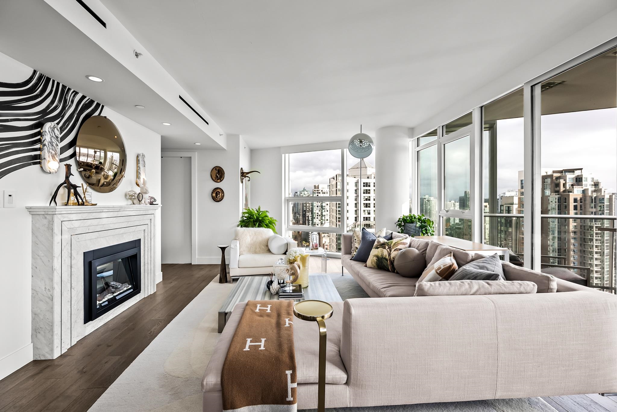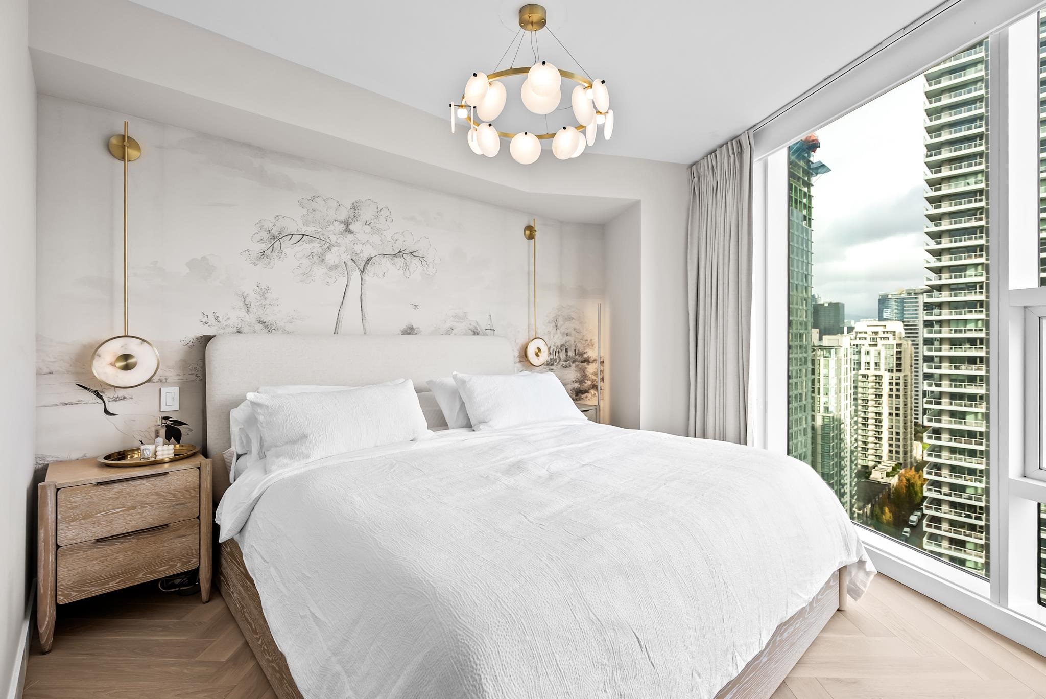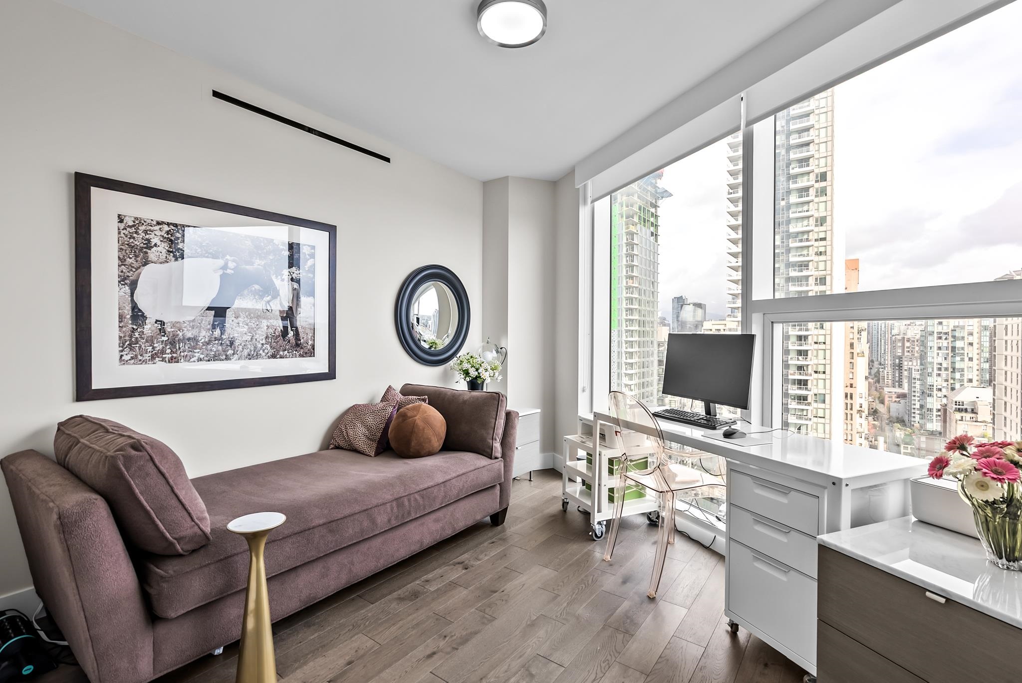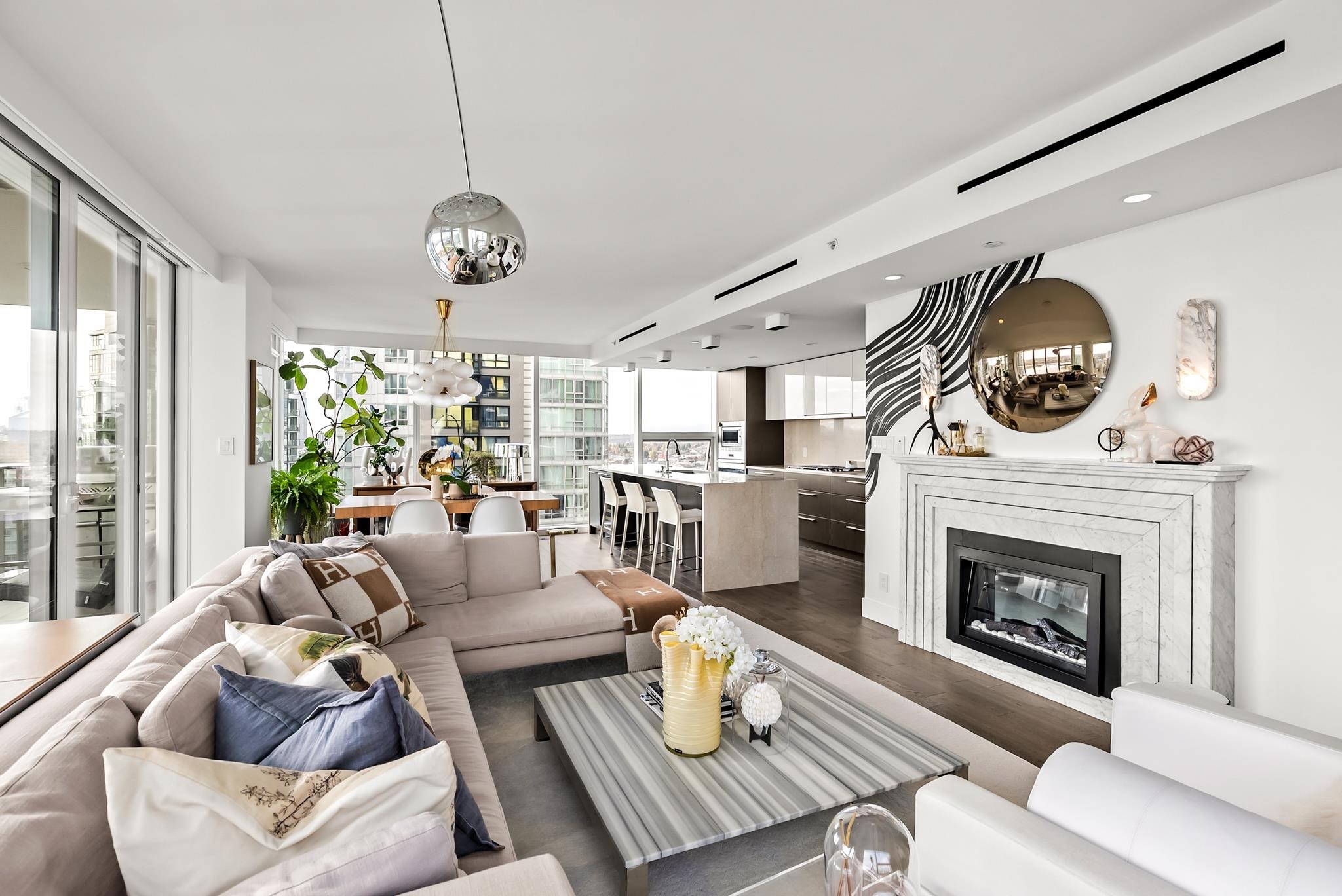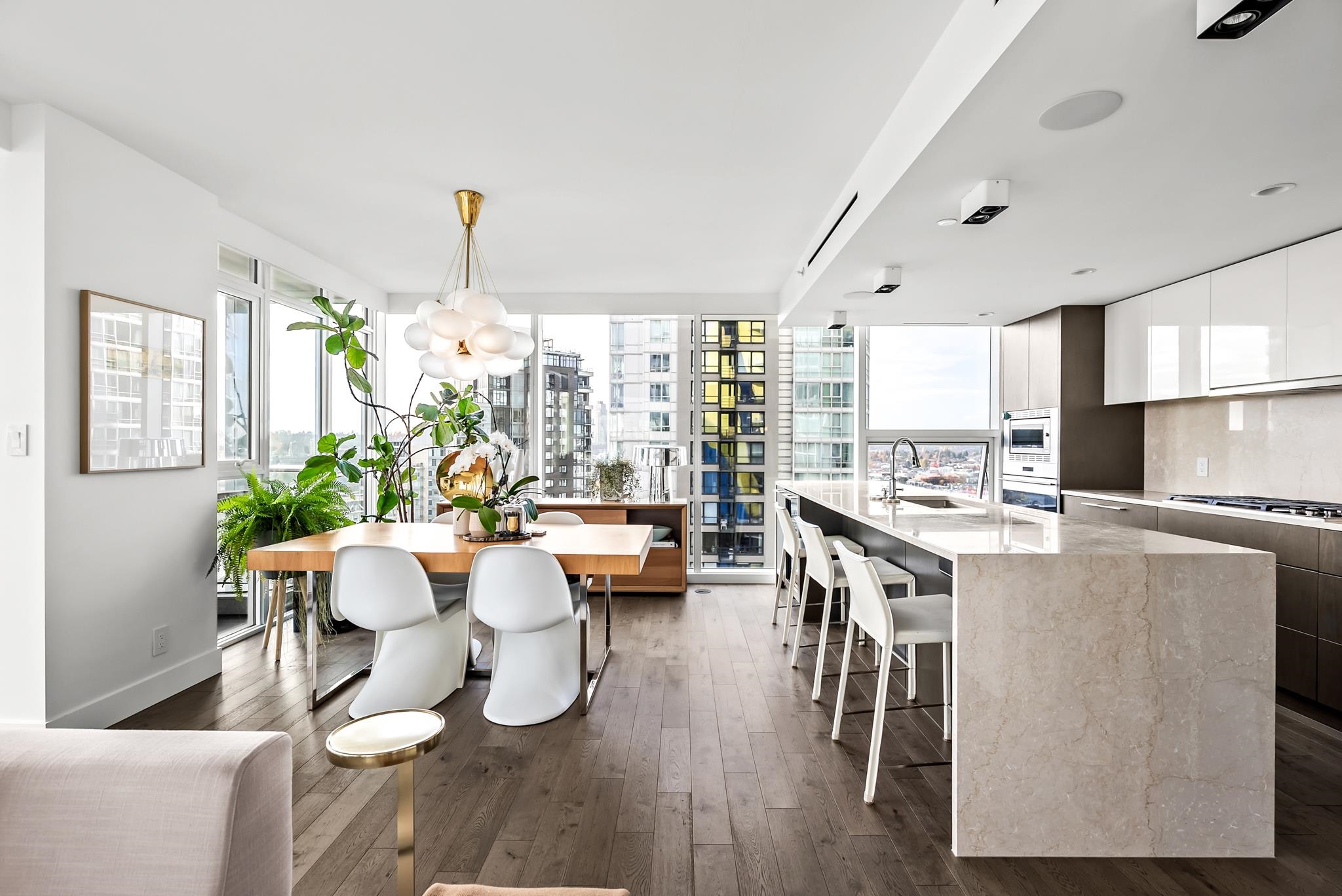 Unparalleled luxury on the 25th floor at The Charleson. This designer suite spans over 1643 sft with a view that will take your breath away. Featuring engineered hardwood throughout the home & numerous upgrades including tasteful designer lighting, wallpaper, herringbone wood floors, walk in closet & marble fireplace. An open plan chef's kitchen overlooks the expansive LR & DR, w/ sweeping views overlooking David Lam Park, False Creek, City Hall & beyond. The Primary suite offers plenty of space for your ki...