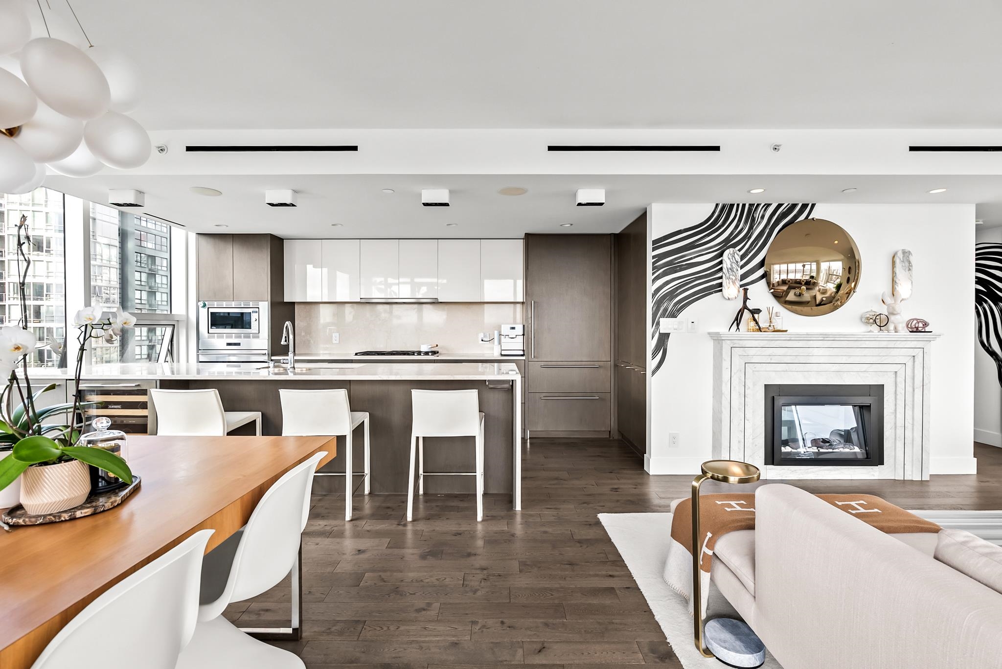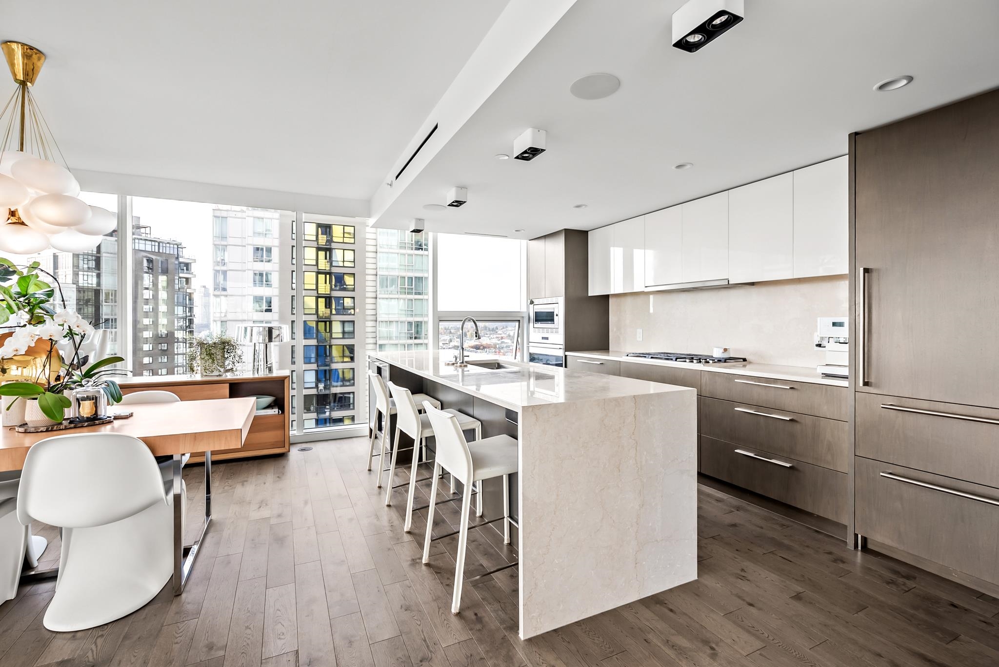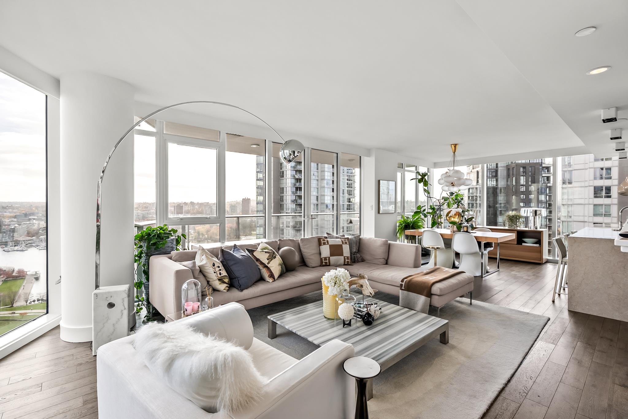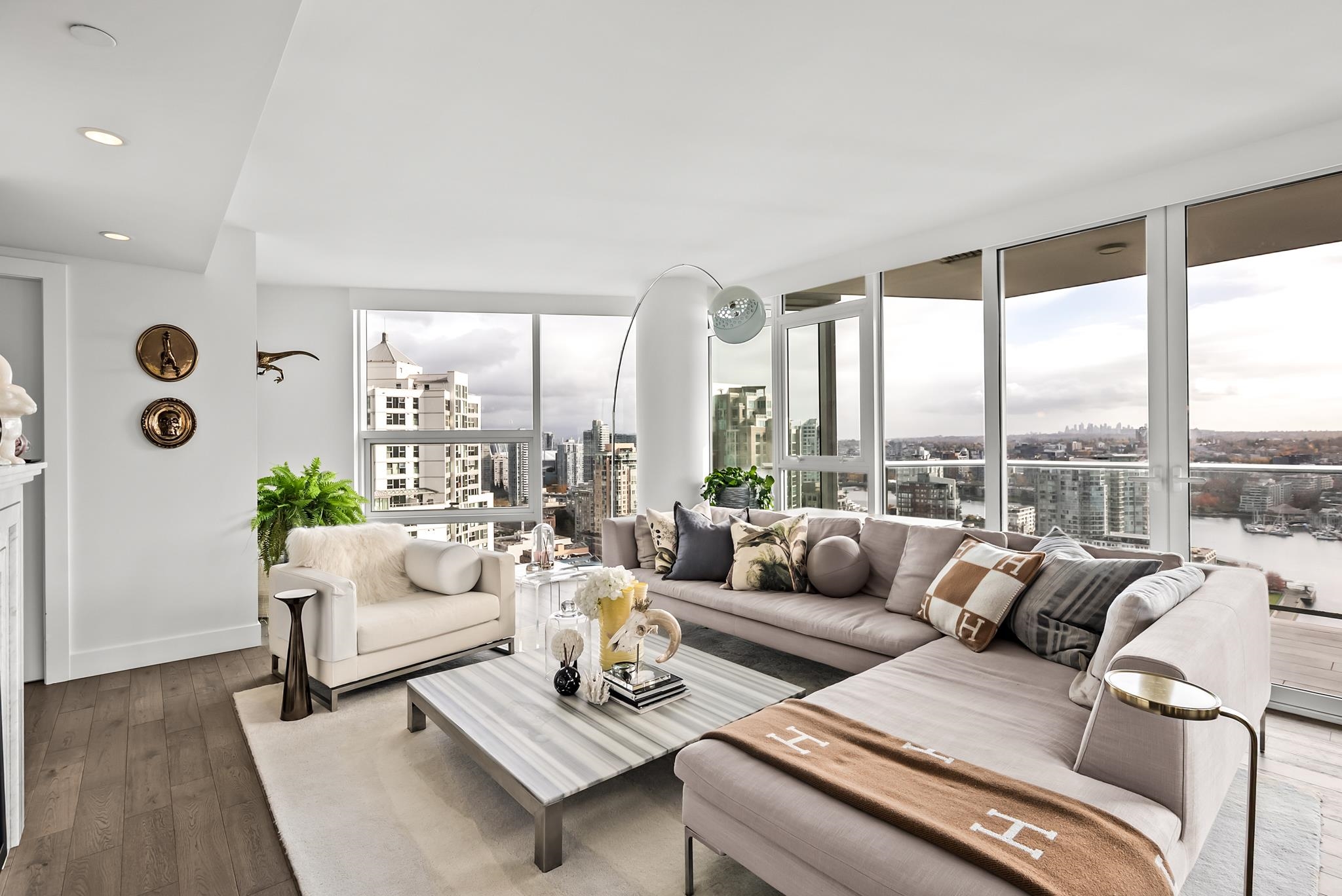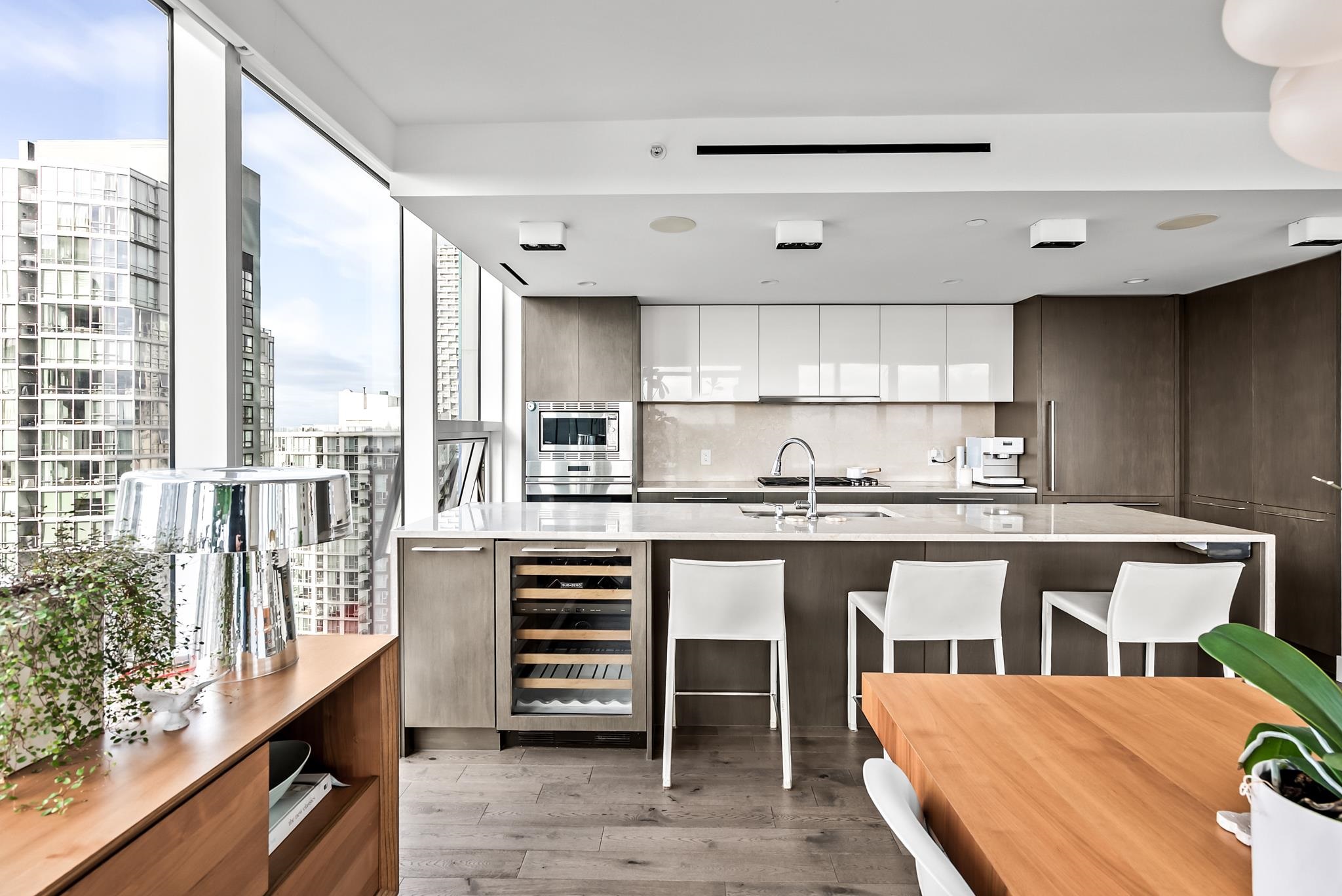 Unparalleled luxury on the 25th floor at The Charleson. This designer suite spans over 1643 sft with a view that will take your breath away. Featuring engineered hardwood throughout the home & numerous upgrades including tasteful designer lighting, wallpaper, herringbone wood floors, walk in closet & marble fireplace. An open plan chef's kitchen overlooks the expansive LR & DR, w/ sweeping views overlooking David Lam Park, False Creek, City Hall & beyond. The Primary suite offers plenty of space for your ki...