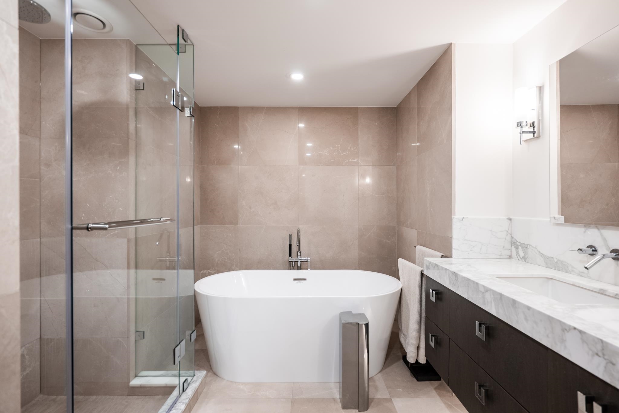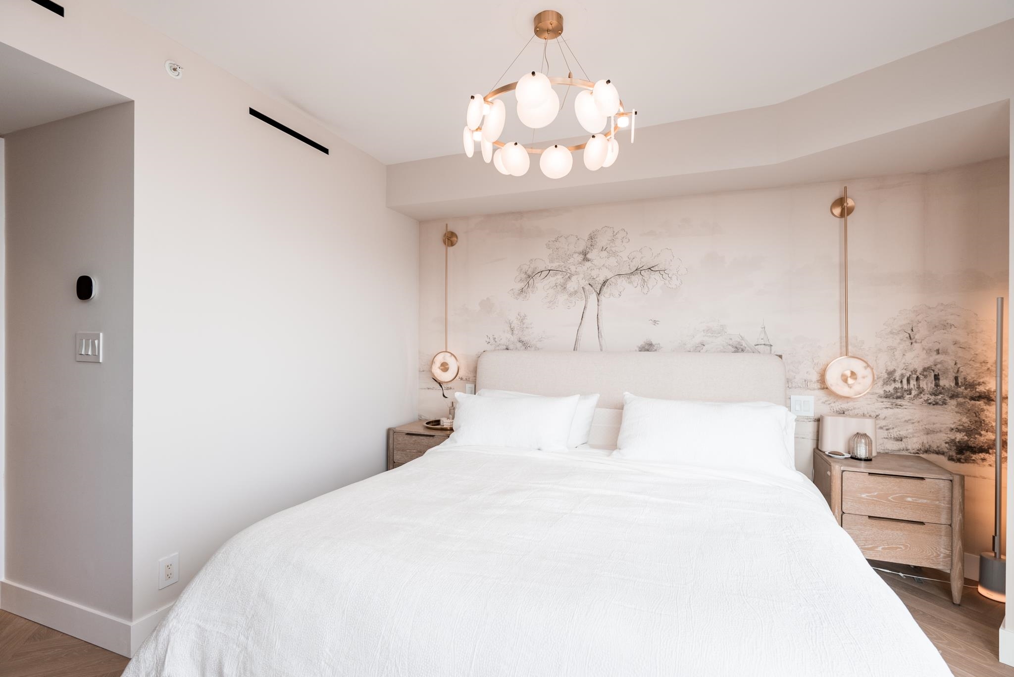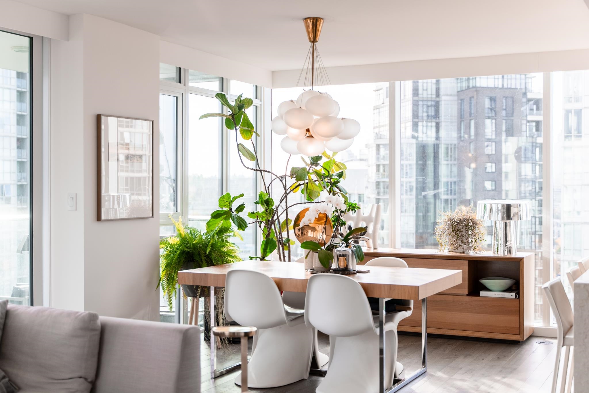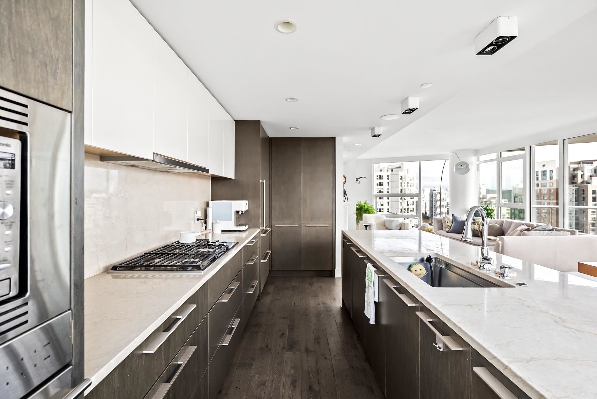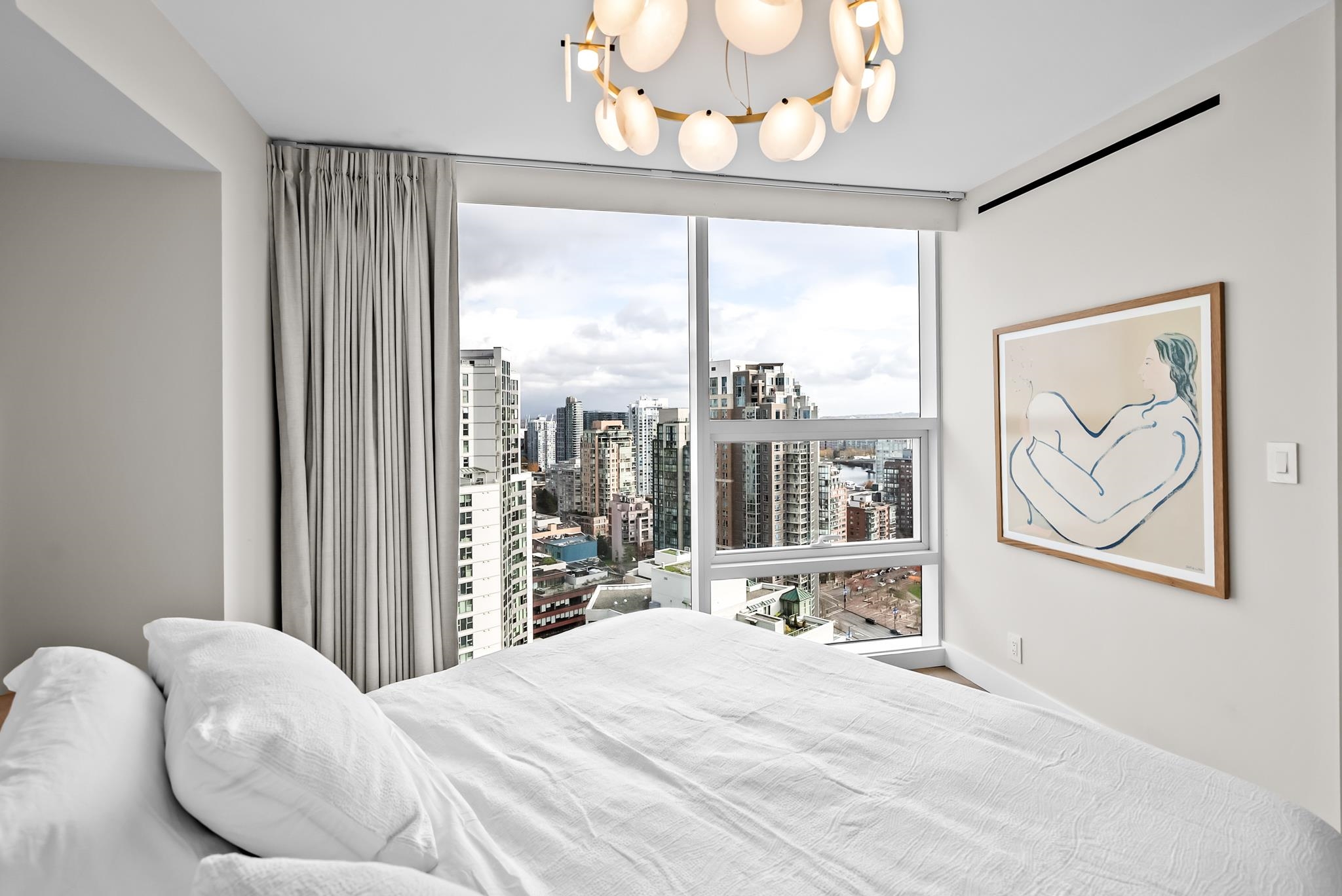 Unparalleled luxury on the 25th floor at The Charleson. This designer suite spans over 1643 sft with a view that will take your breath away. Featuring engineered hardwood throughout the home & numerous upgrades including tasteful designer lighting, wallpaper, herringbone wood floors, walk in closet & marble fireplace. An open plan chef's kitchen overlooks the expansive LR & DR, w/ sweeping views overlooking David Lam Park, False Creek, City Hall & beyond. The Primary suite offers plenty of space for your ki...
