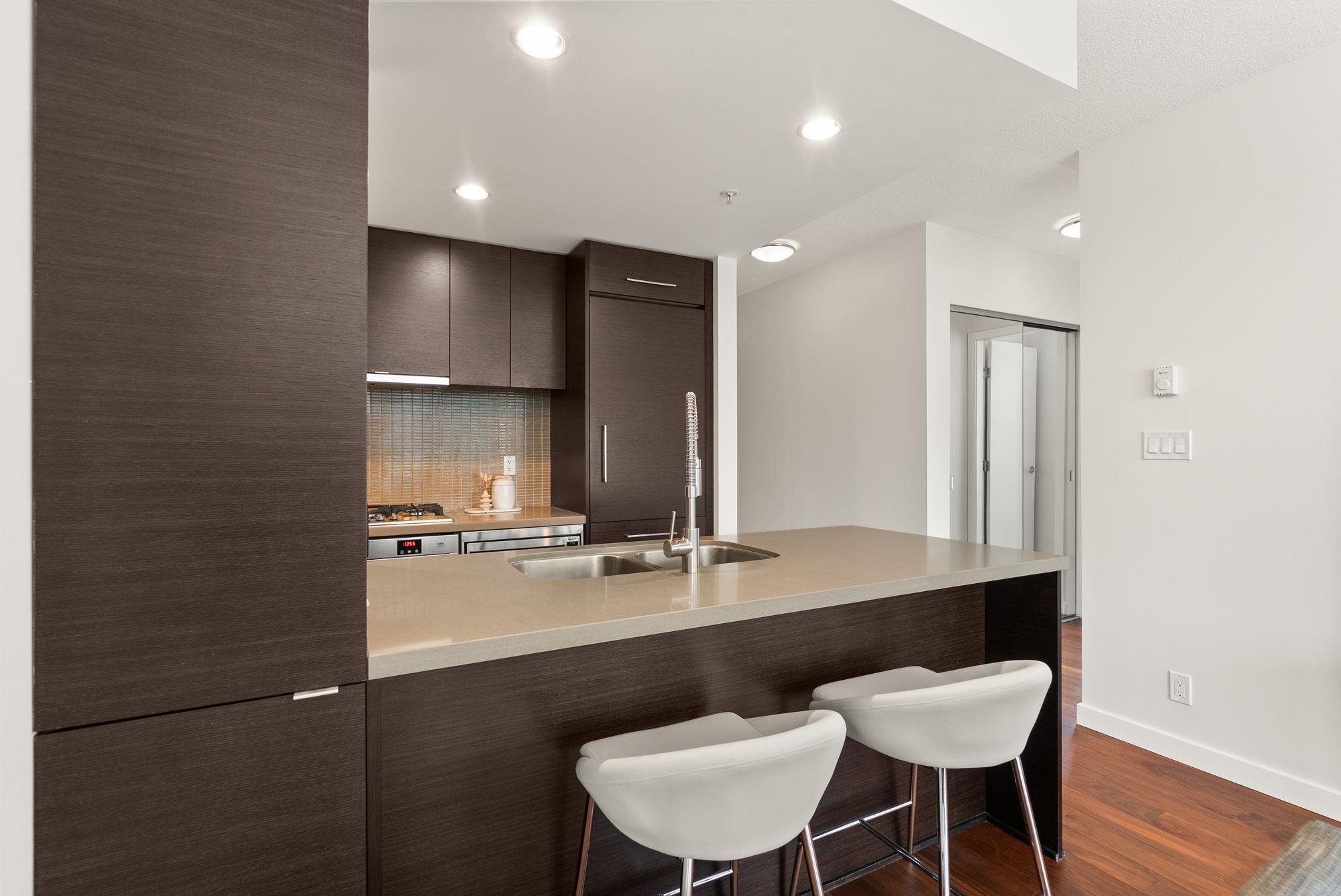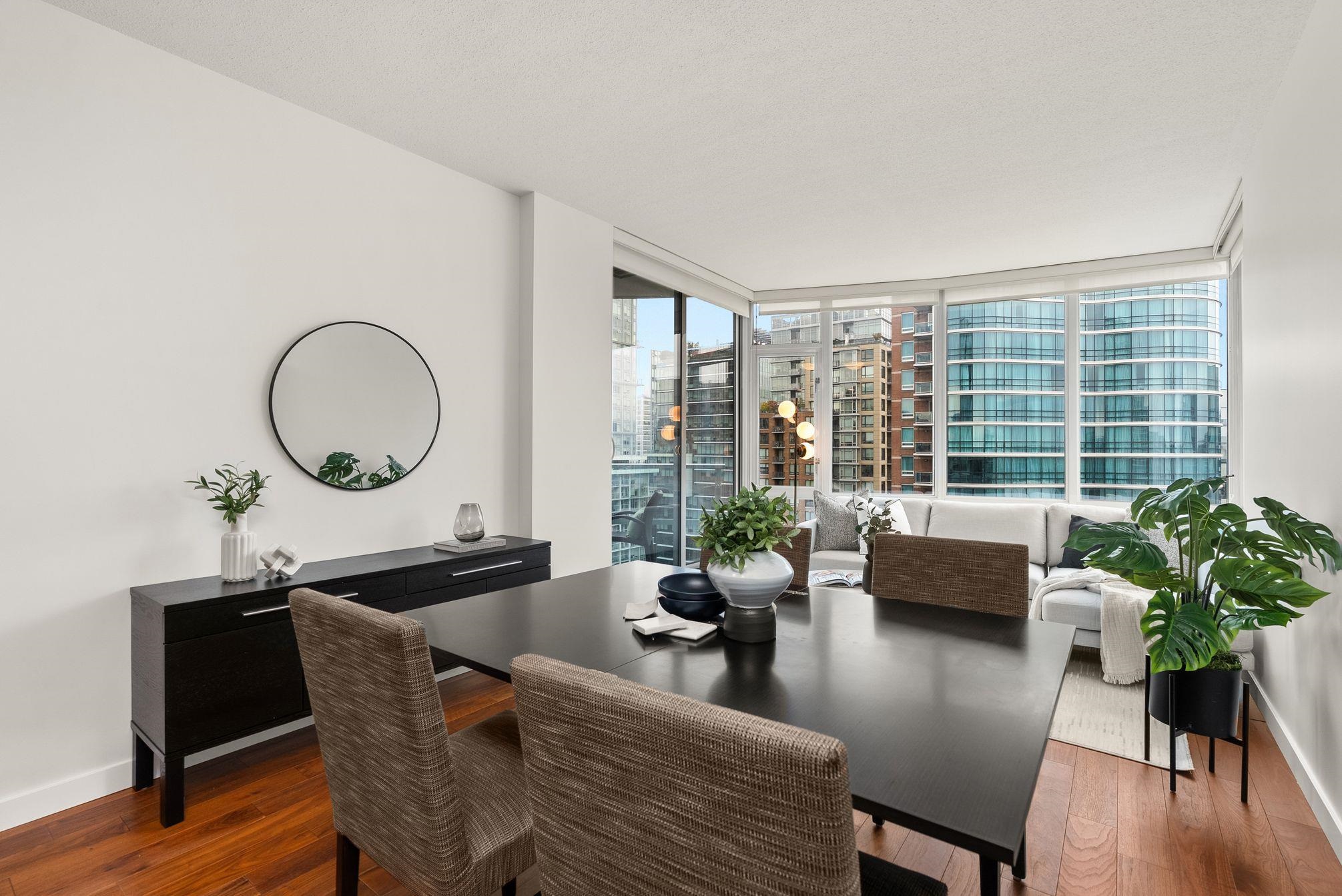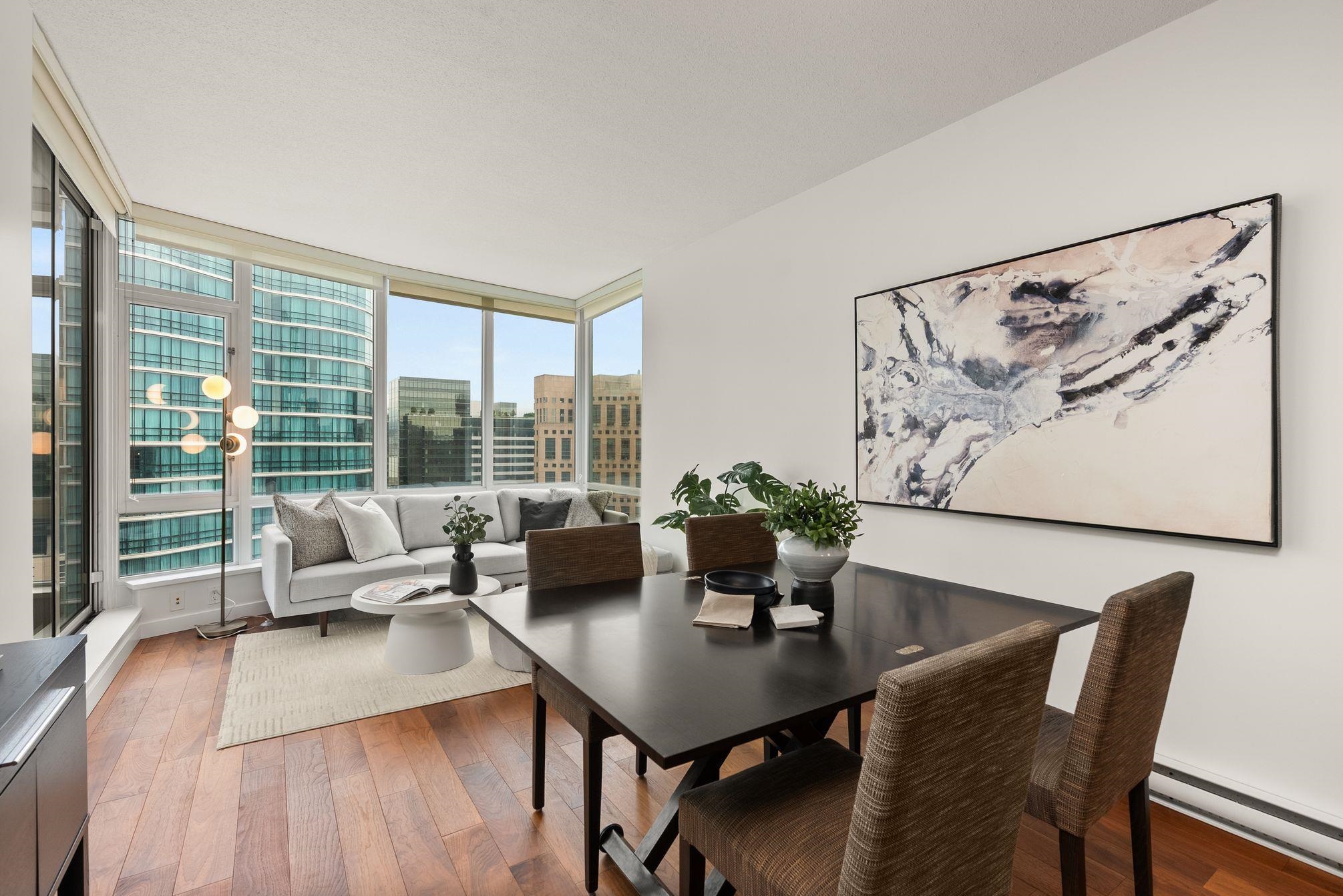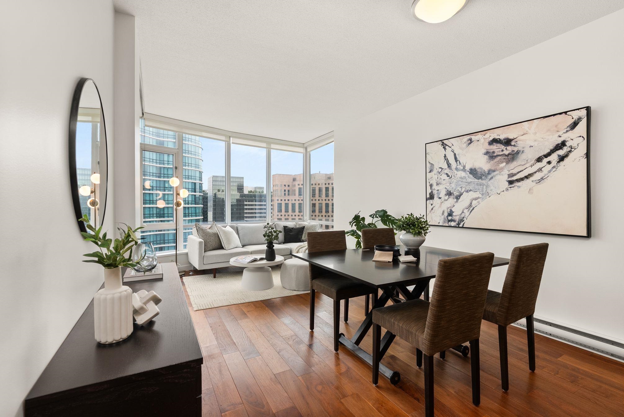 Immaculate 2 Bed+Den, 2 bath residence in one of Downtown Vancouver’s Entertainment District in a top-tier building: Atelier. With NE & NW exposure, enjoy sweeping city scape views amidst the backdrop of the North Shore mountains, iconic Library, BC Place & Metrotown. Hardwood floors flow seamlessly throughout the spacious living and dining areas & kitchen with quartz countertops, rich wenge cabinetry, and integrated paneled appliances—perfect for both everyday living and entertaining. Spacious bedrooms wi...