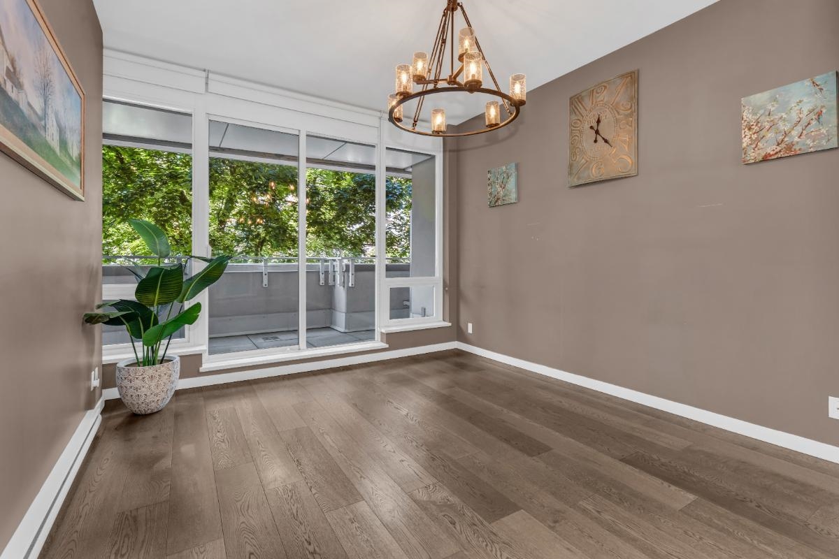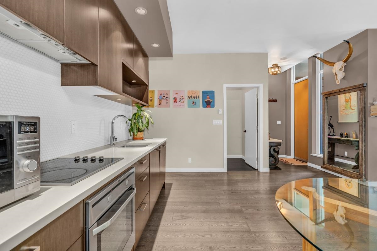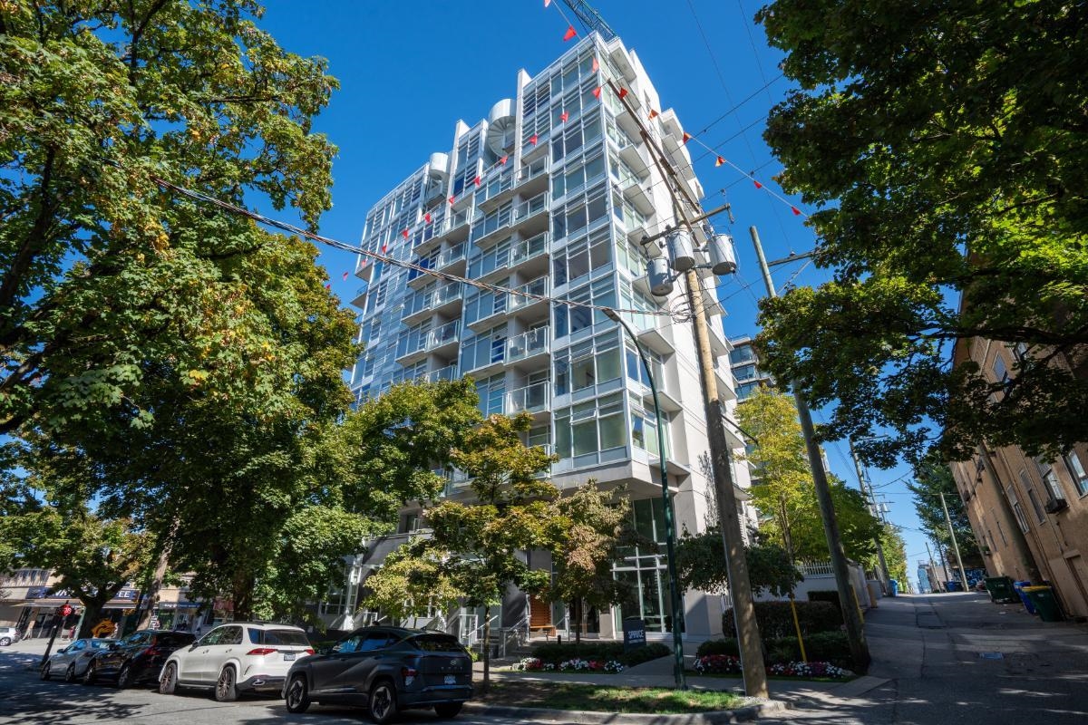 Rarely available, prime Fairview location, concrete 2-level townhouse. Spacious open-concept main floor with engineered hardwood, integrated appliances, 9+ foot ceilings, and oversized windows. Upstairs also features ceilings over 9 feet, giving both levels an impressive sense of space and openness. Two bedrooms each having access to the outdoor patio. Complete with a large den/office, in-suite laundry, and one parking. Listed below BC Assessment, here is an opportunity you do not want to miss!