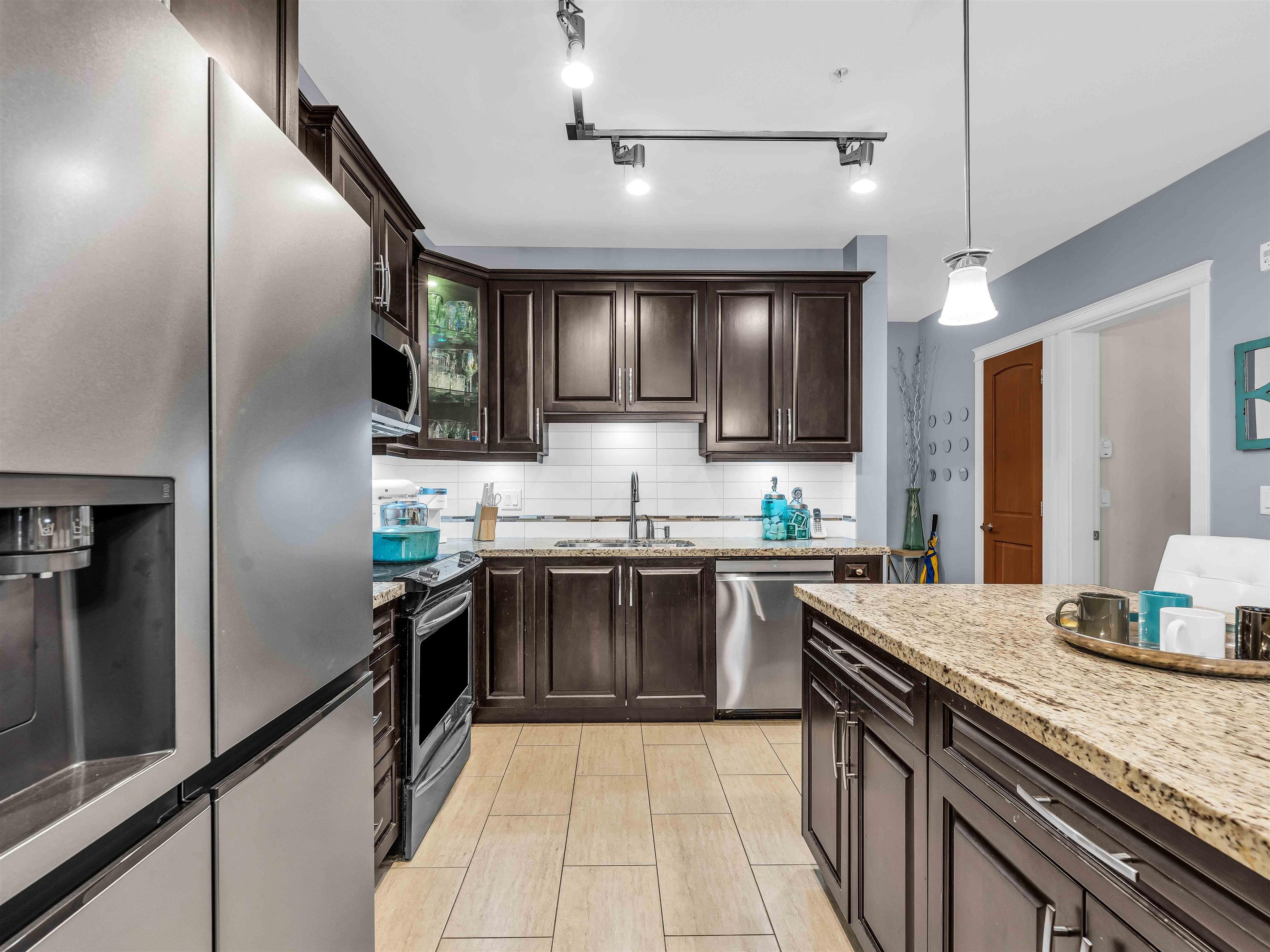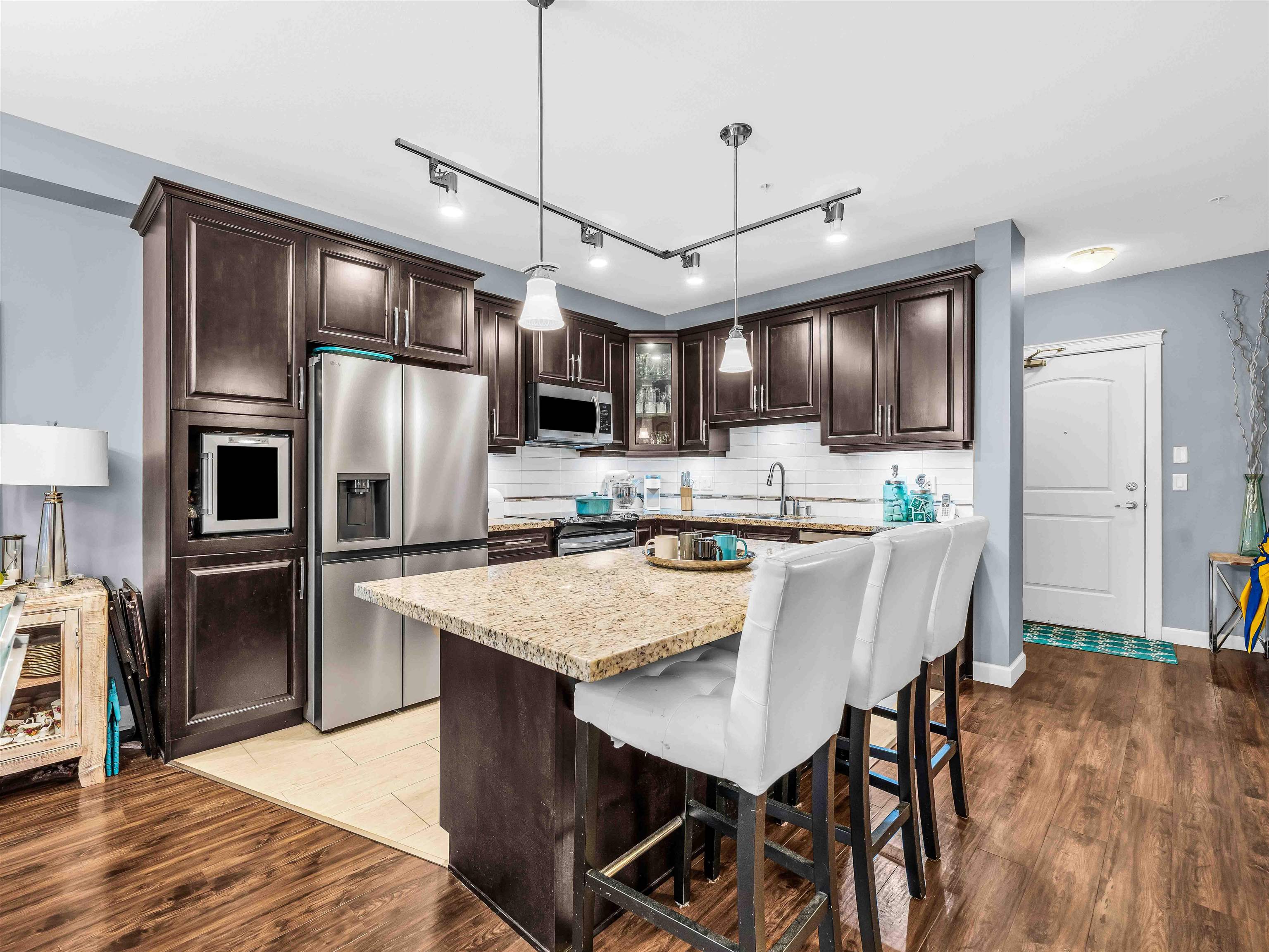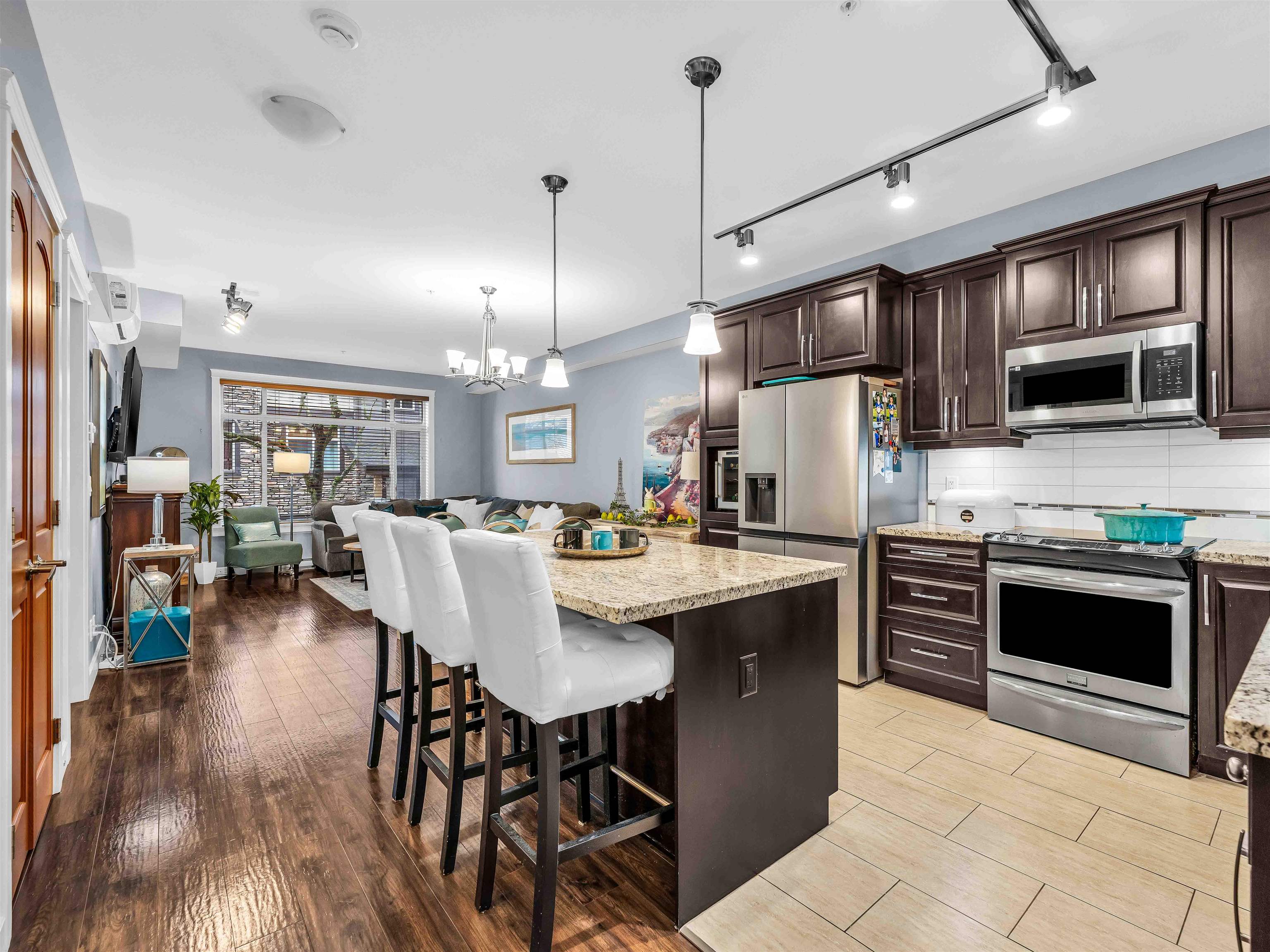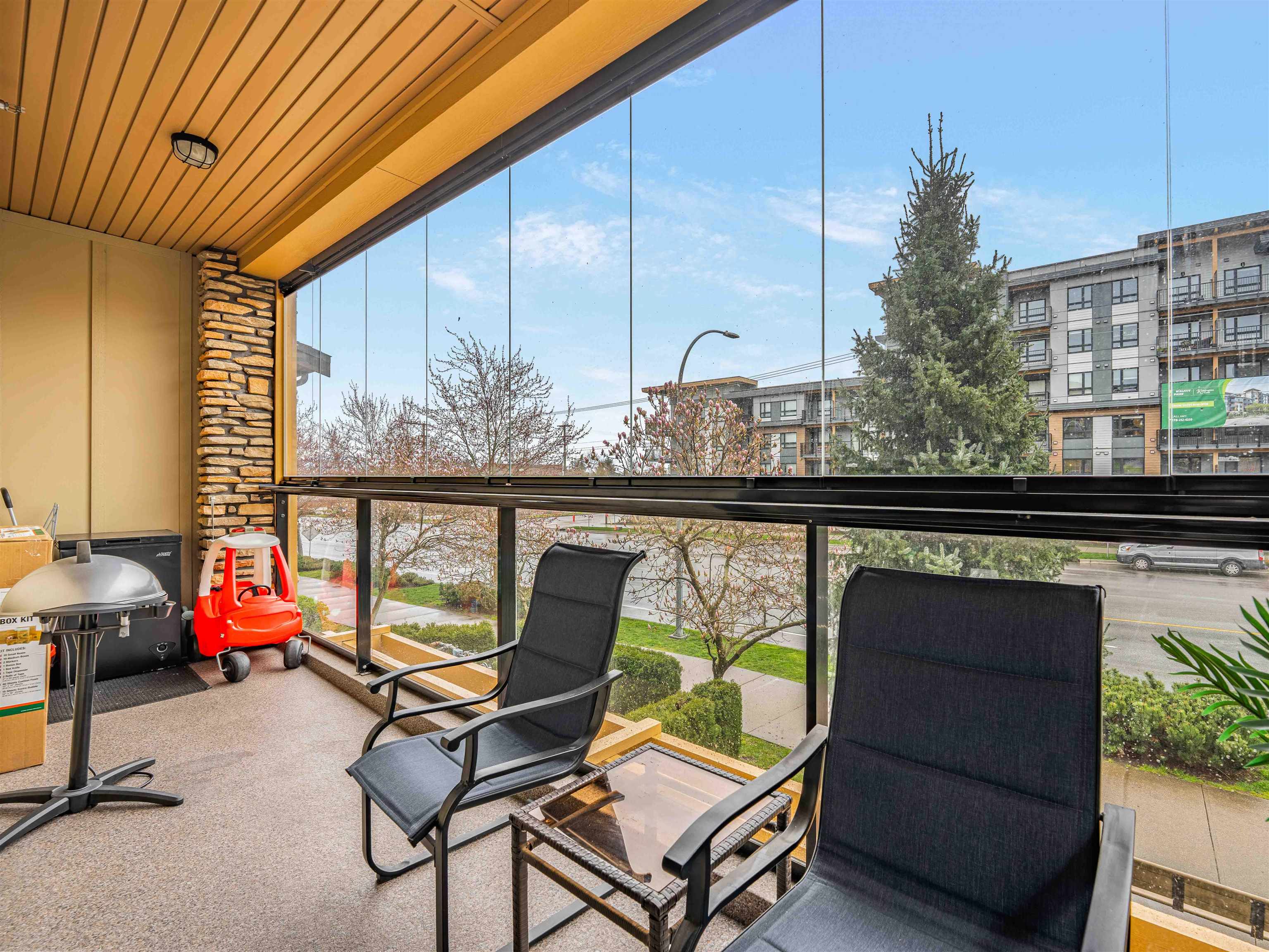 Welcome to Yorkson Creek! This spacious corner unit offers 2 bedrooms PLUS DEN & 2 full heated baths in the heart of Willoughby Heights, with 1,026 sqft of well designed living space. Den could easily be used a bedroom. Enjoy the bright & airy corner solarium, perfect for morning coffee or year round relaxation. The functional layout includes a versatile den, ideal for a home office or additional in suite storage. The gourmet kitchen features granite countertops, a large island, wine fridge and new applianc...